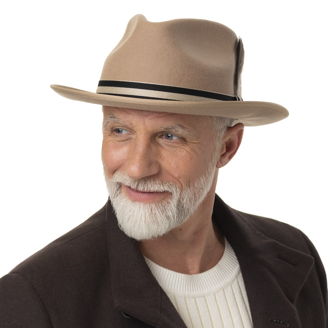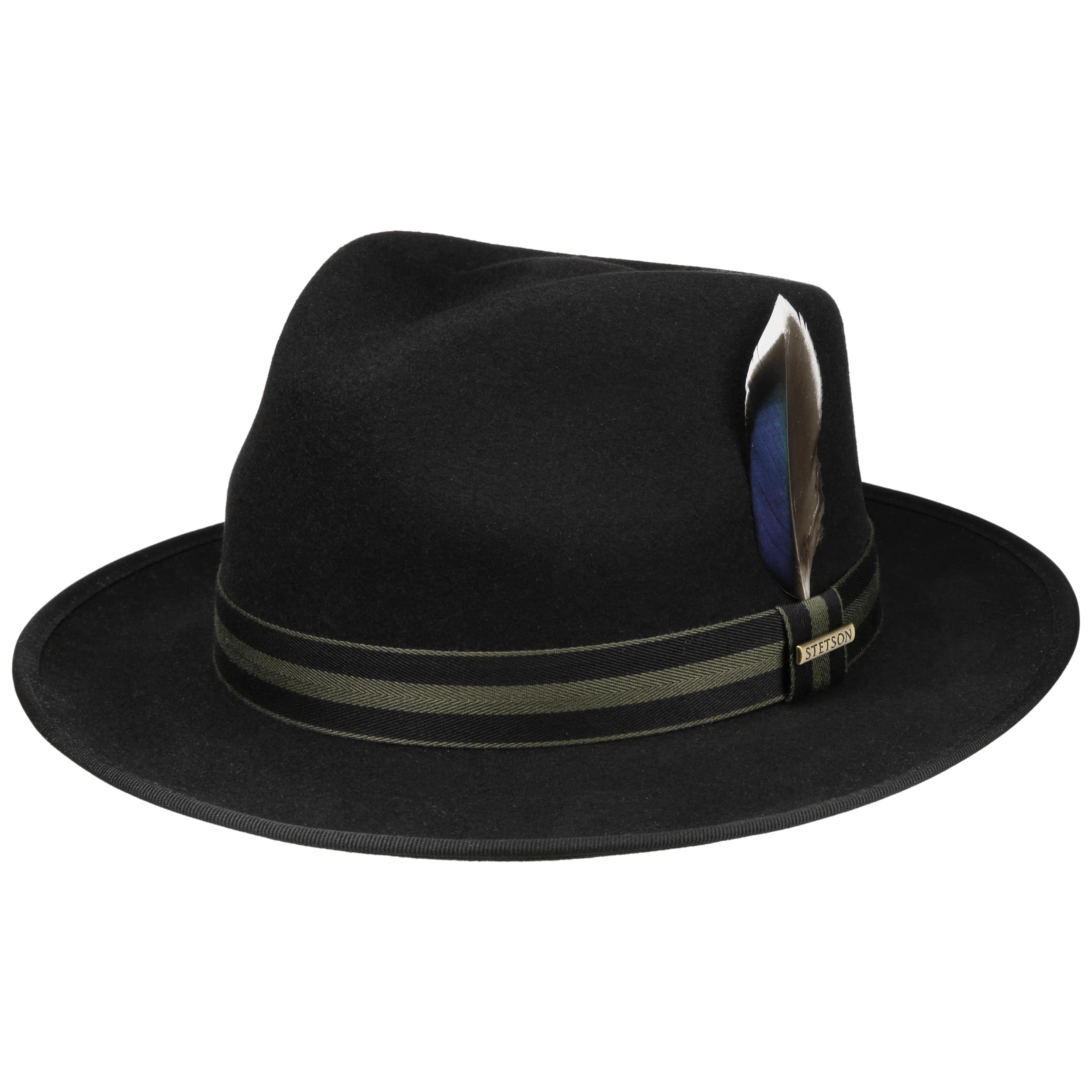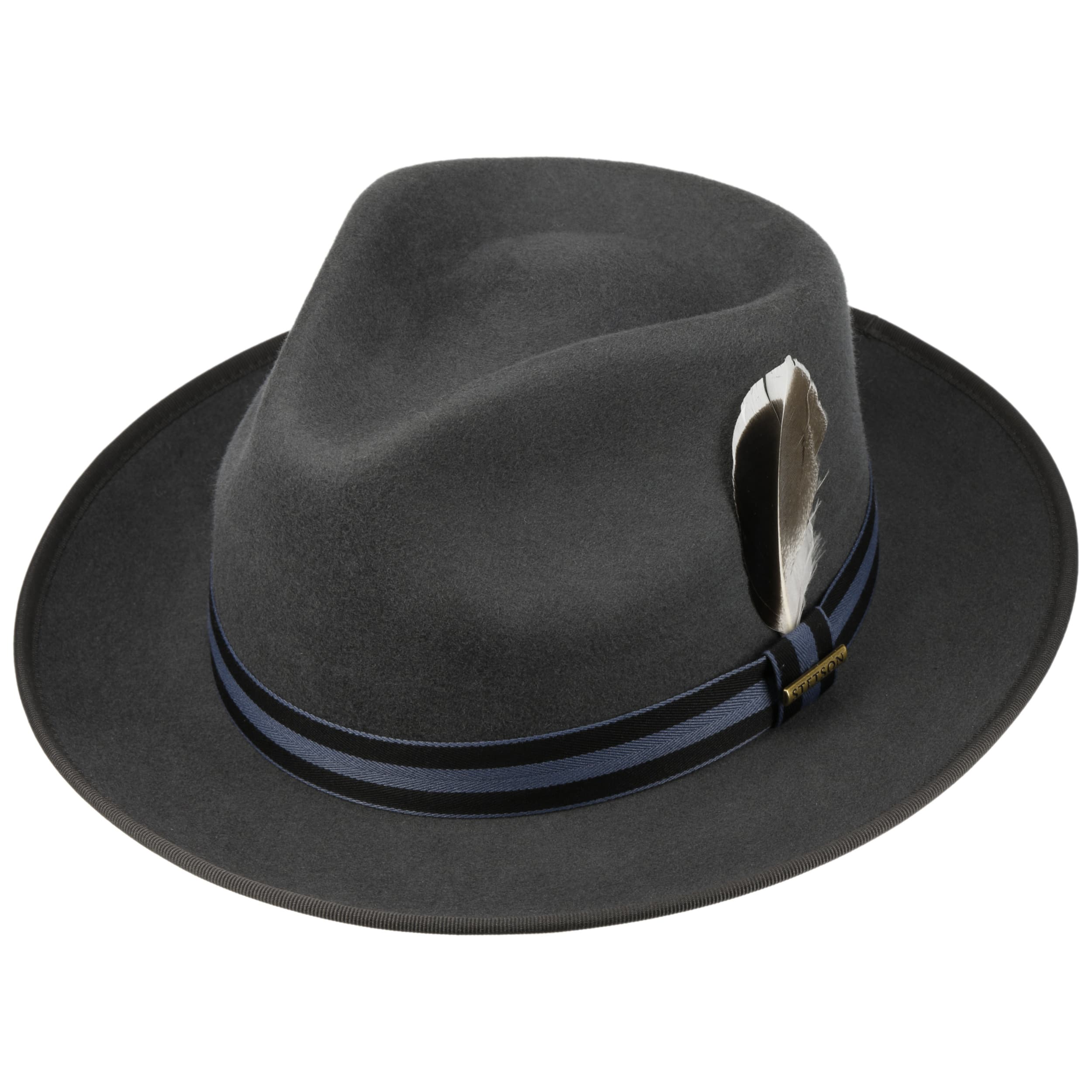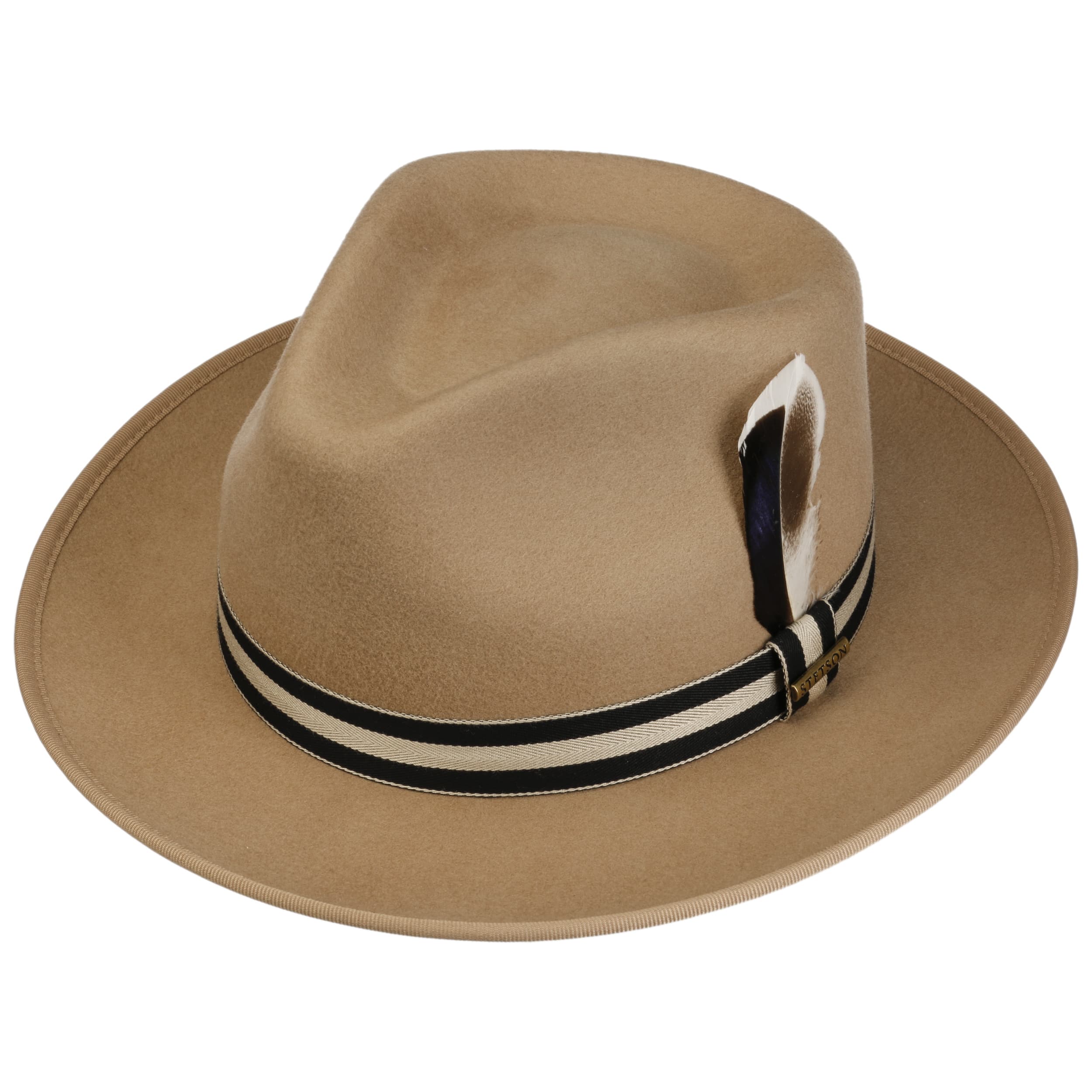 The Fedora from cult brand Stetson is carefully crafted from Australian sheep’s wool. The result is felt with a supple feel in a plain-coloured look, complemented in a sophisticated style by a striped grosgrain ribbon trim. The feather decoration on the side adds a decorative touch. Thanks to its water-repellent finish, this high-quality felt hat can even walk through a rain shower unimpressed and sits wonderfully comfortably thanks to its crushable properties.