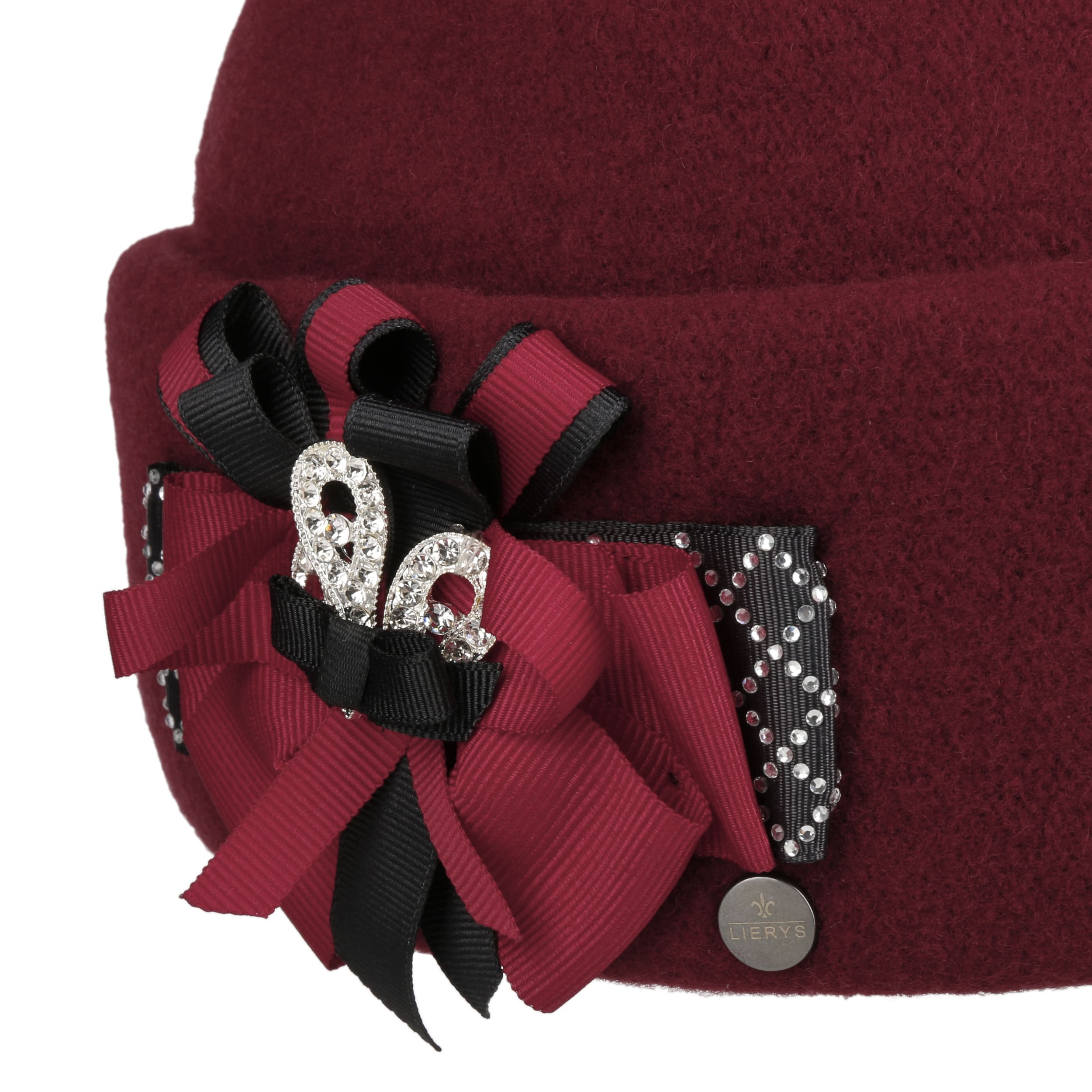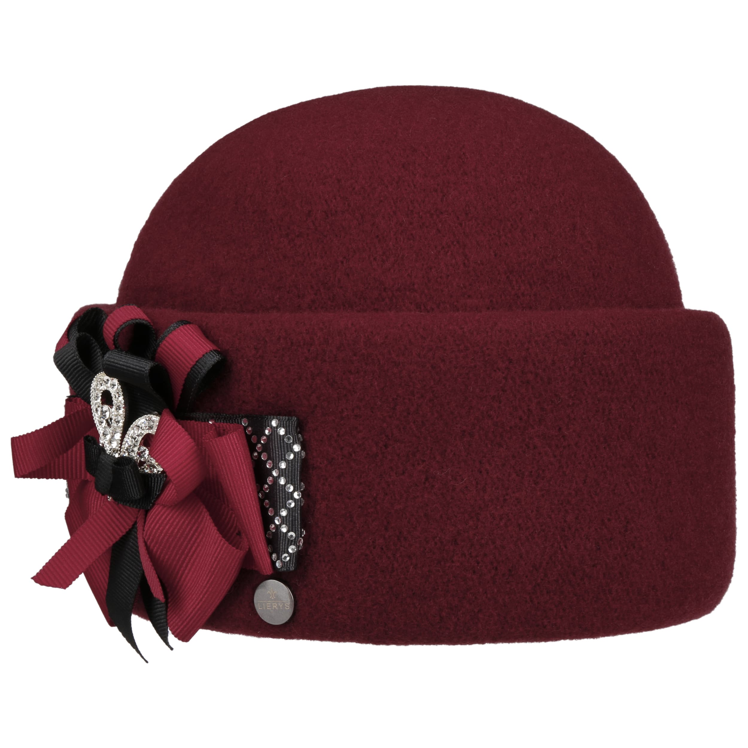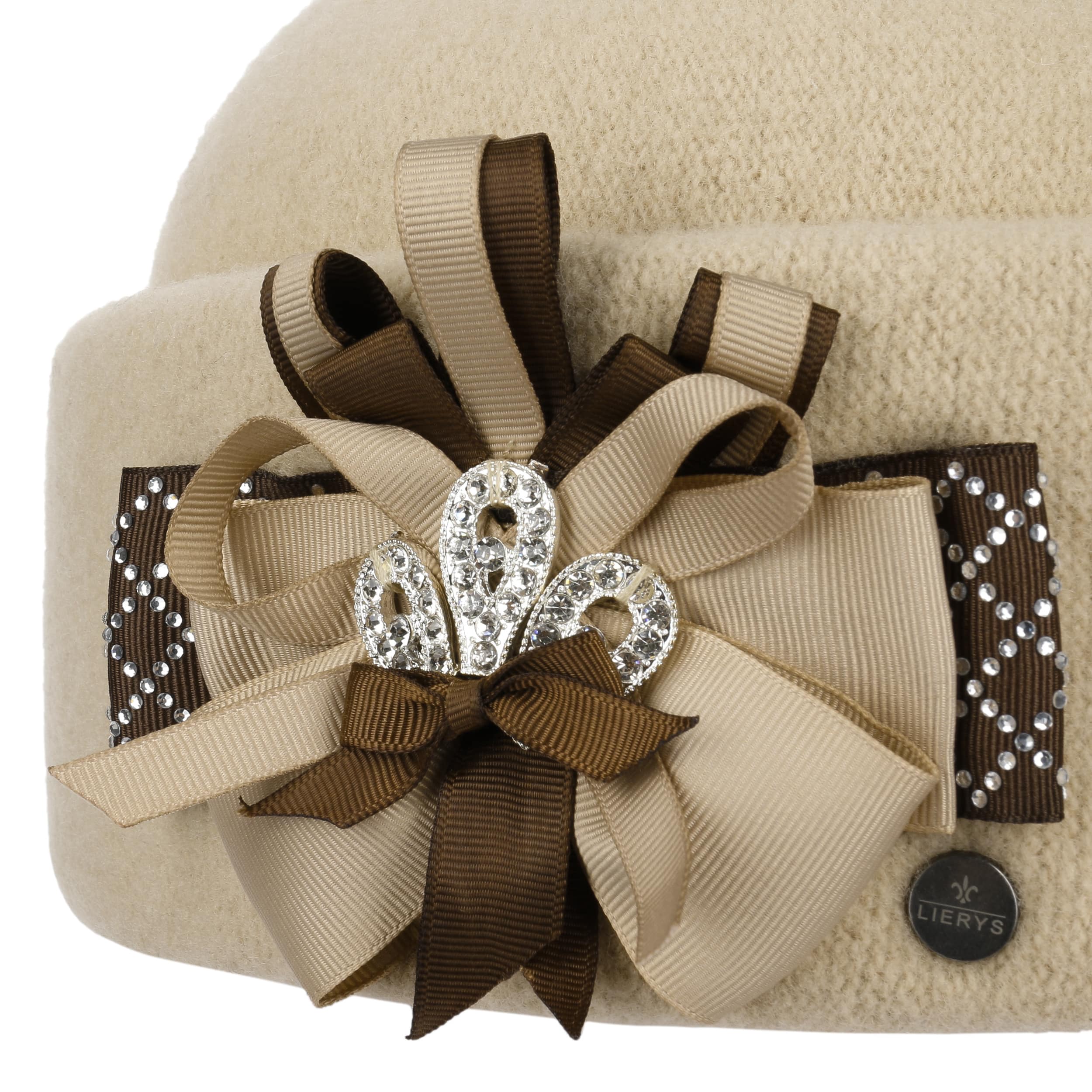This unusual wool hat from Lierys comes in the style of the 1920s. It is made from 100% warming wool and has a stretch lining band on the inside. A wide turn-up defines the feminine silhouette. The elaborate decoration of the handmade hat forms a lush bow consisting of several ribbons in different colours. Small shimmering gemstones add a touch of glamour.
