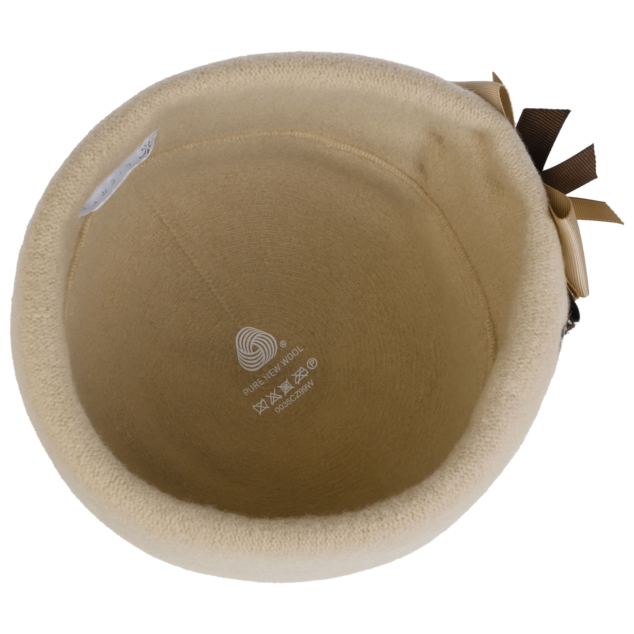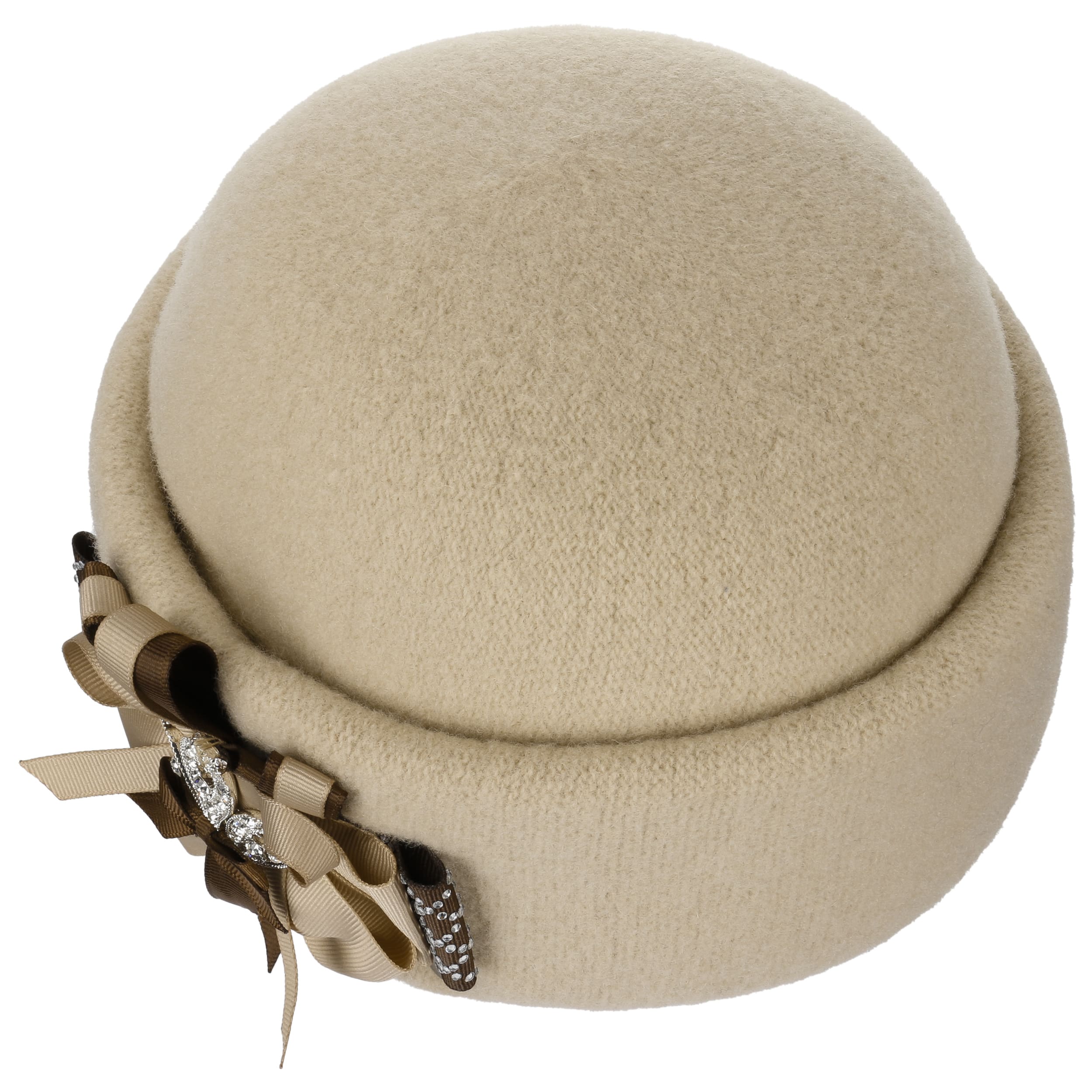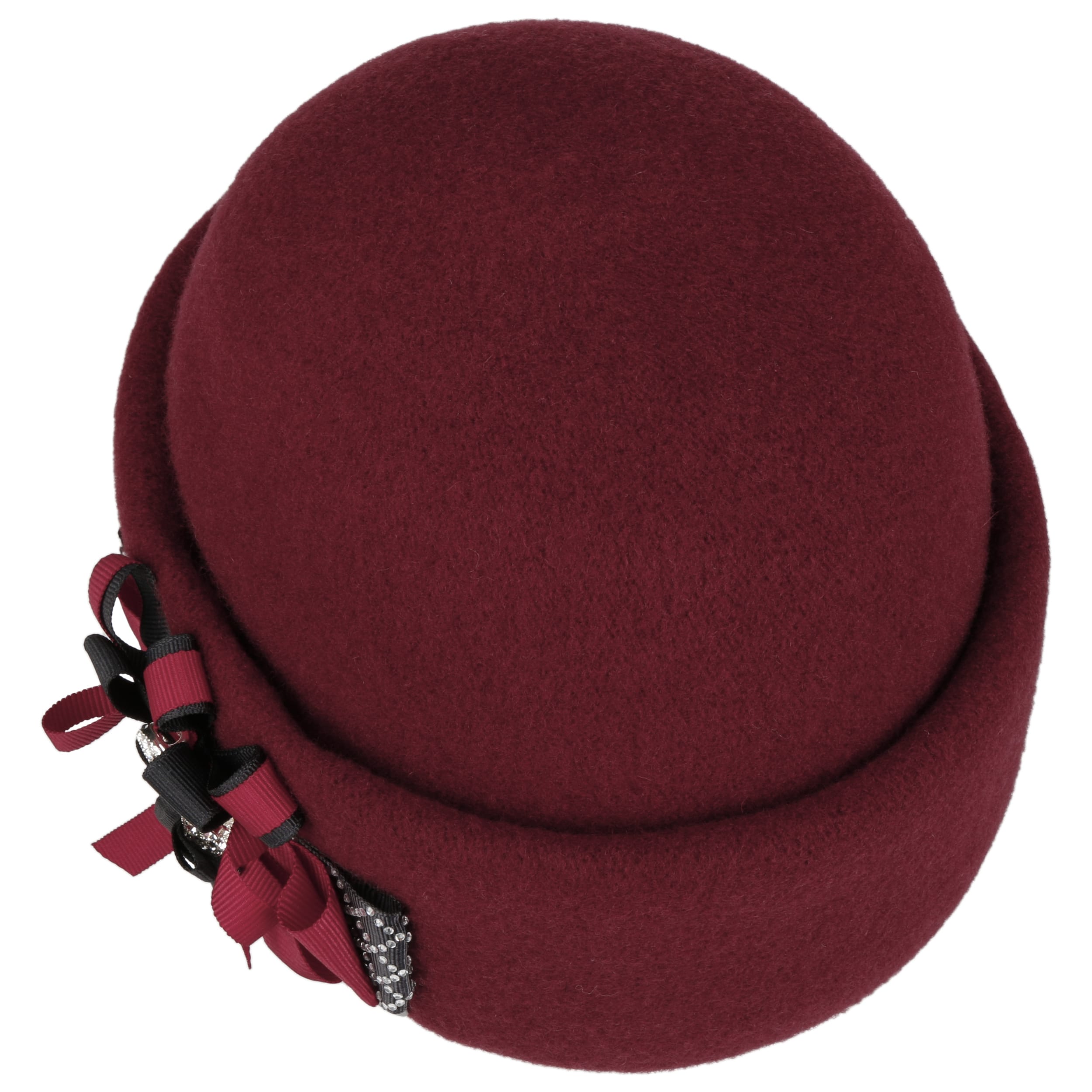 This unusual wool hat from Lierys comes in the style of the 1920s. It is made from 100% warming wool and has a stretch lining band on the inside. A wide turn-up defines the feminine silhouette. The elaborate decoration of the handmade hat forms a lush bow consisting of several ribbons in different colours. Small shimmering gemstones add a touch of glamour.