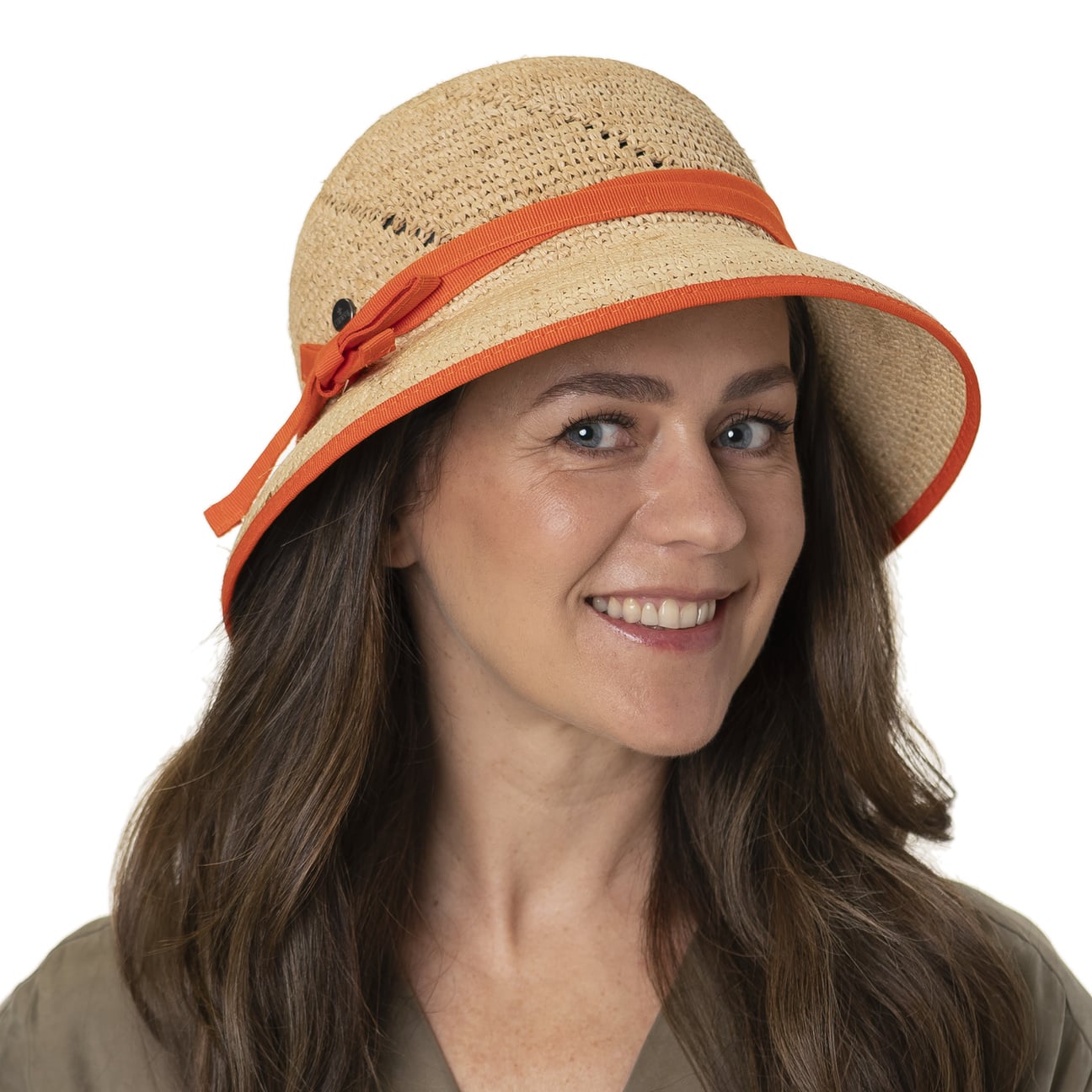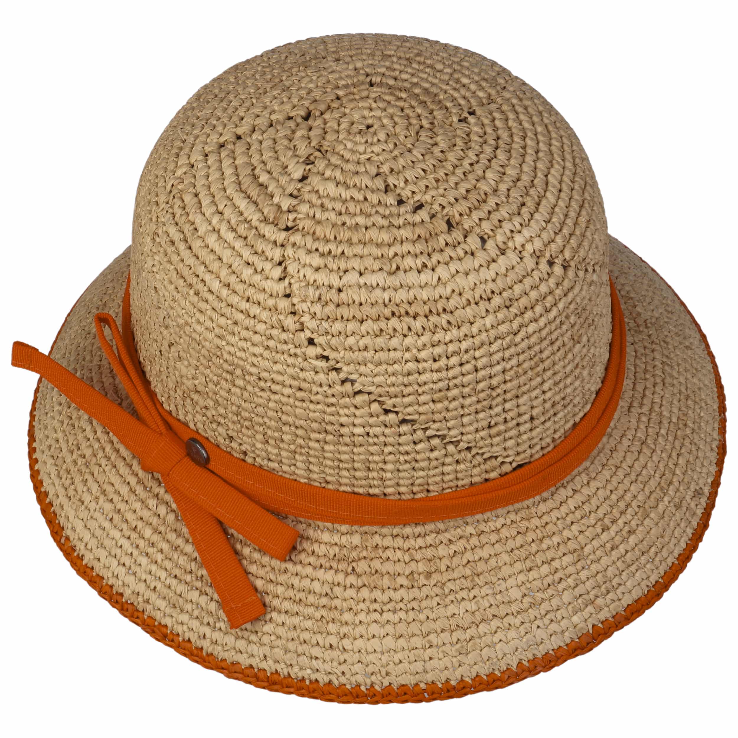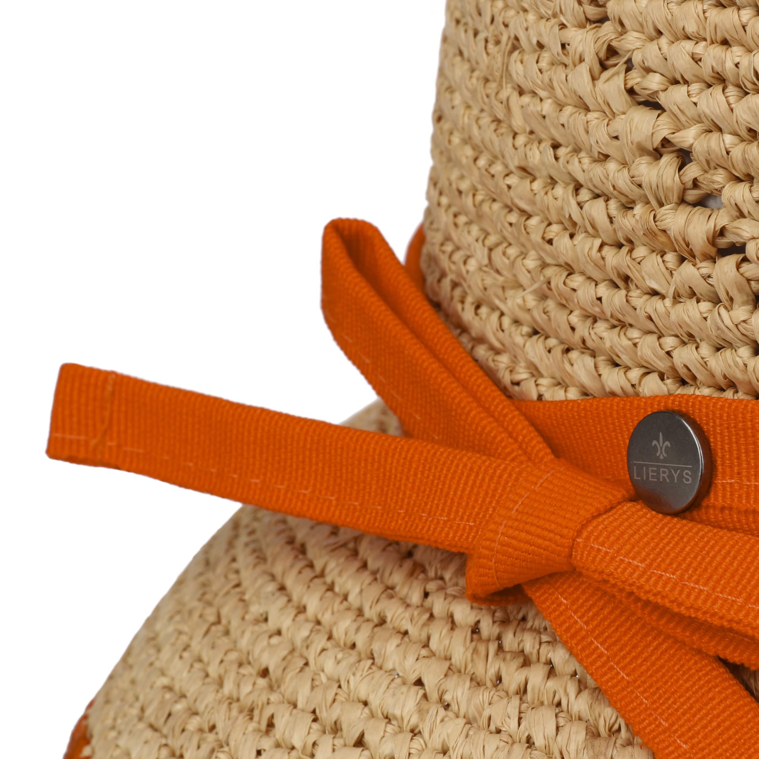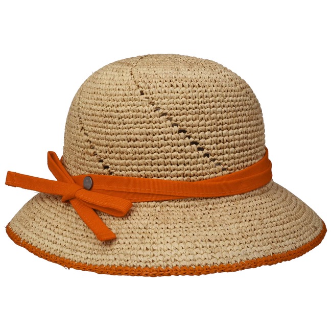 Crocheted straw in a natural colouring is used to shape this cloche from Lierys. A pattern running diagonally across the crown gives the straw hat an airy feel in an appealing way. A contrasting edging around the brim adds summery freshness to the plain-coloured headwear, along with the narrow fabric trim band that ends in a bow at the side.