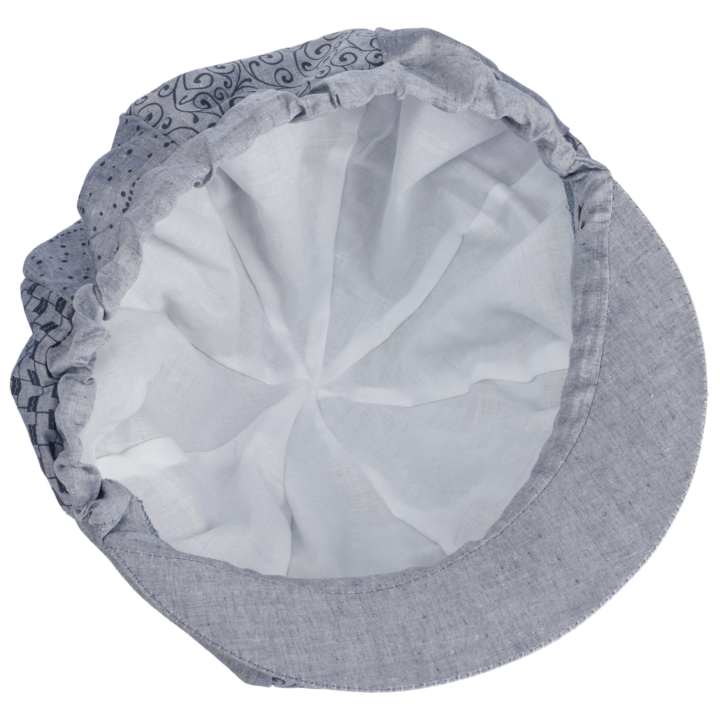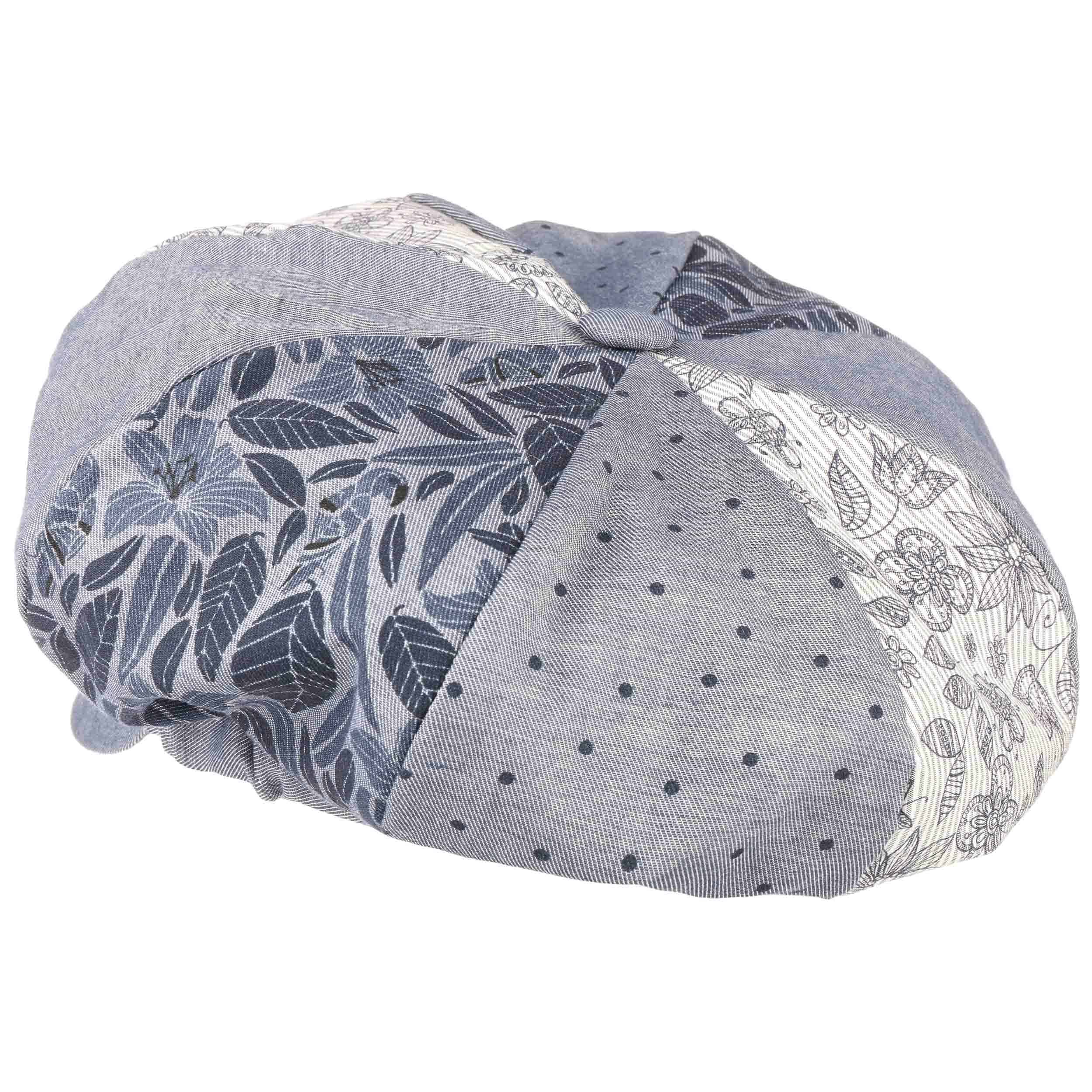 The feminine, carefree summery design of this baker boy cap from Lipodo has a charming and beguiling appeal. Its luxurious crown shows off several inspiring patterns, which combine together into a clean and straightforward patchwork. Here you will see numerous delicate flowers and pretty dots. The plain-coloured brim stands in contrast to this and gives this handmade hat a dynamic, modern touch.