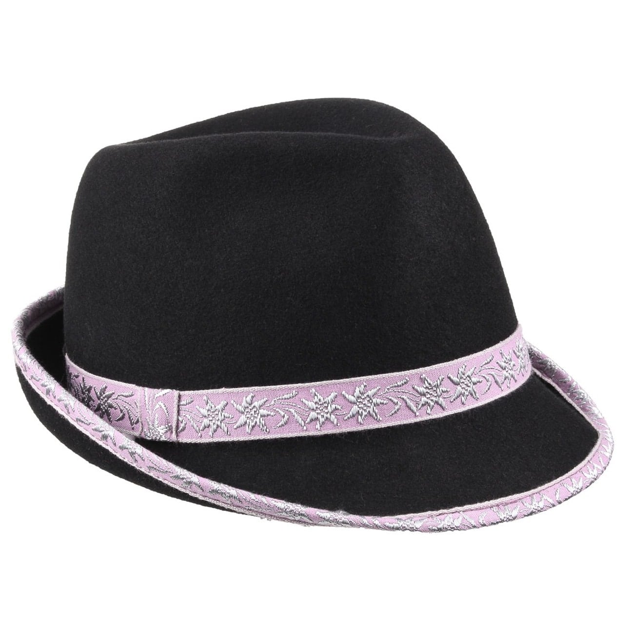 Our own brand provides a fresh selection of trendy headwear and fashion accessories: army and baseball caps, flat caps, baker boy hats, trilbies, fedoras, Western and cowboy hats, bucket hats, berets, beanies, scarves and gloves as well as care products. We offer you both classic and fancy designs in high quality at a more than reasonable price. Our exquisite selection is for people of sophisticated taste at the pulse of the time.- Bavarian Hat with Edelweiss Trim - lilac 2