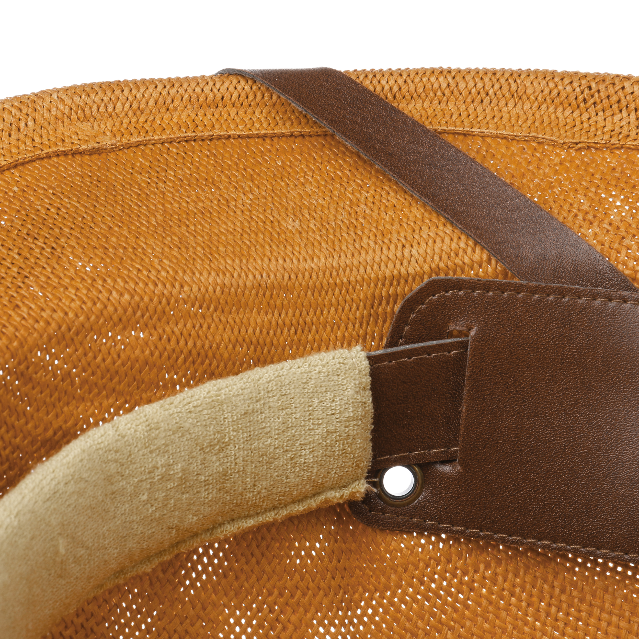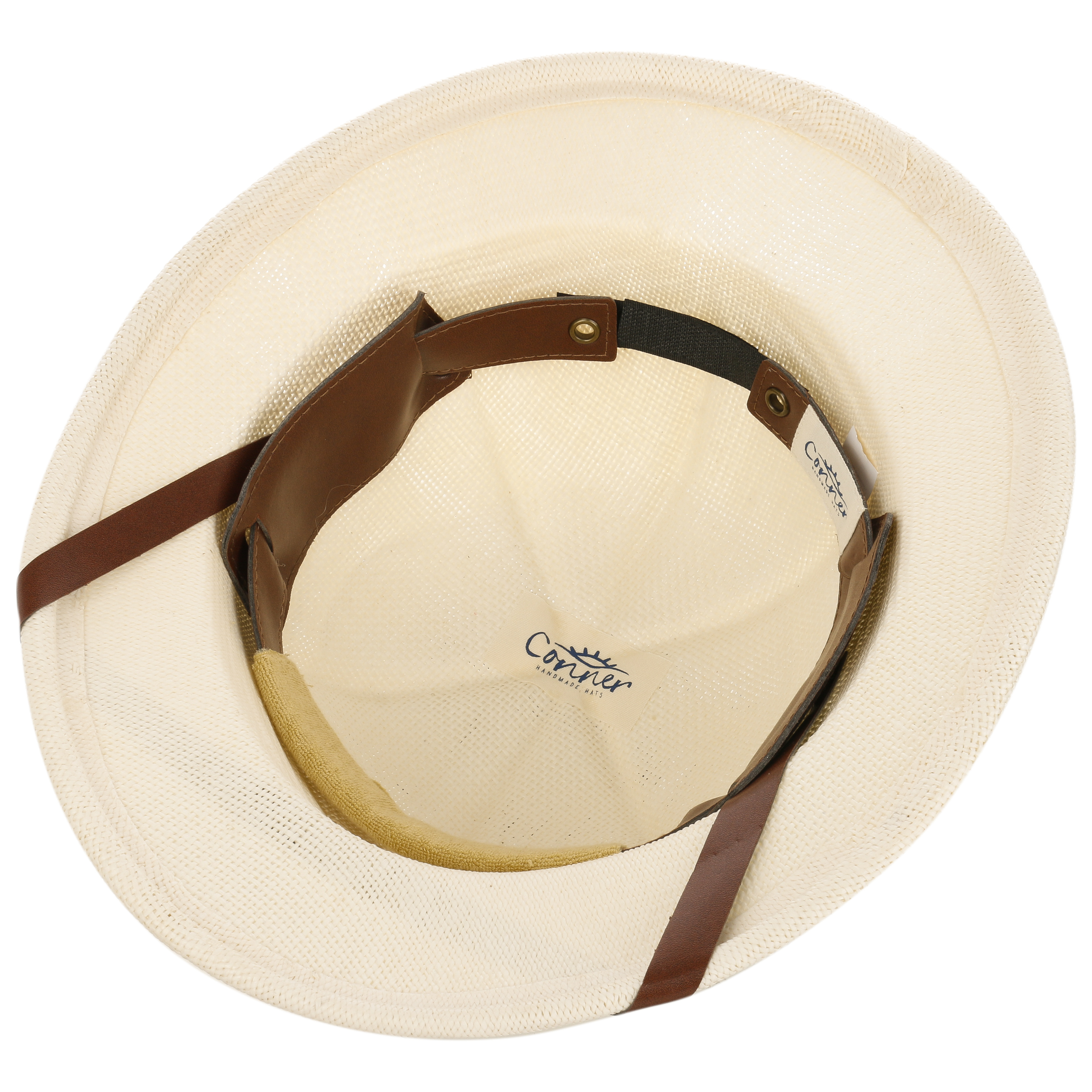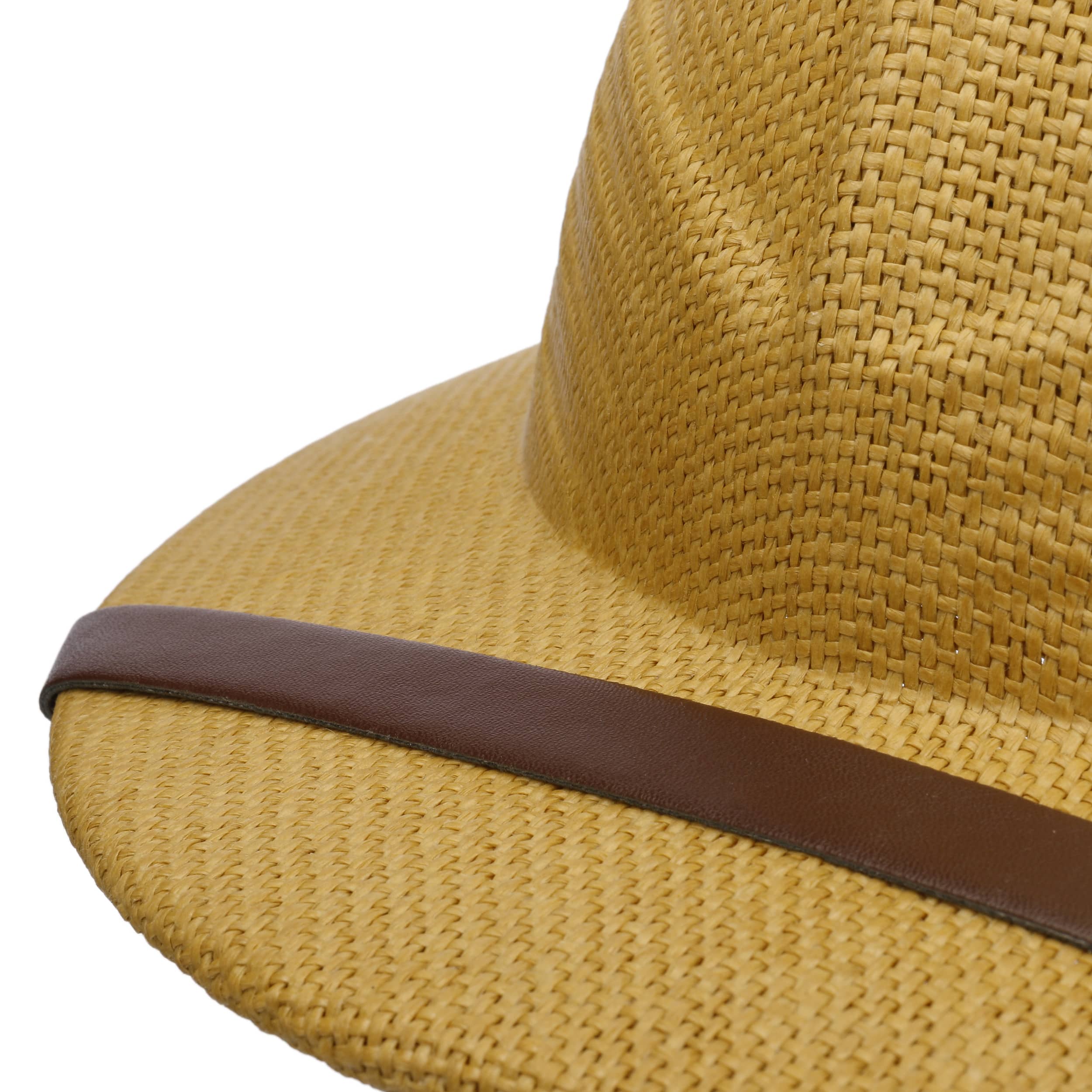 With characteristic leather trim across the brim.
