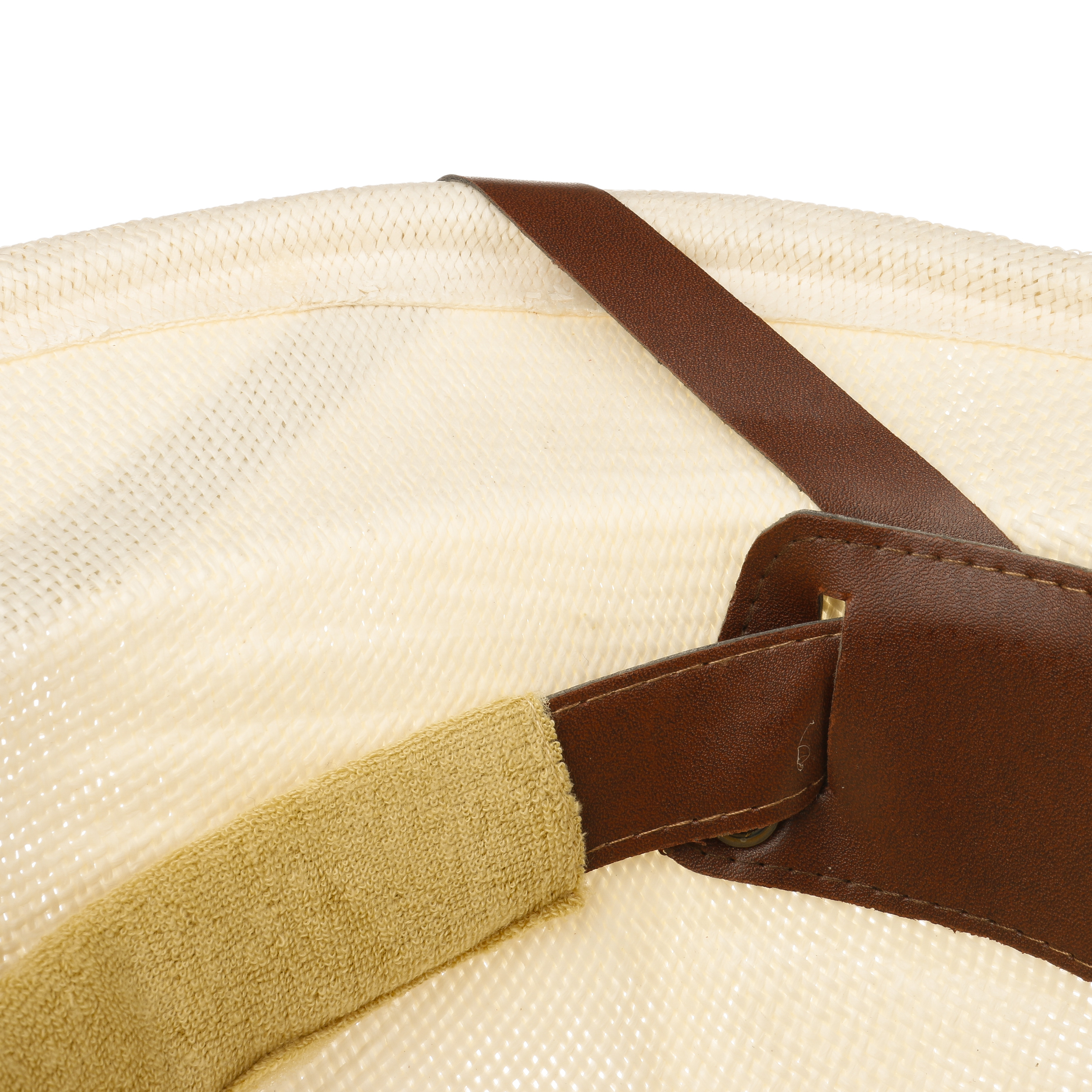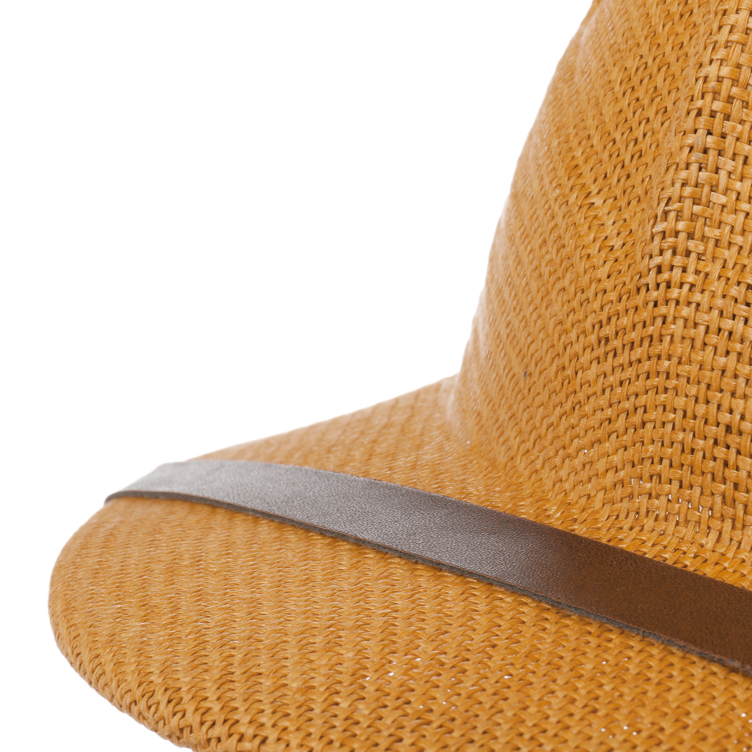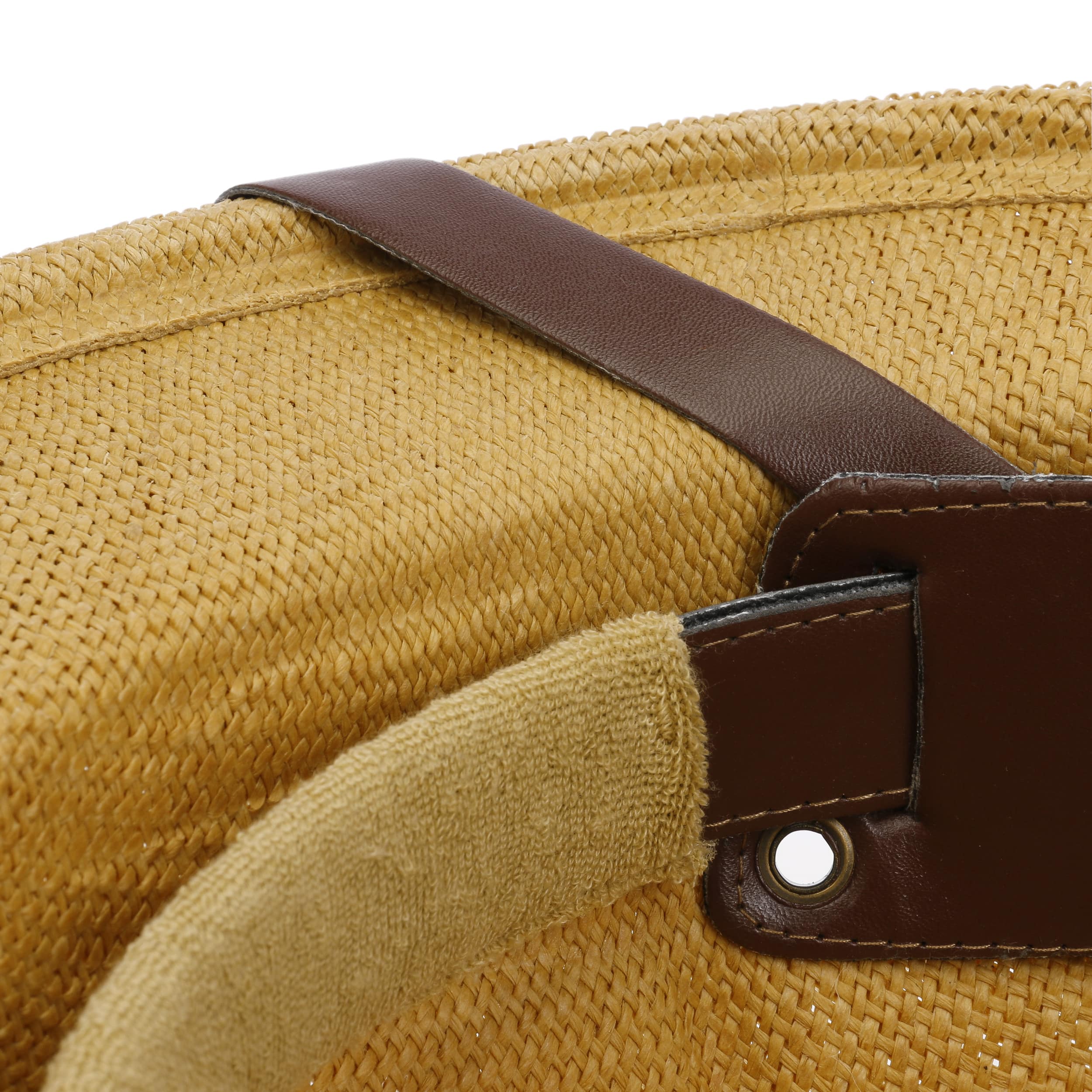 With characteristic leather trim across the brim.
