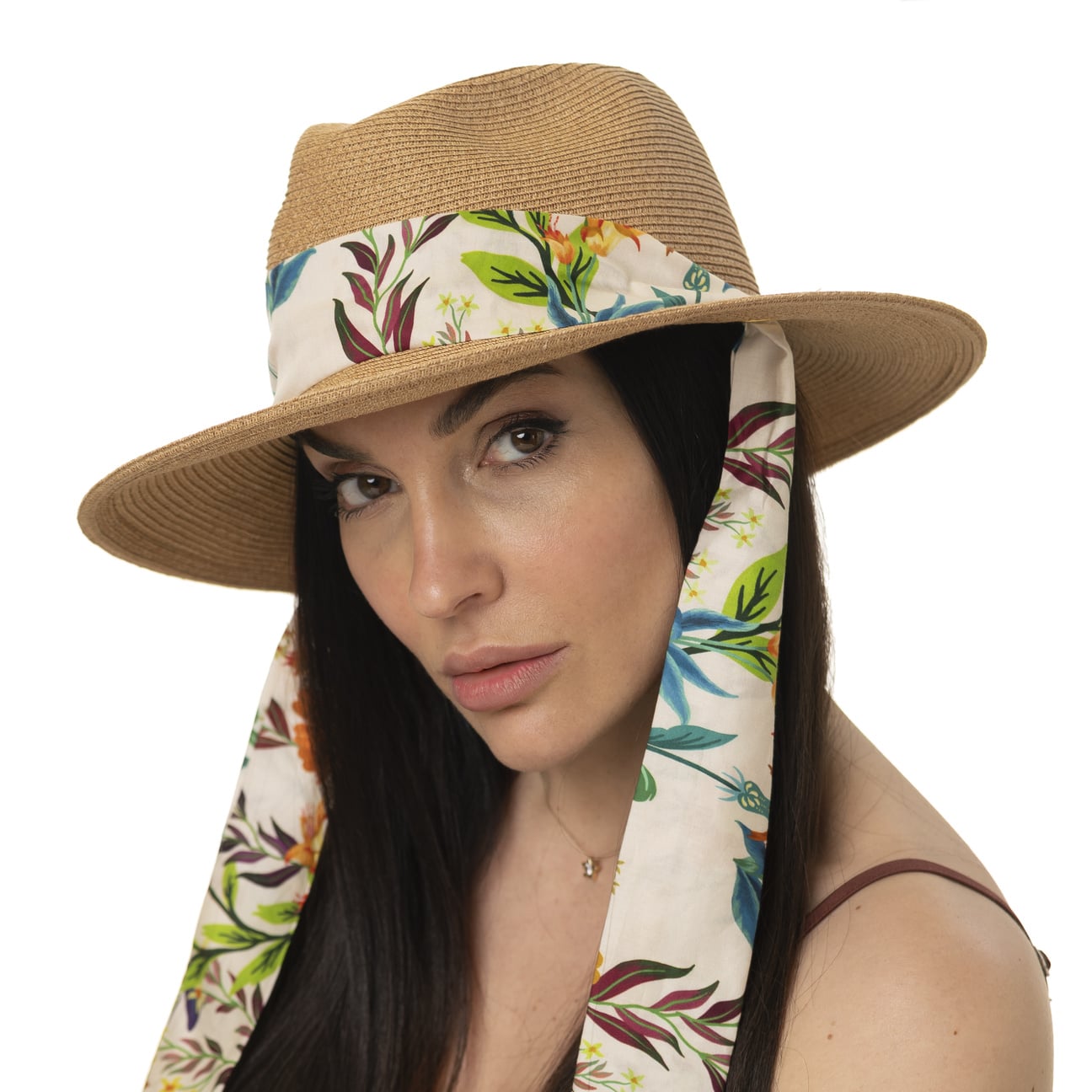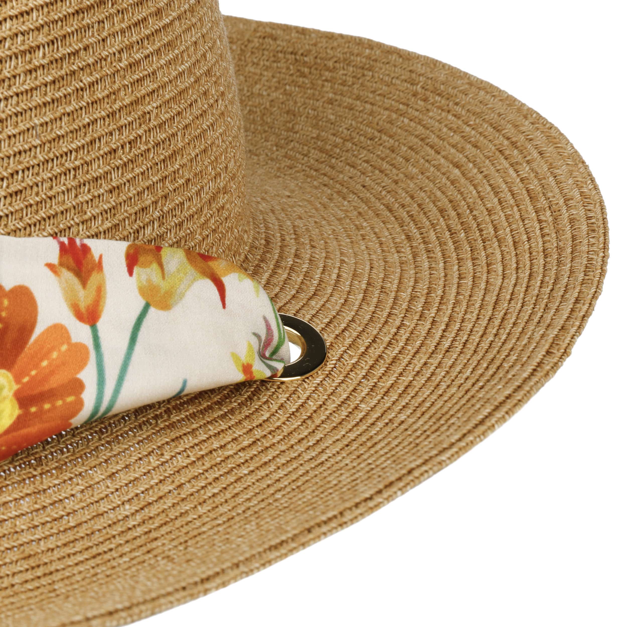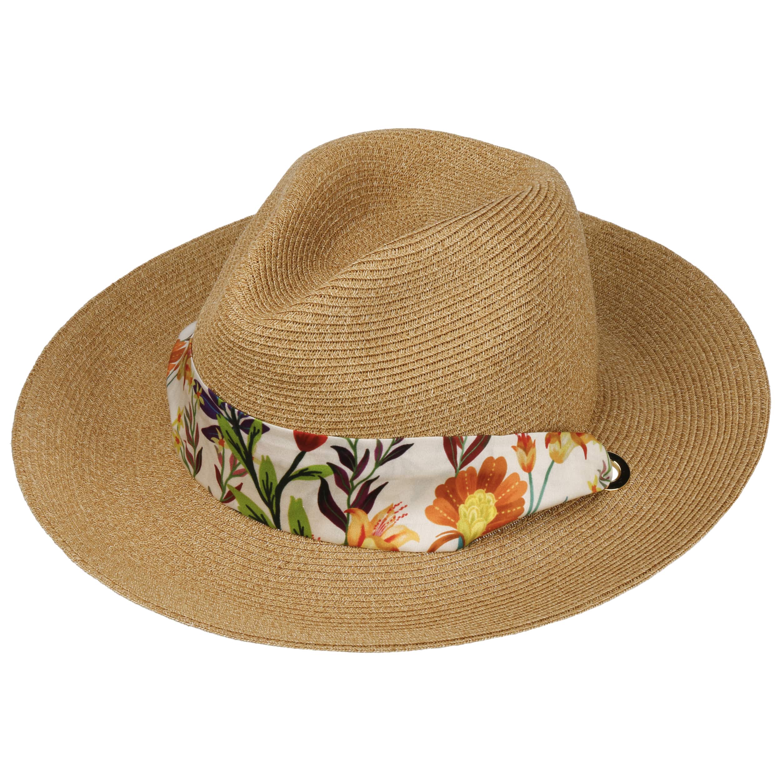 The lightweight straw hat with band from Lierys is made from breathable and robust paper straw. Its classic shape with the upwardly curved brim makes it a timeless accessory for the summer. A colourful fabric ribbon with a floral pattern is tied into a bow under the chin. It ensures that the straw hat won’t fly off your head on windy days and gives it a playful touch at the same time.