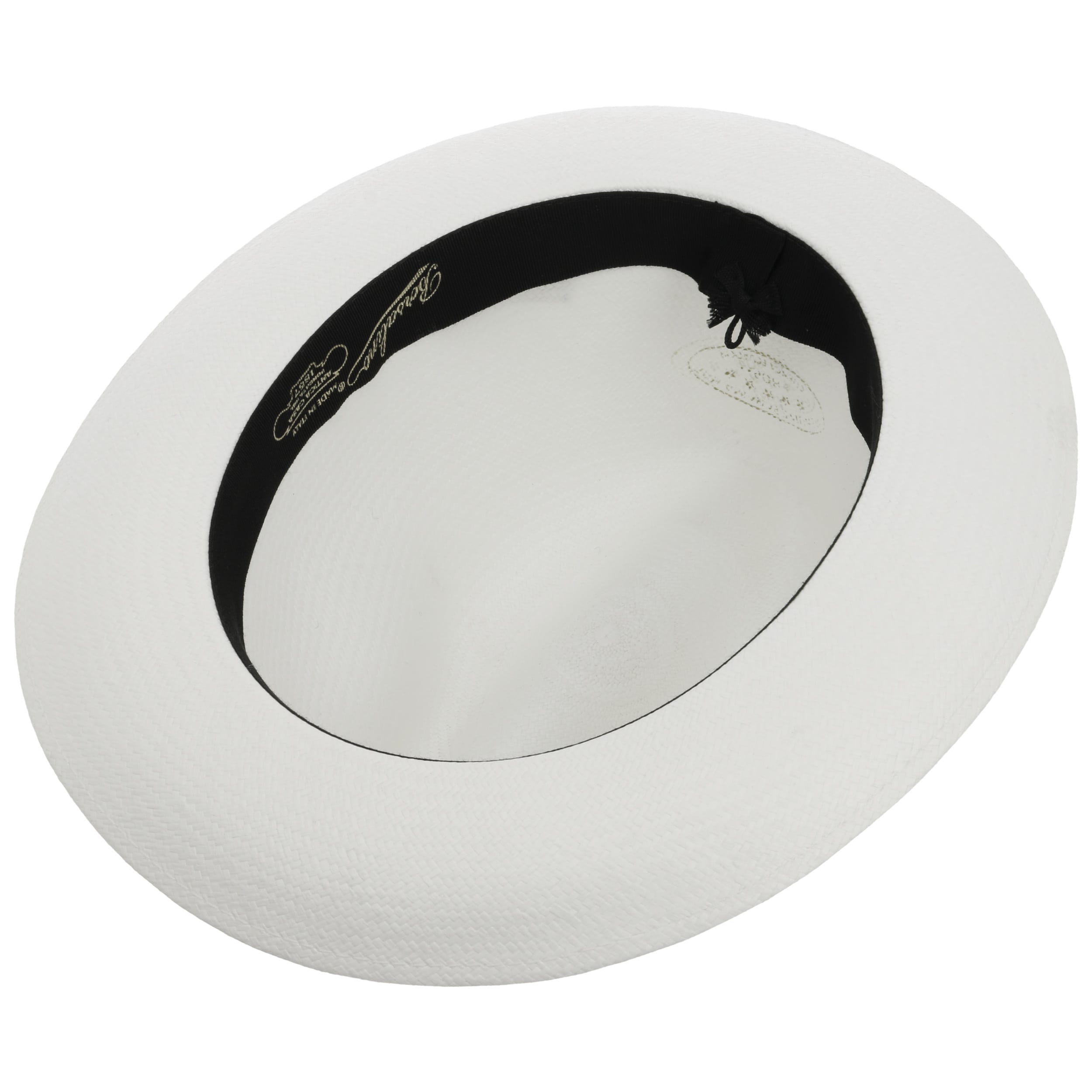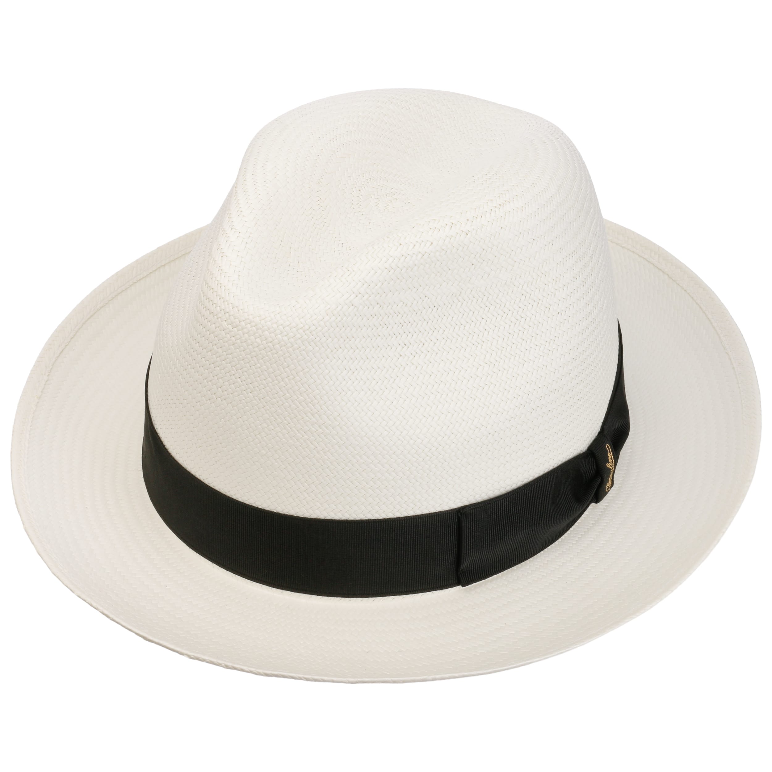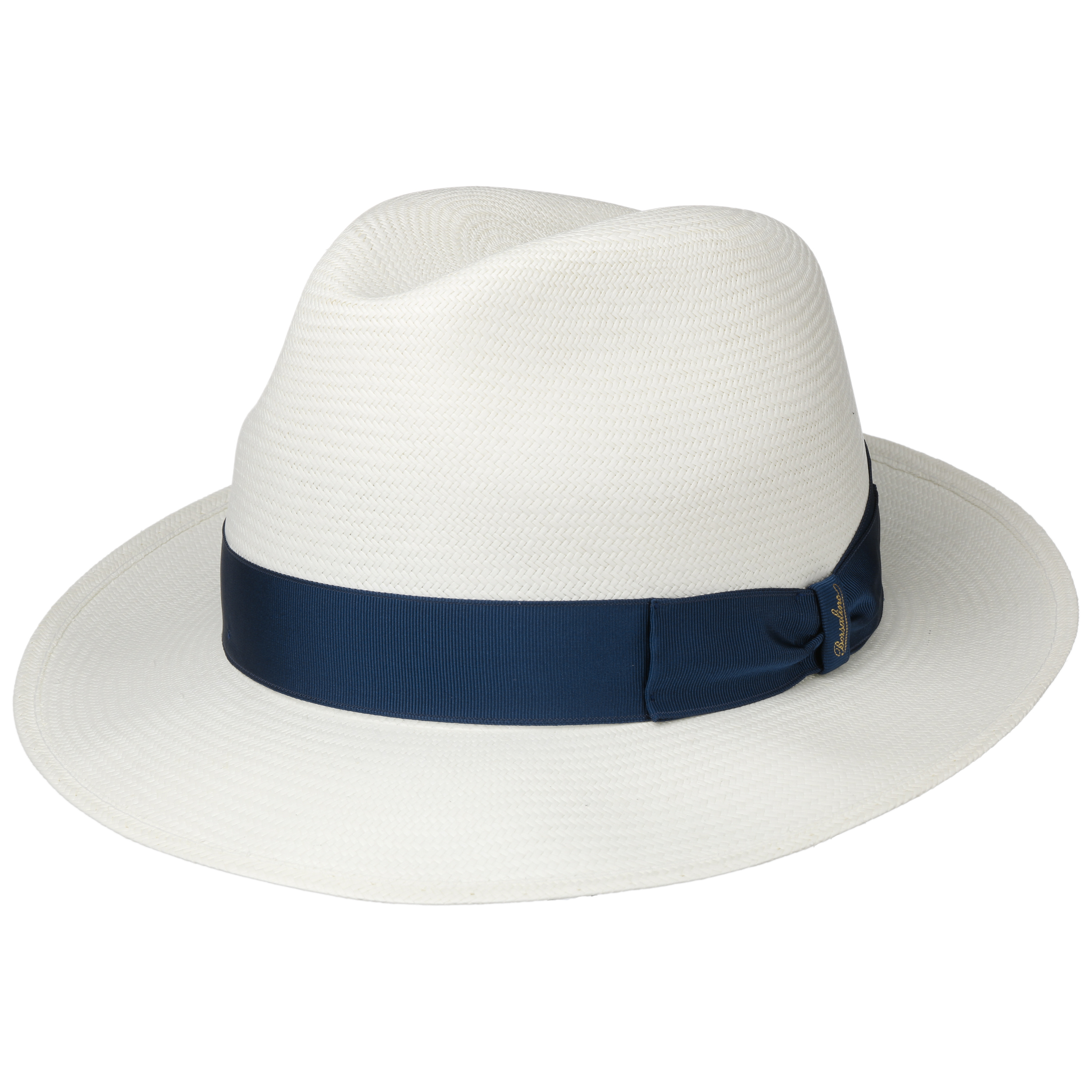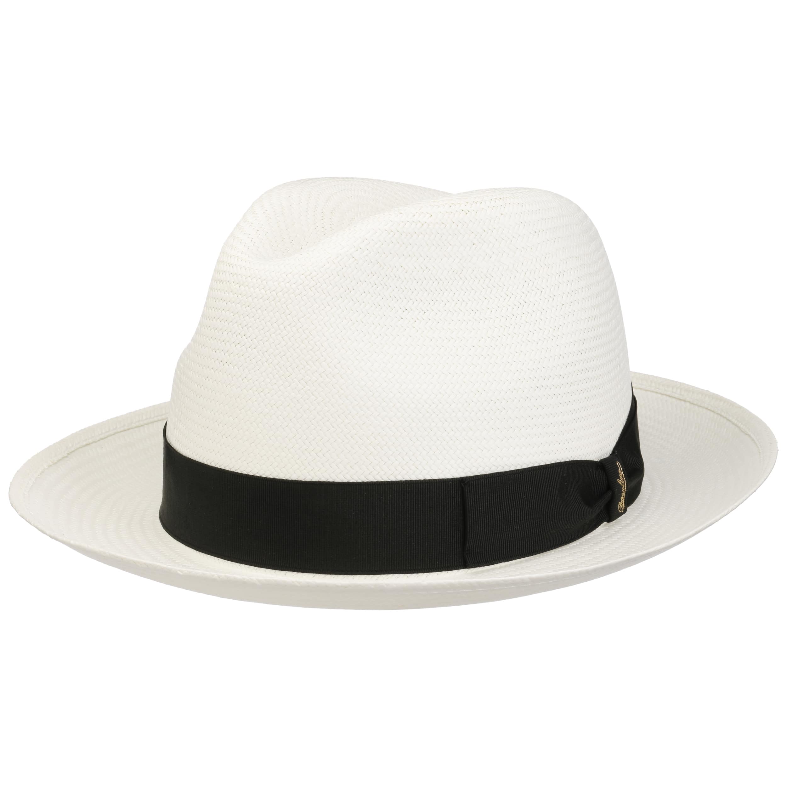 The Italian high-quality brand became famous for its fedoras made from precious lapin and beaver fur. Since 1857, Borsalino has been producing finest handmade, water repellent and ultralight headwear. International celebrities such as Al Capone and Humphrey Bogart made the "hat of the hats" a timeless classic. The company, meanwhile, has added other styles to its selection, e.g. first-rate flat caps and fashionable Panama hats as well as elegant women's styles.- Black Trim Small Panama Hat by Borsalino - nature-blue 1