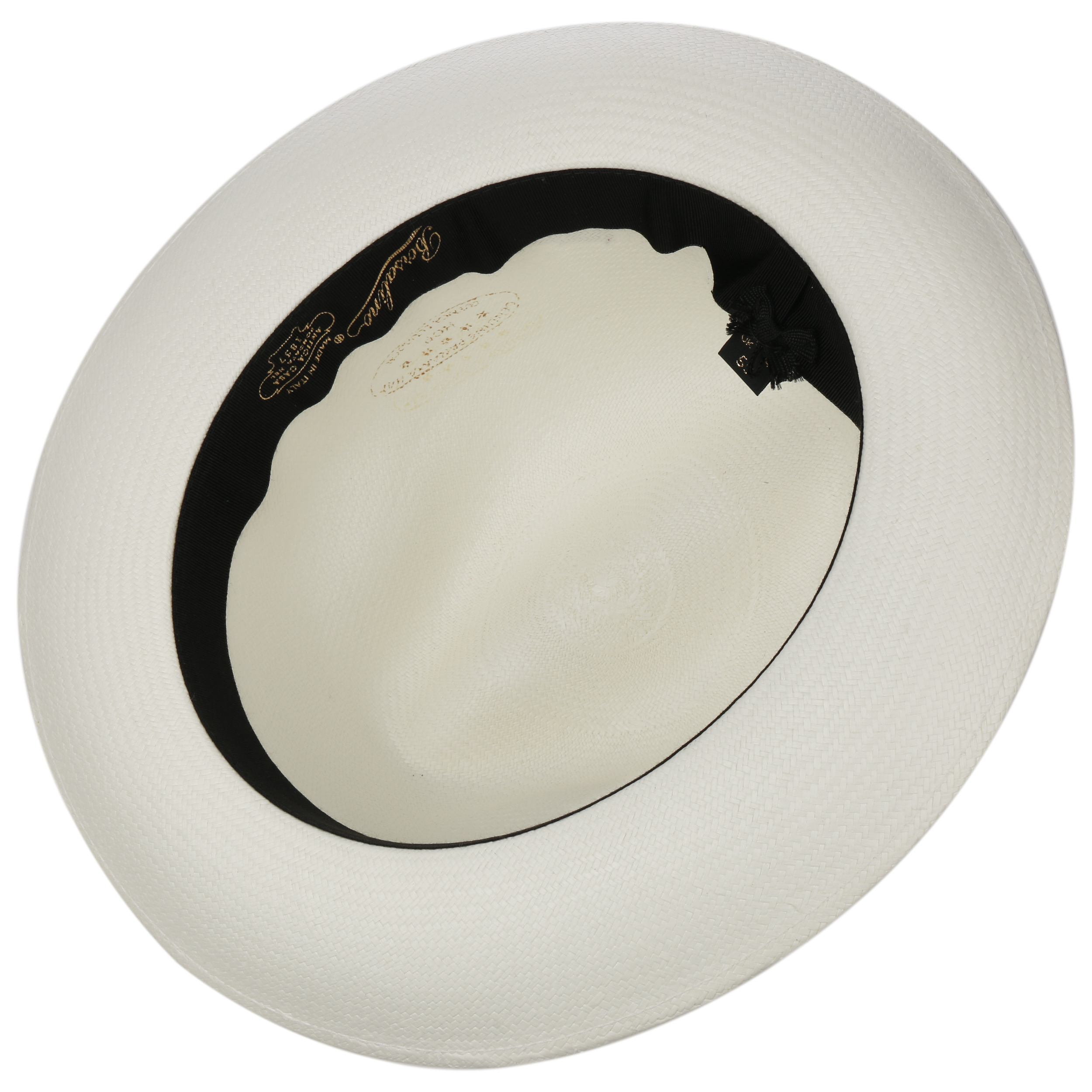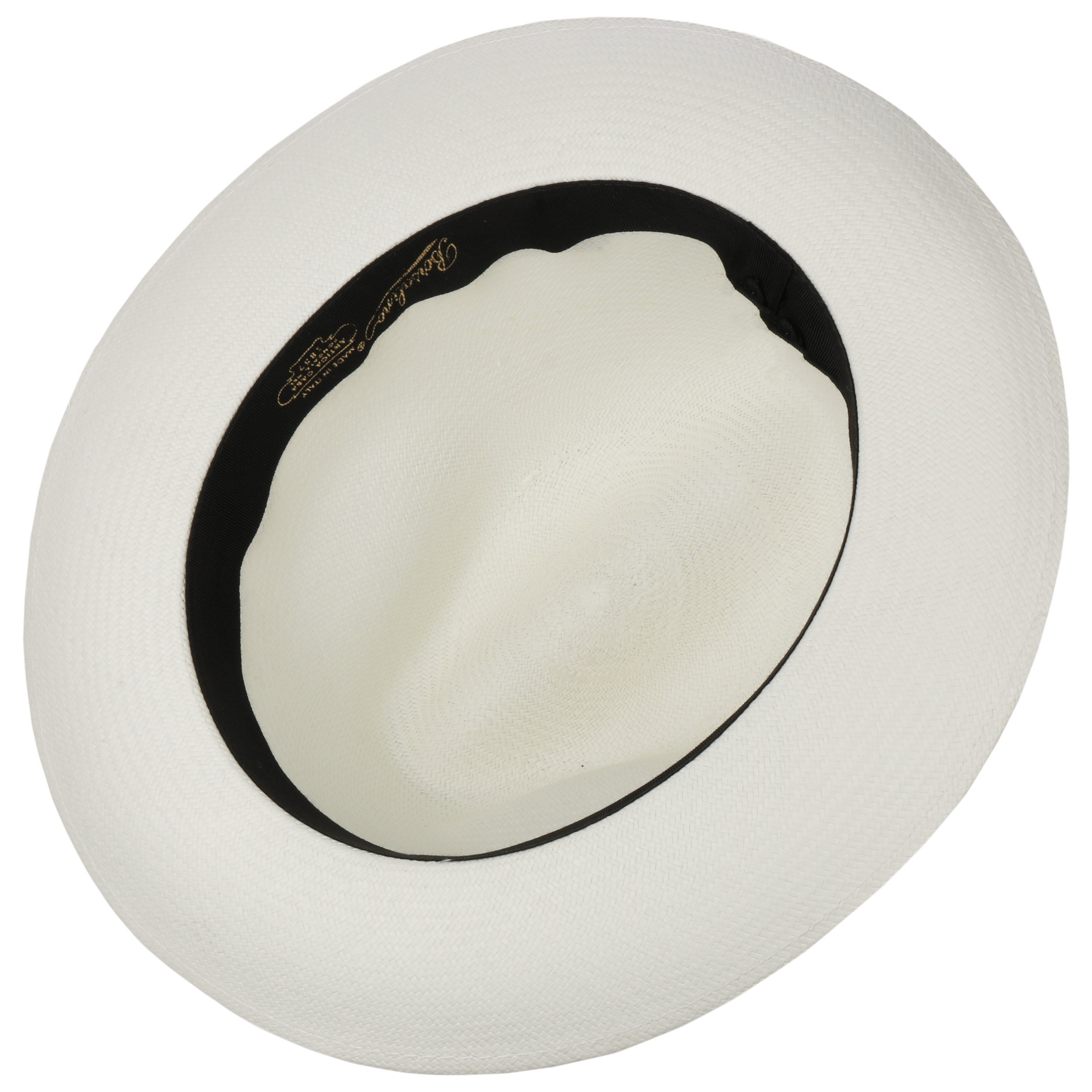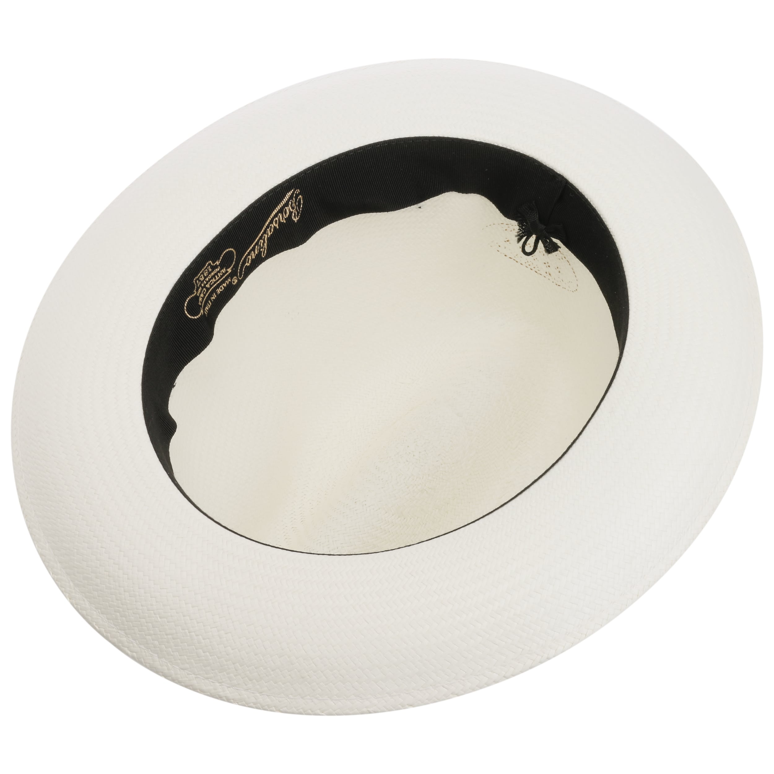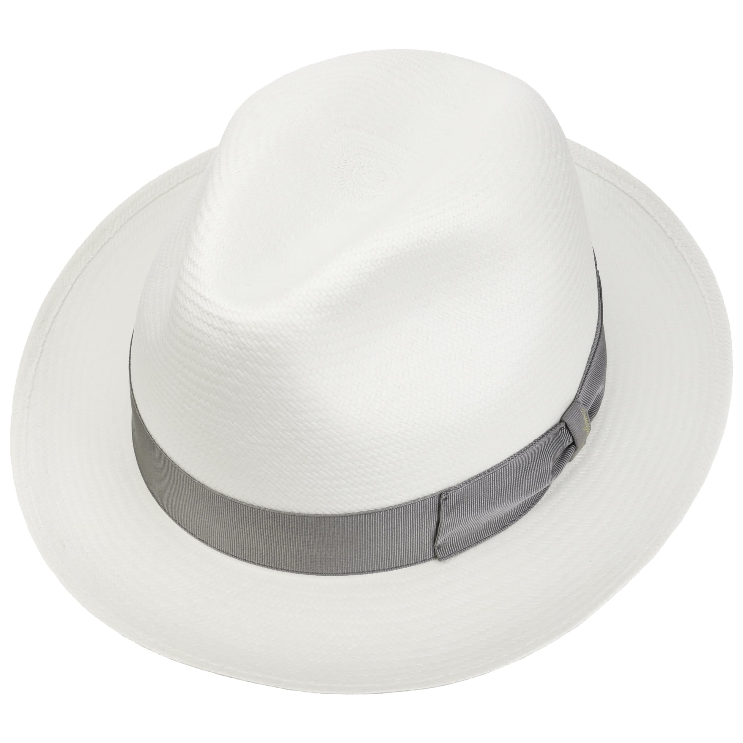 The Italian high-quality brand became famous for its fedoras made from precious lapin and beaver fur. Since 1857, Borsalino has been producing finest handmade, water repellent and ultralight headwear. International celebrities such as Al Capone and Humphrey Bogart made the "hat of the hats" a timeless classic. The company, meanwhile, has added other styles to its selection, e.g. first-rate flat caps and fashionable Panama hats as well as elegant women's styles.- Black Trim Small Panama Hat by Borsalino - nature-blue 1