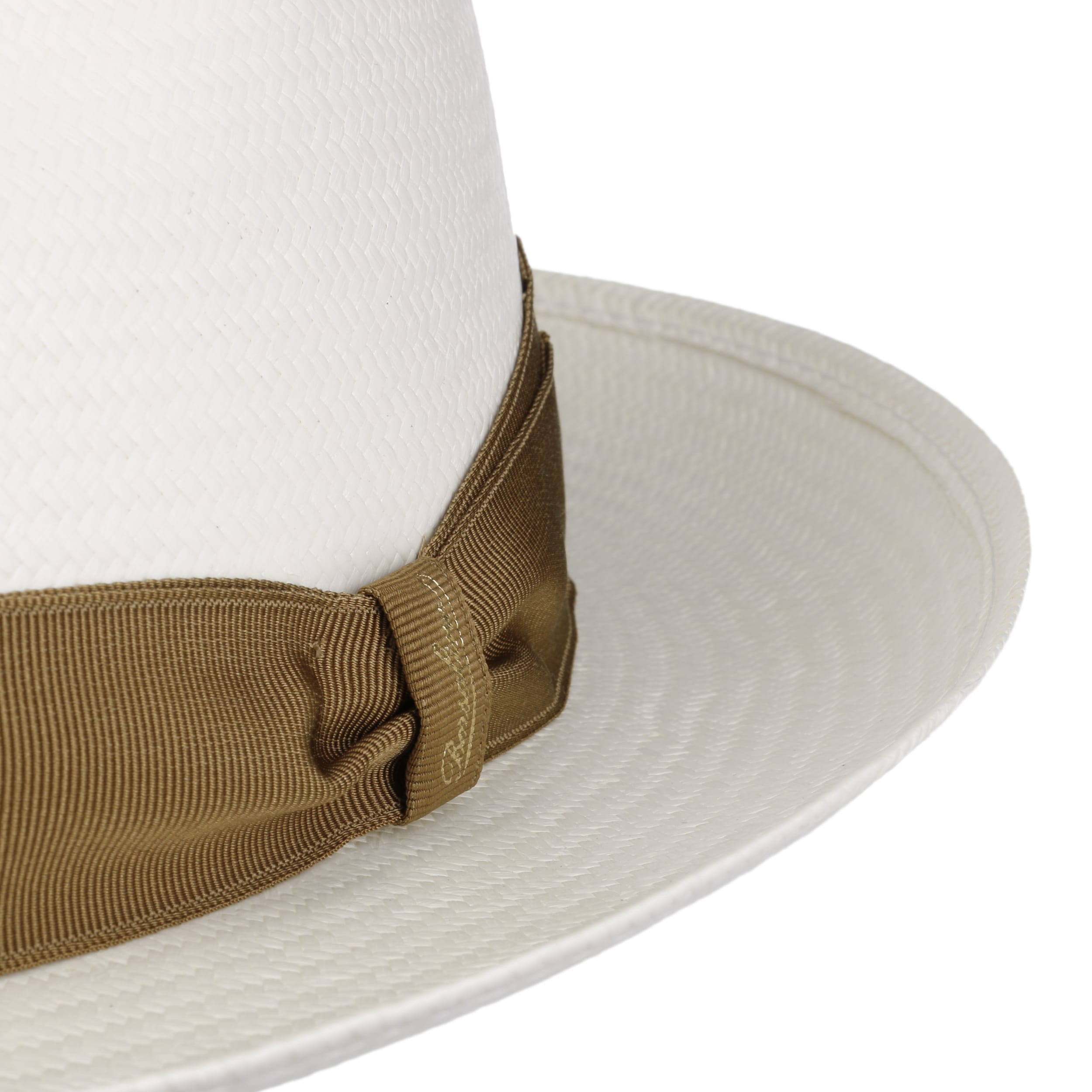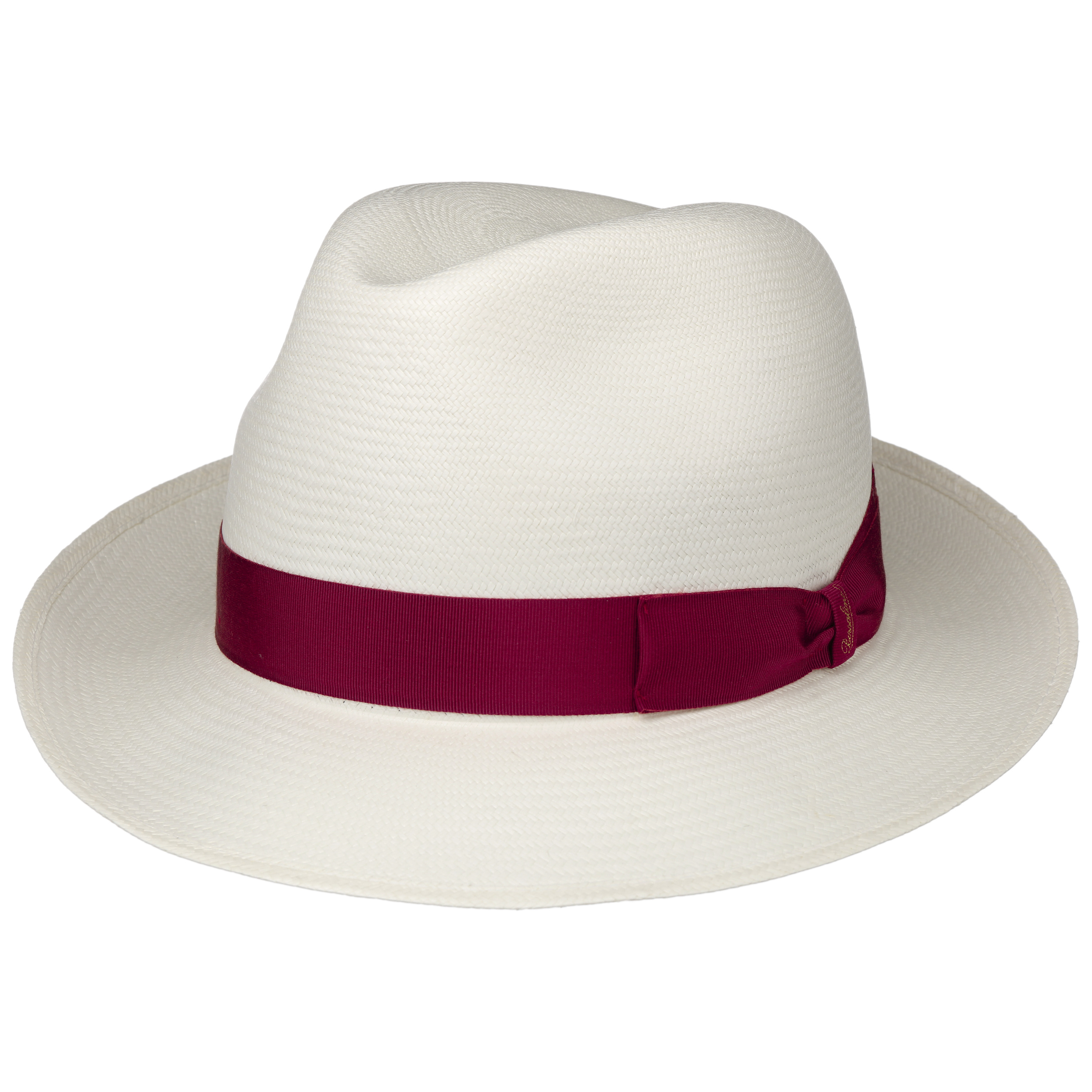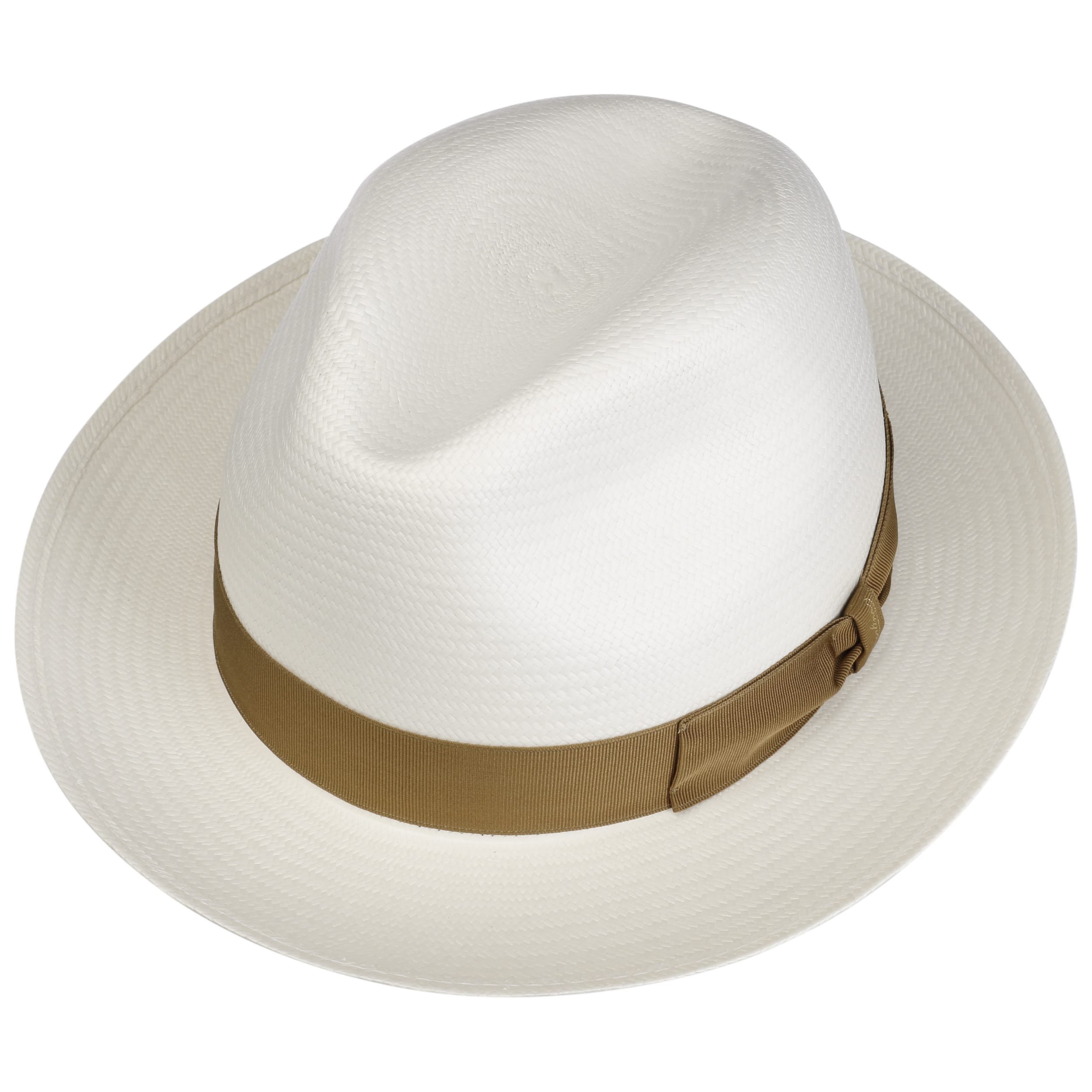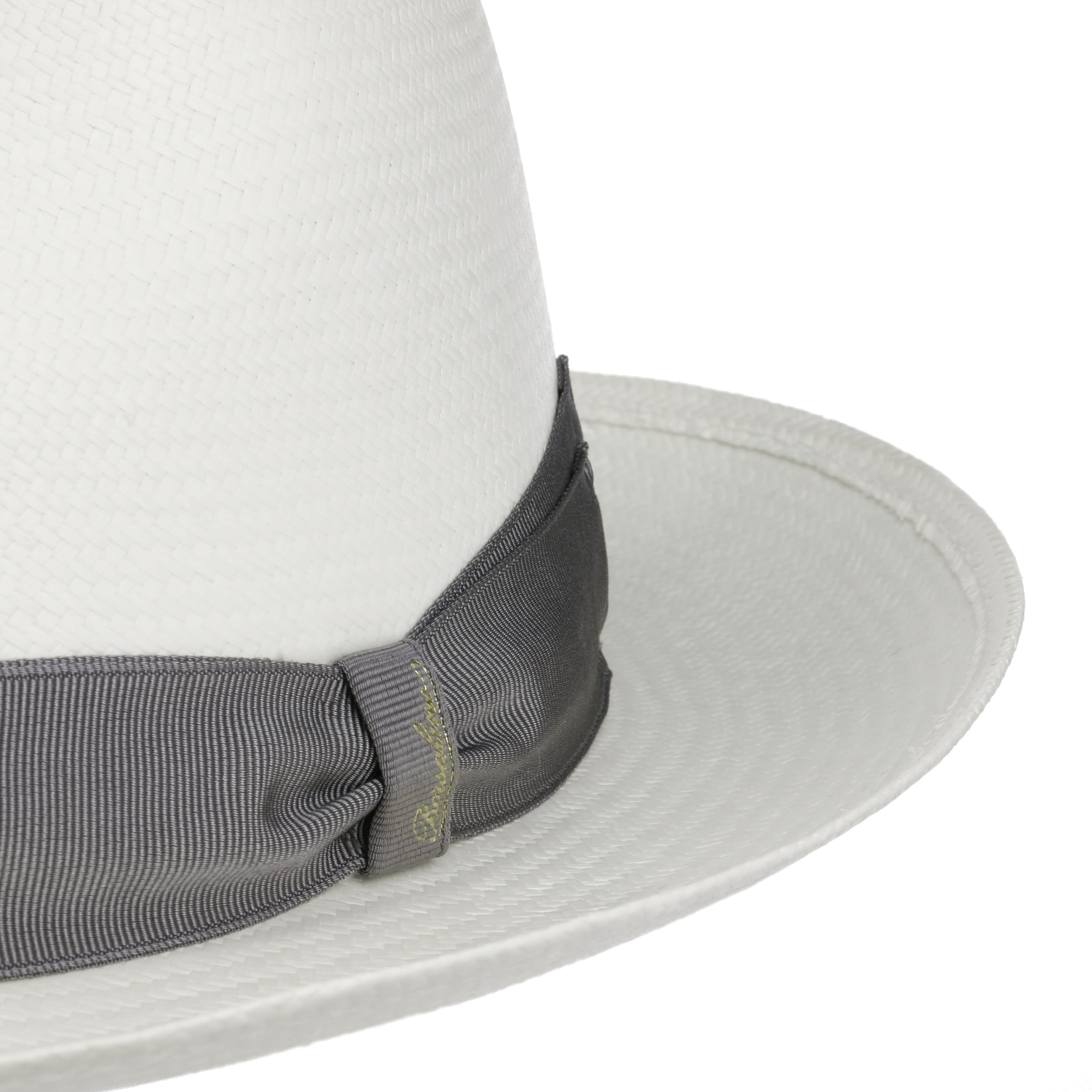 The Italian high-quality brand became famous for its fedoras made from precious lapin and beaver fur. Since 1857, Borsalino has been producing finest handmade, water repellent and ultralight headwear. International celebrities such as Al Capone and Humphrey Bogart made the "hat of the hats" a timeless classic. The company, meanwhile, has added other styles to its selection, e.g. first-rate flat caps and fashionable Panama hats as well as elegant women's styles.- Black Trim Small Panama Hat by Borsalino - nature-blue 1