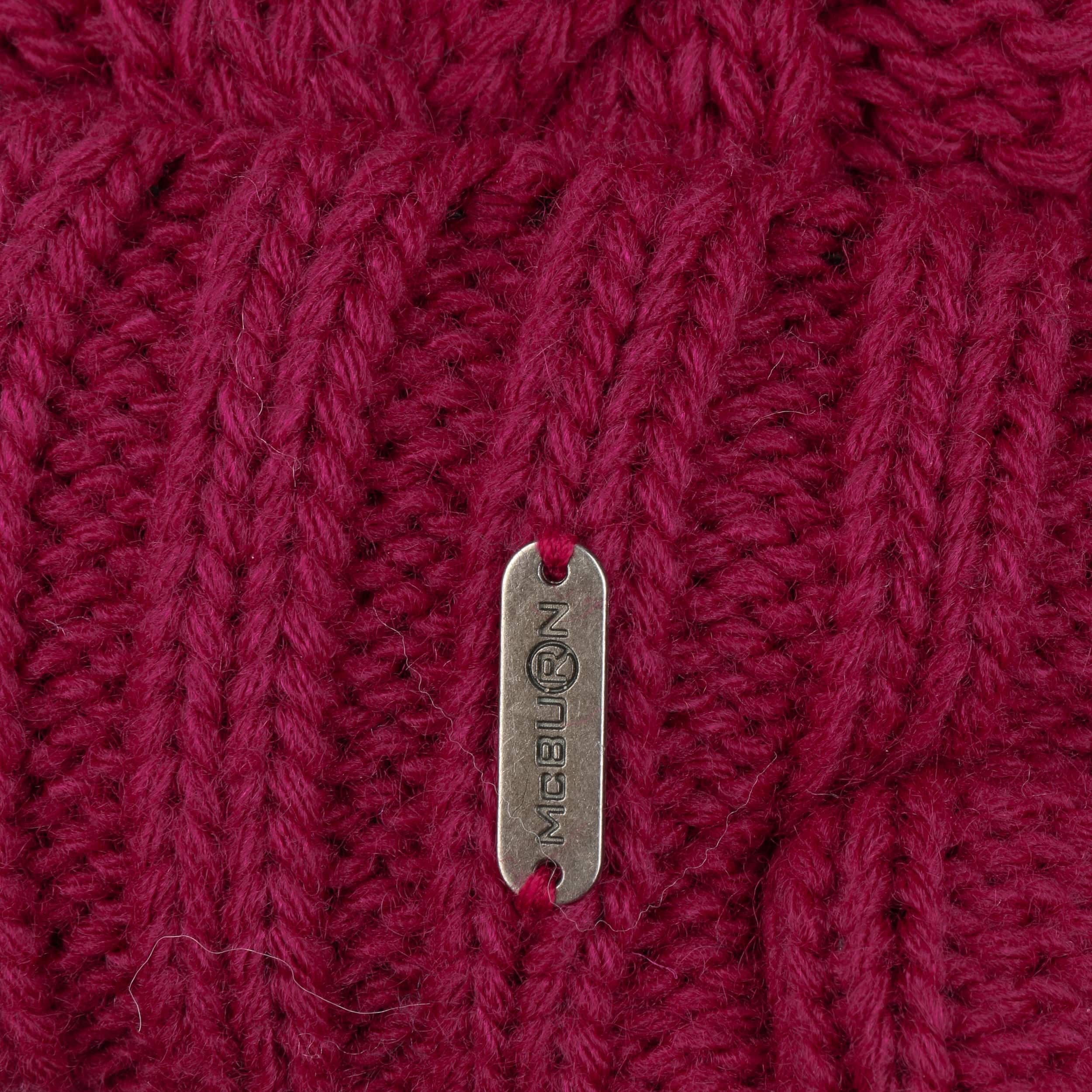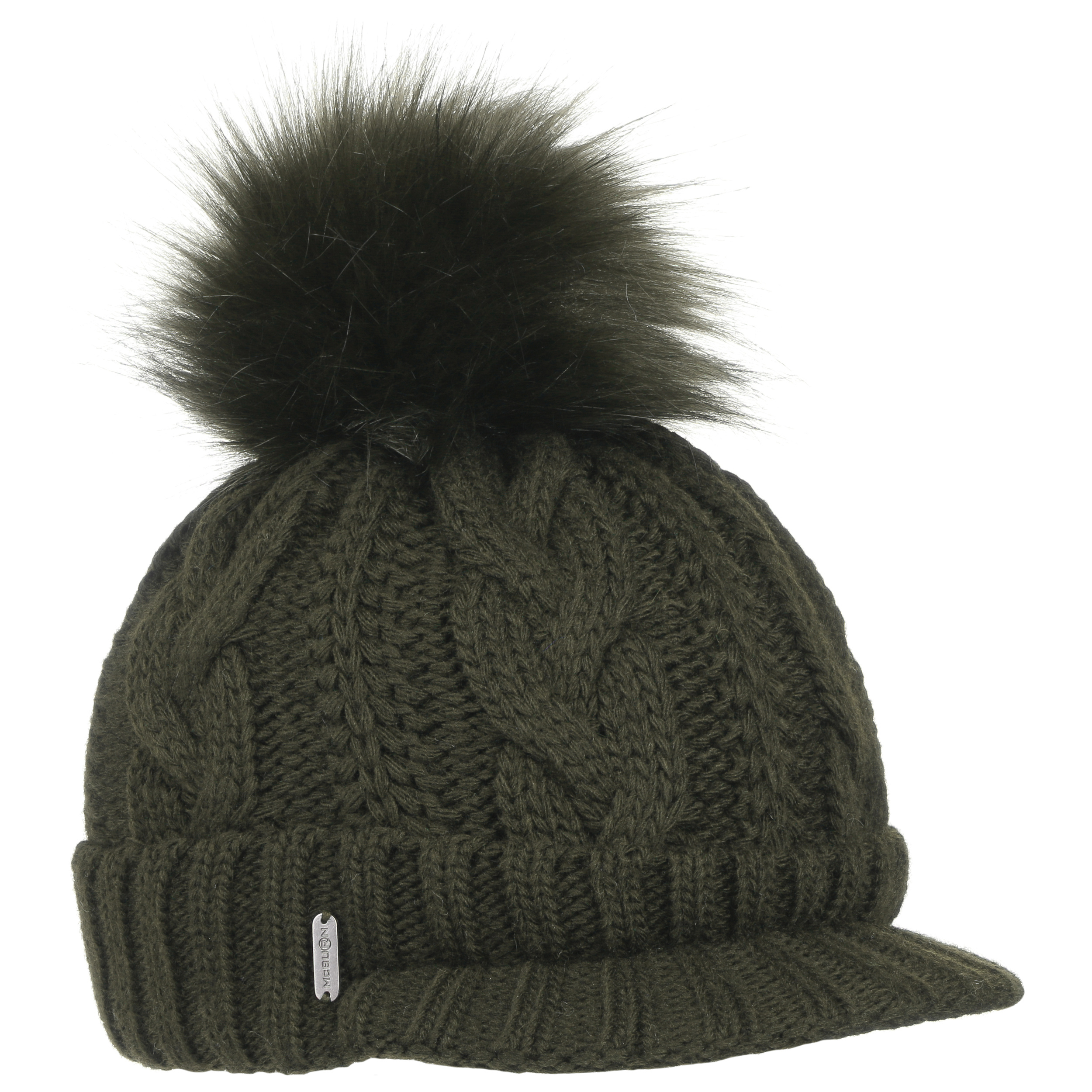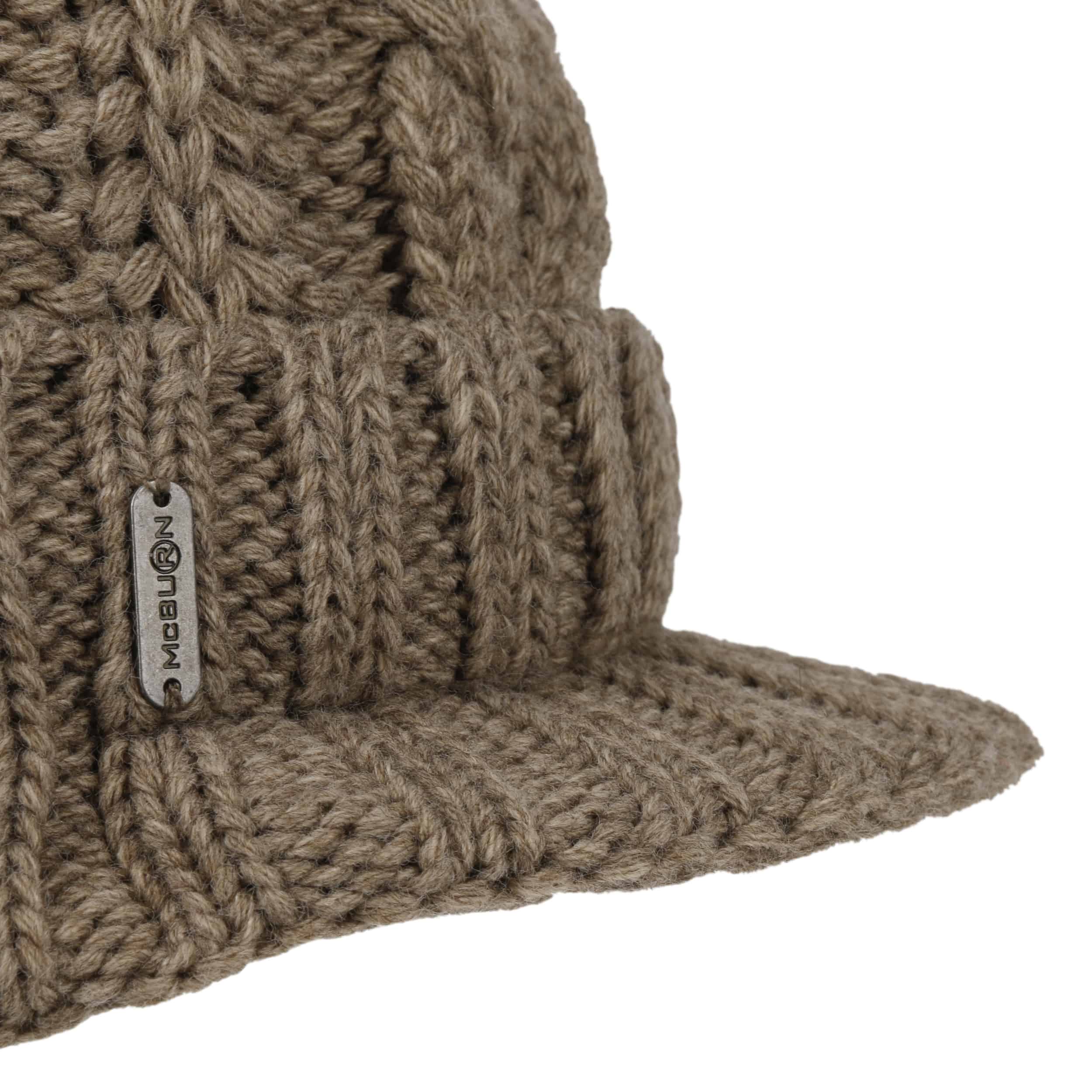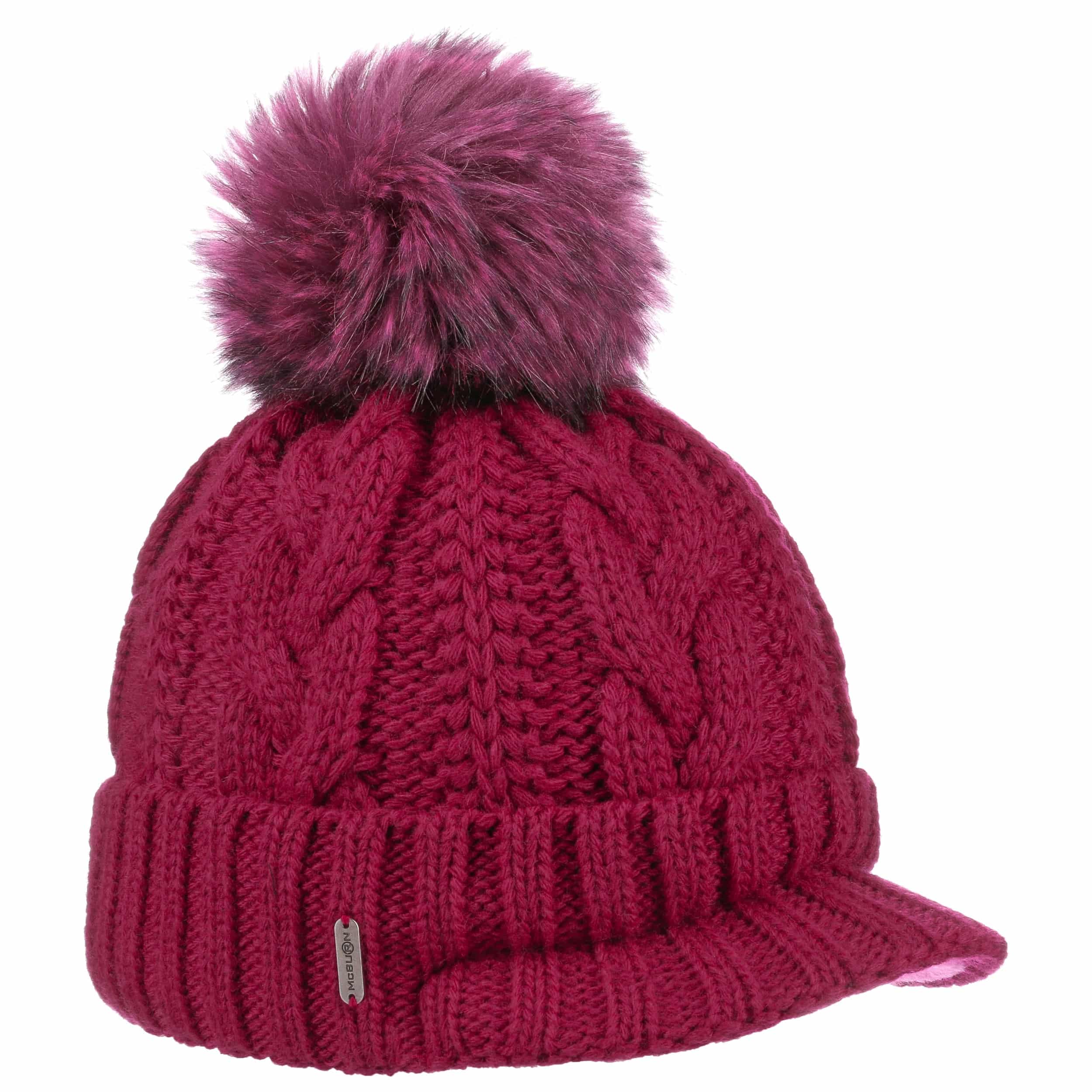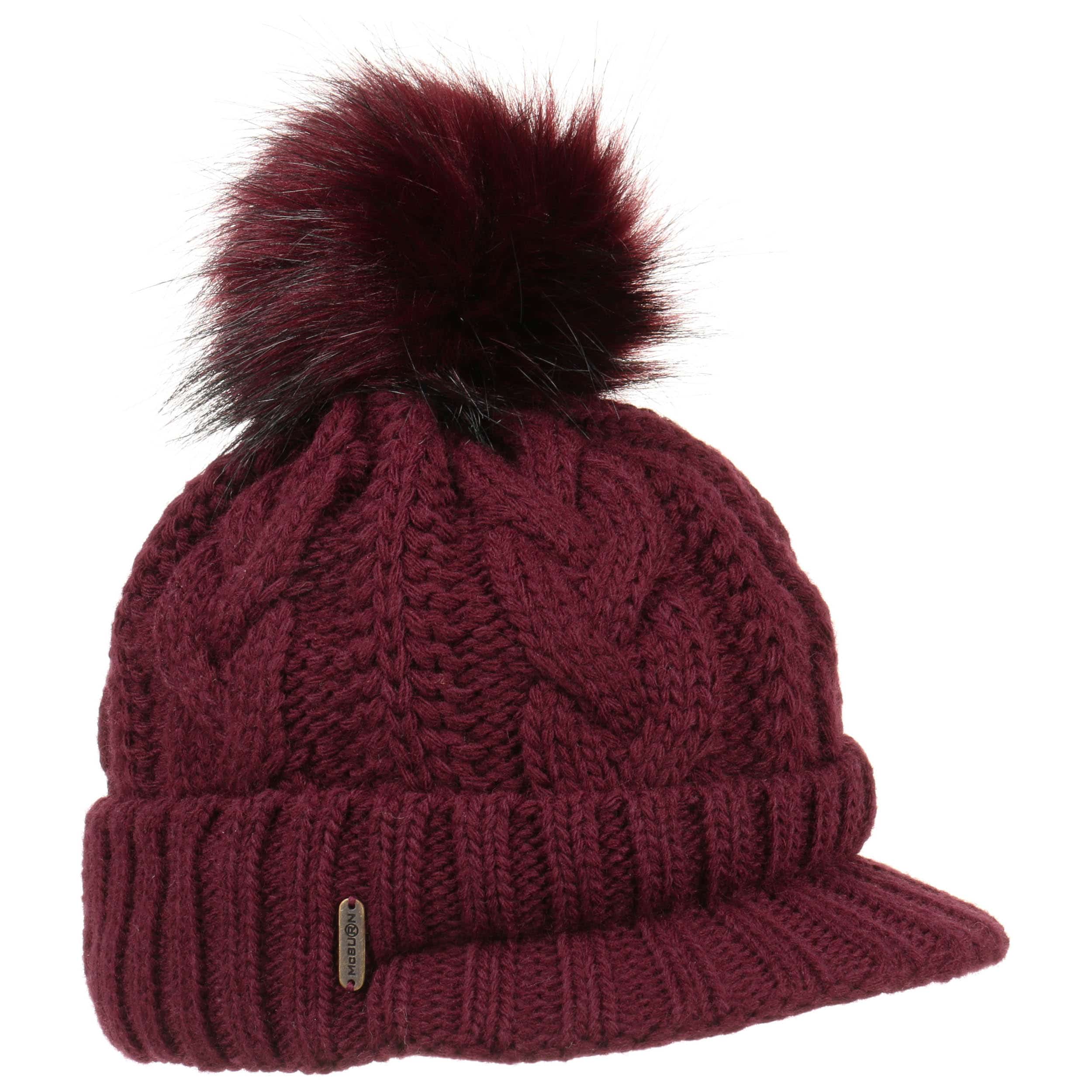 An ultra stylish beanie from McBURN with sporty charm: The hat contains warm wool, has a plain-coloured design, a rib knit brim to protect the ears and fashionable visor, above which rises a cable knit pattern – this feature and the smooth fabric lining are the main arguments for choosing this winter hat. A fluffy imitation fur pompom on the top invites you to feel good.