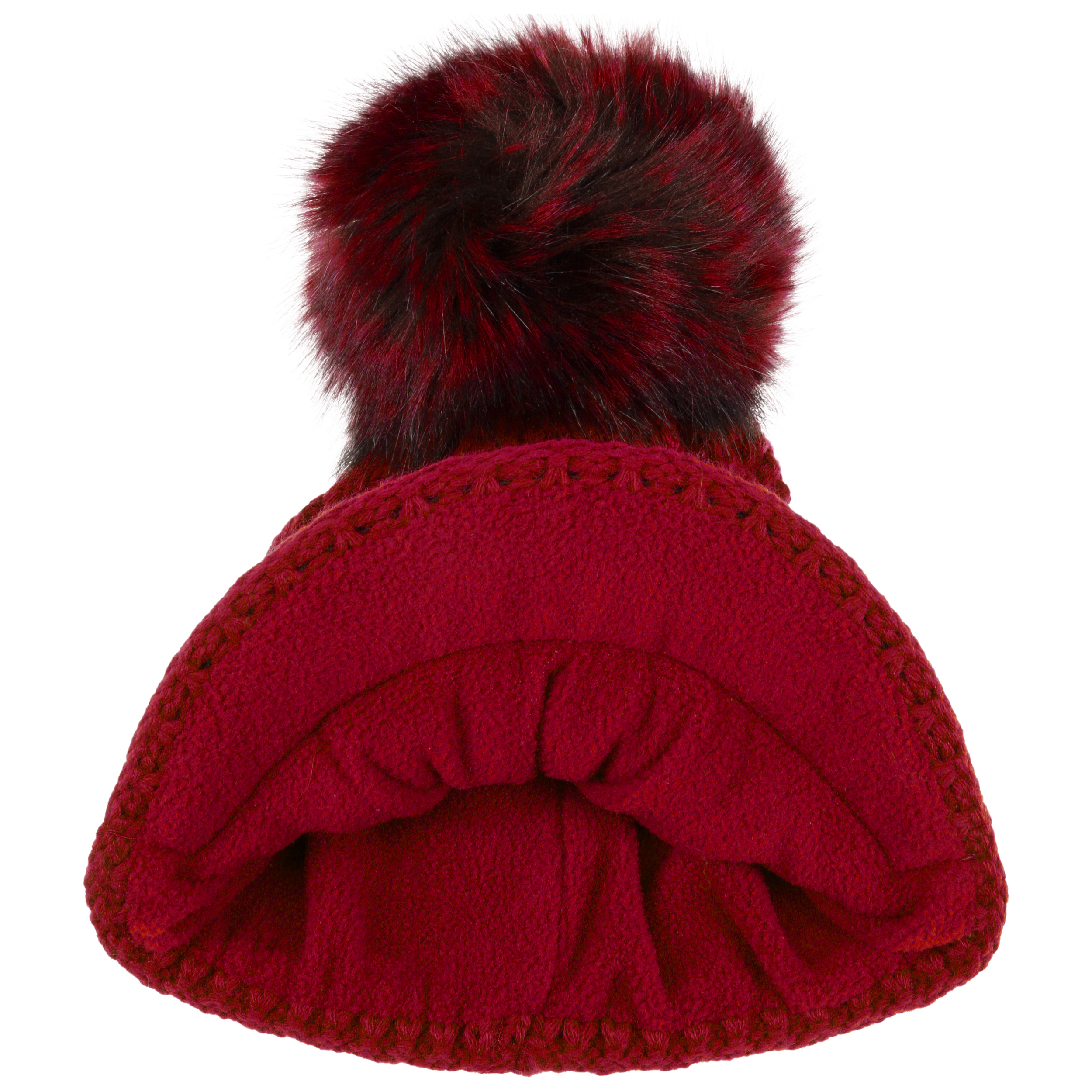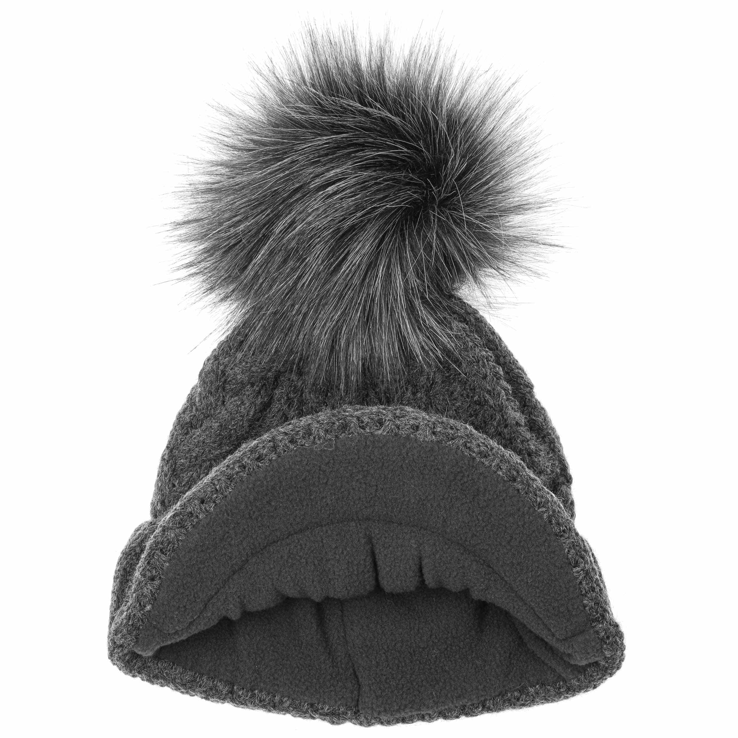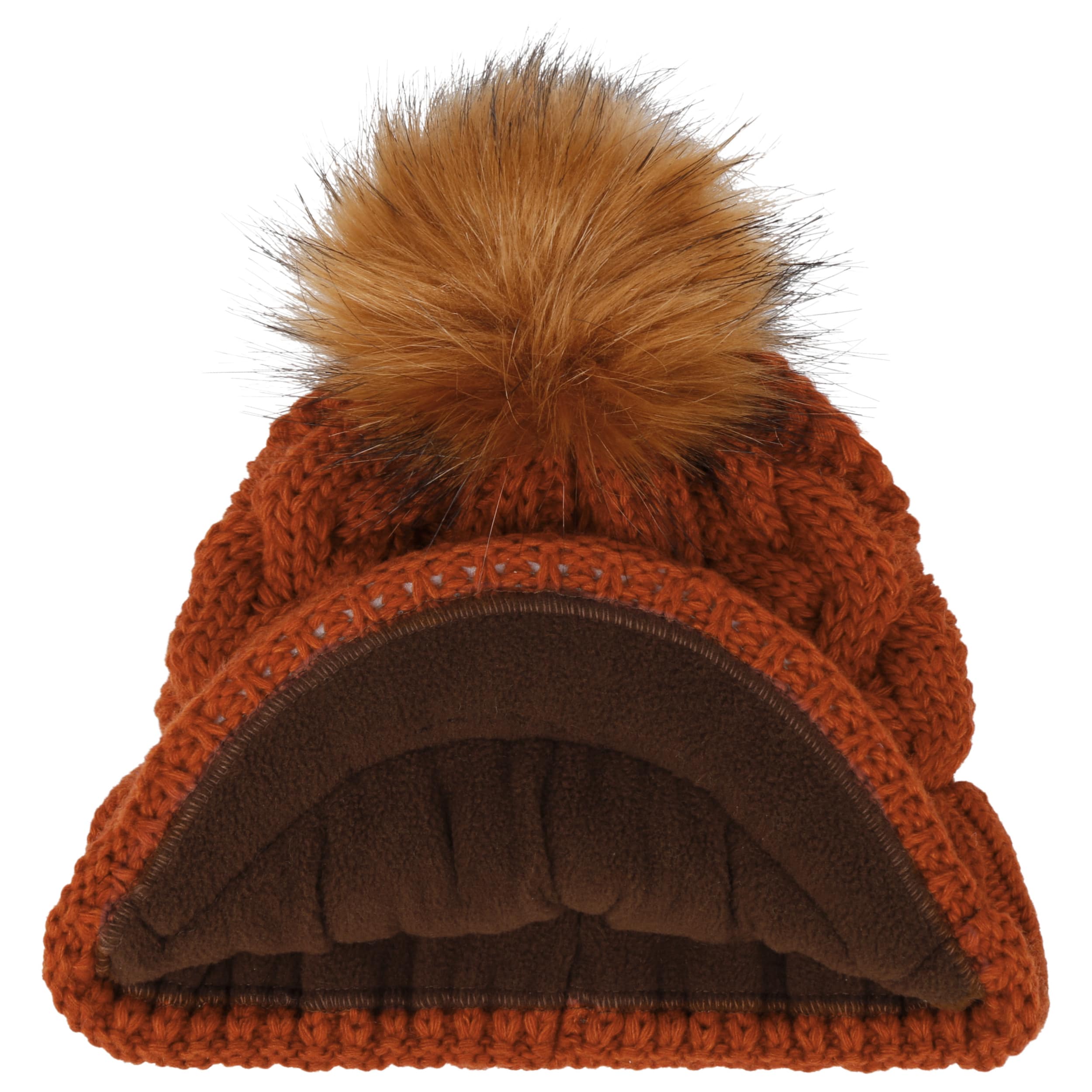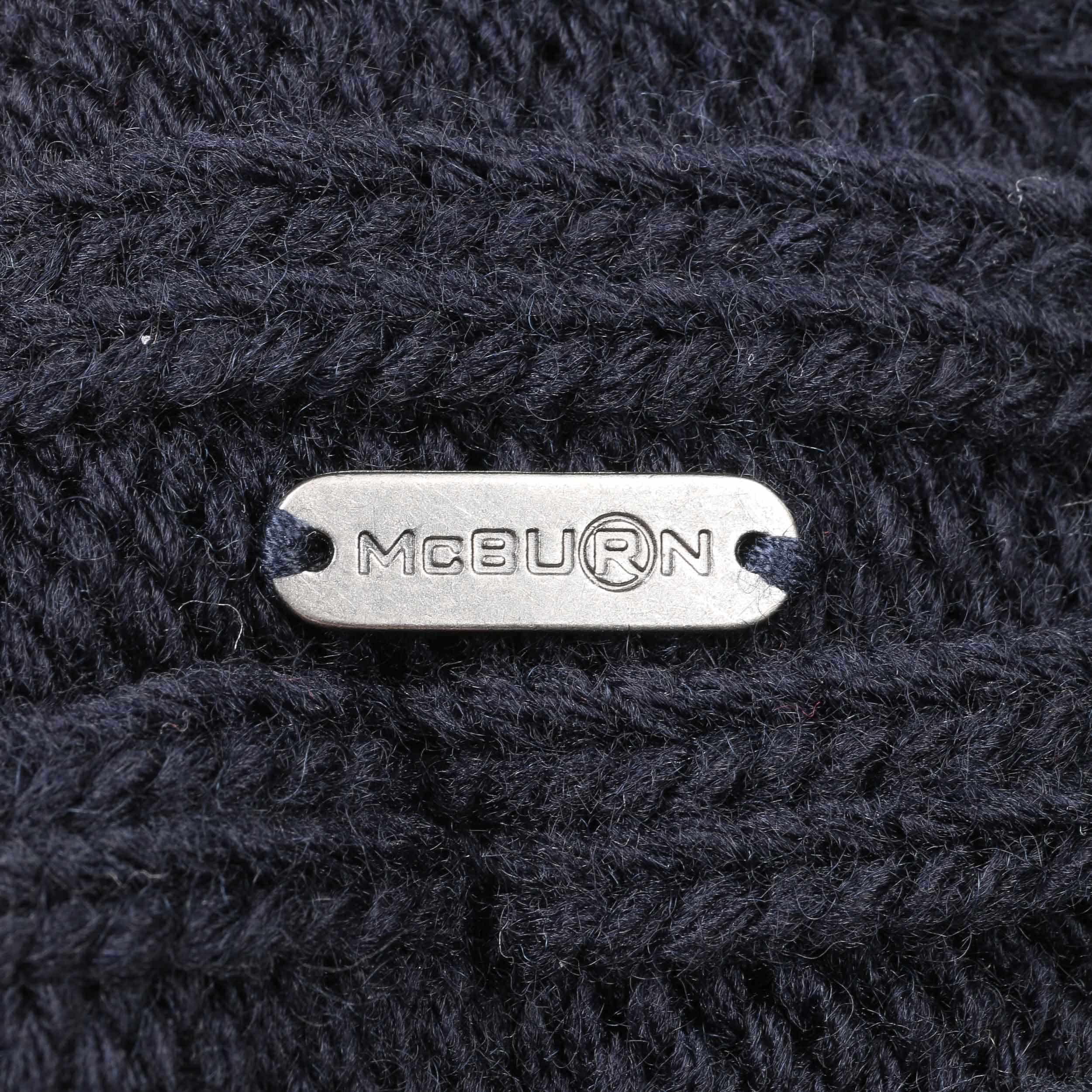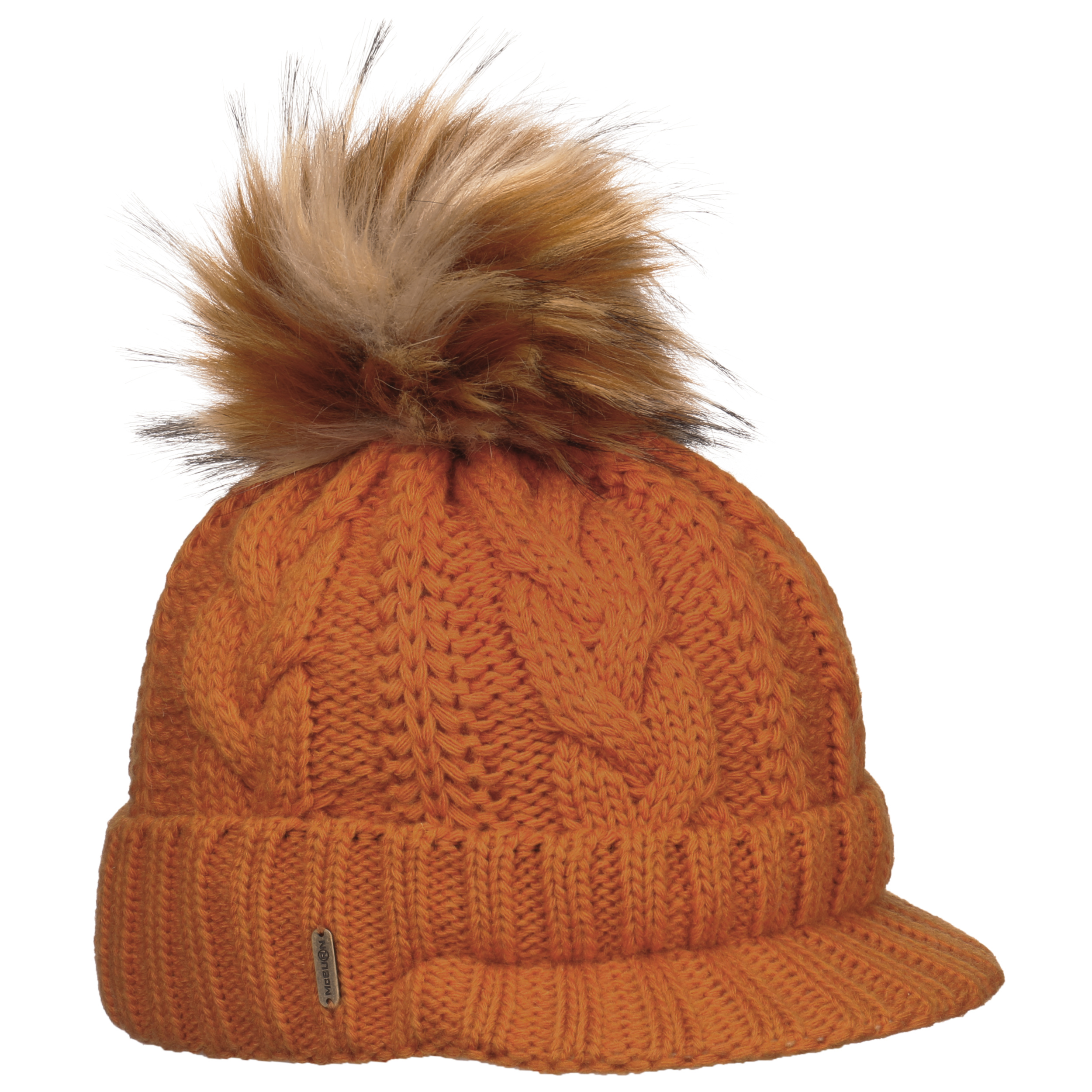 An ultra stylish beanie from McBURN with sporty charm: The hat contains warm wool, has a plain-coloured design, a rib knit brim to protect the ears and fashionable visor, above which rises a cable knit pattern – this feature and the smooth fabric lining are the main arguments for choosing this winter hat. A fluffy imitation fur pompom on the top invites you to feel good.