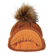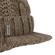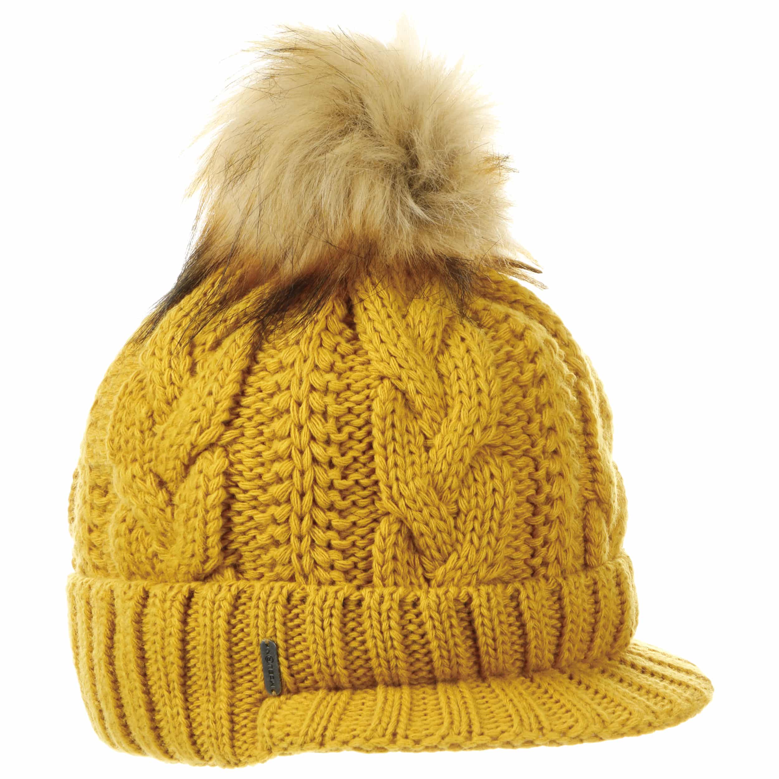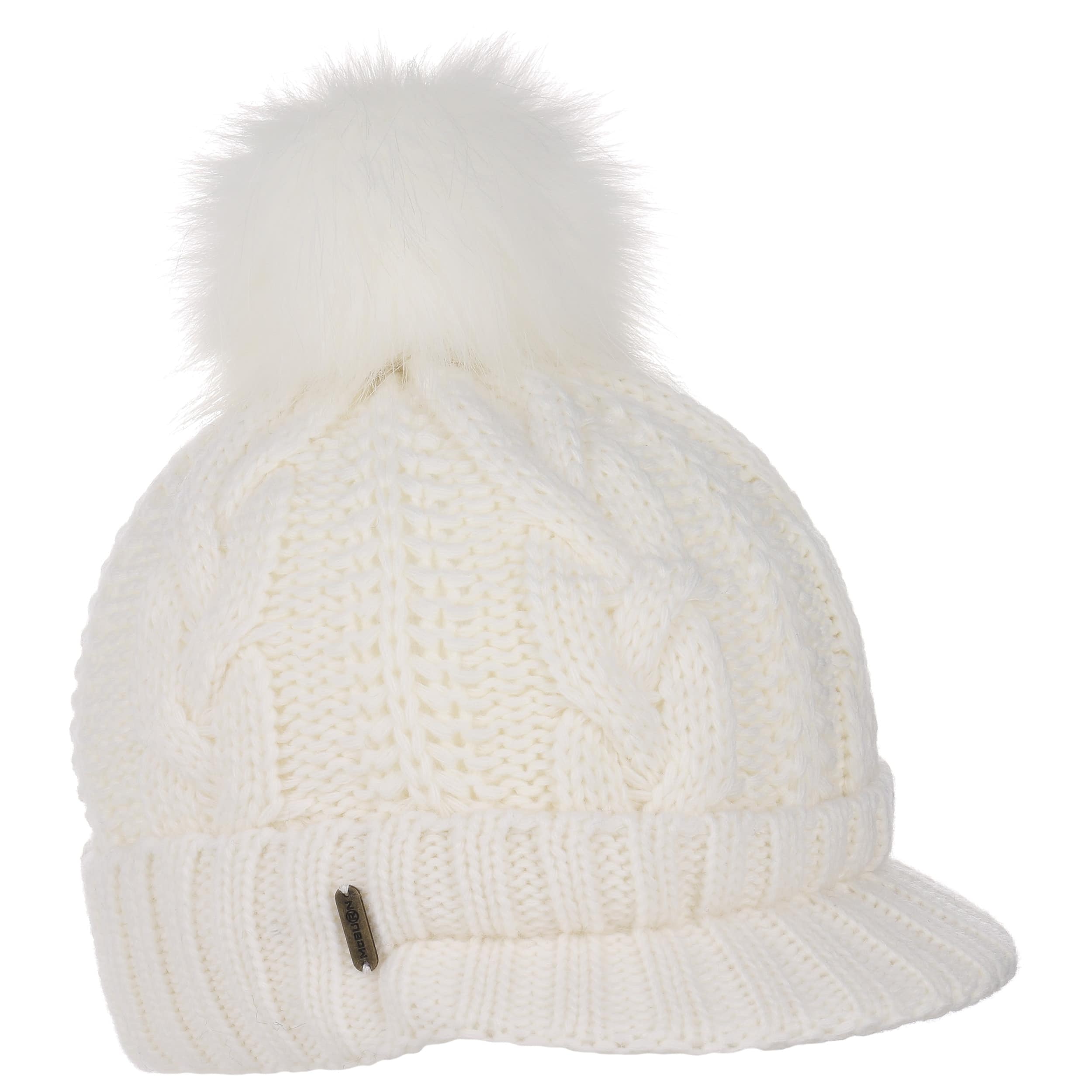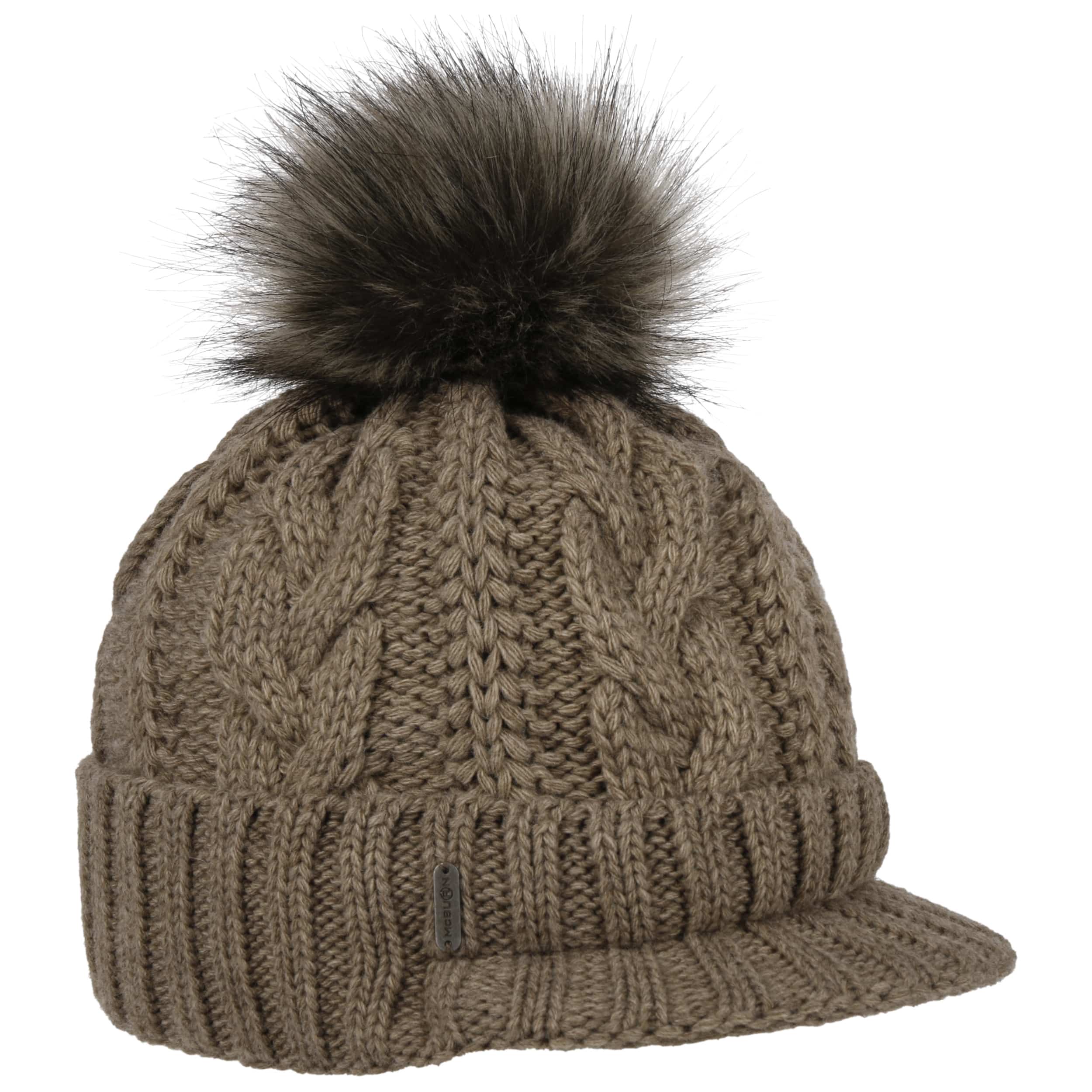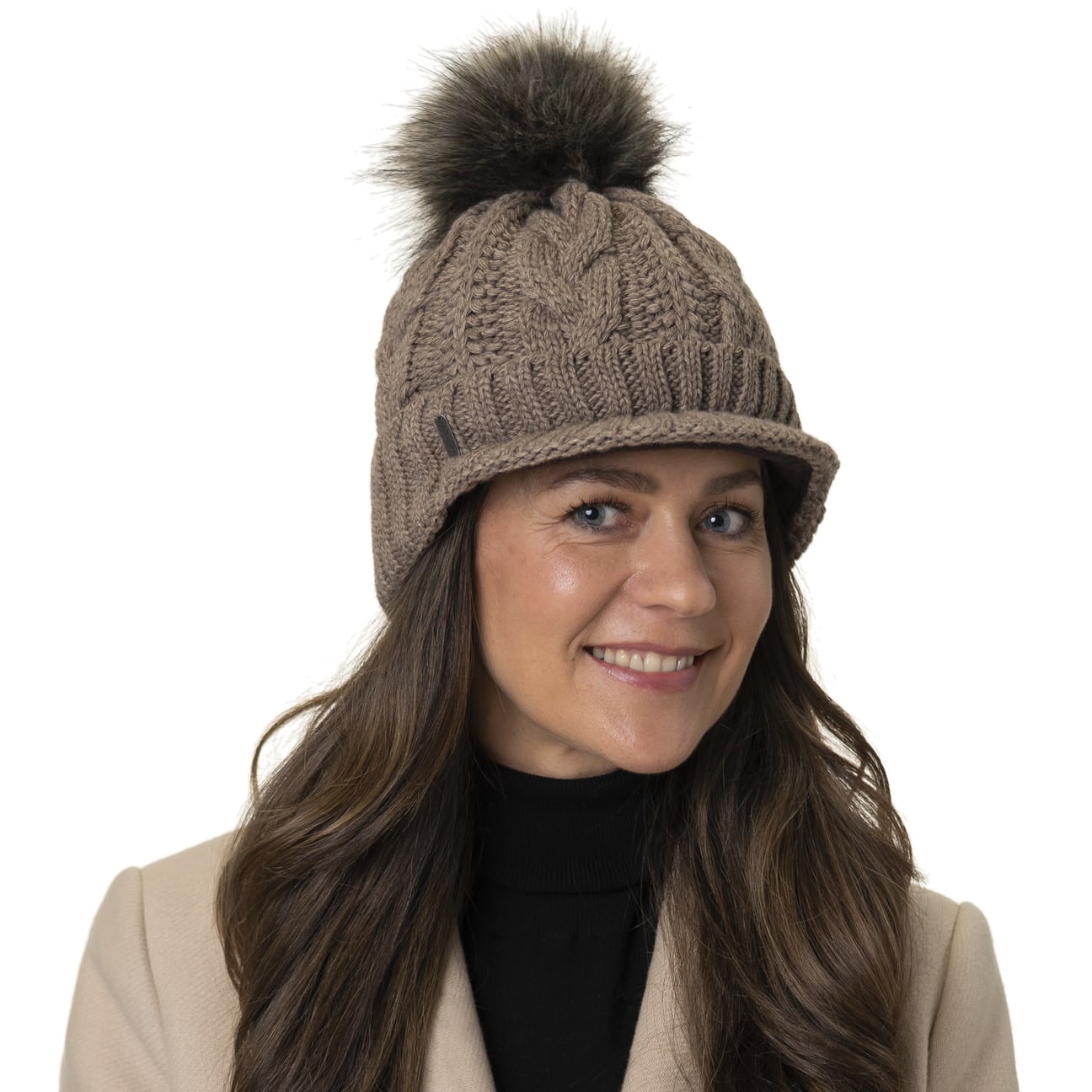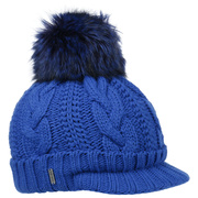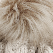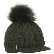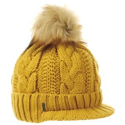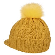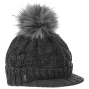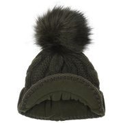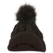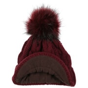 With a peak, cable knit pattern and fluffy pompom.