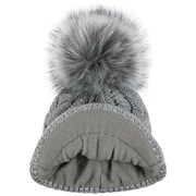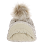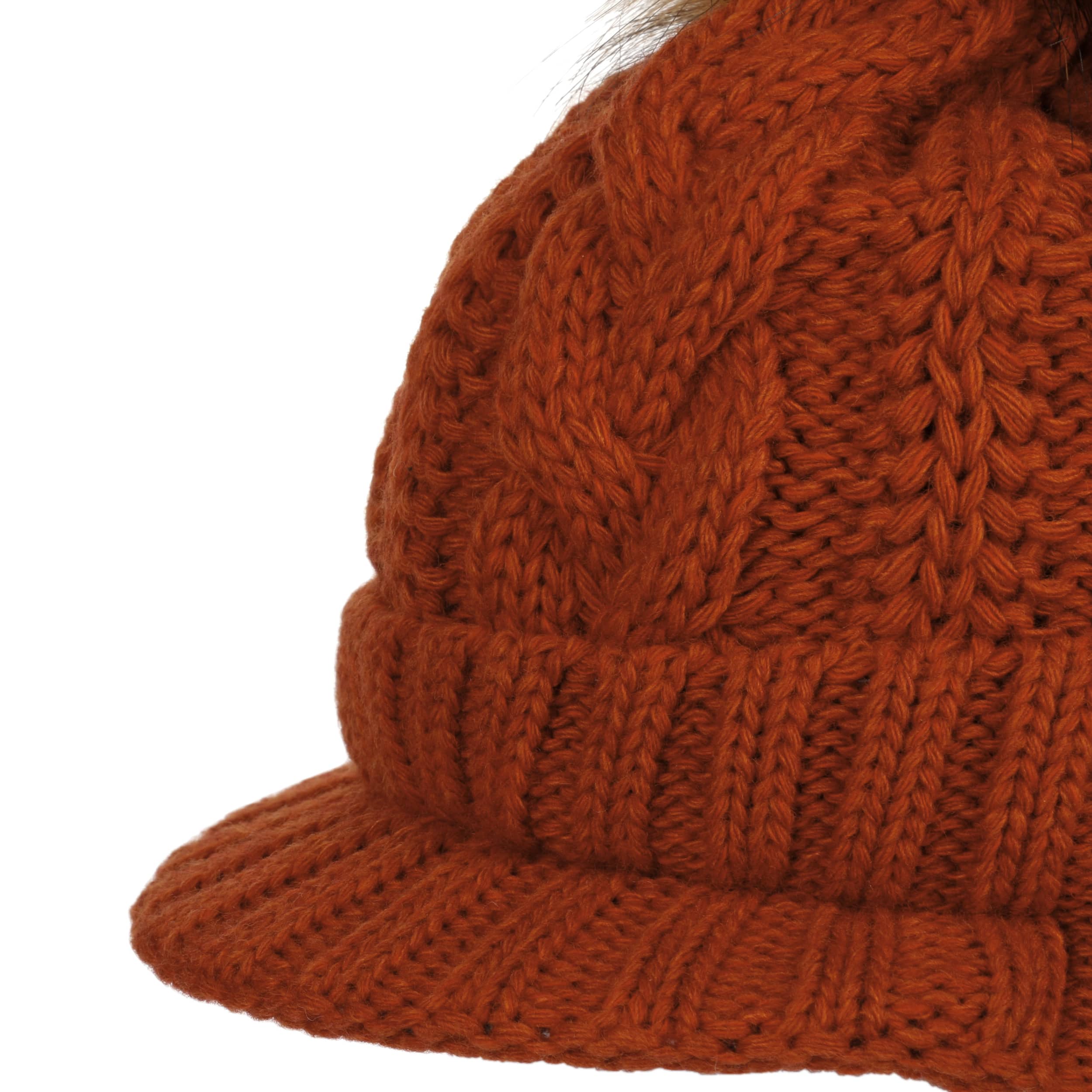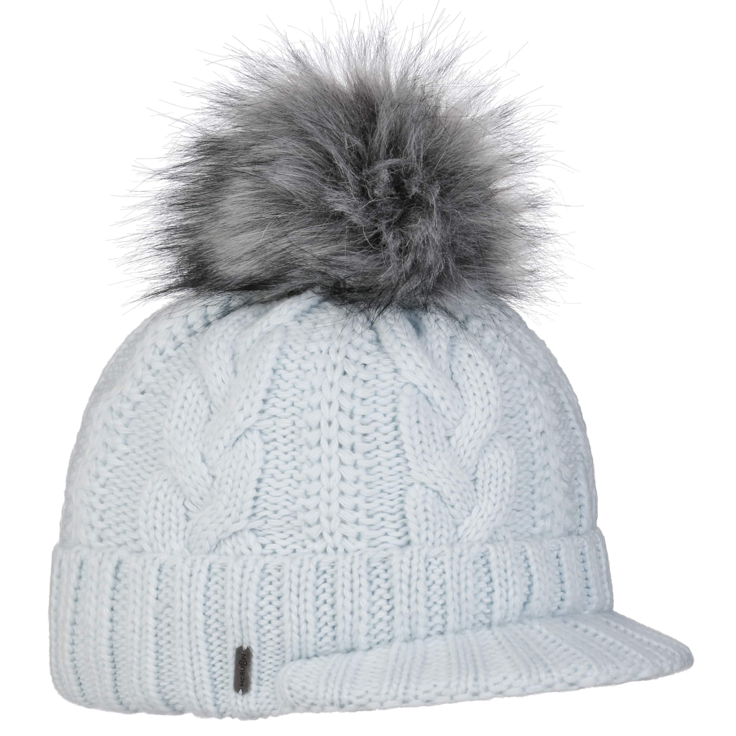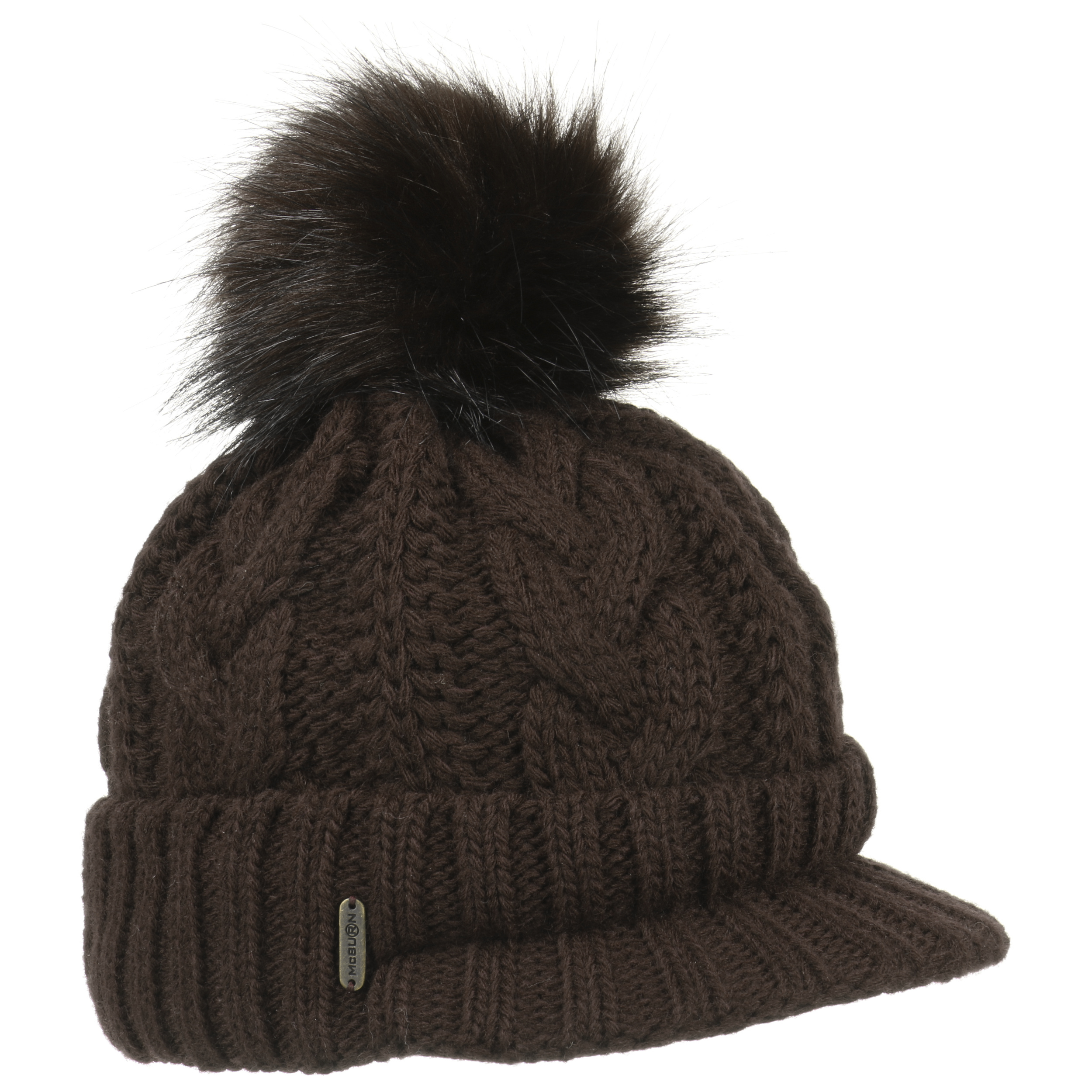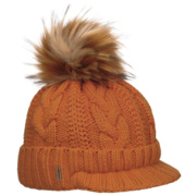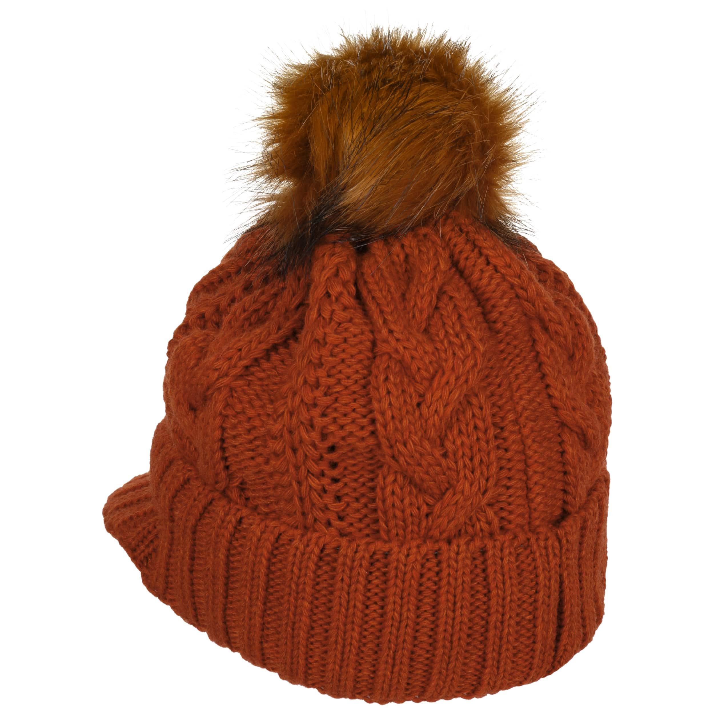 With a peak, cable knit pattern and fluffy pompom.