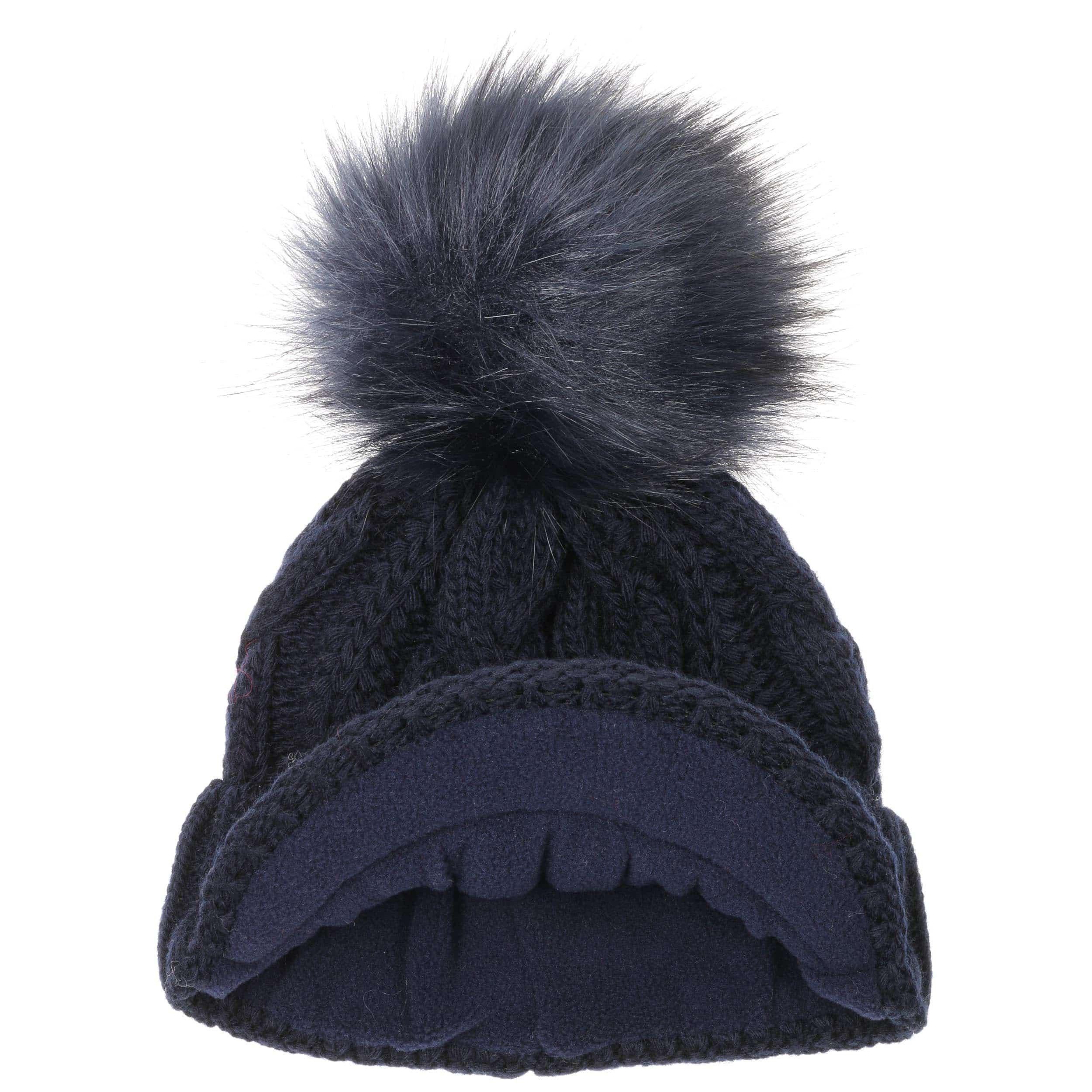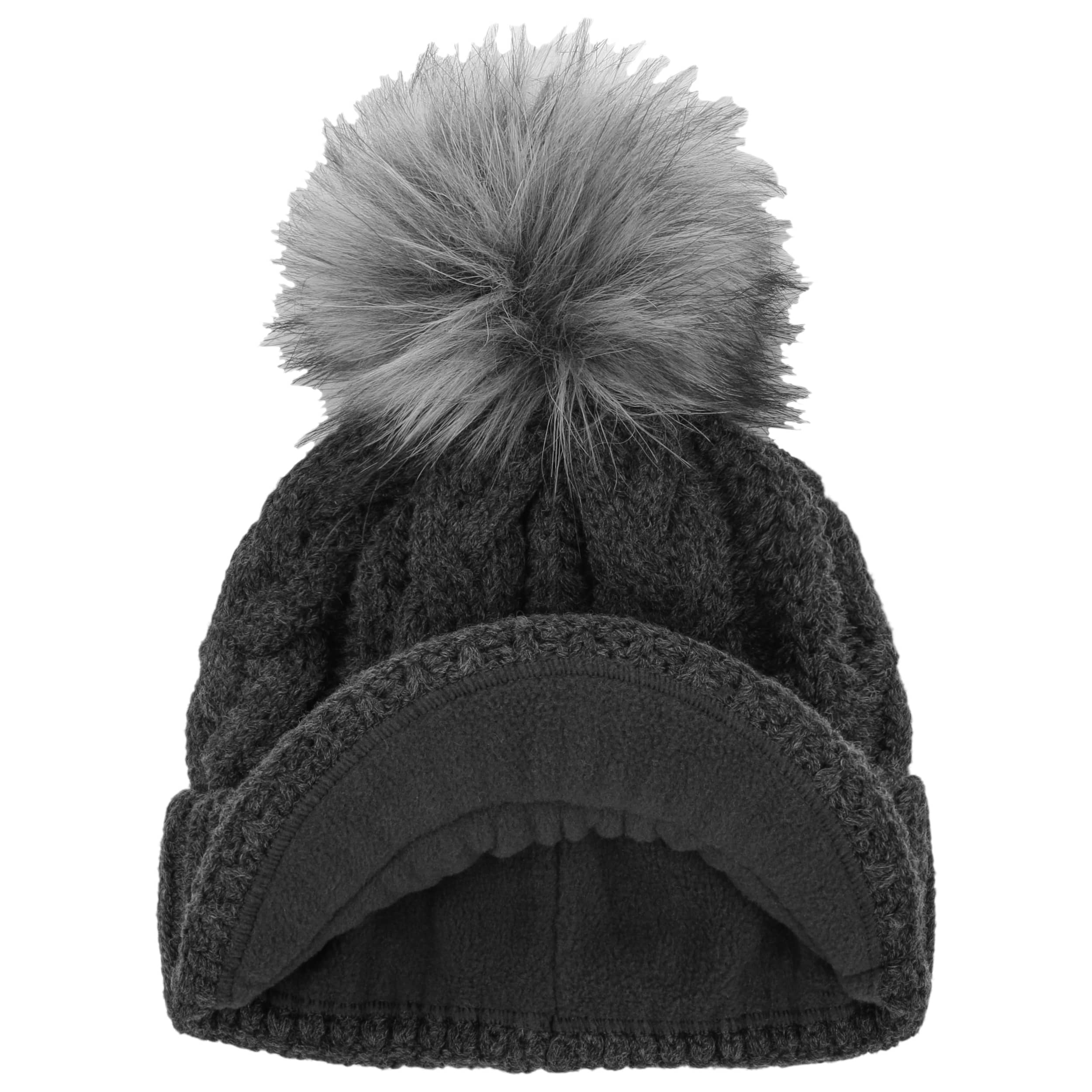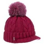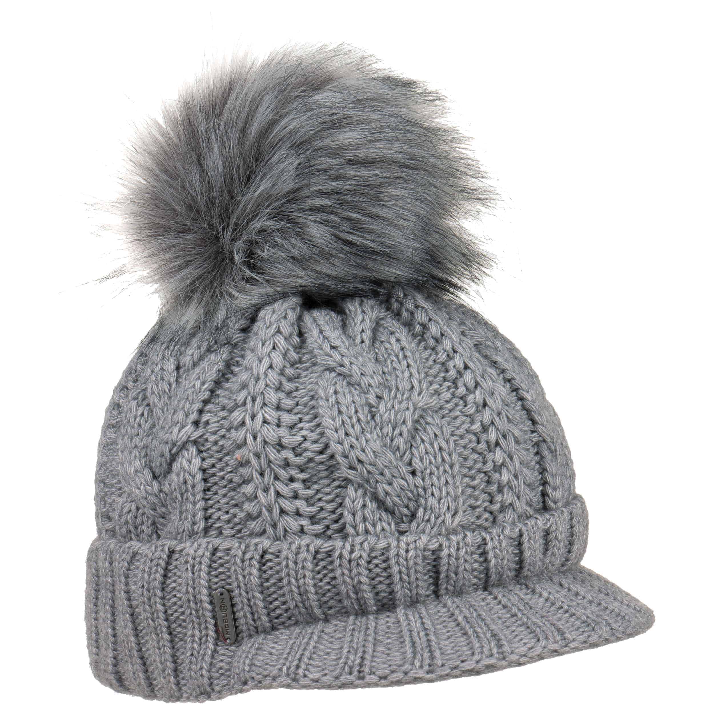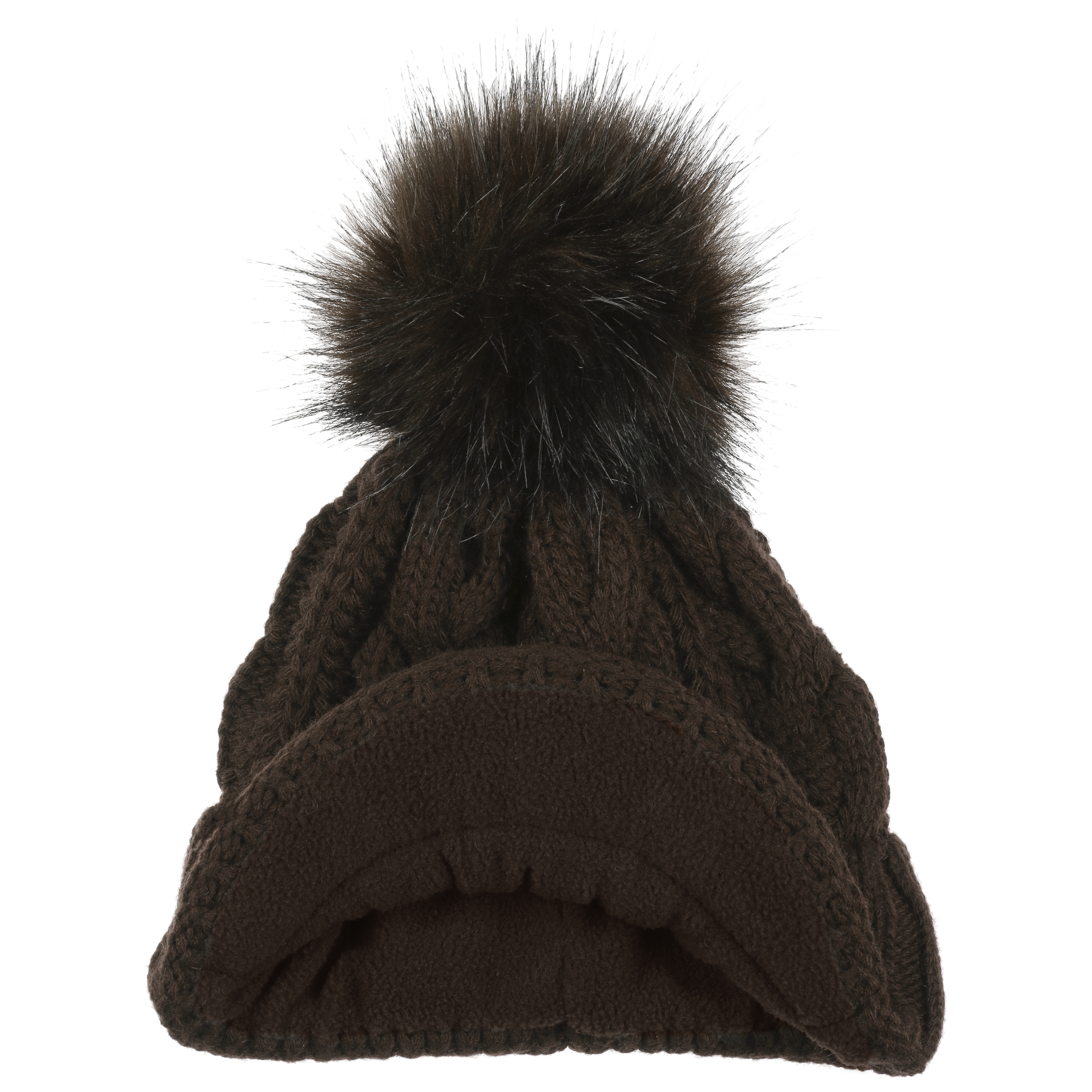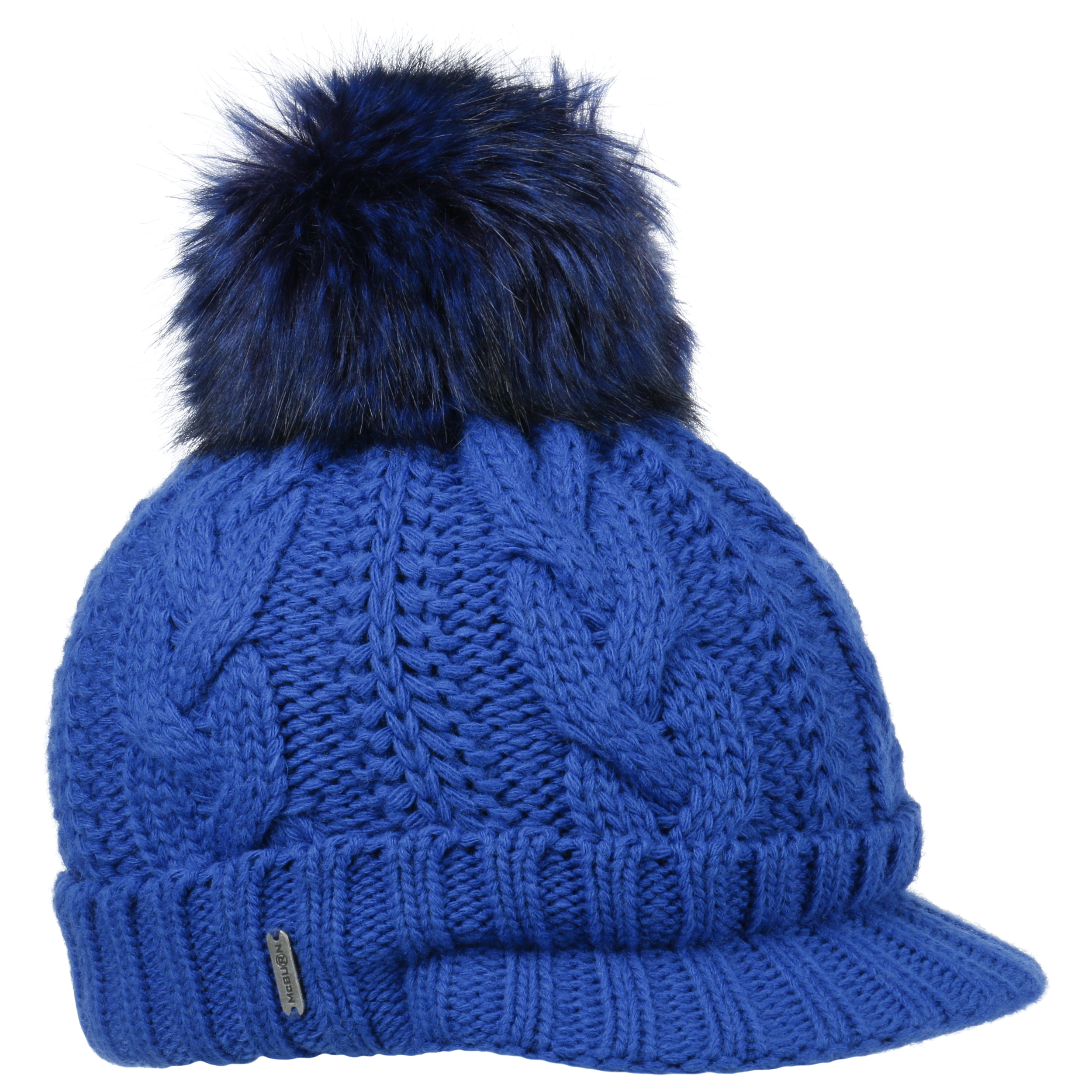 With a peak, cable knit pattern and fluffy pompom.