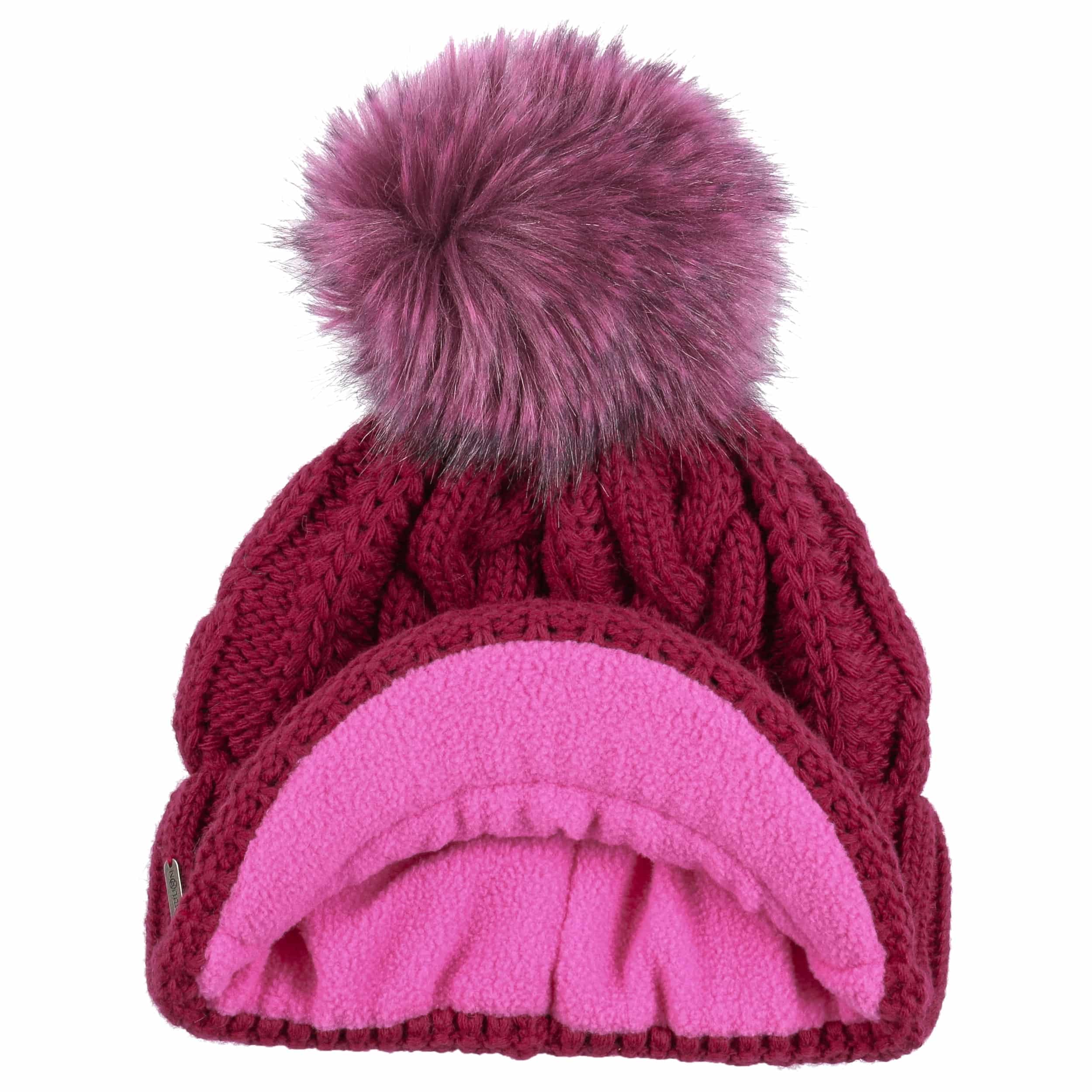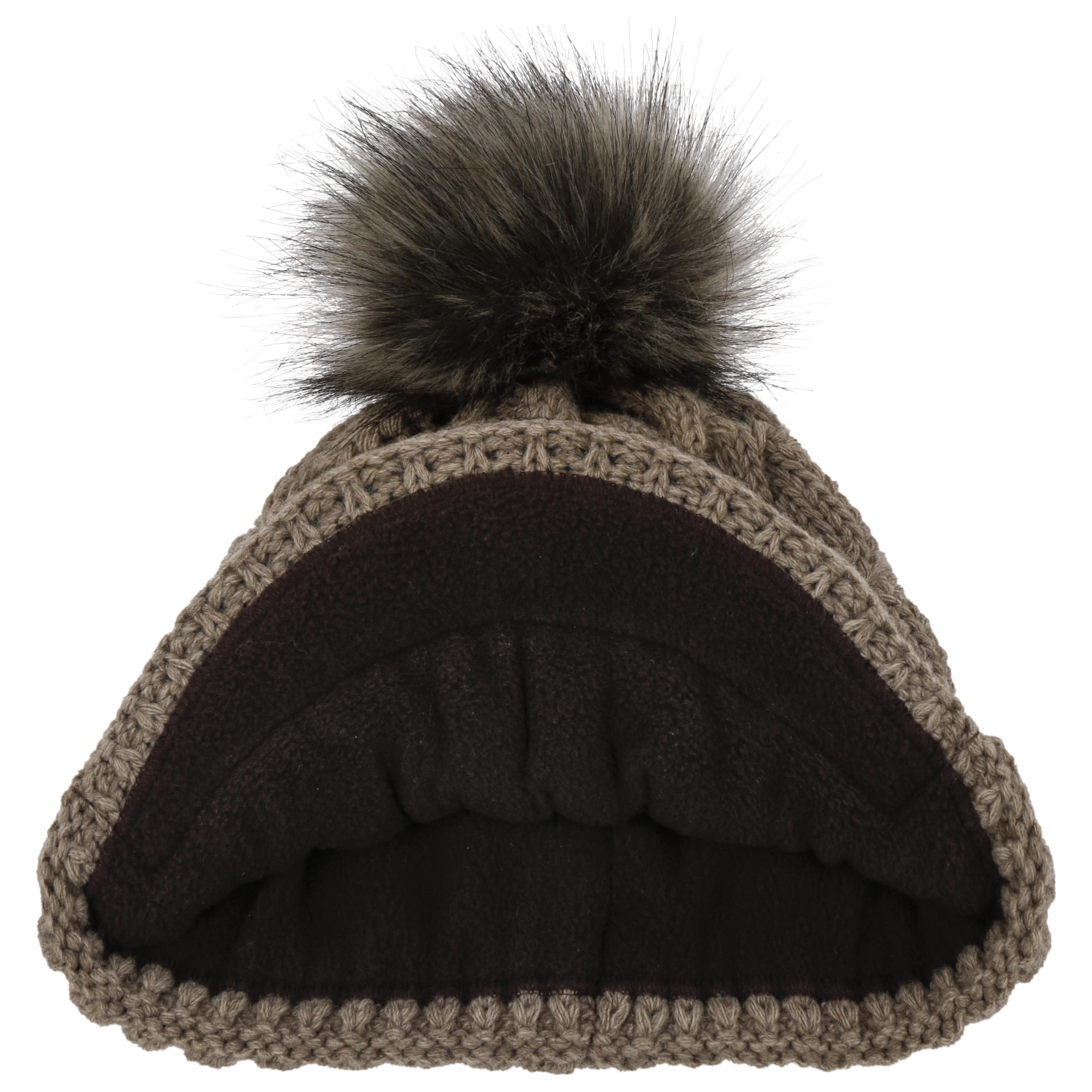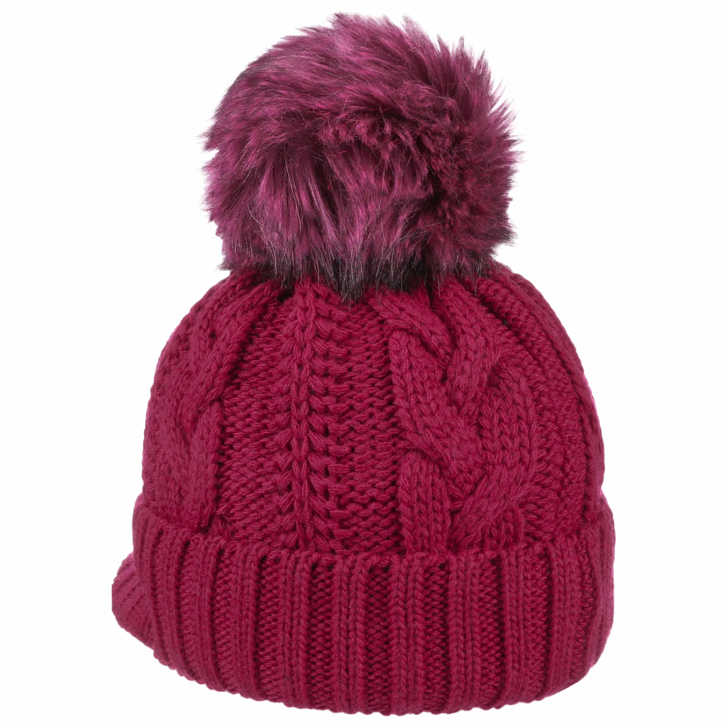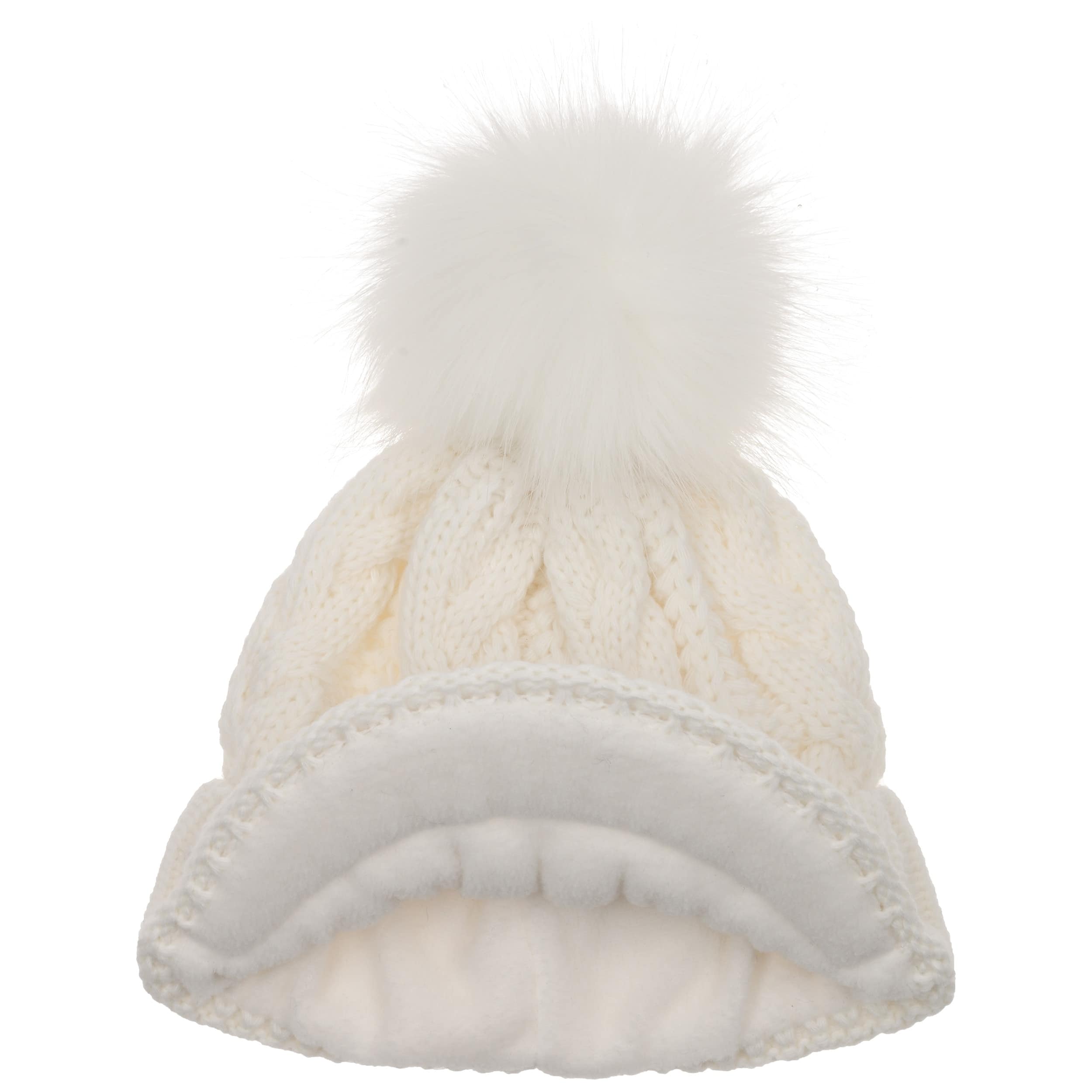 With a peak, cable knit pattern and fluffy pompom.