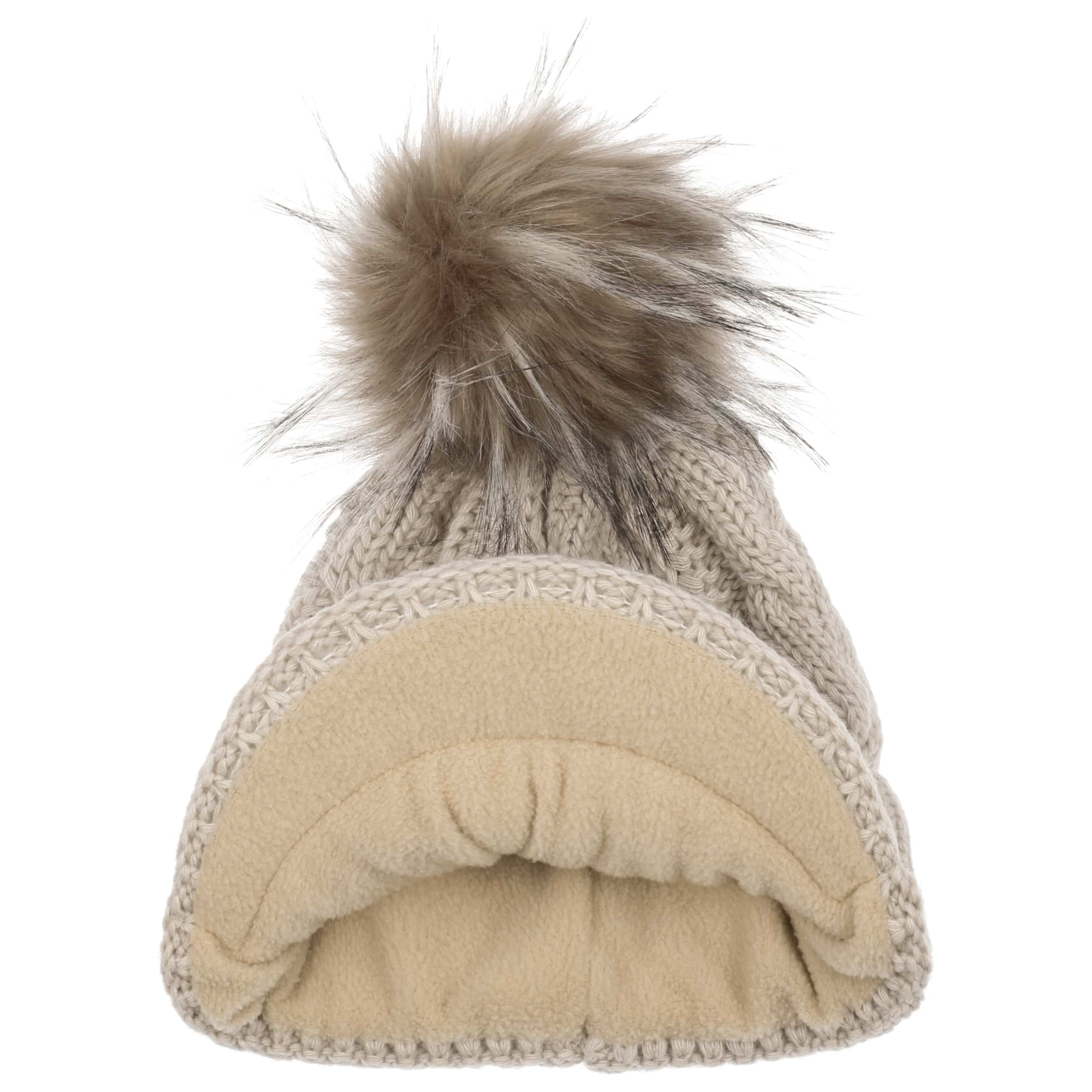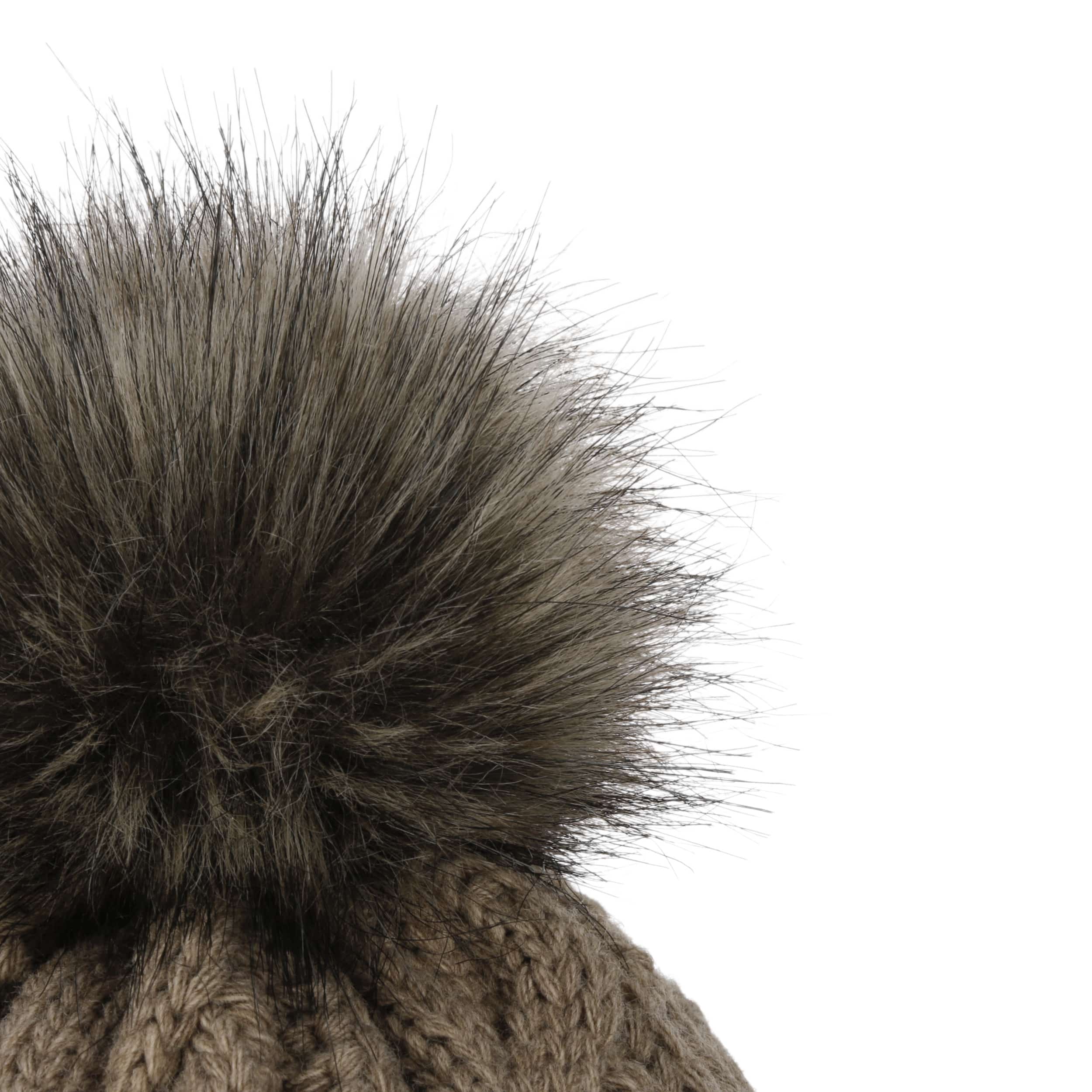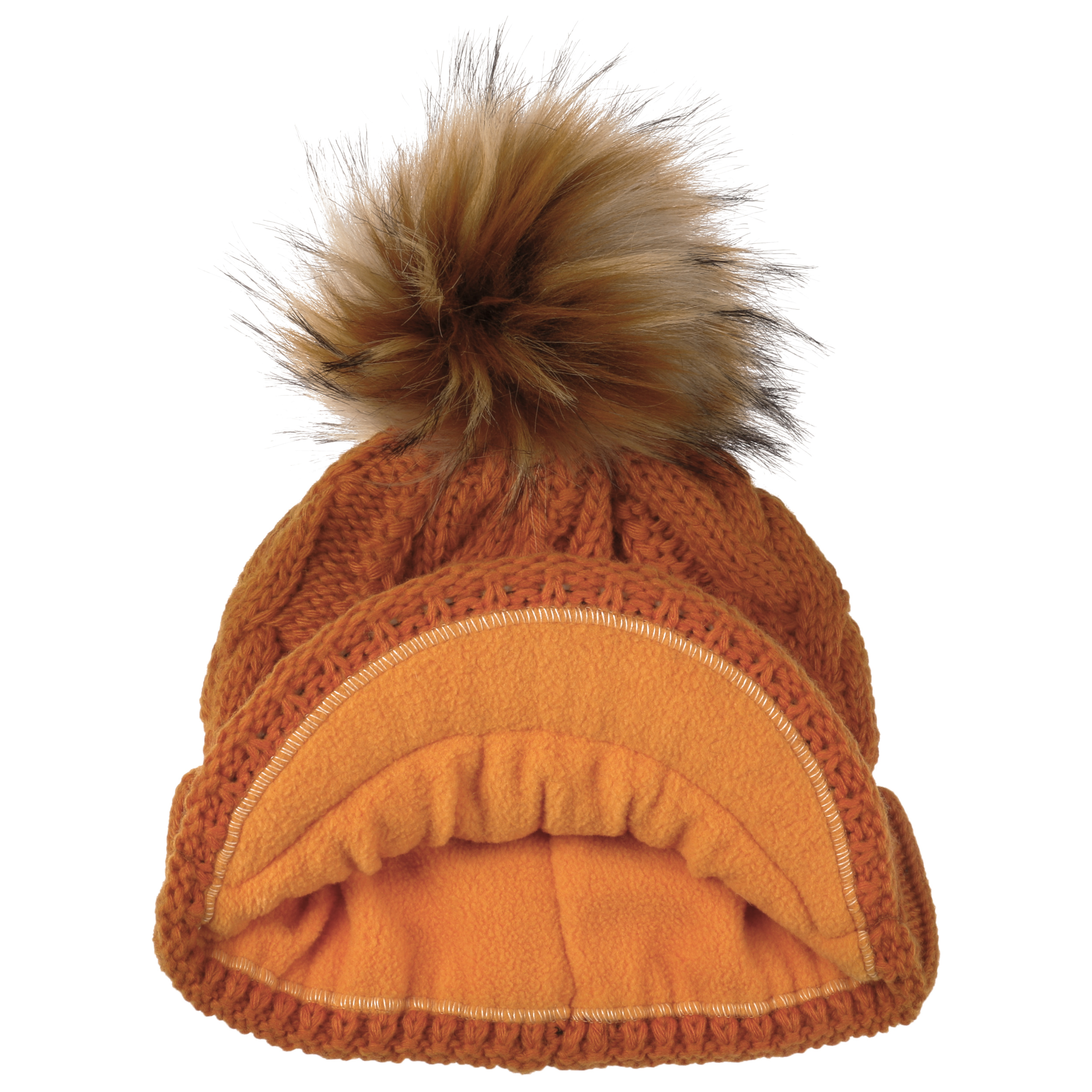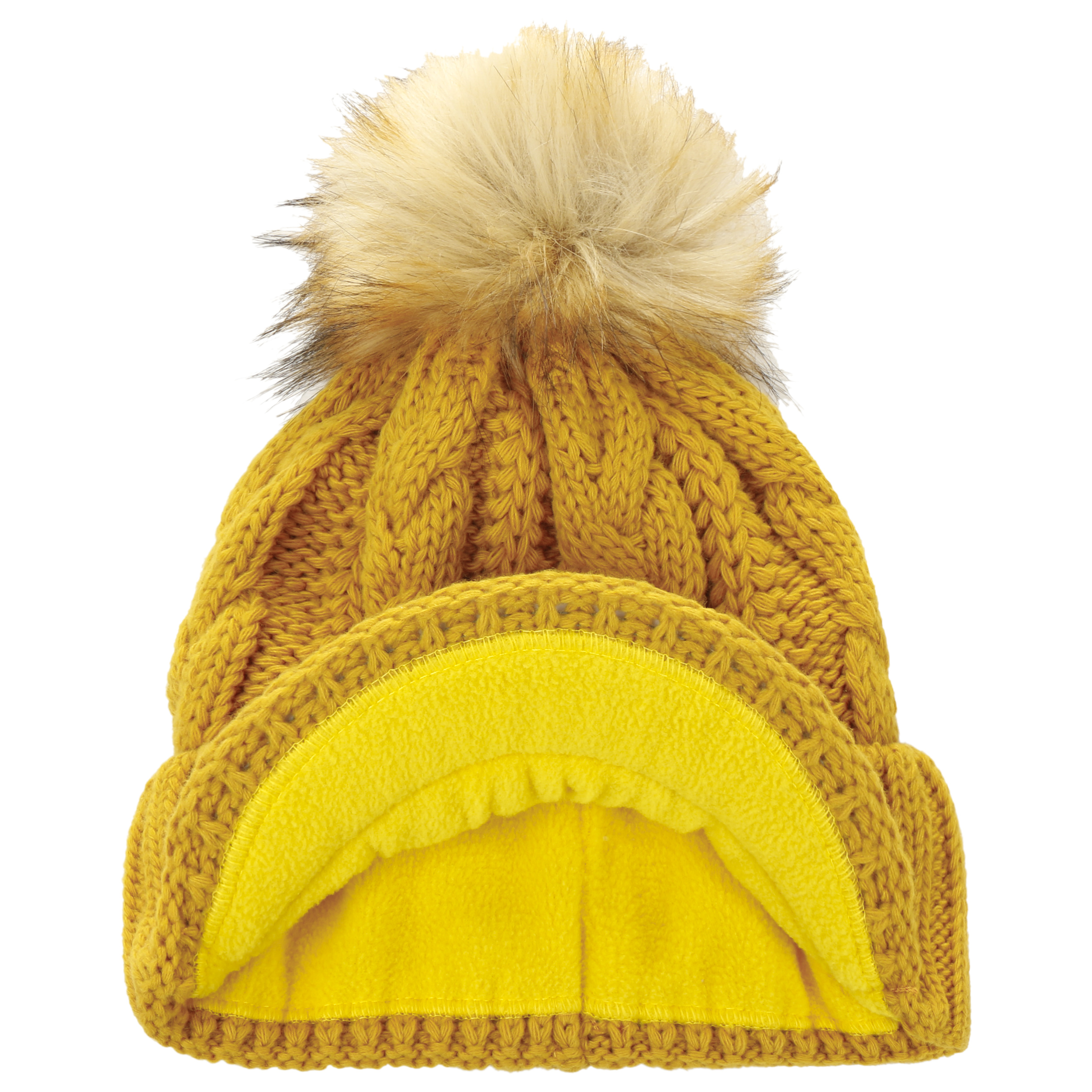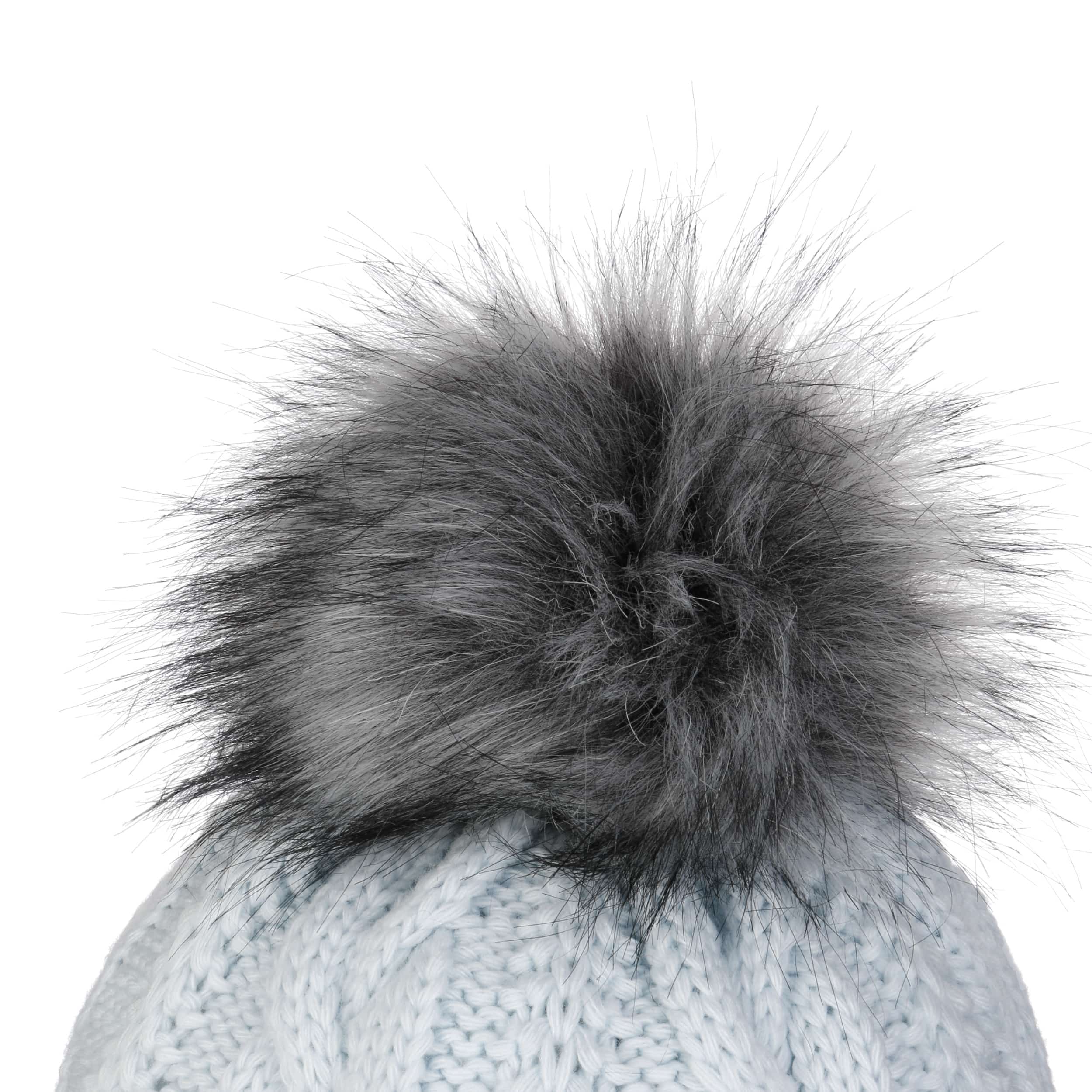 With a peak, cable knit pattern and fluffy pompom.