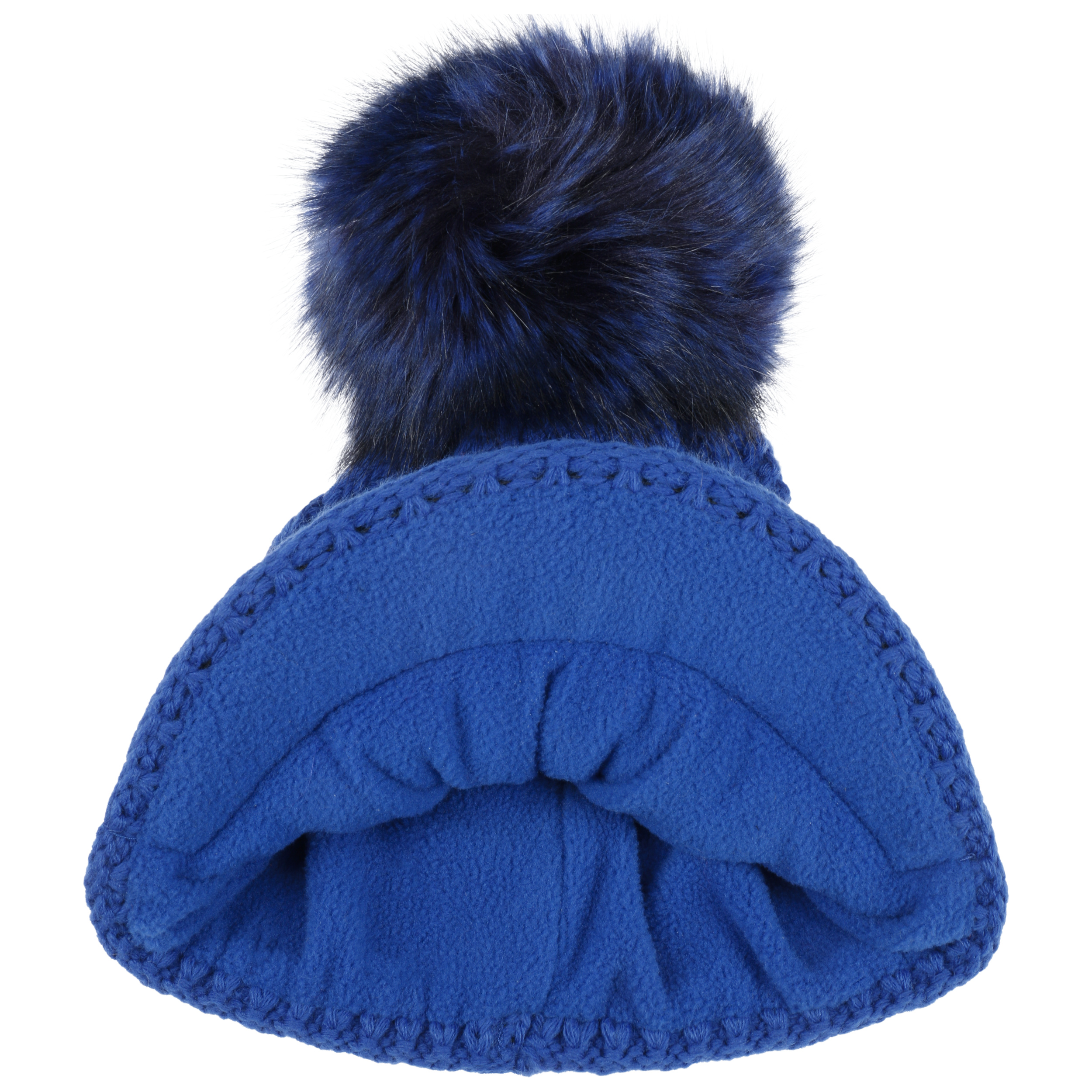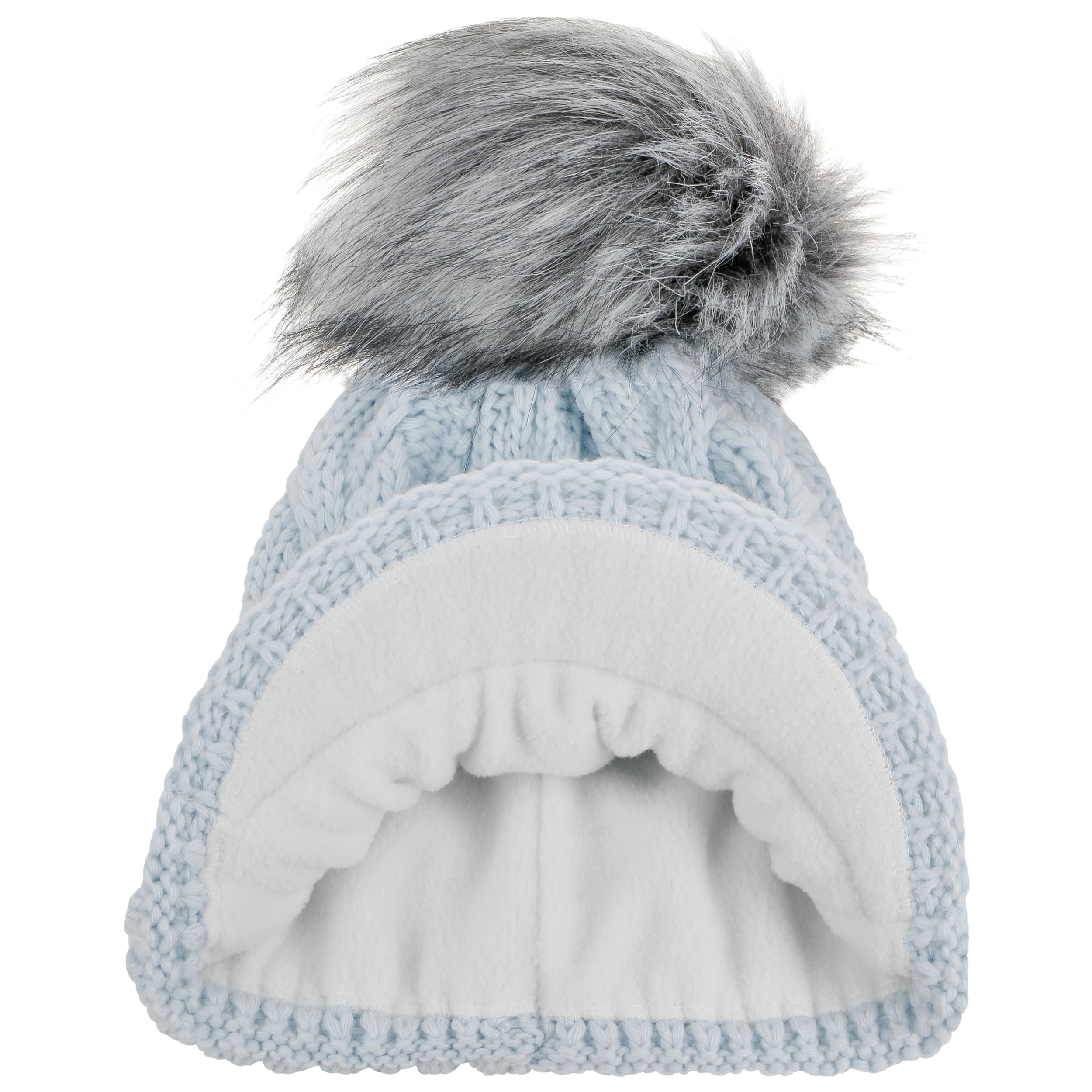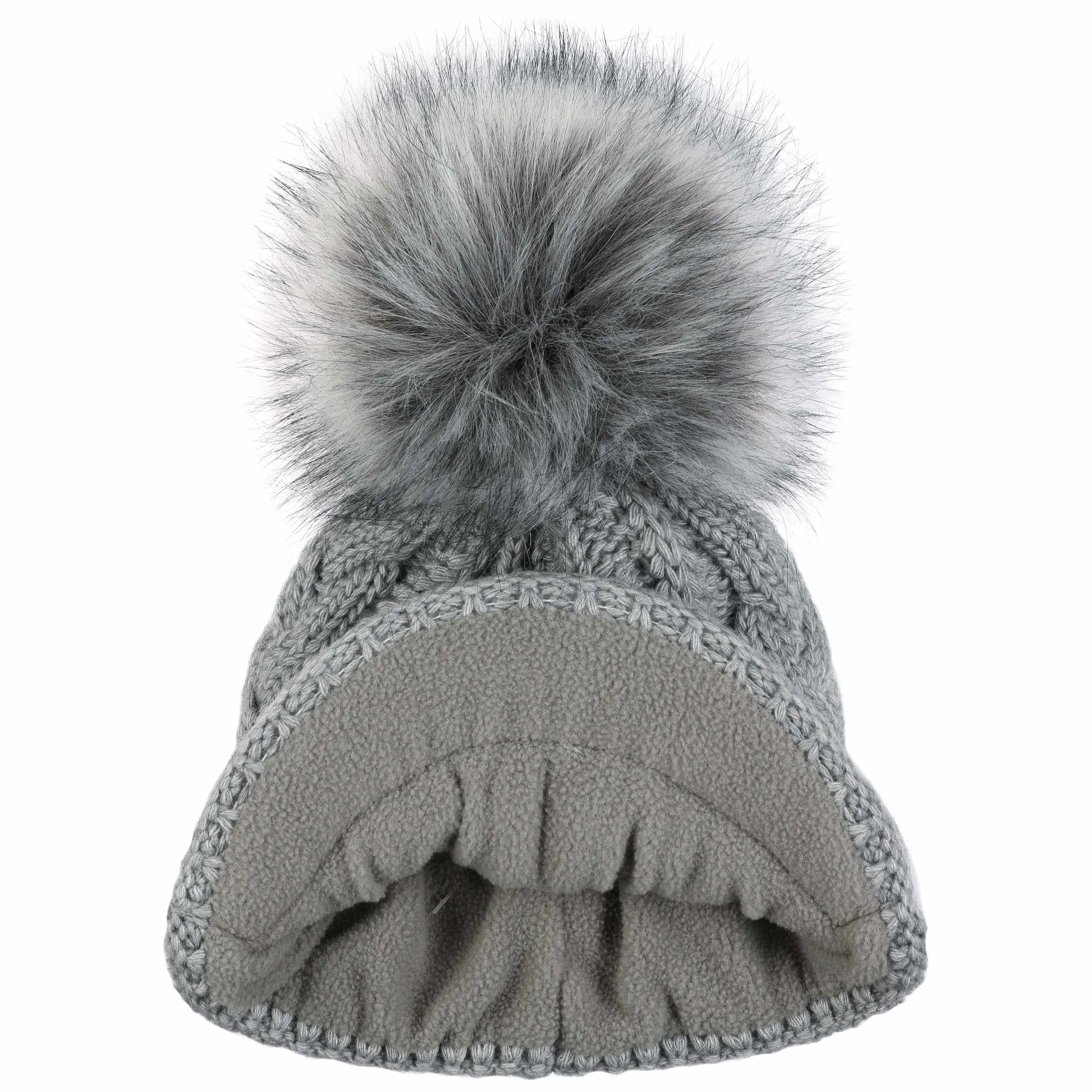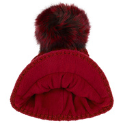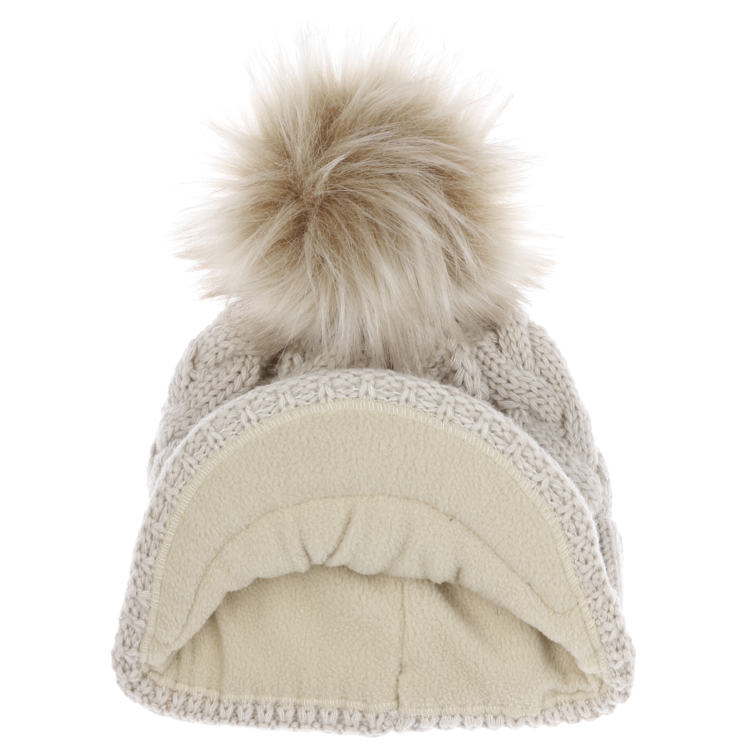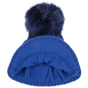 With a peak, cable knit pattern and fluffy pompom.