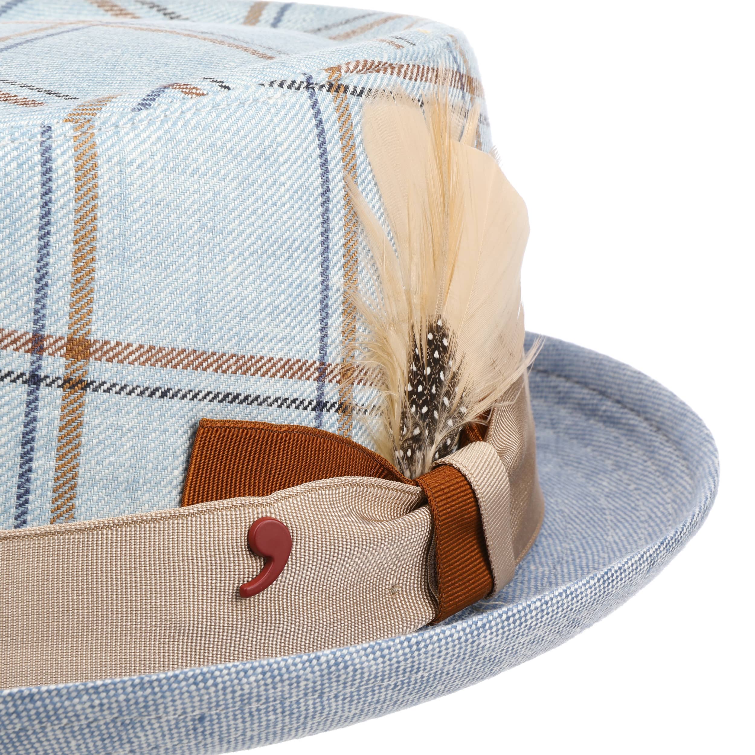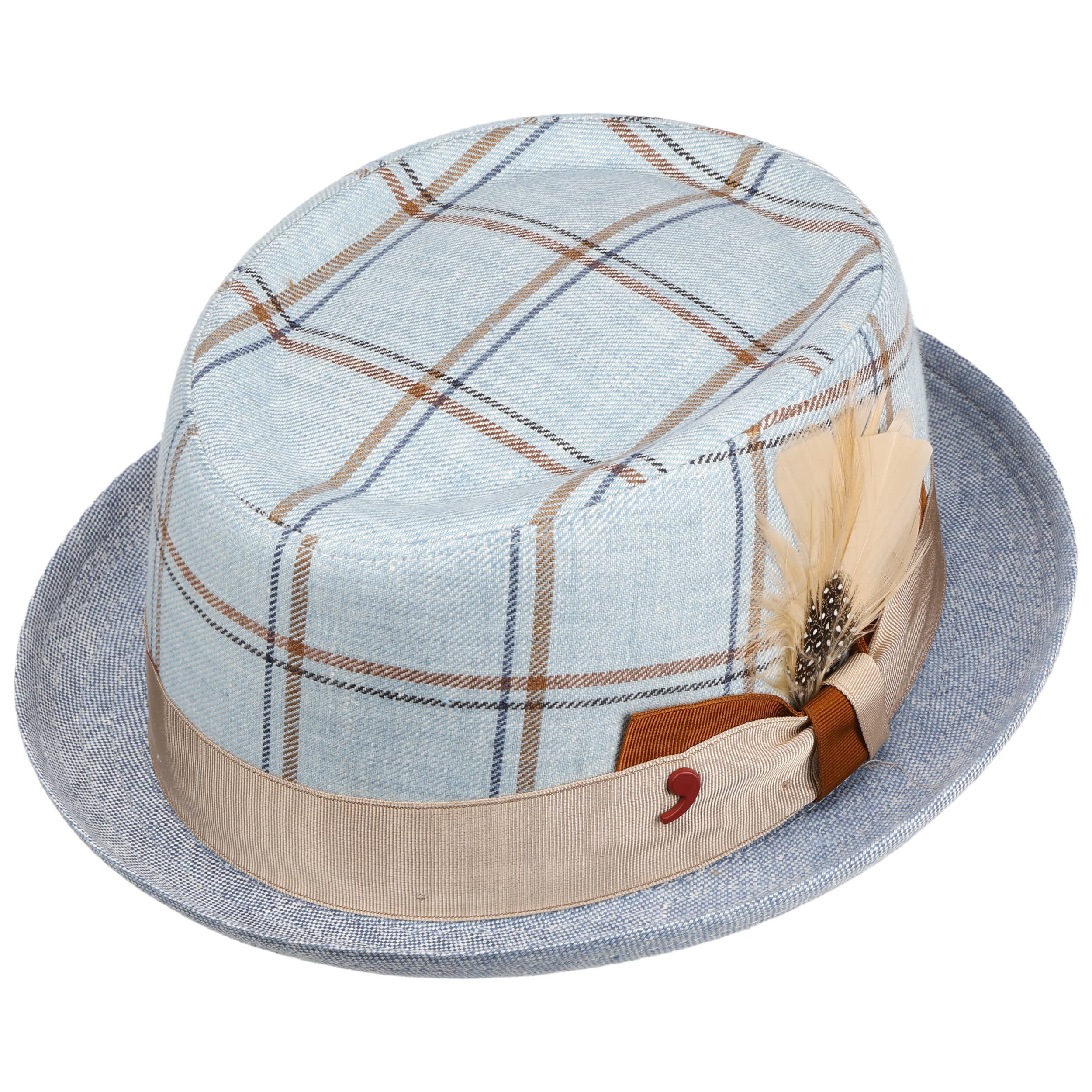 This compact pork pie hat has a flat shape, the typical turned-up brim and a harmonious checked design – an accessory with casual charm that shines particularly well on summer outings or relaxed city strolls. The Alfonso D’Este brand uses pure linen for this model, whose breathable properties and pleasant cotton lining ensure the best wearing comfort. The contrasting grosgrain ribbon with decorative feather and the unusual pattern on the crown emphasise the individual look. This stylish one-off was made in Italy.