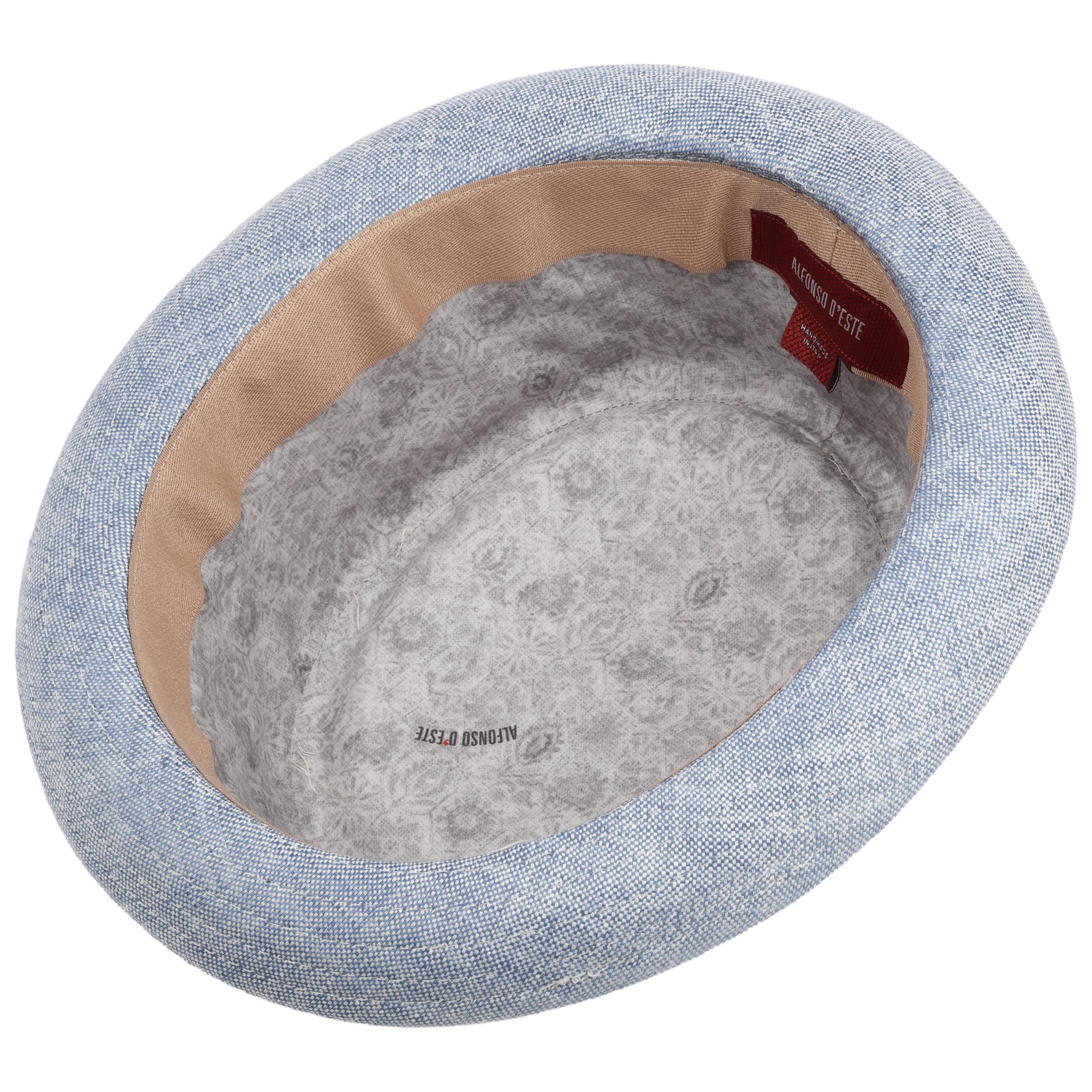 With a variety of elegant hat and cap styles, the long-established brand Alfonso D´Este offers la dolce vita to wear. The designers and founders of the Italian hat company Salvatore Marciano and Vincenzo Marcellino create classic headwear in a contemporary design for the modern wardrobe. With attention to detail, high-quality materials are processed in Italy from superb craftsmanship to create exquisite one-of-a-kind pieces. In Alfonso D´Este's first-class range, sophisticated patterns meet authentic hat classics and promise a tasteful look, from flat caps to berets and fedoras.- Classic Fusion Pork Pie by Alfonso D’Este - light blue 1