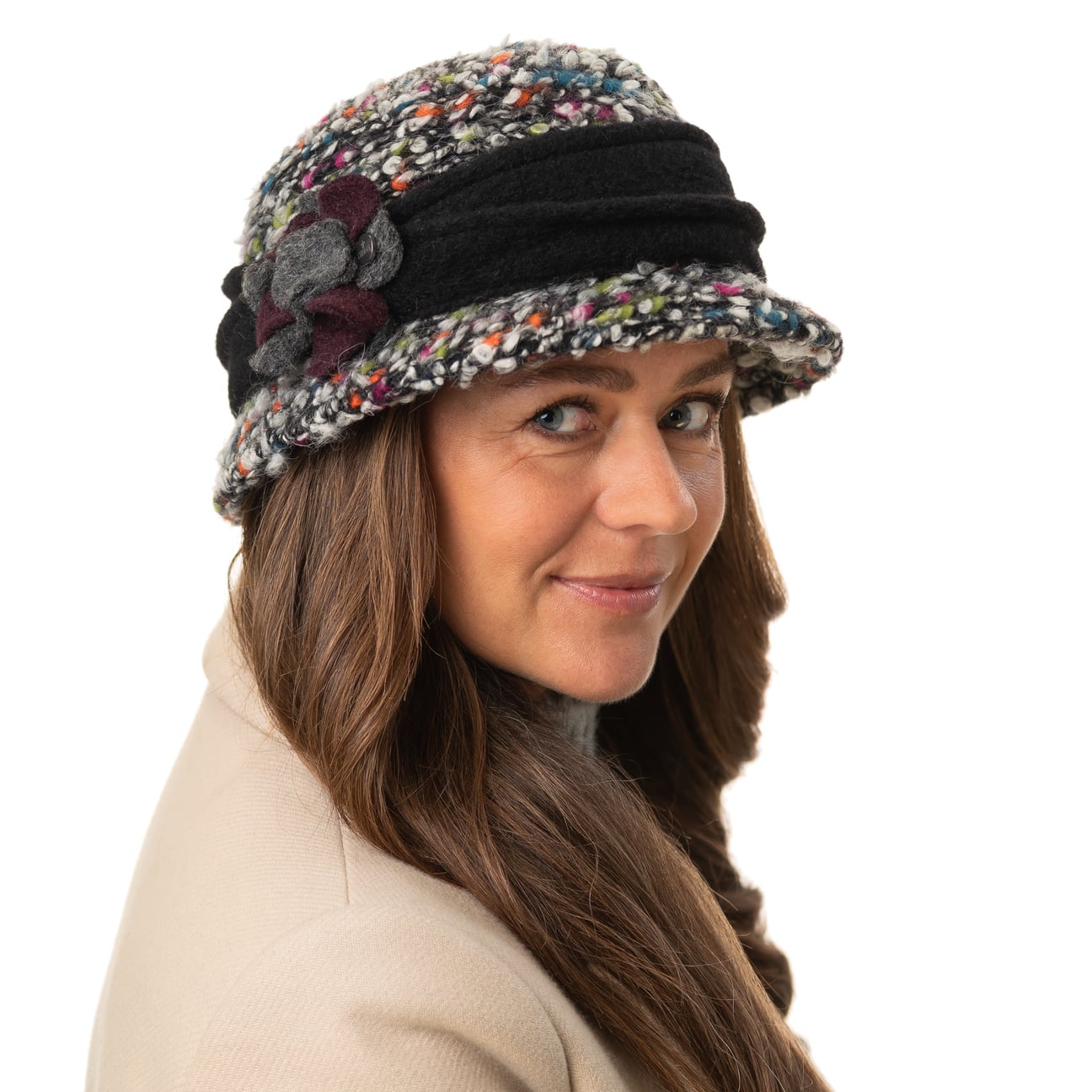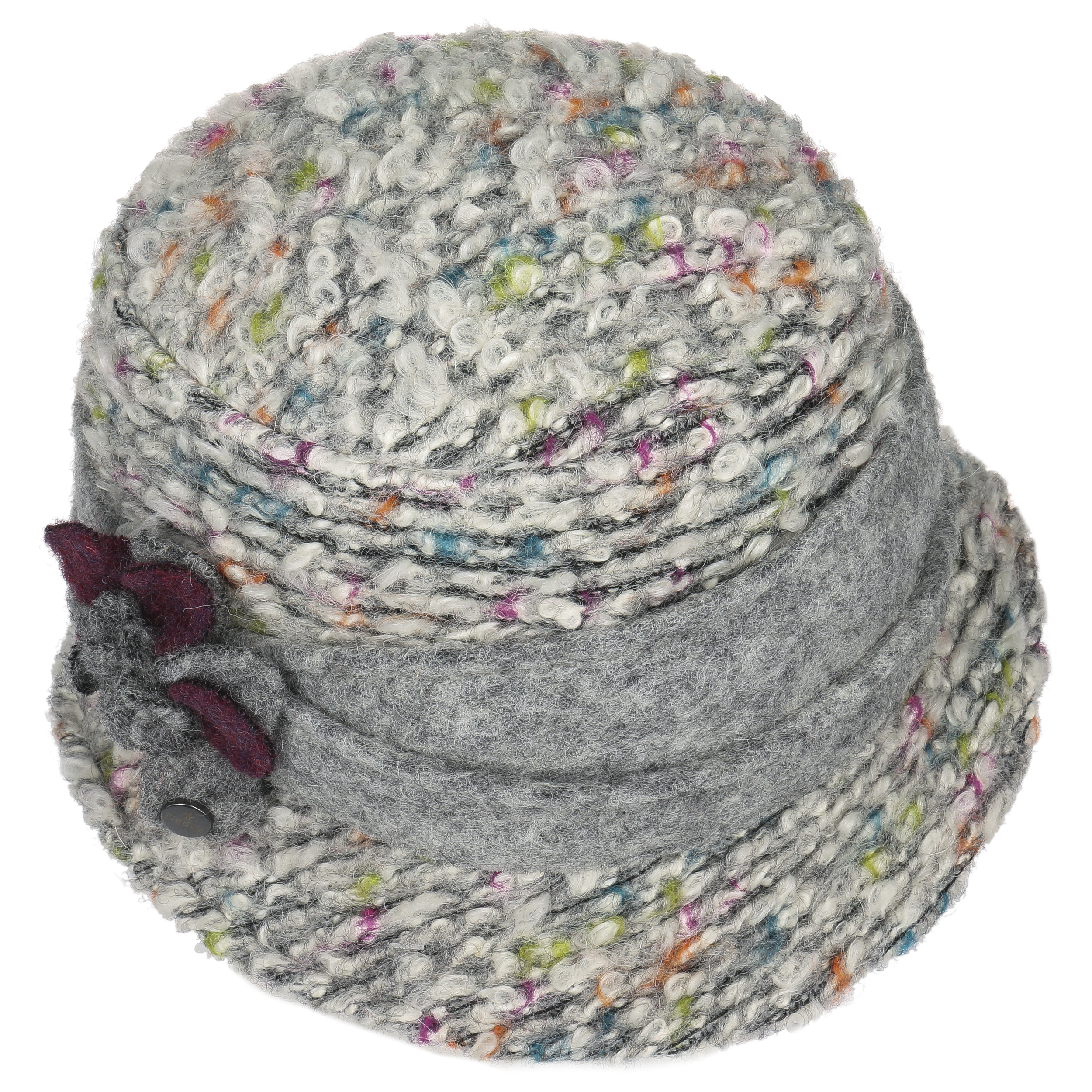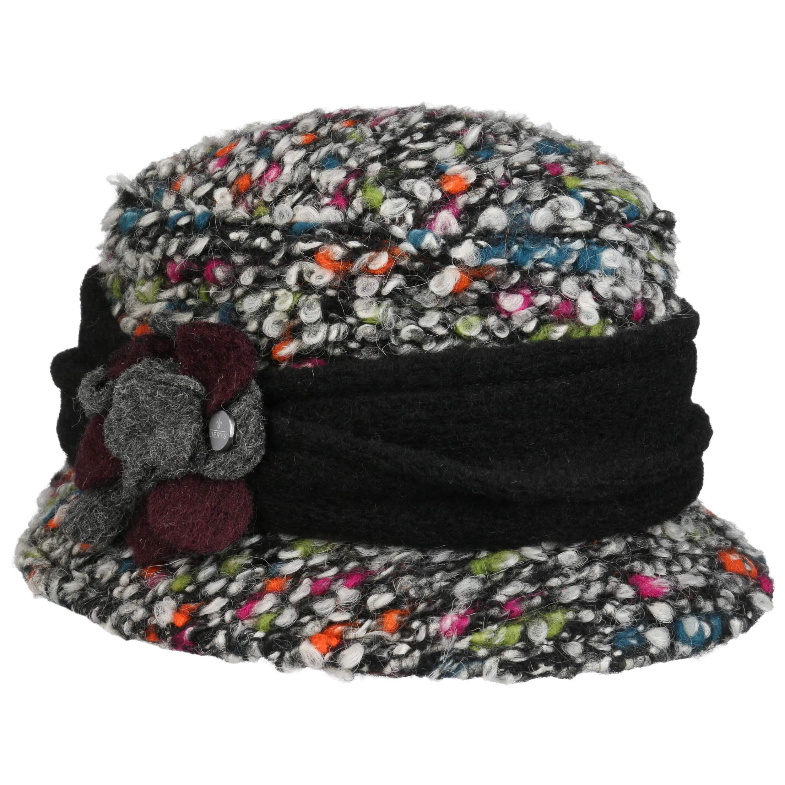 This high quality wool hat from Lierys beguiles with an exceptional design that suits sophisticated modern women. Its multi-coloured, mottled effect looks carefree and dynamic. This fits in with the spring-like appearance of the enchanting floral detailing that sits on the hat’s wide, plain-coloured trim band.