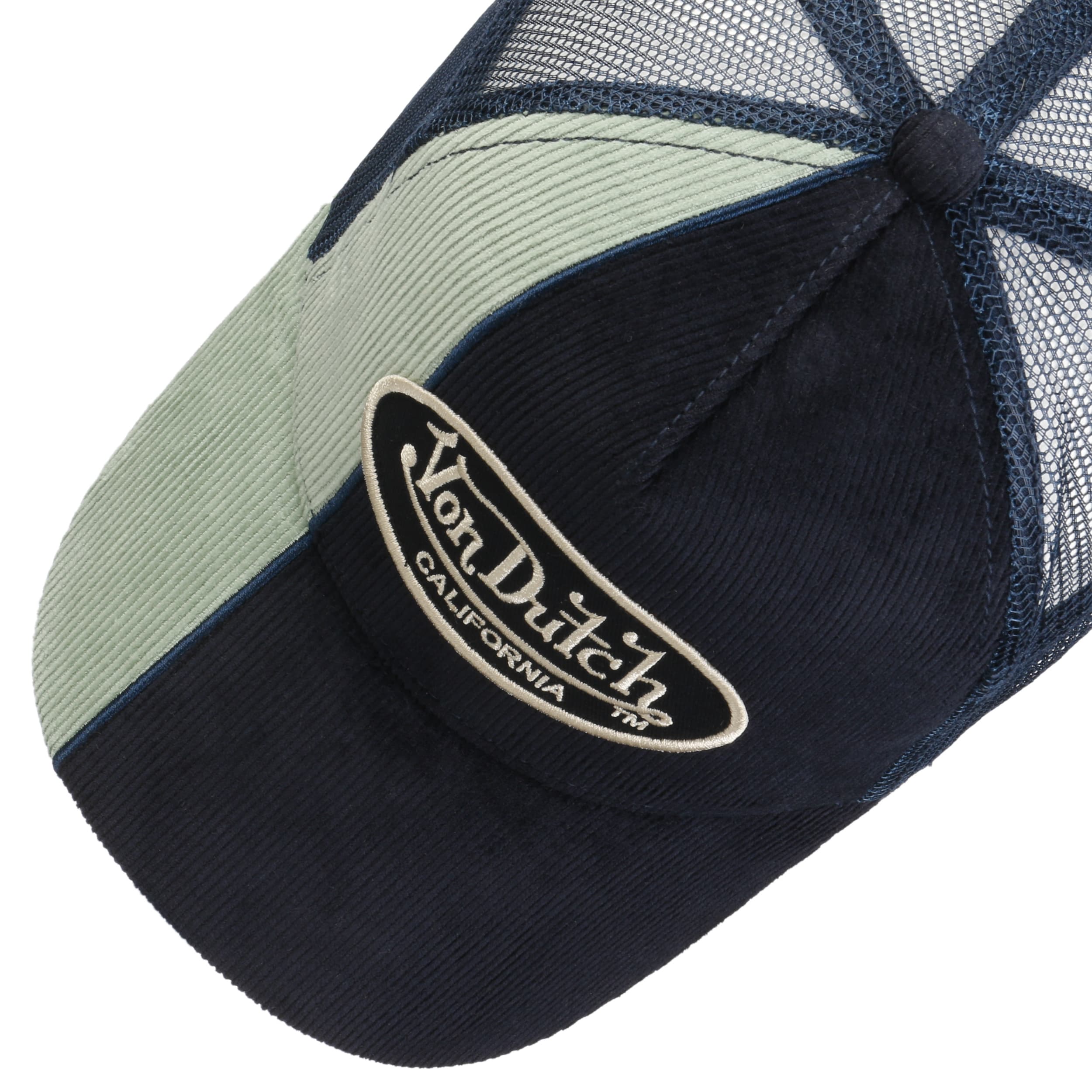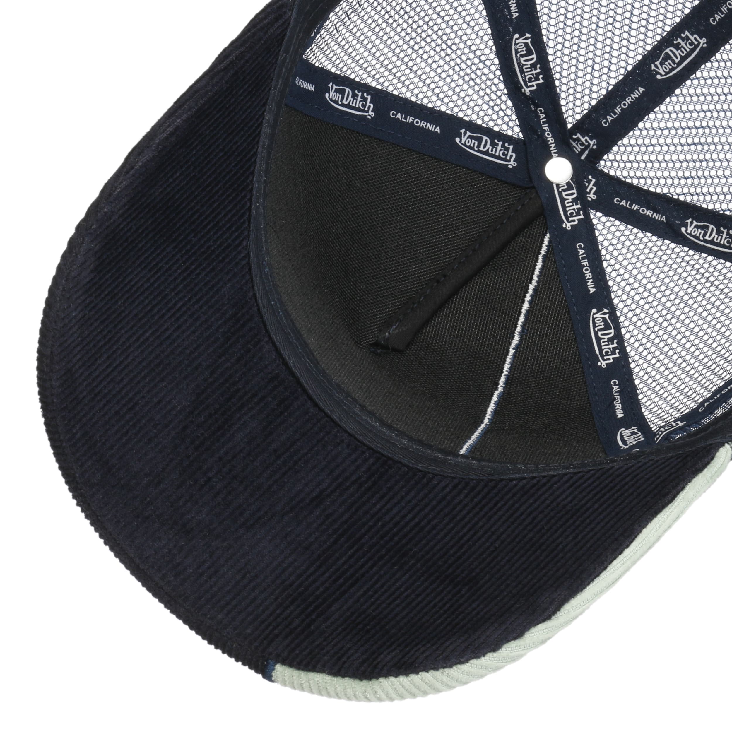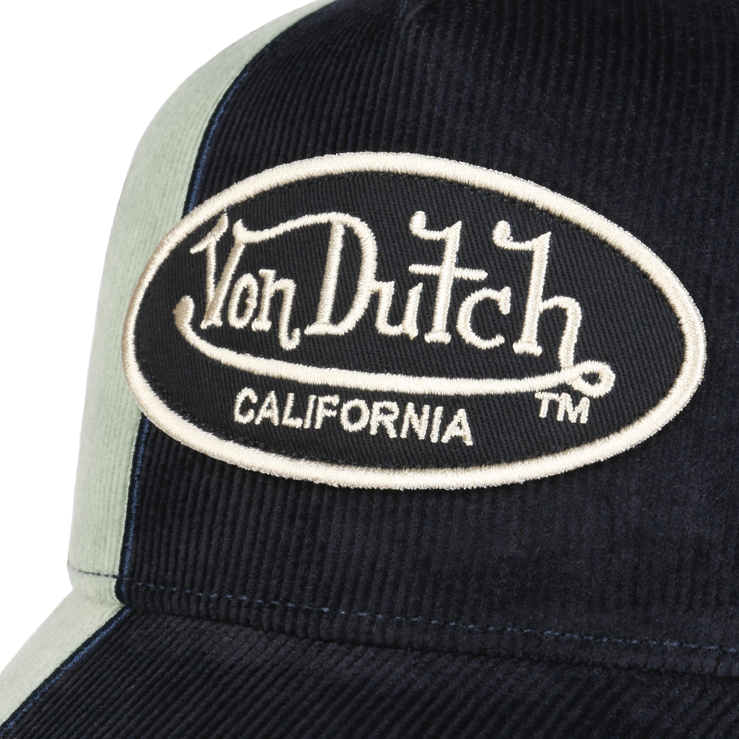 Von Dutch is a Californian cult brand which was founded in 1999. The fashionable designs appeal with a modern rustic charm. Von Dutch is especially well-known for its trucker caps – acclaimed by celebrities and at the same time a trendy accessory for everyone. The casual styles with a retro look really stand out from the crowd and are stylish eye-catchers. Von Dutch caps made it from the US American biker scene to the heads of fashion-lovers worldwide. The label has achieved international success with fans all over the world.- Contrast Cord Oval Patch Cap by Von Dutch - petrol blue 1