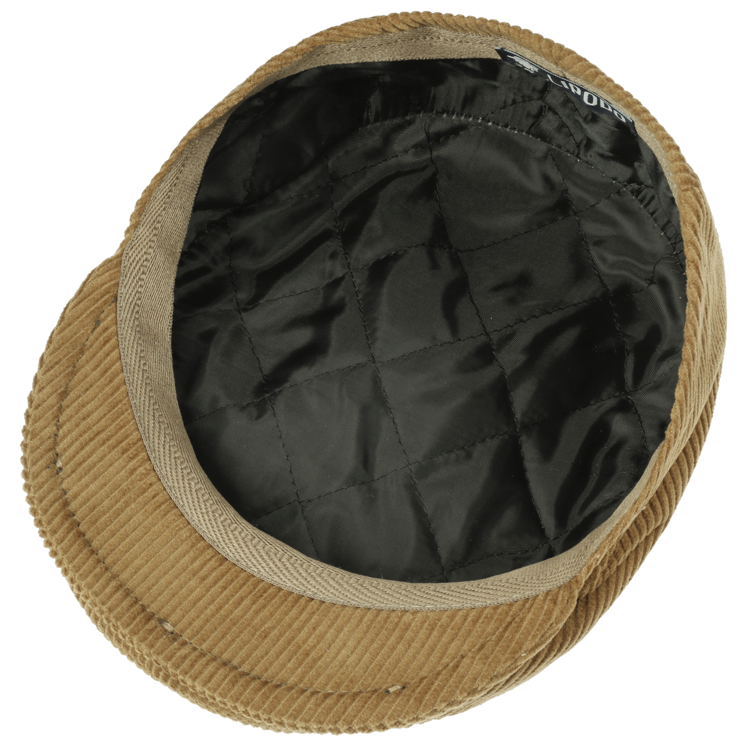 With quilted lining and brand pin on the side at the back of the head.
