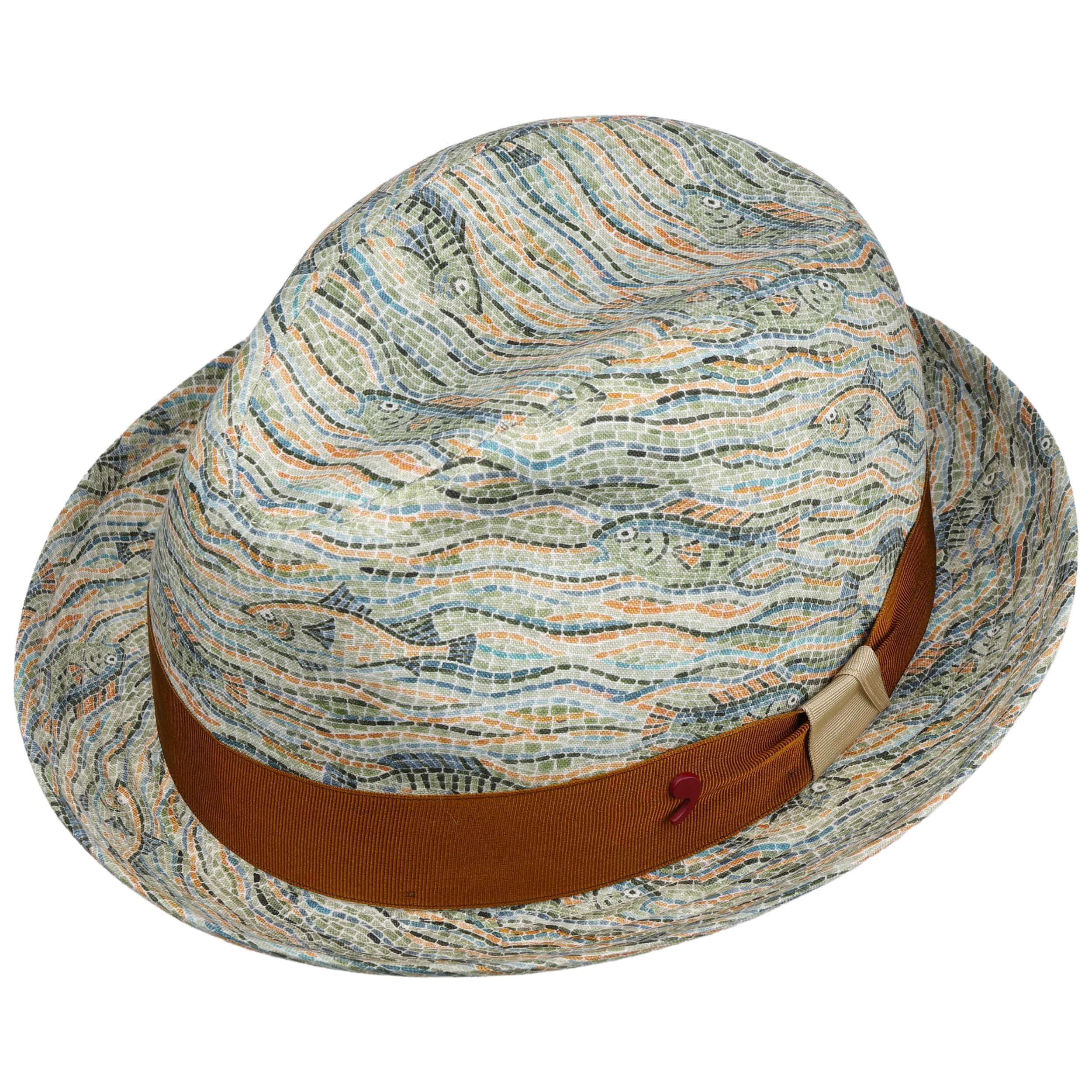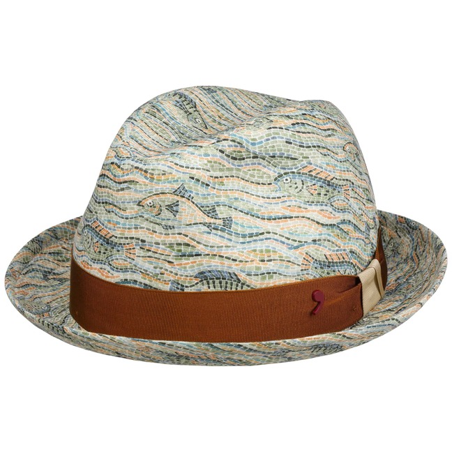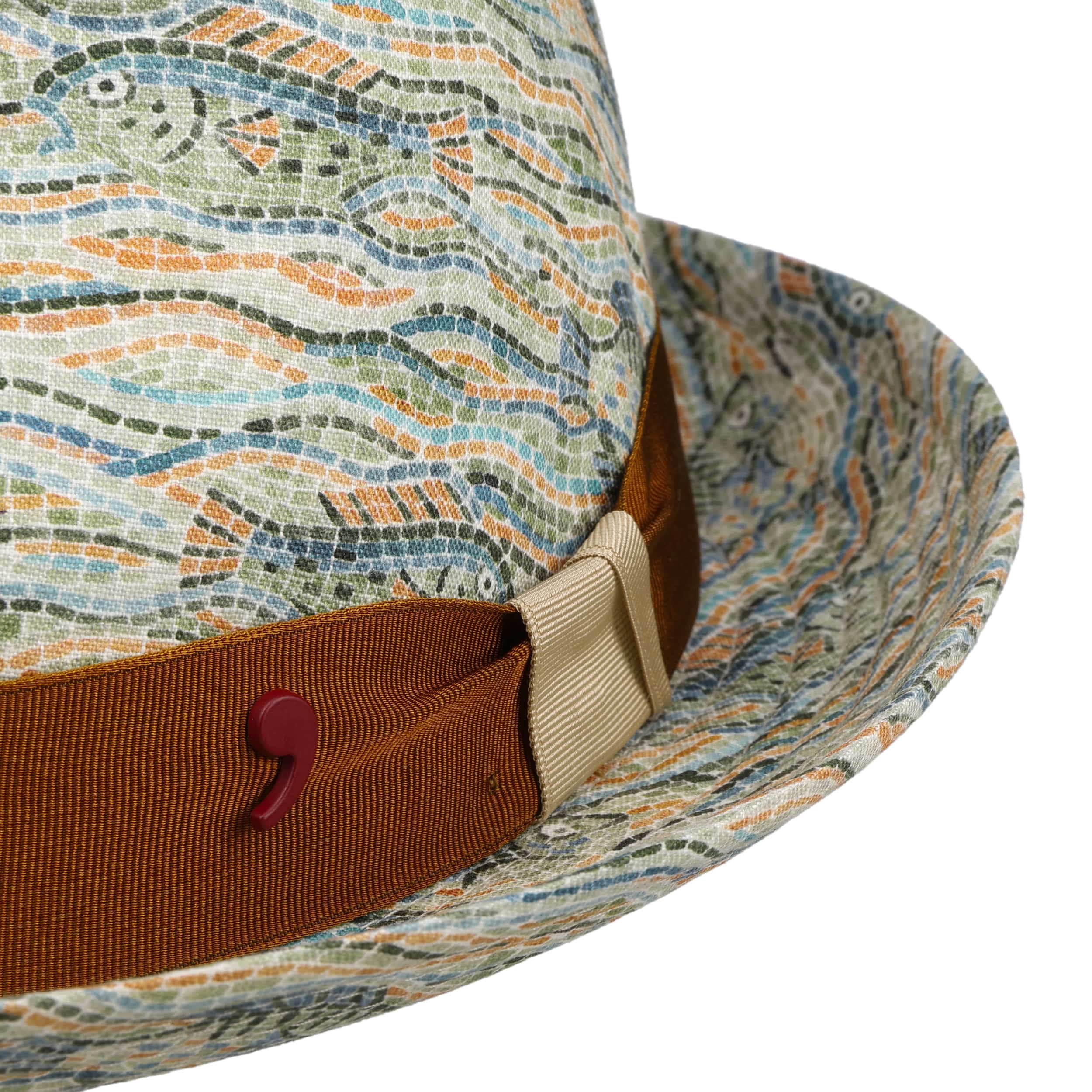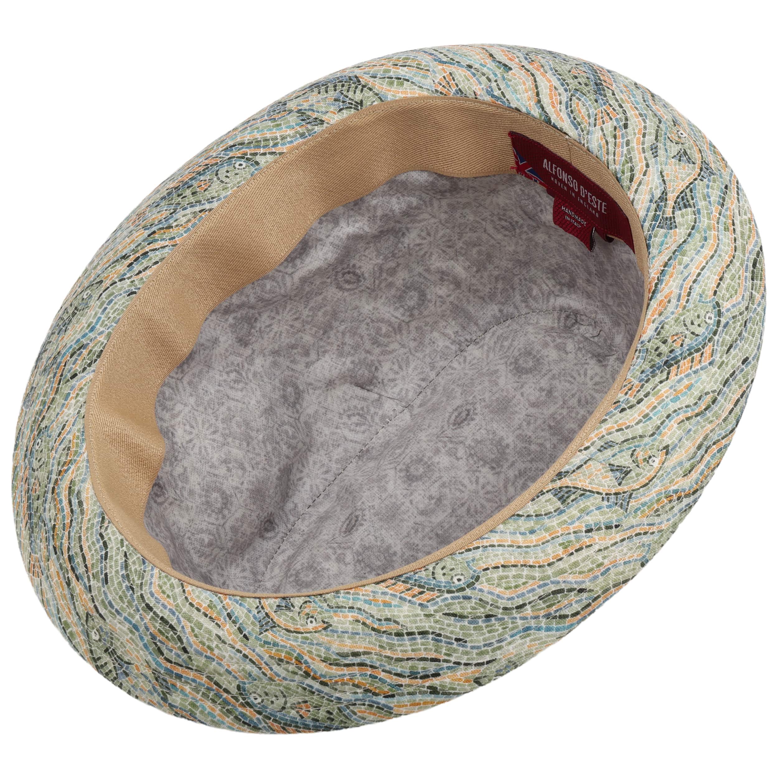 The beautifully shaped player hat is characterised by its distinctive silhouette and detailed mosaic pattern. The traditional label Alfonso D’Este combines timeless elegance with a fresh design that will impress you – ideal for when you are on holiday and during your leisure time. The pleasantly light linen and the breathable cotton lining ensure excellent comfort, even on warm days. The wide, multicoloured grosgrain ribbon underlines the individual look and adds an elegant accent. This stylish accessory is made in Italy and stands for top quality and fashionable self-confidence.