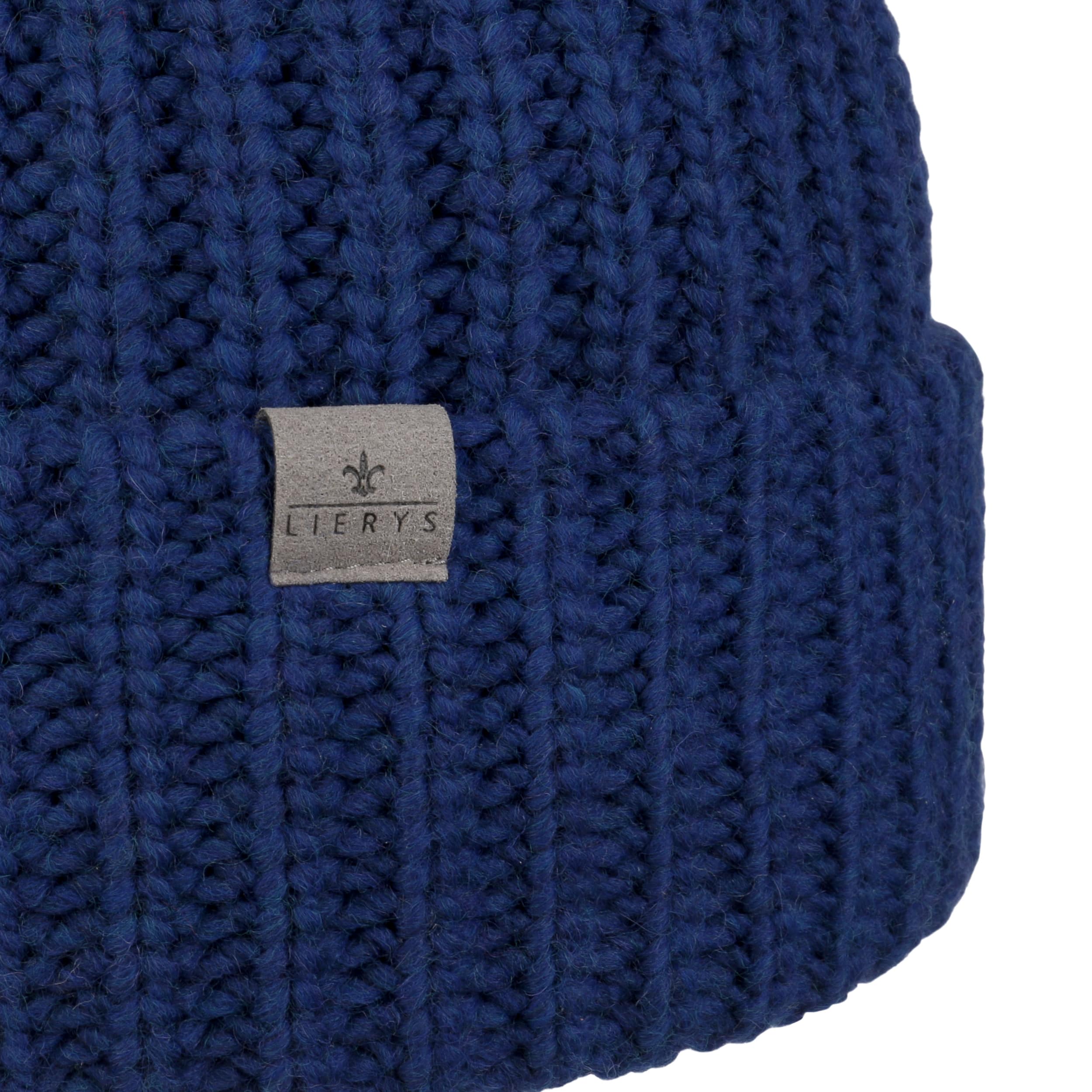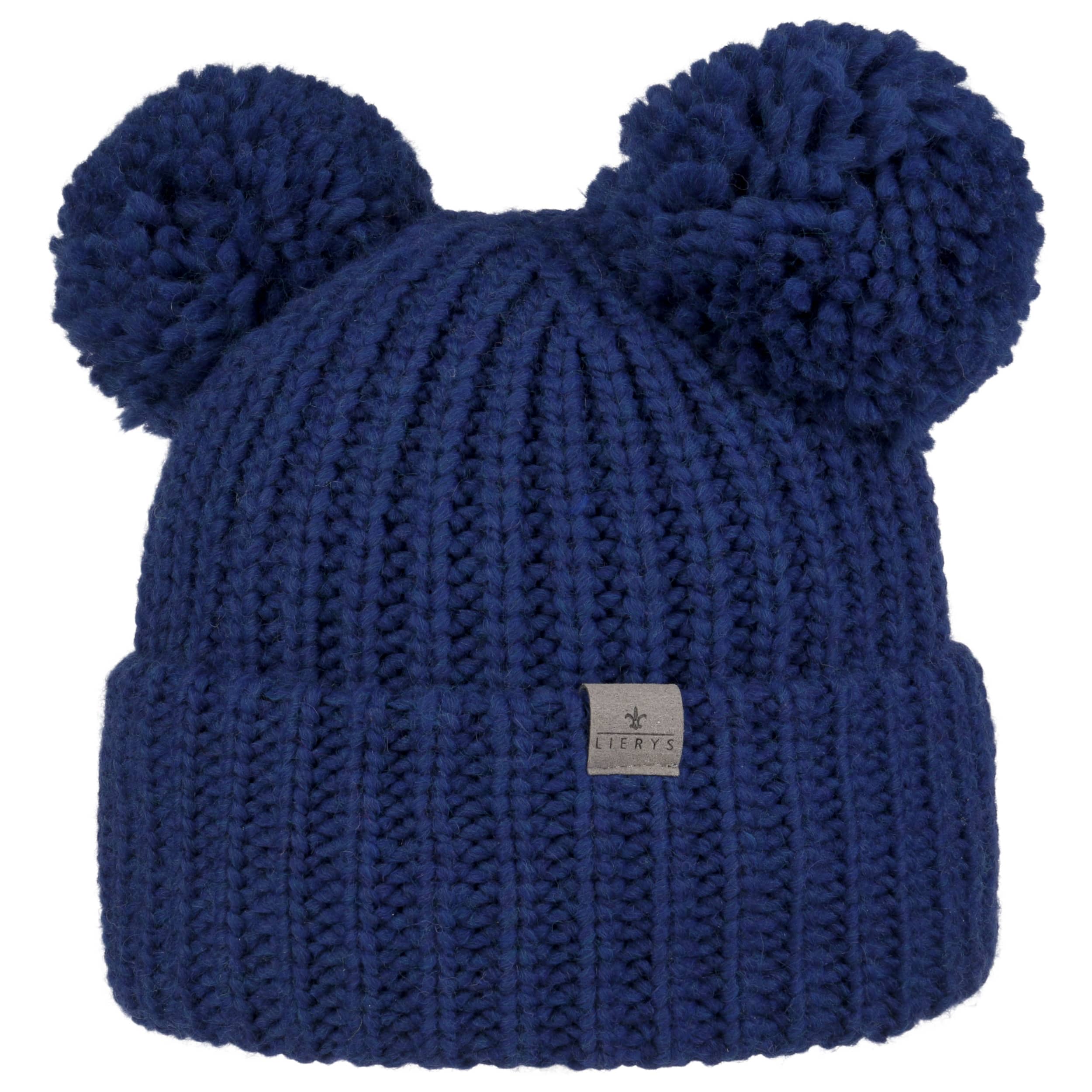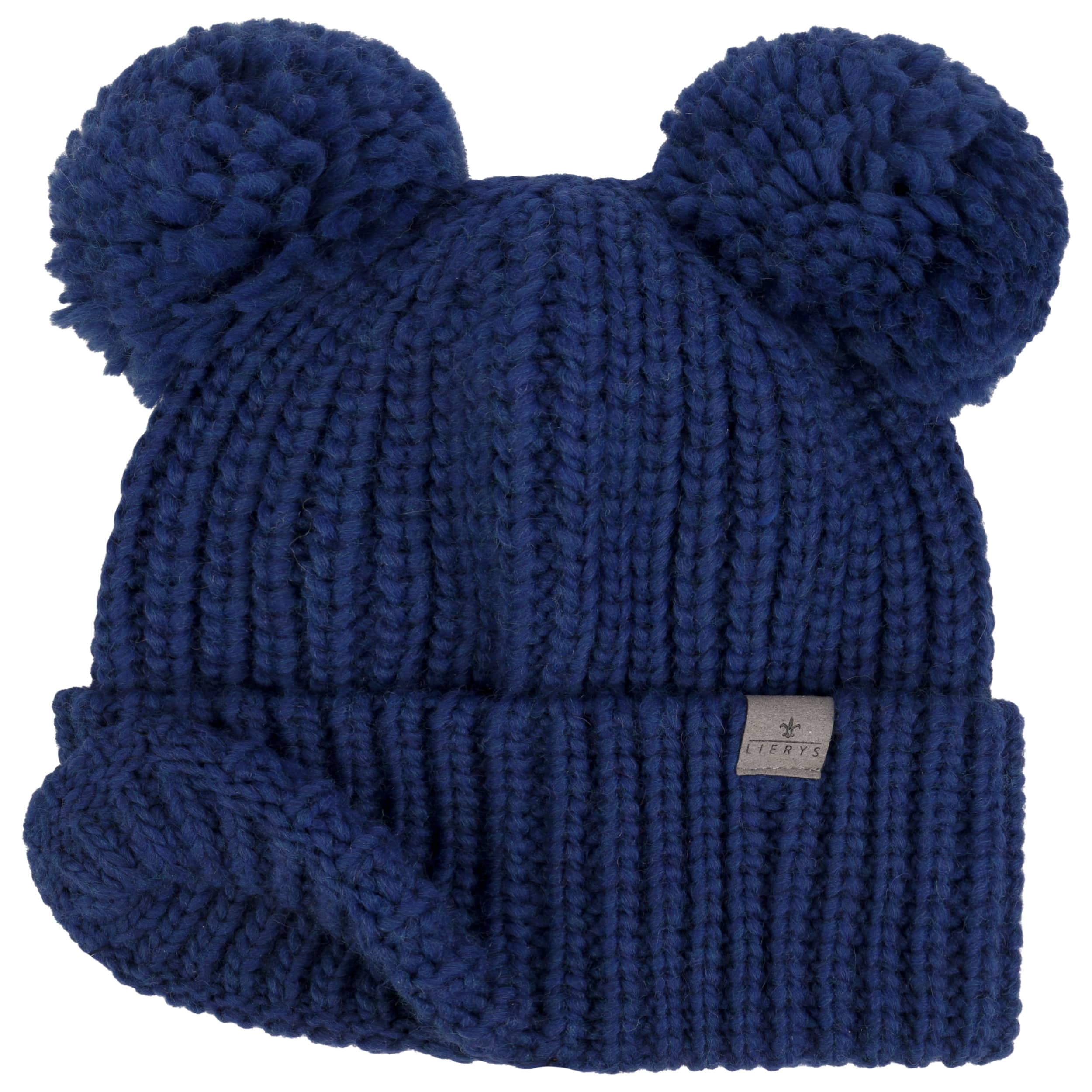 The label with the iris logo has dedicated itself to making modern, stylish and comfortable headwear along with matching accessories. Baseball caps, Trilby hats and Bogart hats have been made into timeless designs that give an outfit a classy splash of colour and bring a smart cut to your headwear. High quality knitted sets, which are available individually as beanies, peak pull on hats, Laplander hats, headbands, scarves, gloves etc., discreetly accentuate each lady’s or gentleman’s individuality. From woollen hats to flat caps, Lierys accessories can be worn in endless fashionable combinations.- Double Pom Knit Beanie by Lierys - blue 1