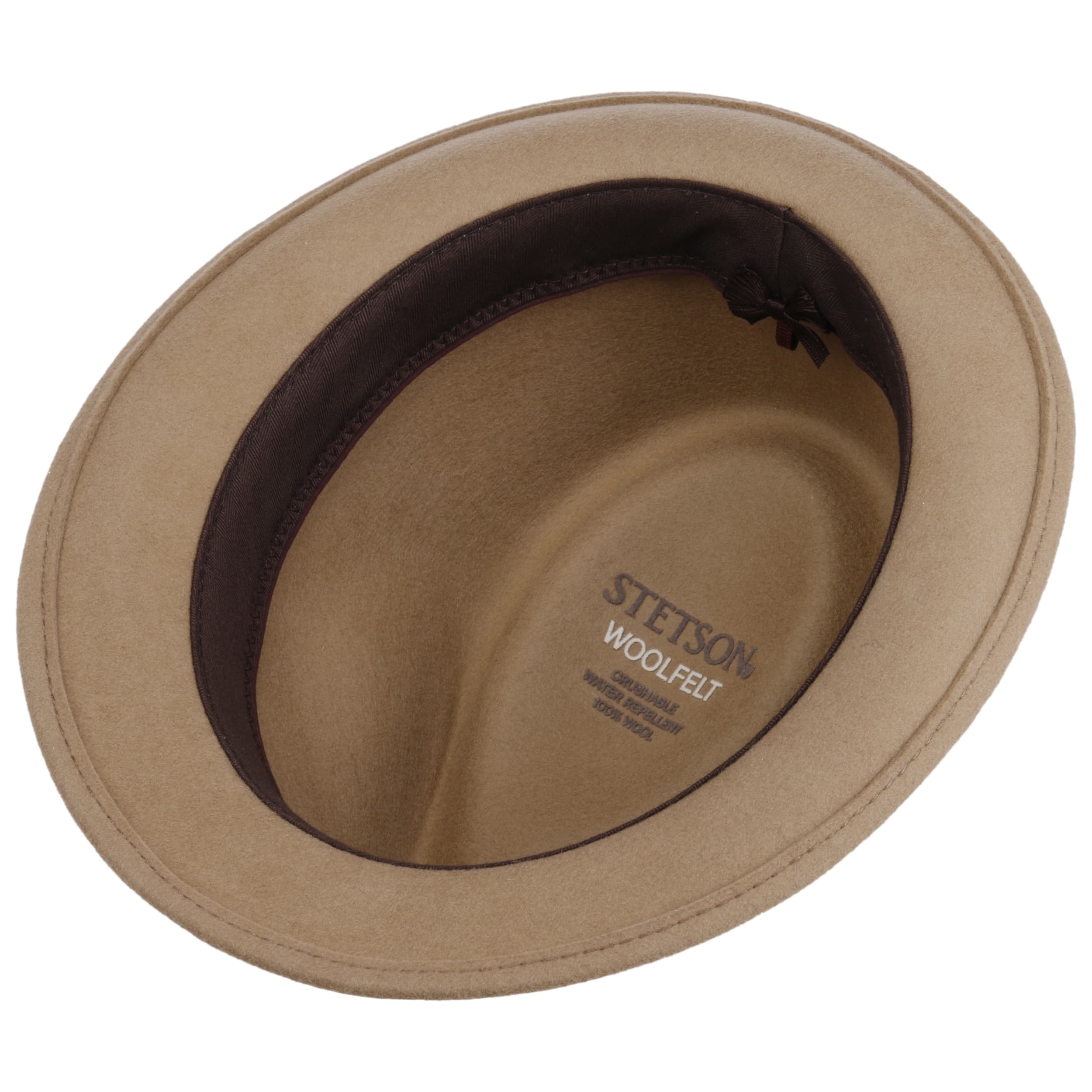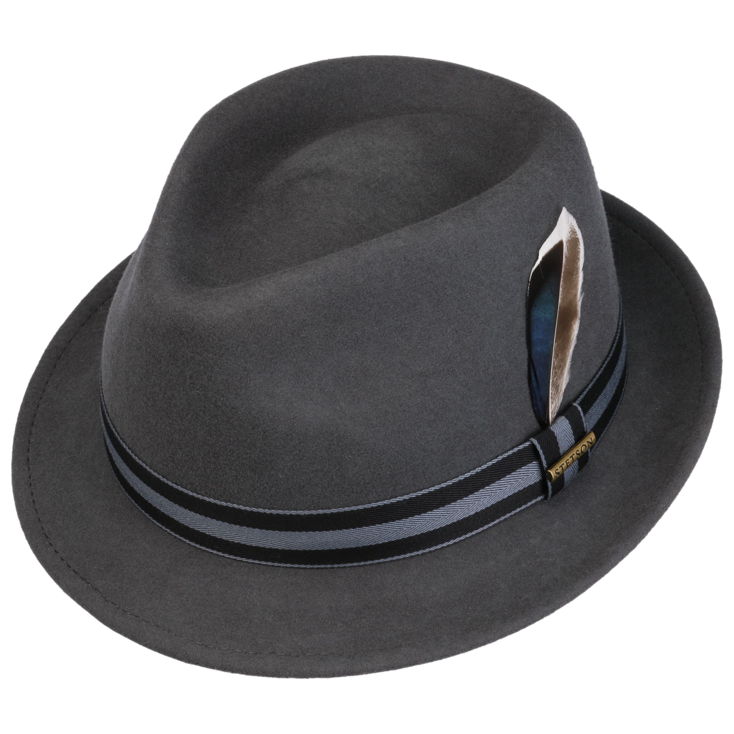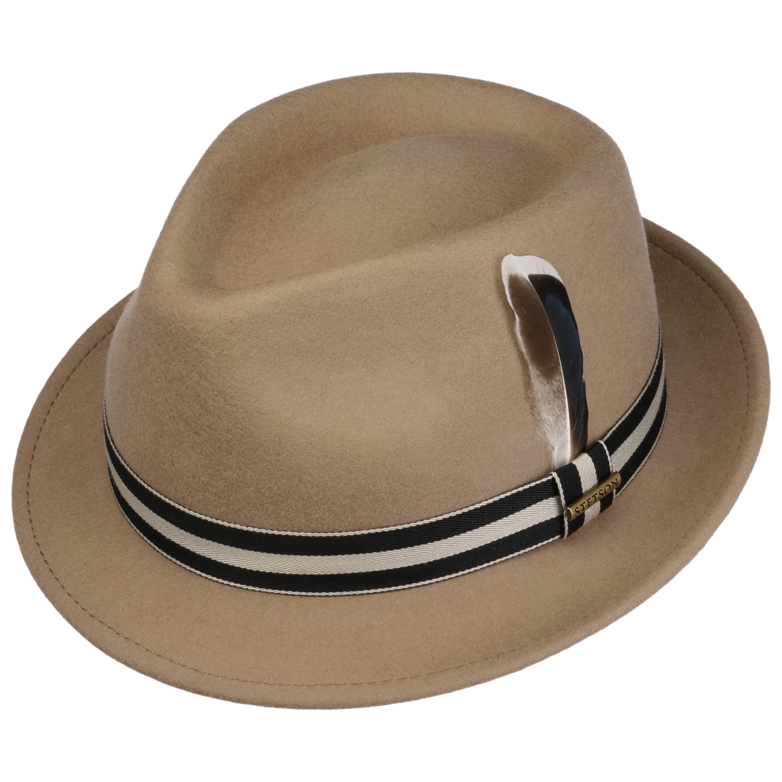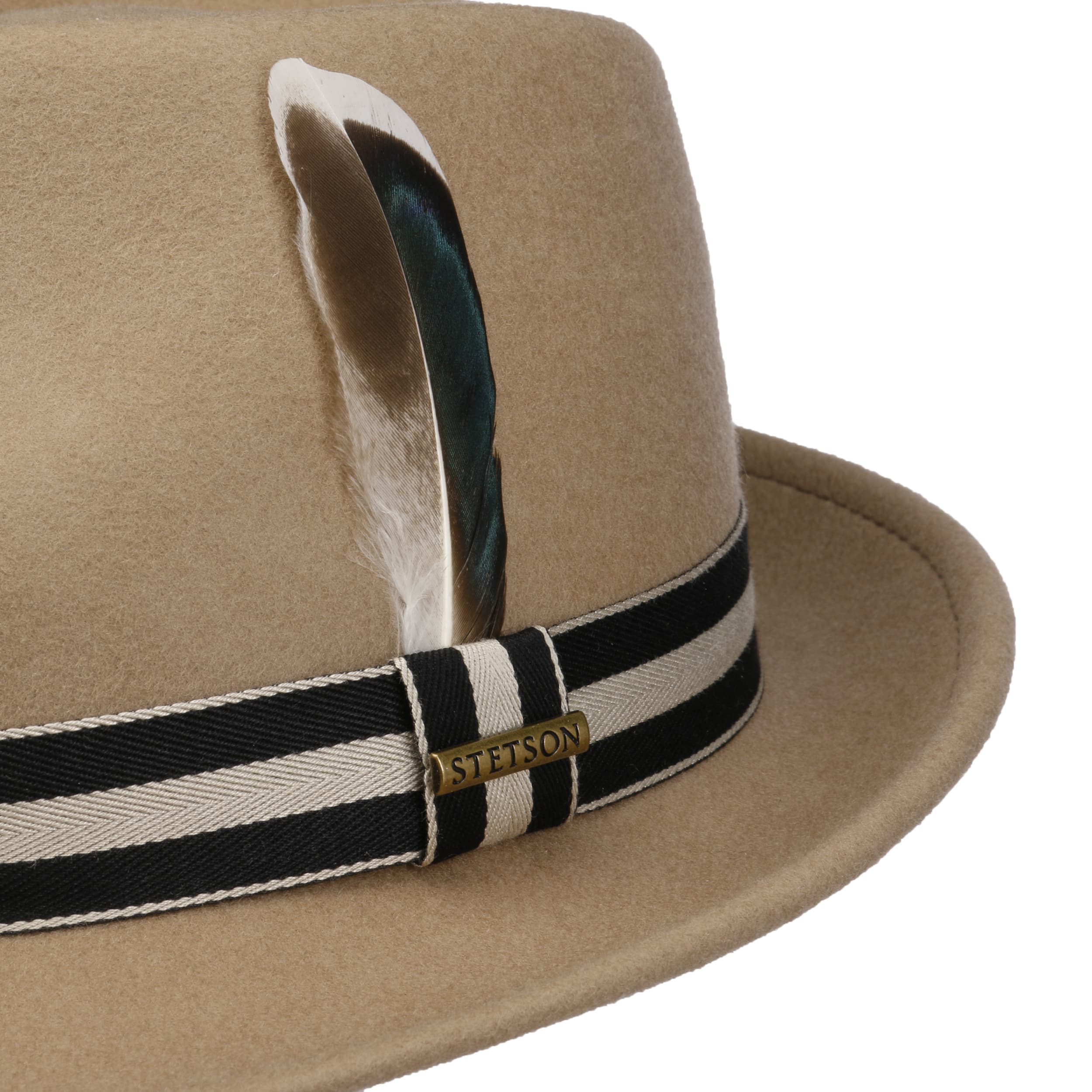 wool felt skilfully conceals the outdoor robustness of the trilby from Stetson, which it gets from its Asahi Guard® finish: The felt hat is water-repellent, crushable and resistant to dust and dirt stains. So it’s hardly surprising that it confidently presents itself in a characteristic shape and plain-coloured look, both cleverly set off by the striped trim band.