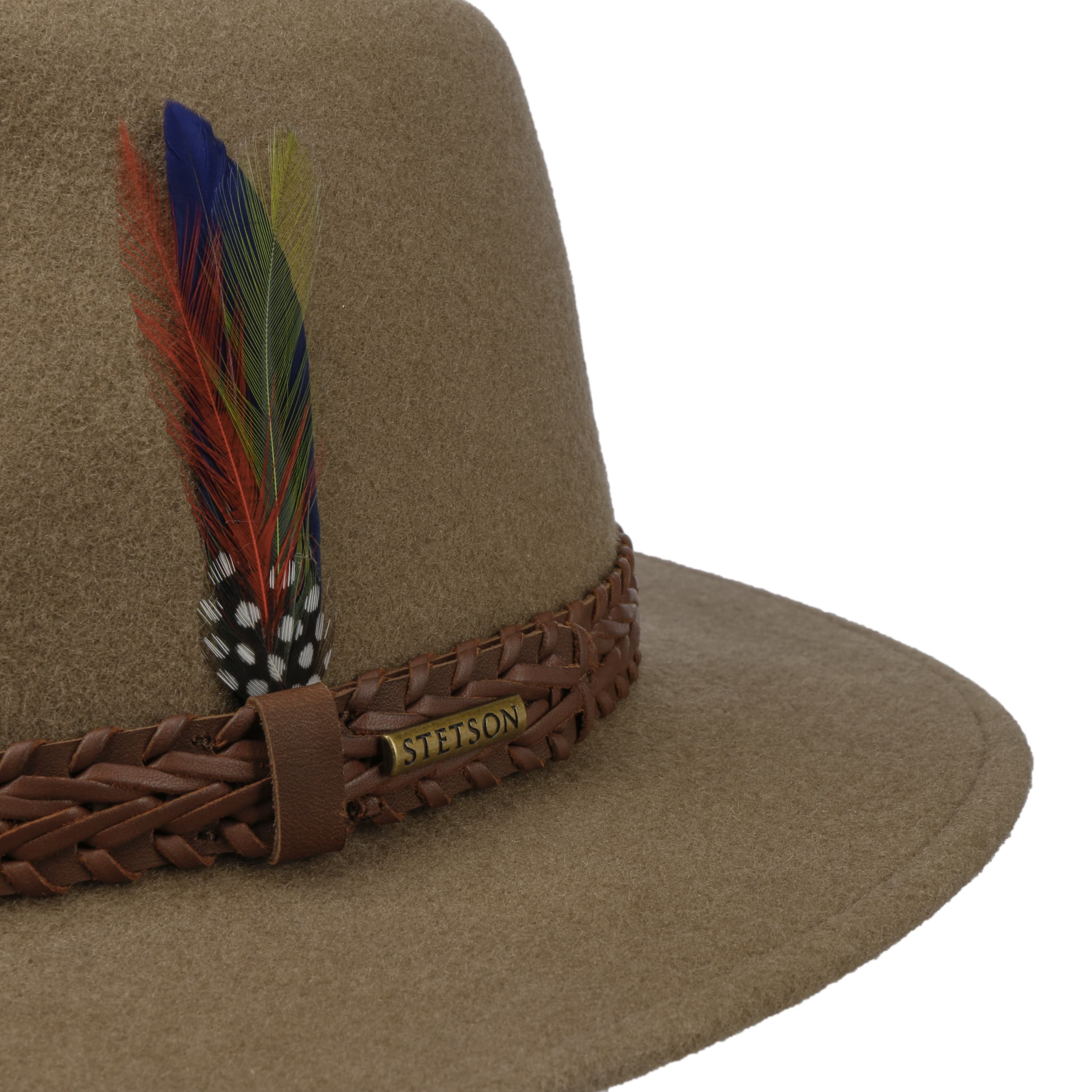 The single-coloured traveller hat from Stetson is a very cosmopolitan hat. The outdoor hat is made in the EU from 100% felted, mulesing-free wool and protects the head from the cold and moisture. It can also be rolled up small to fit in your luggage. An elaborately braided leather strap and a feather inserted at the side emphasise the bold appearance.