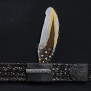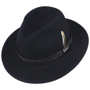 Wool felt in VitaFelt quality makes this traveller hat from Stetson hard-wearing, water-repellent, crushable and foldable for when you’re on the go. This felt hat is also not lacking in terms of comfort and attractive detailing: The lightweight finish and cotton fabric lining ensure a comfortable fit, while the smooth, plain-coloured design, imitation leather trim and feather decoration on the side meet the demands of those with sophisticated tastes.