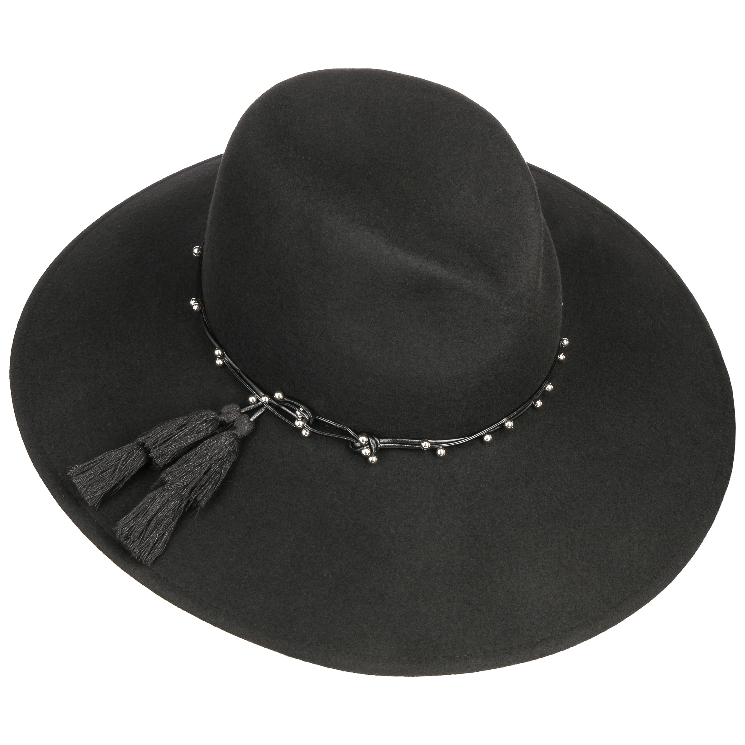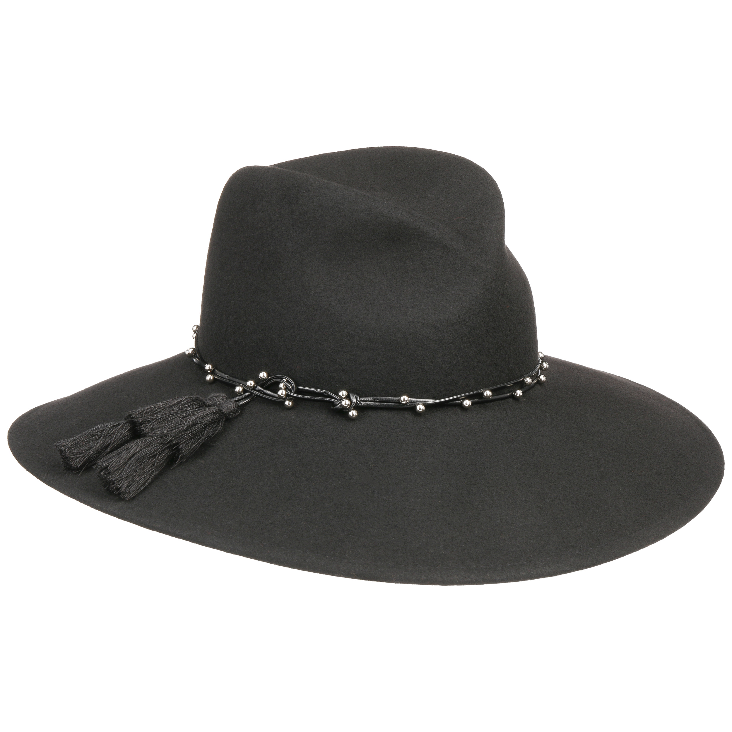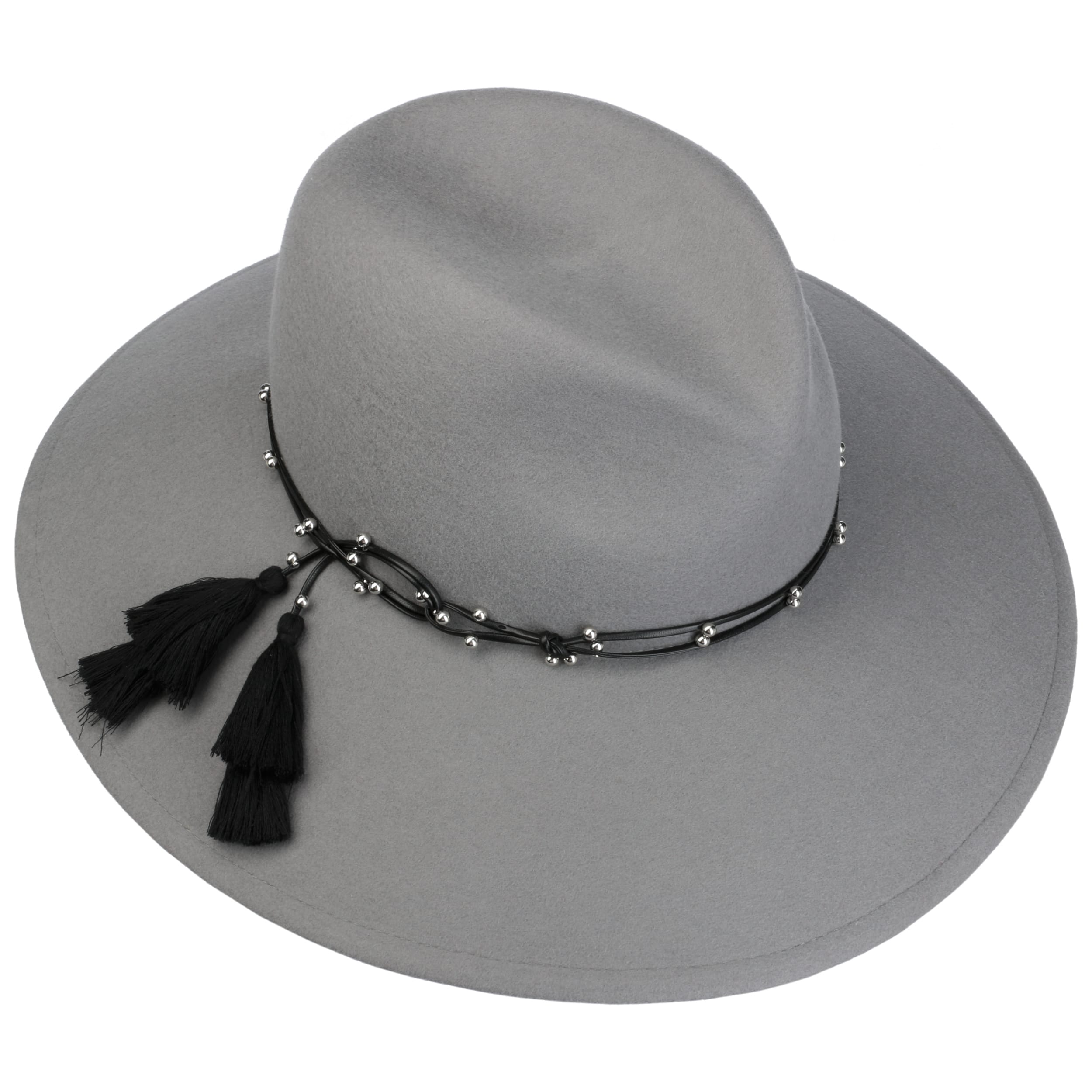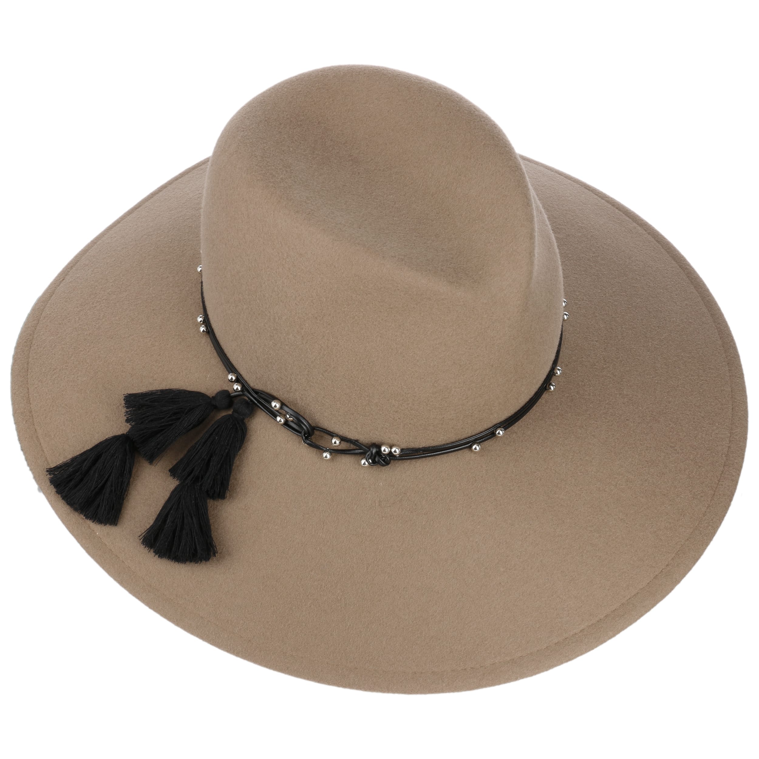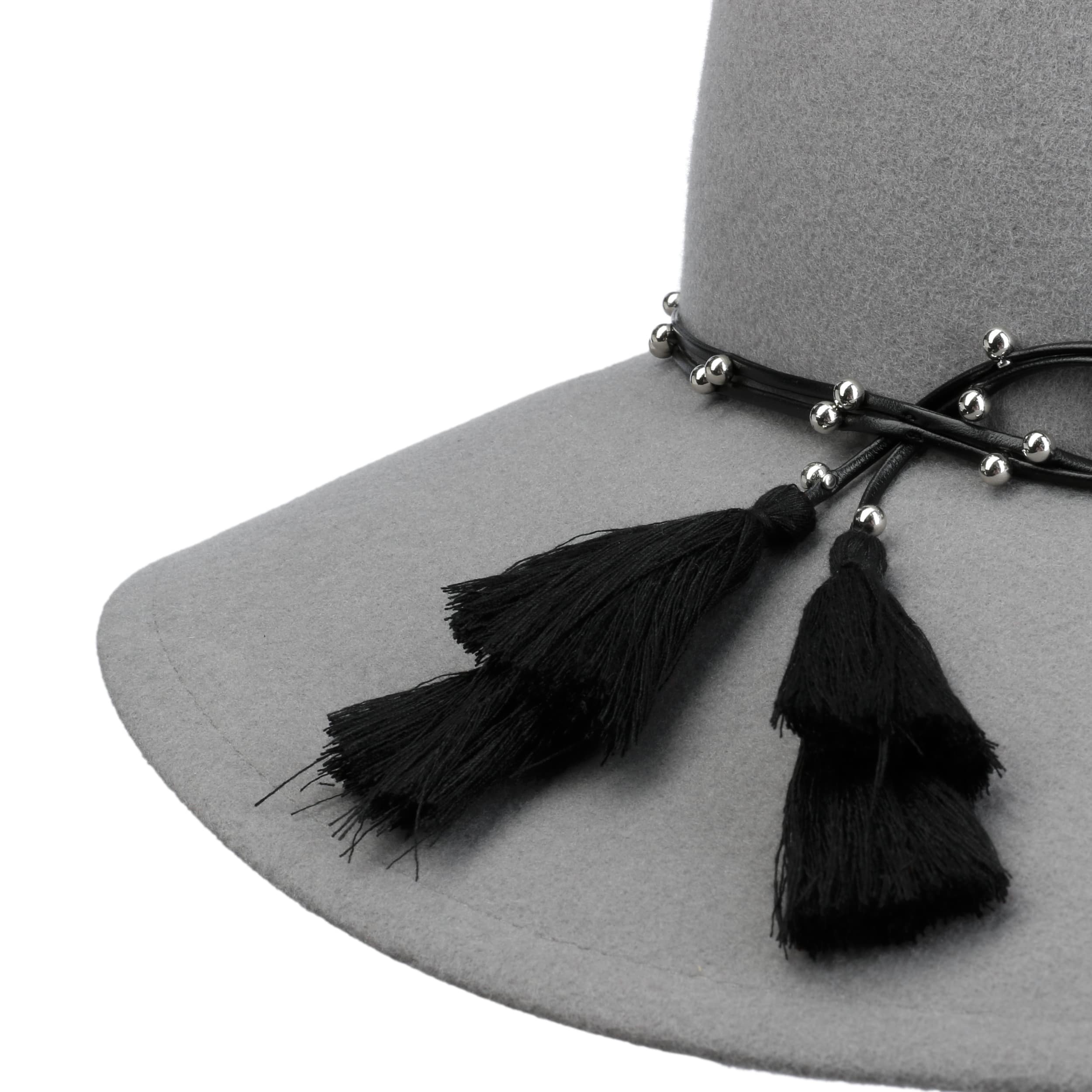 This monochrome hat from Mayser has been made by hand from 100% wool. Its characteristic shape with a wide brim makes it a real eyecatcher. The integrated stretch lining band ensures the perfect fit. An artistically draped leather effect trim band with lots of small decorative beads and two large tassels adorns the flexible travel hat.
