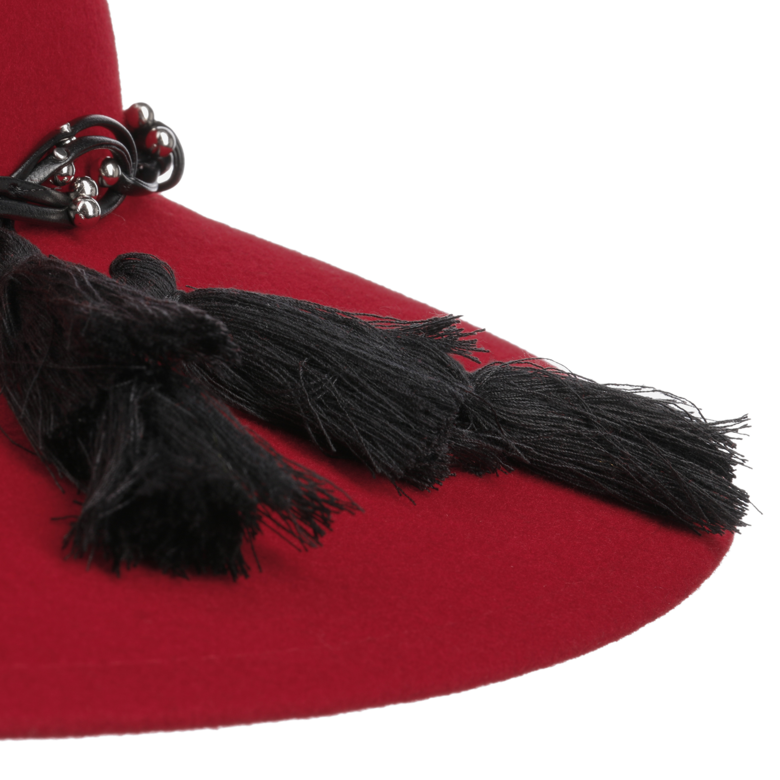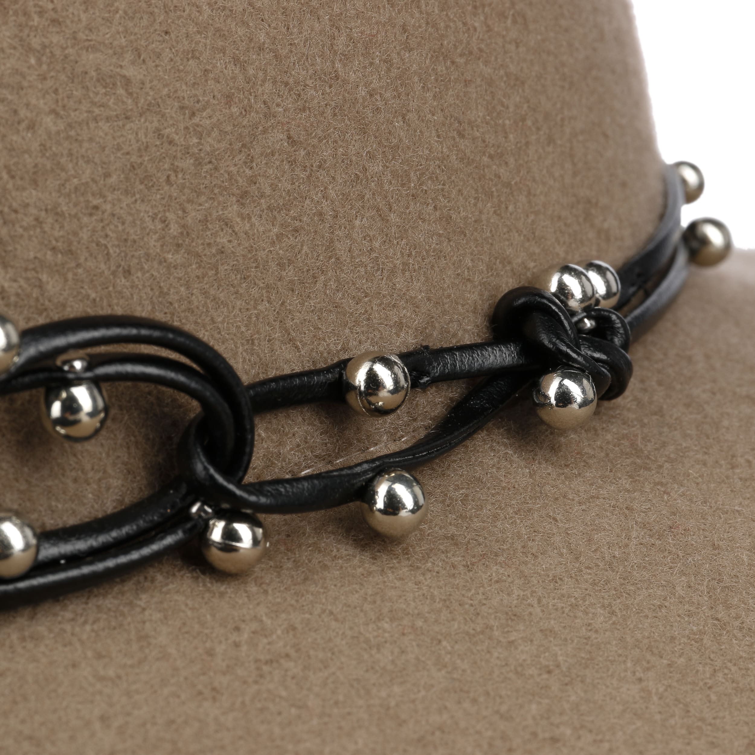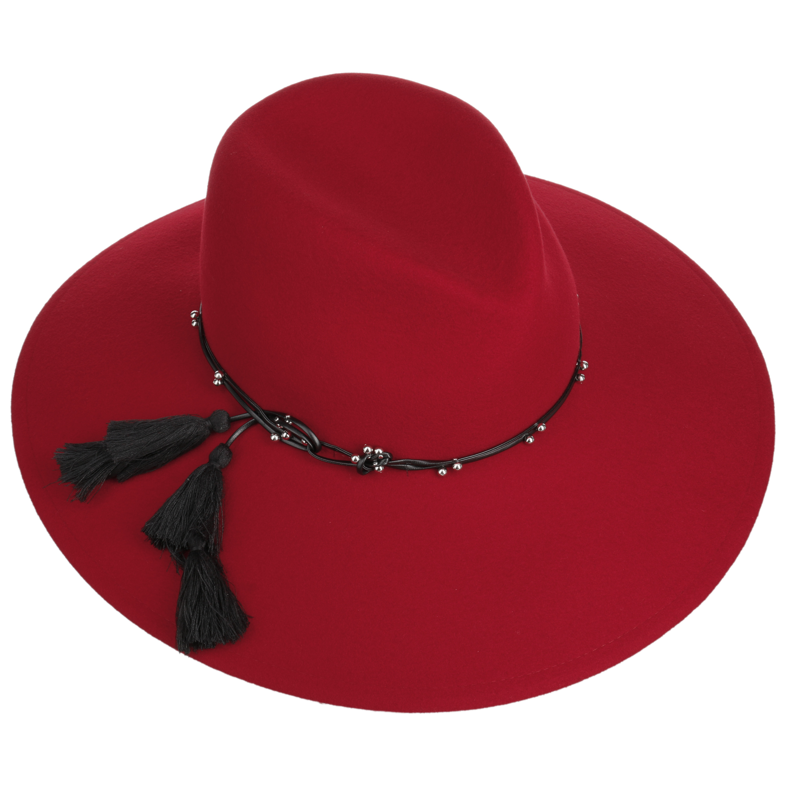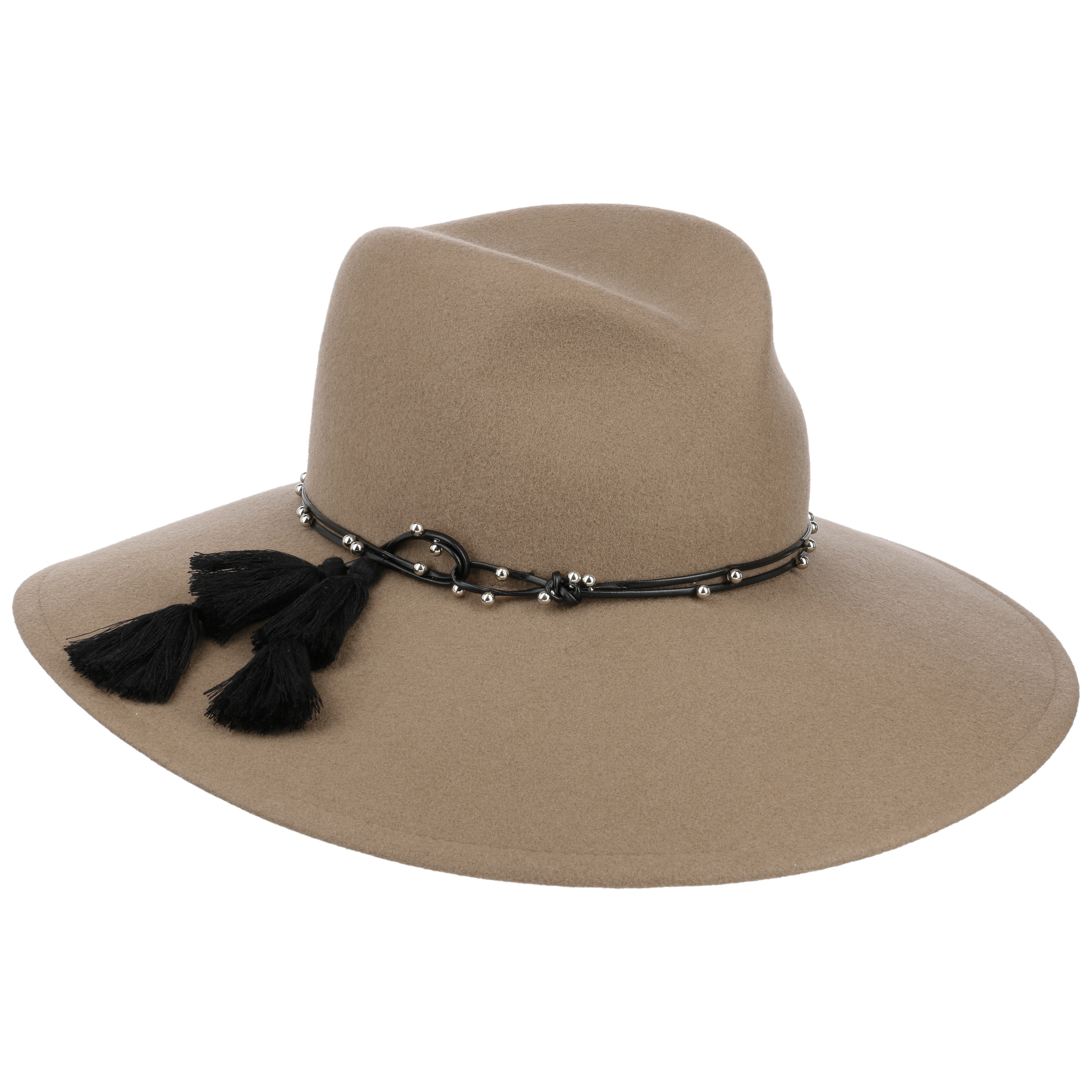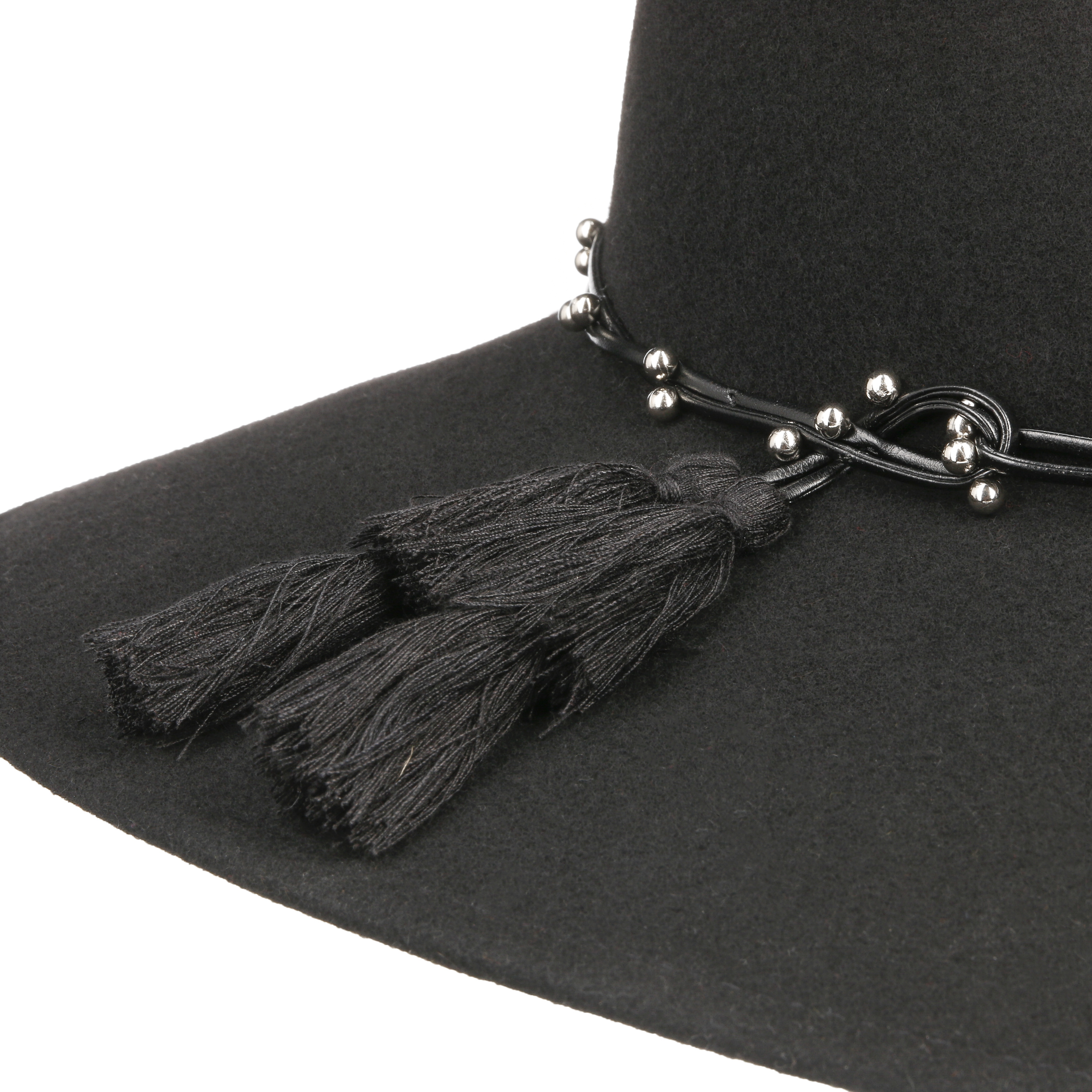 This monochrome hat from Mayser has been made by hand from 100% wool. Its characteristic shape with a wide brim makes it a real eyecatcher. The integrated stretch lining band ensures the perfect fit. An artistically draped leather effect trim band with lots of small decorative beads and two large tassels adorns the flexible travel hat.