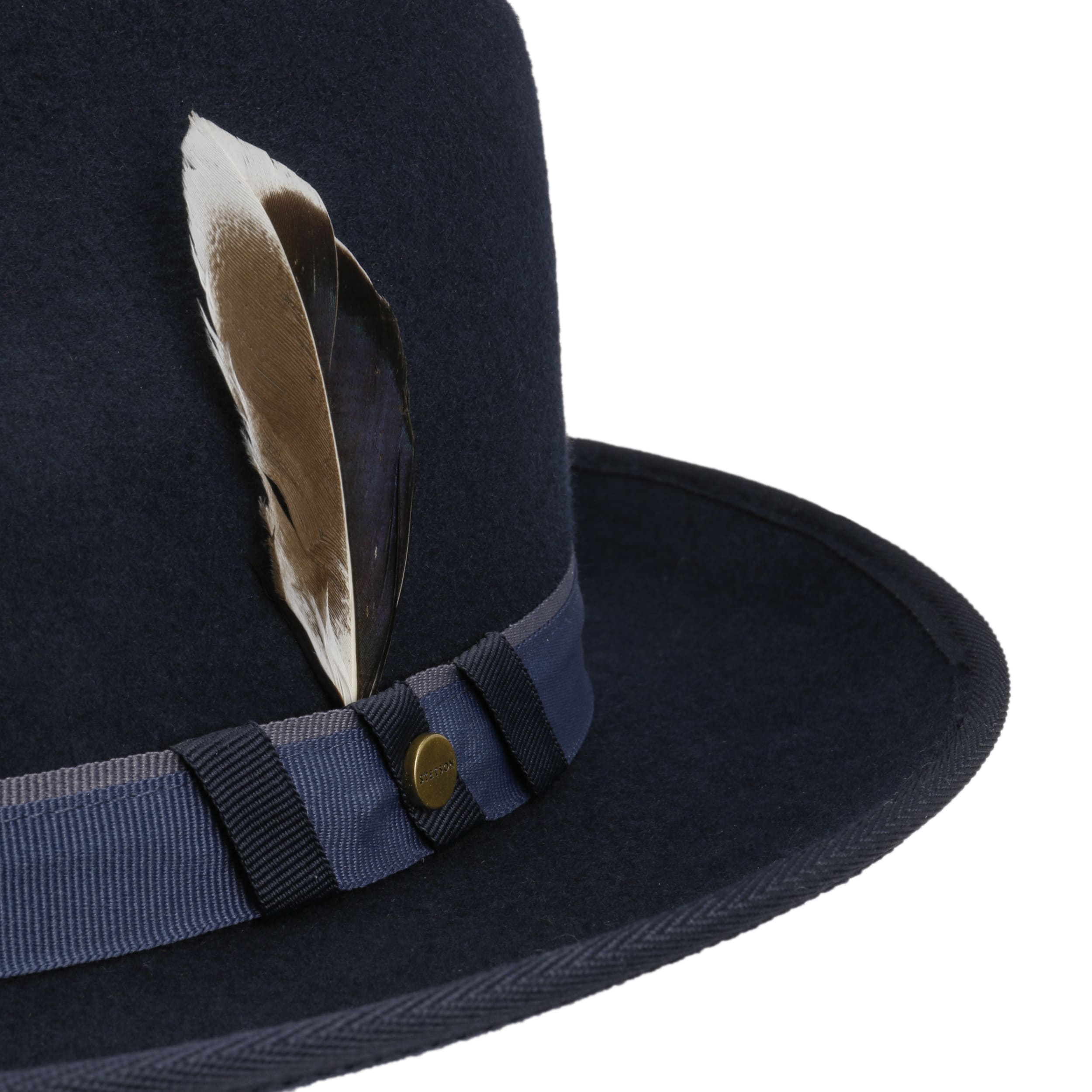 The Bogart hat combines classic lines with modern sophistication. The distinctive silhouette, rounded brim and multicoloured grosgrain ribbon give the legendary Stetson design an individual touch. Pure wool felt with Asahi Guard® ensures a fine feel, water-repellent function and a comfortable fit – ideal for everyday wear and special moments. A soft cotton lining band nestles comfortably against the head, while the decorative feather stylishly rounds off the overall look.