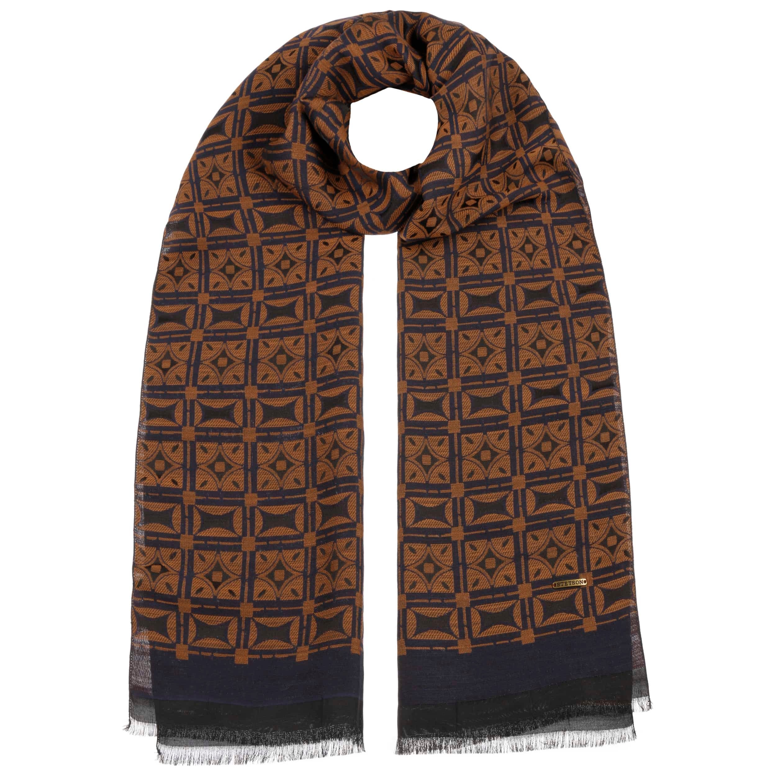 Since 1865, the name of John B. Stetson has been a synonym for best quality cowboy and Western hats. With the increasingly popular VitaFelt and VitaStraw collections, the U.S. brand has become pioneer of lightweight, water repellent and packable headwear. In the meantime, Stetson manufactures a wide range of first-class styles: army and baseball caps, flat hats, docker caps, beanies, trilbies and cowboy hats in many different designs.- Jaquard Geometrics Cotton Scarf by Stetson - navy-brown 1