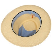 A trimming band in black elegant denim adorns the classic woven straw panama hat by Stetson. The fine and silky soft toquilla straw comes from the renowned Montecristi custom hat works company and combines factor 40 sun protection and airy lightness in an original style Bogart works hat.