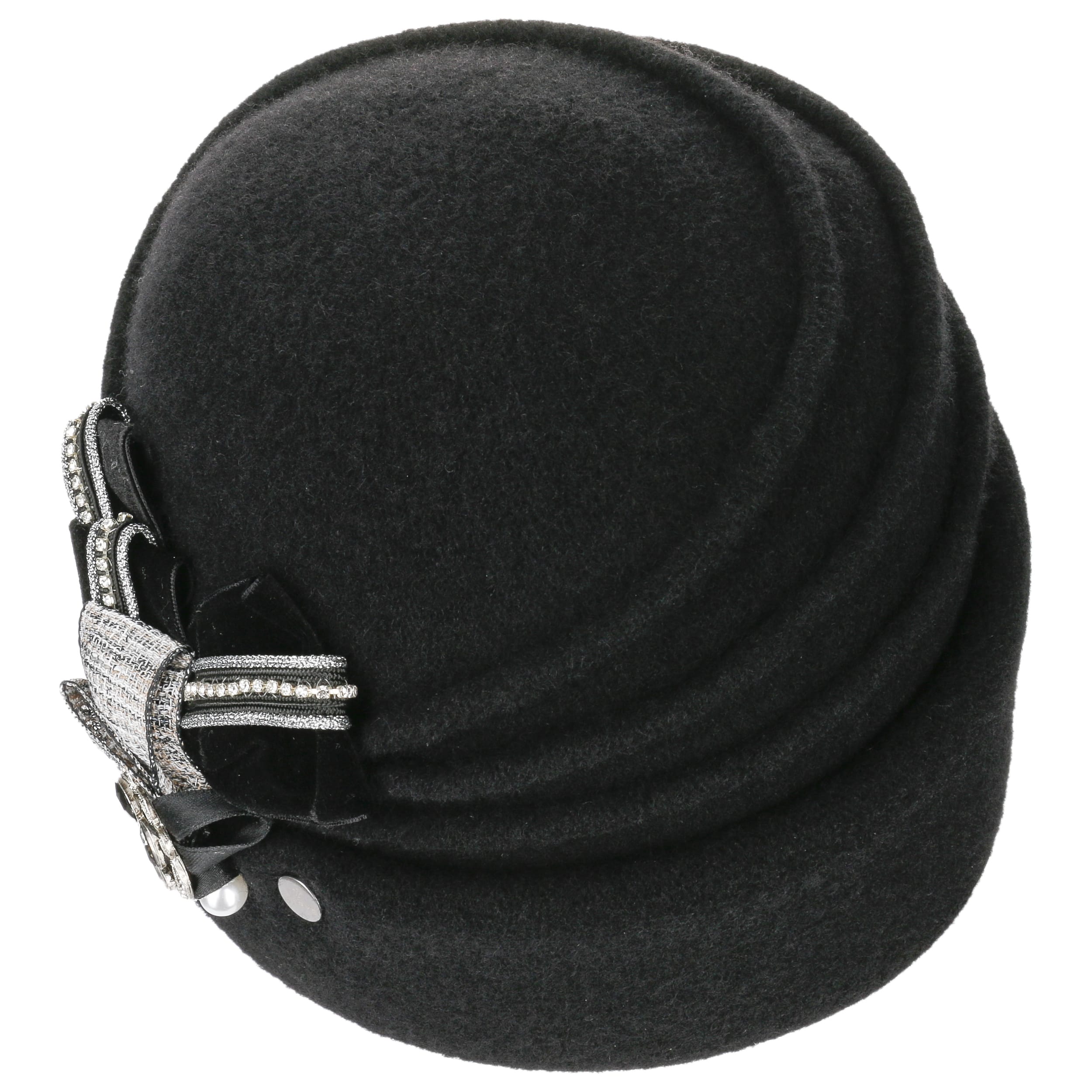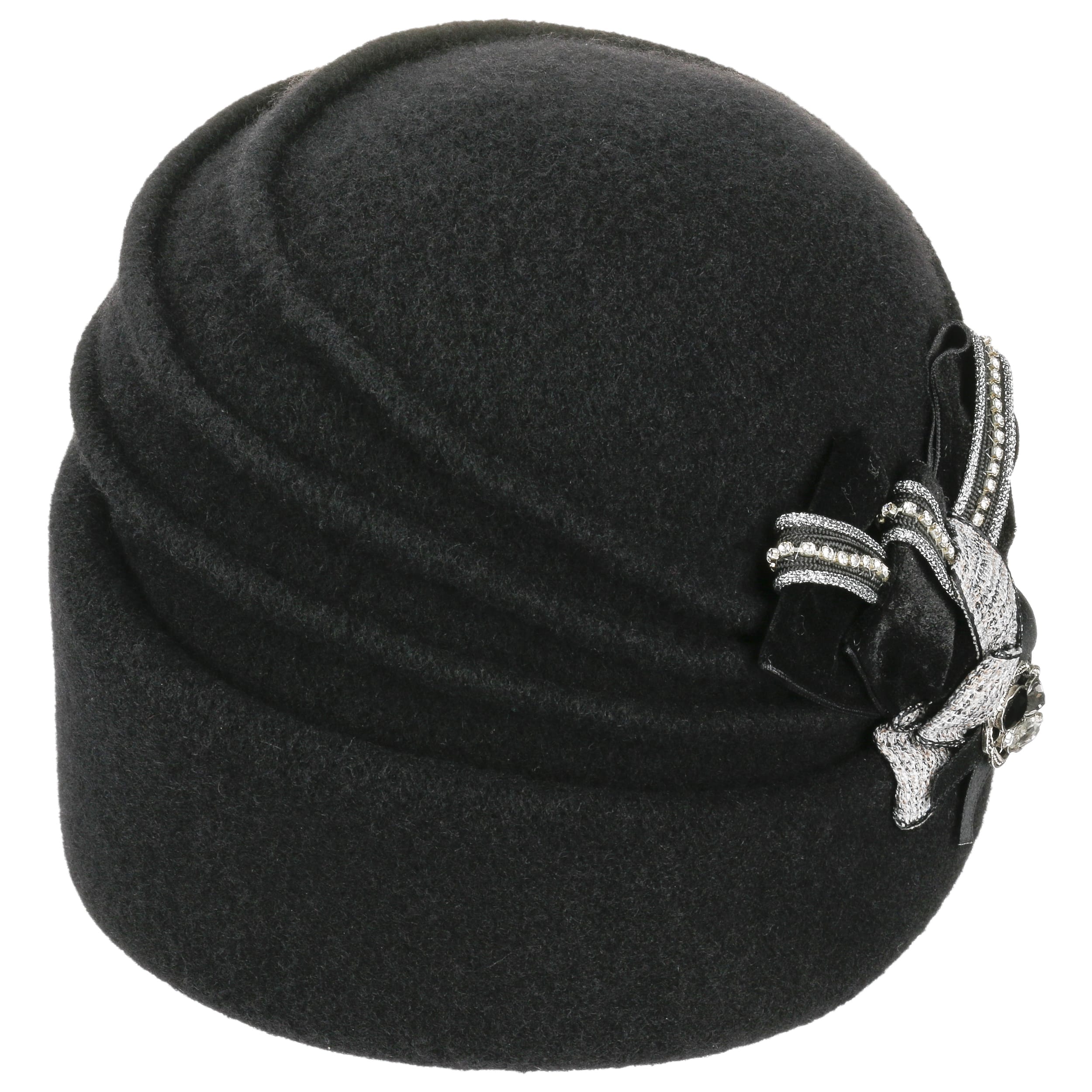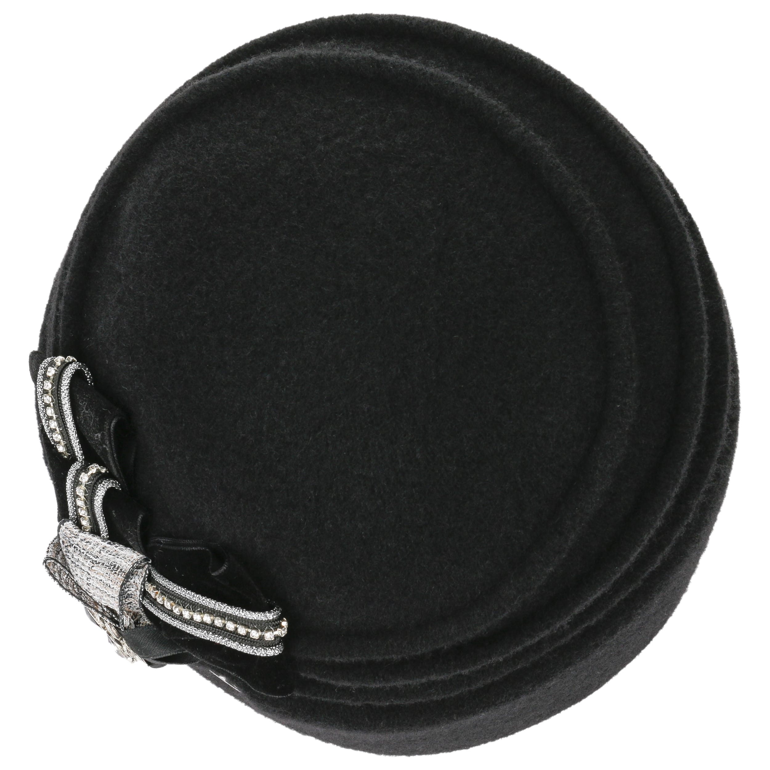 This high-quality toque is made by hand with great attention to detail. The finely shaped pleats and the diagonal turn-up give it a touch of elegance. The eye-catching feature is the intricately draped bow on the side, which is decorated with sparkling gemstones and other glittering elements. Hand wash is recommended to clean dust and light soiling.
