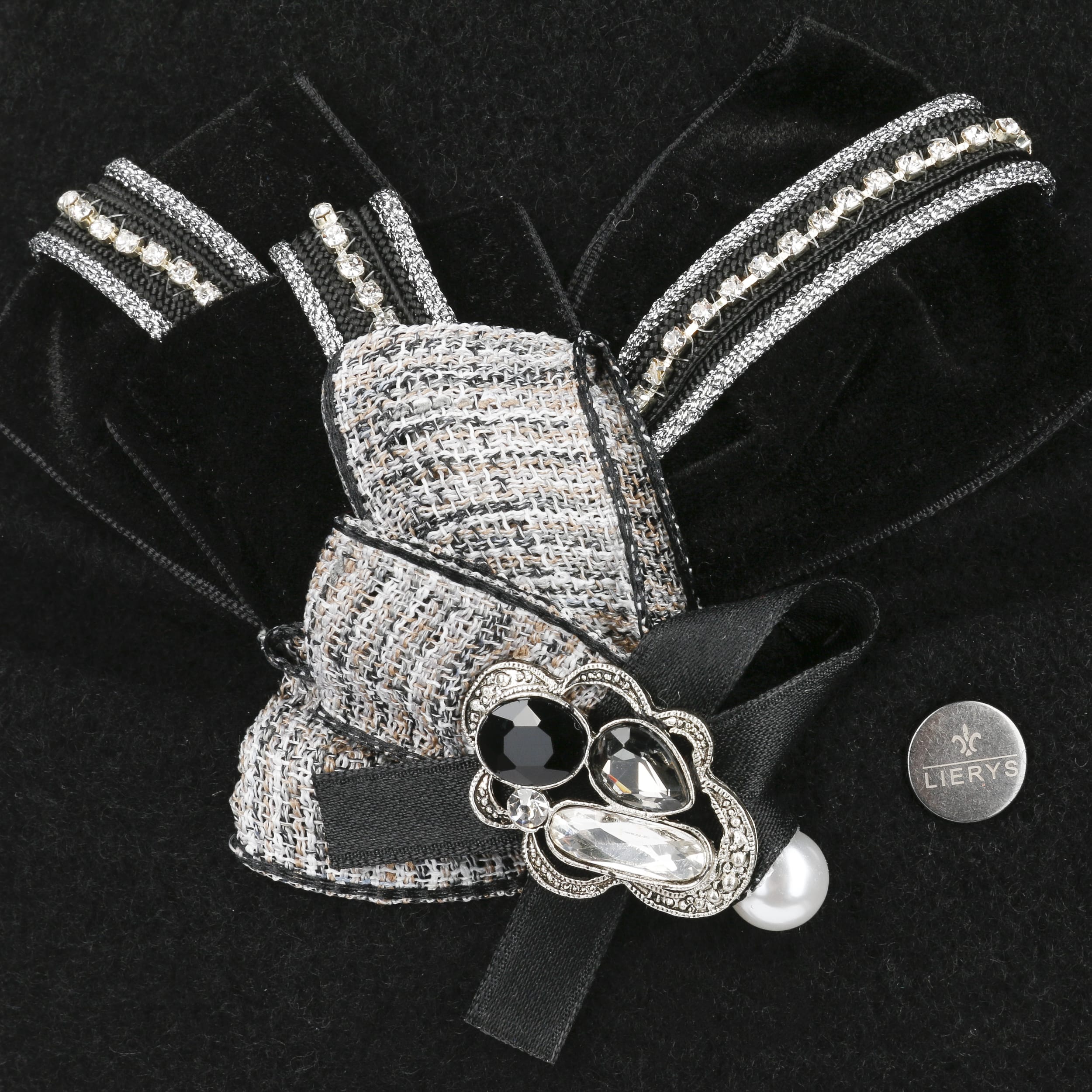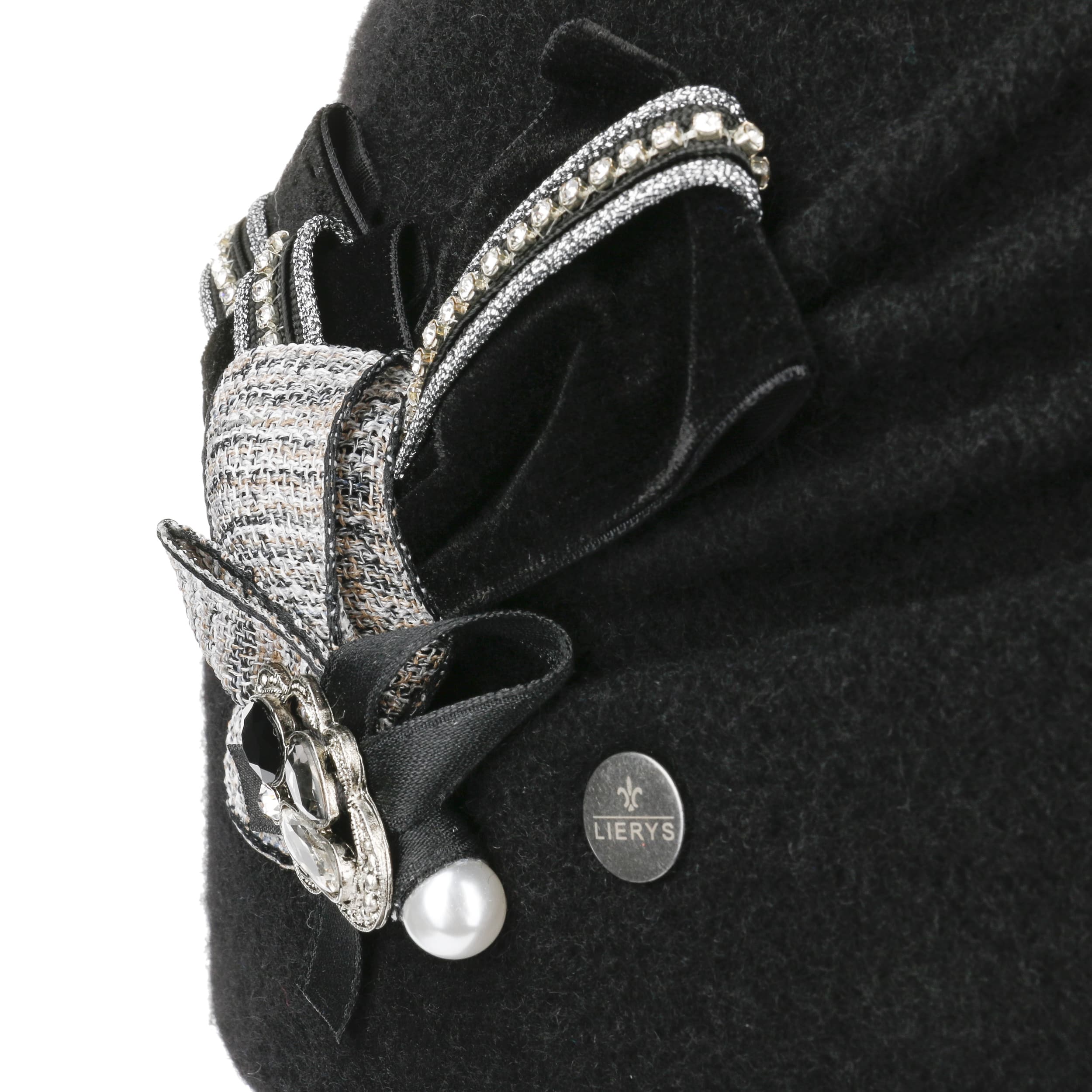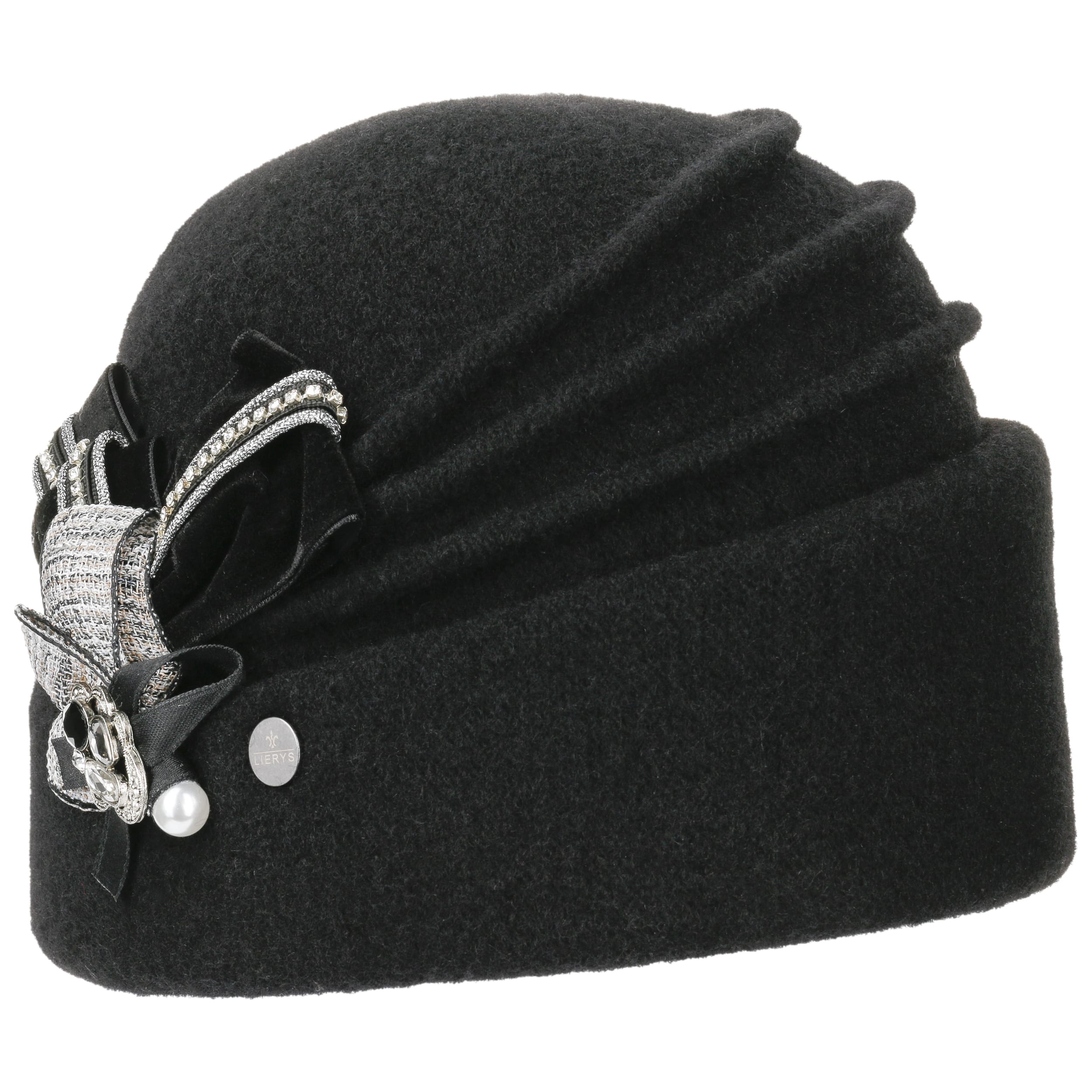 This high-quality toque is made by hand with great attention to detail. The finely shaped pleats and the diagonal turn-up give it a touch of elegance. The eye-catching feature is the intricately draped bow on the side, which is decorated with sparkling gemstones and other glittering elements. Hand wash is recommended to clean dust and light soiling.