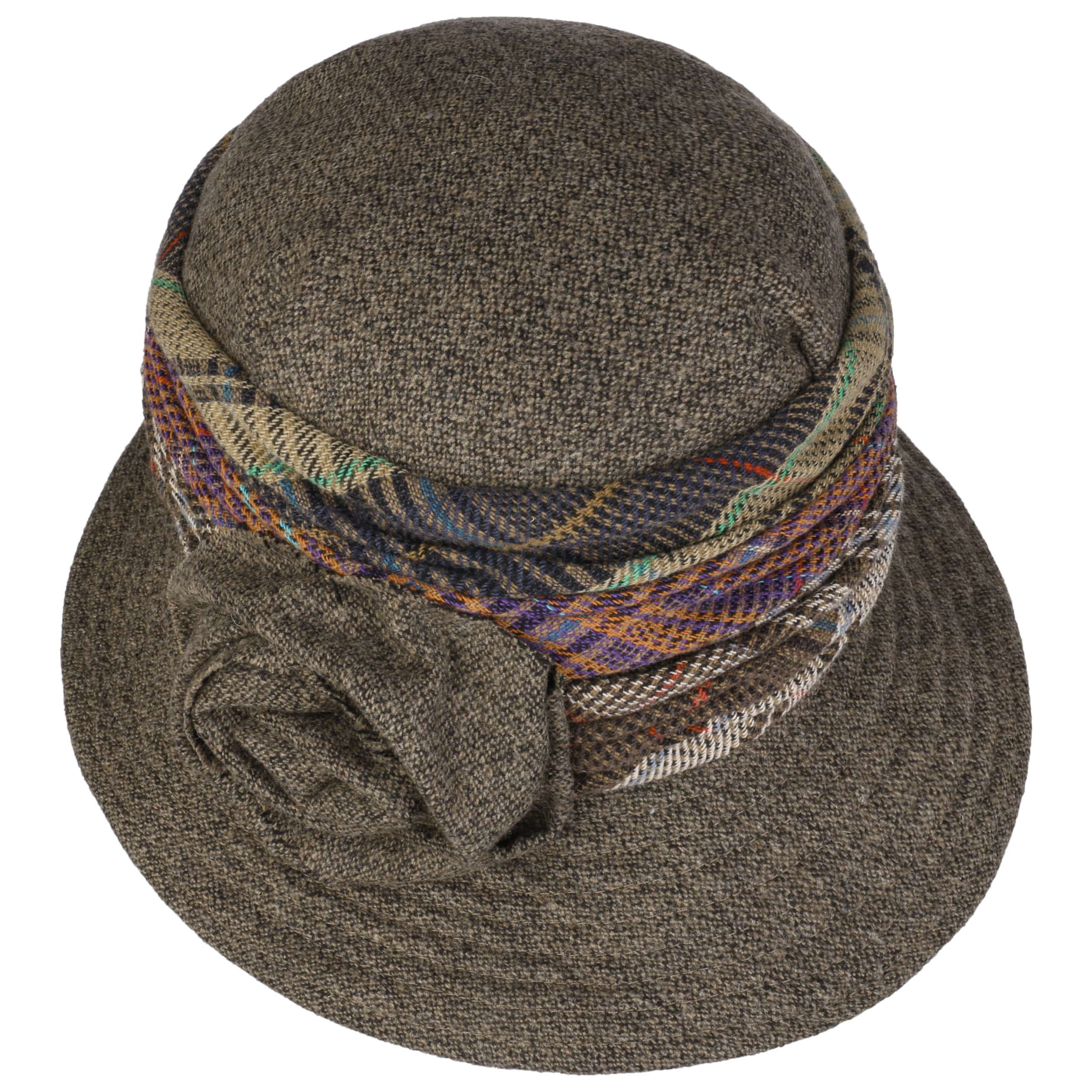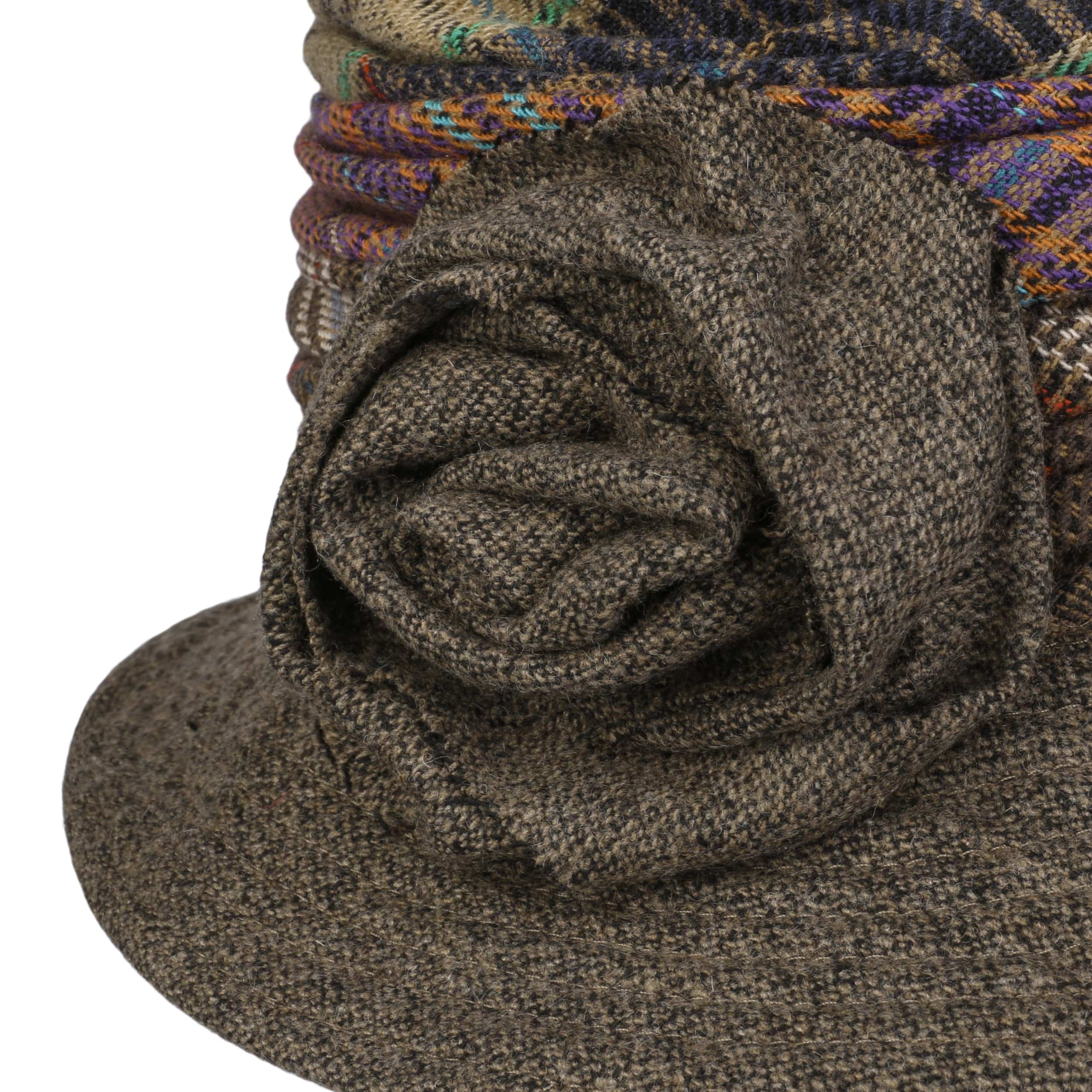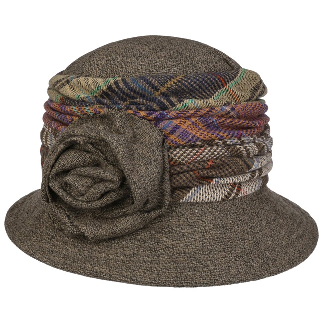 The designers at GREVI have let their imaginations run wild with this cloche. The result is an extraordinary ladies’ hat with a variety of embellishments. The trim band in various colours and patterns is carefully laid by hand in several layers around the crown. An intricately designed flower on the side completes the look.