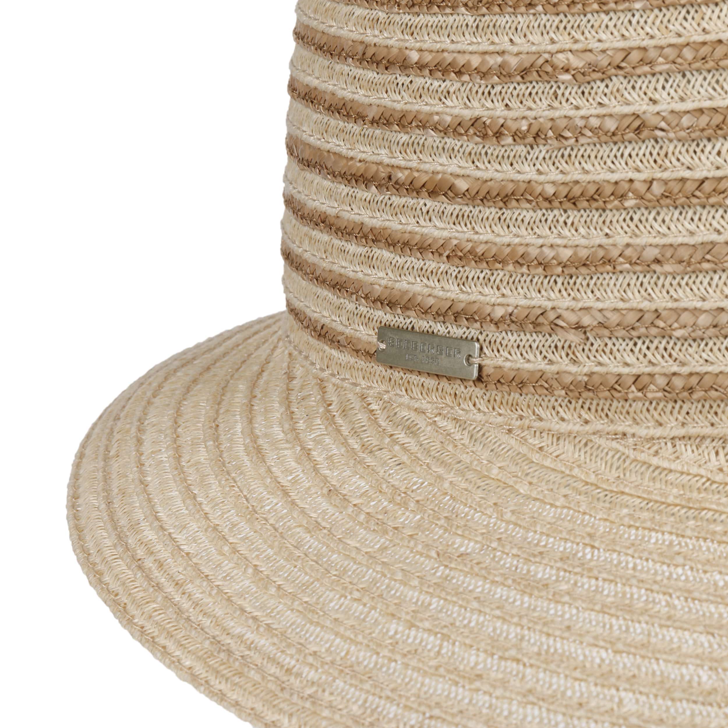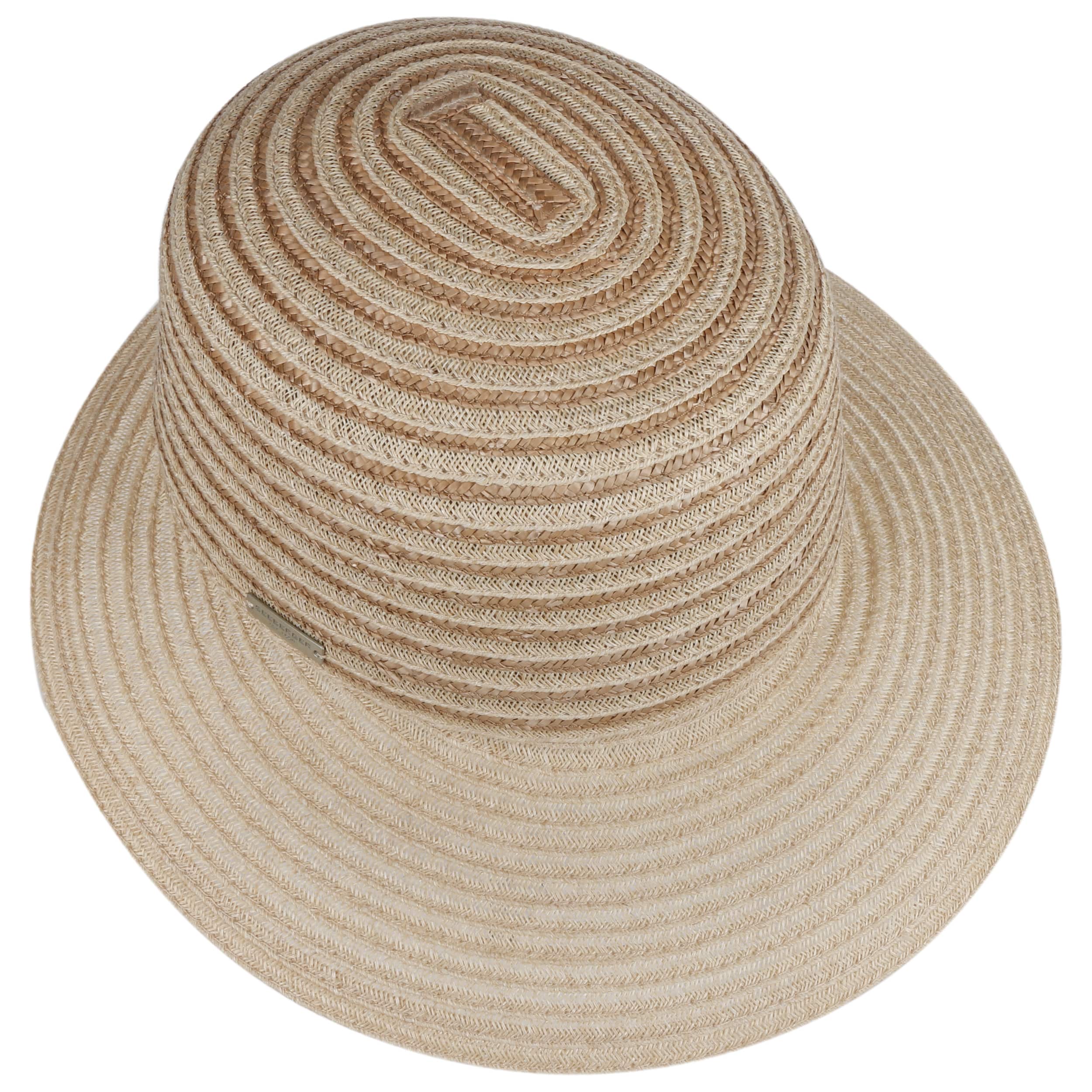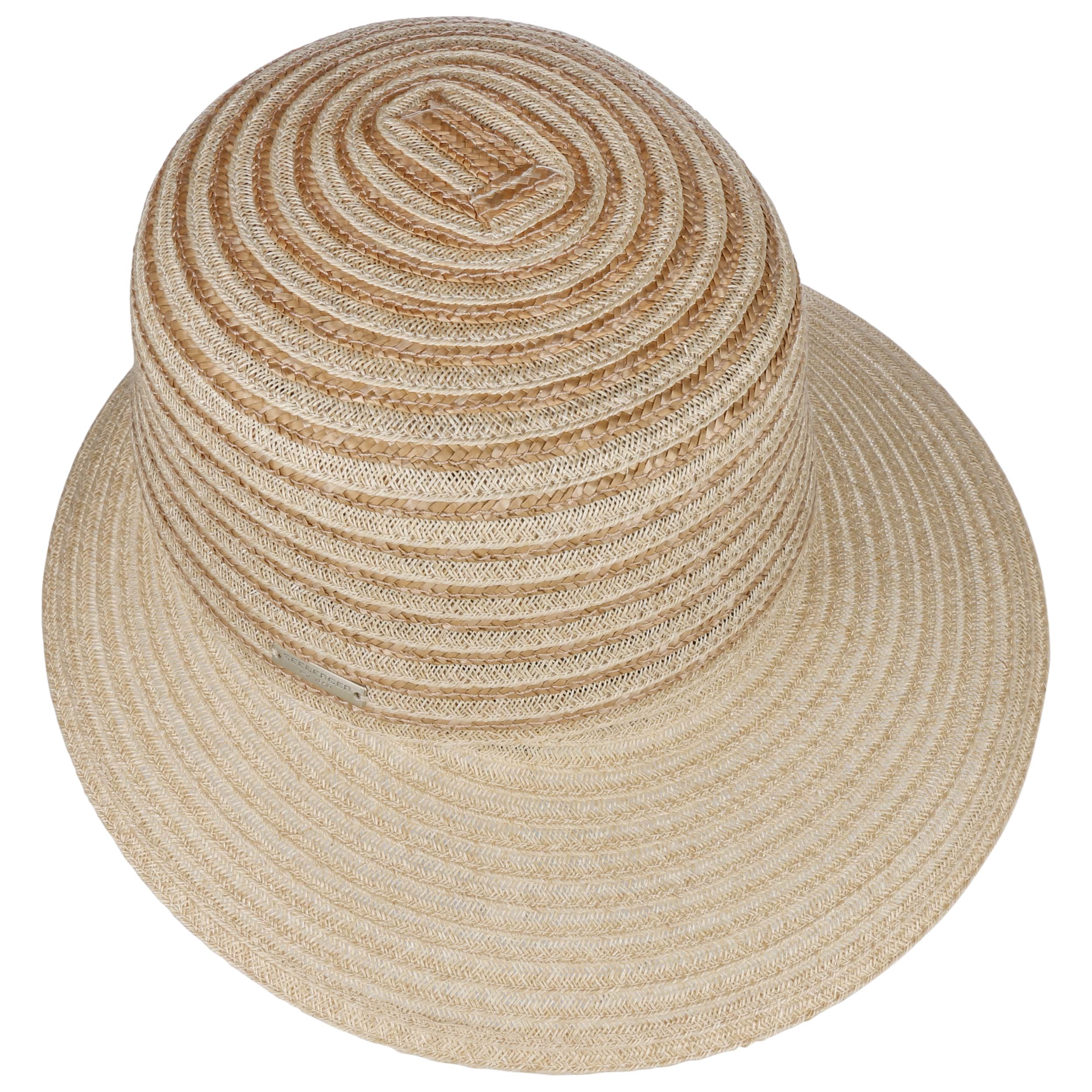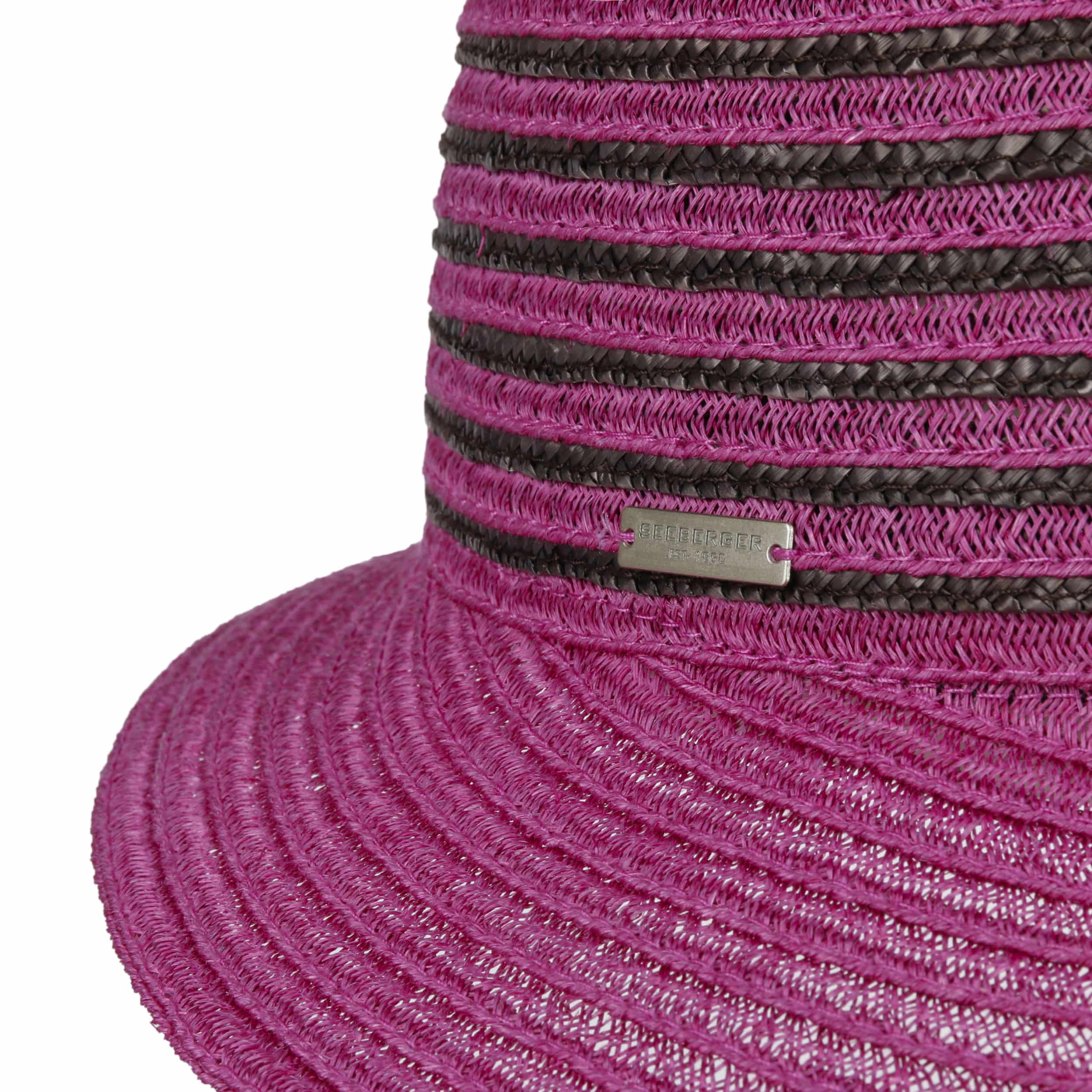 Different coloured braids made from 100% straw make the striped poke bonnet from Seeberger a fashionable eye-catcher. The elegant shape and maritime design exude summery lightness. An integrated stretch lining band ensures an optimal fit of the air-permeable headwear. This elegant straw hat with a wide plain-coloured brim is ideal for carefree holidays. It protects you from the sun and wind, and rounds off feminine casual outfits.
