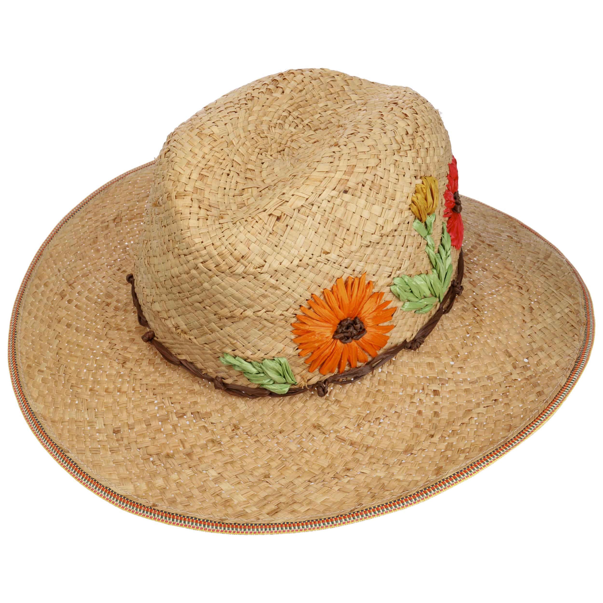 This feminine traveller’s hat from GREVI impresses with its beautiful shape in light and airy raffia straw. The decorative floral decoration makes the sunhat stylishly distinctive for a walk in the park or an afternoon in the garden. Handmade in Italy, it impresses with its high quality, pleasing comfort and wide brim that provides pleasant shade.