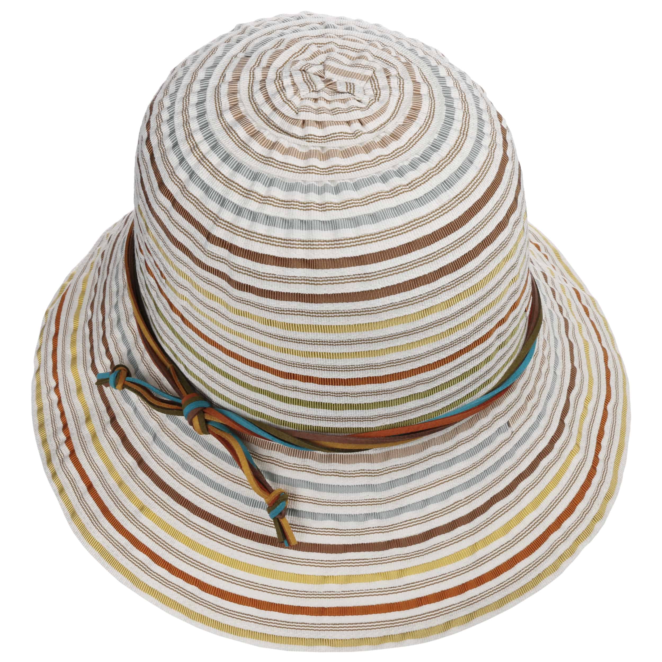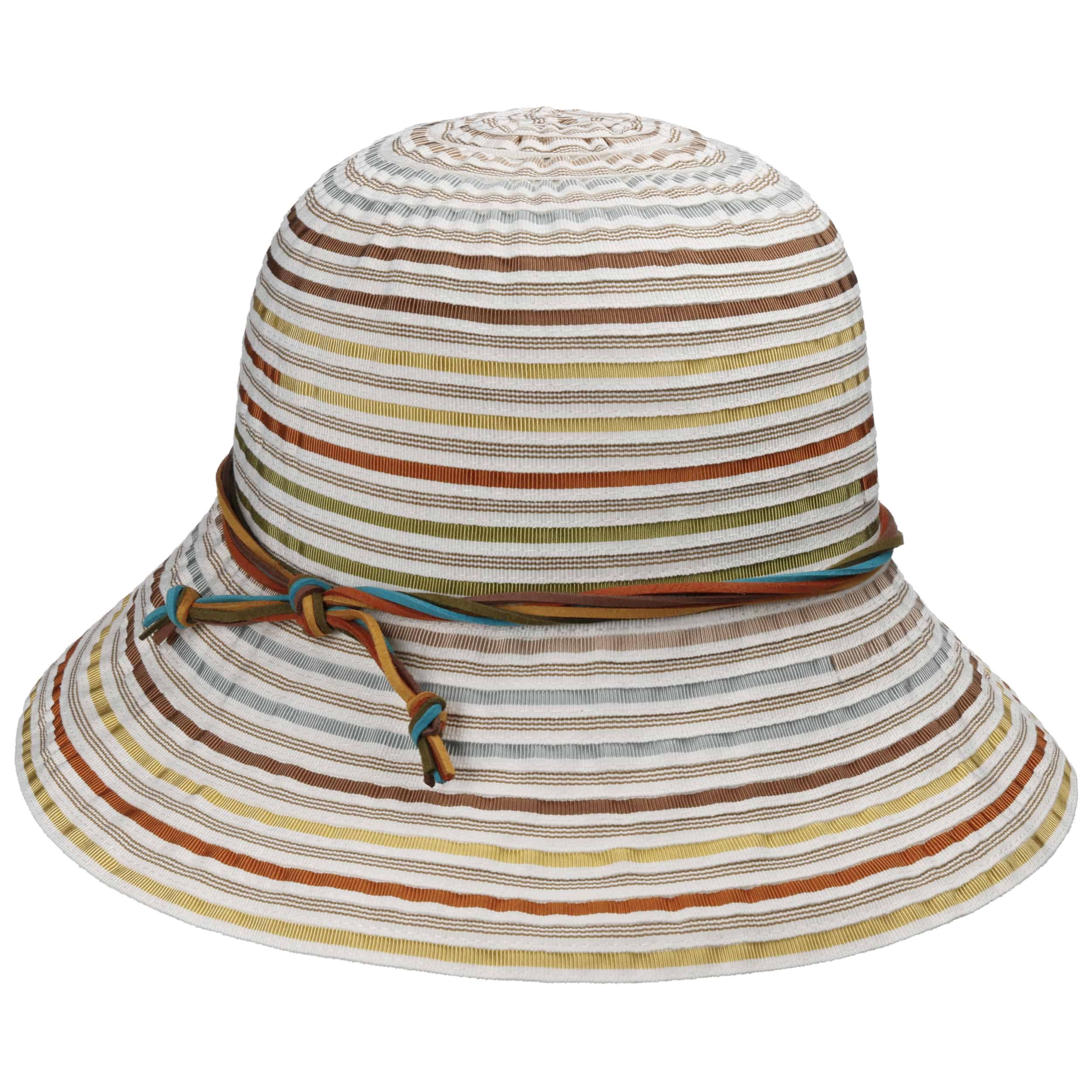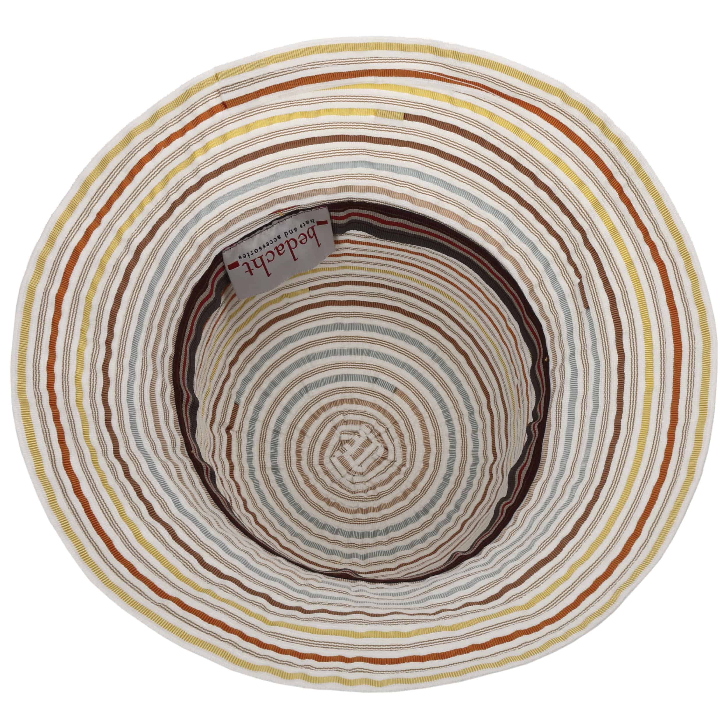 This hat from bedacht has colourful stripes. Nevertheless, the harmonious colour combination makes it unobtrusive, so that it can be combined well with many outfits. The wide-brimmed cloche is made from a soft blended fabric and feels comfortable on the head, thanks to its cotton content and a little viscose. The twisted trim band consists of several narrow imitation leather straps.