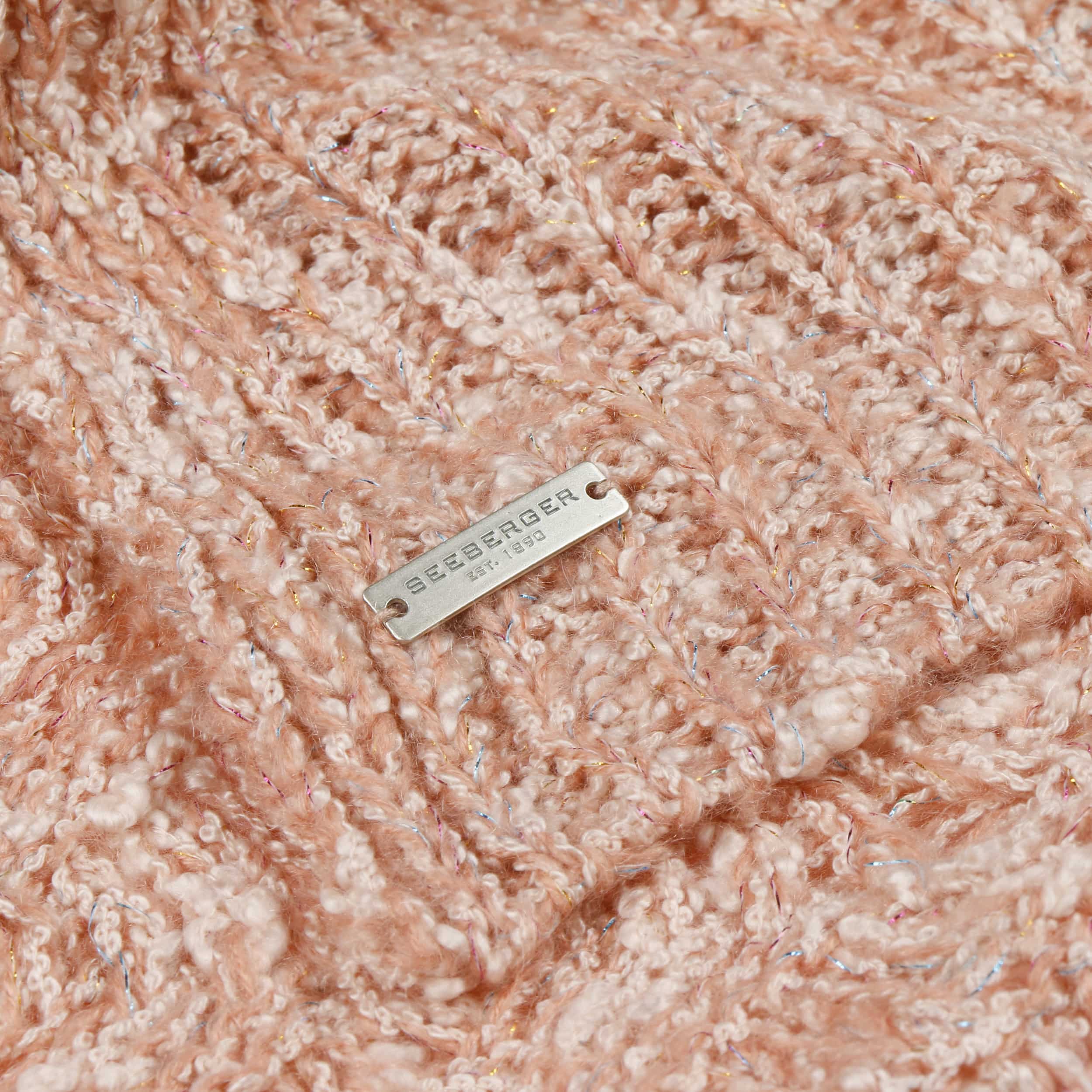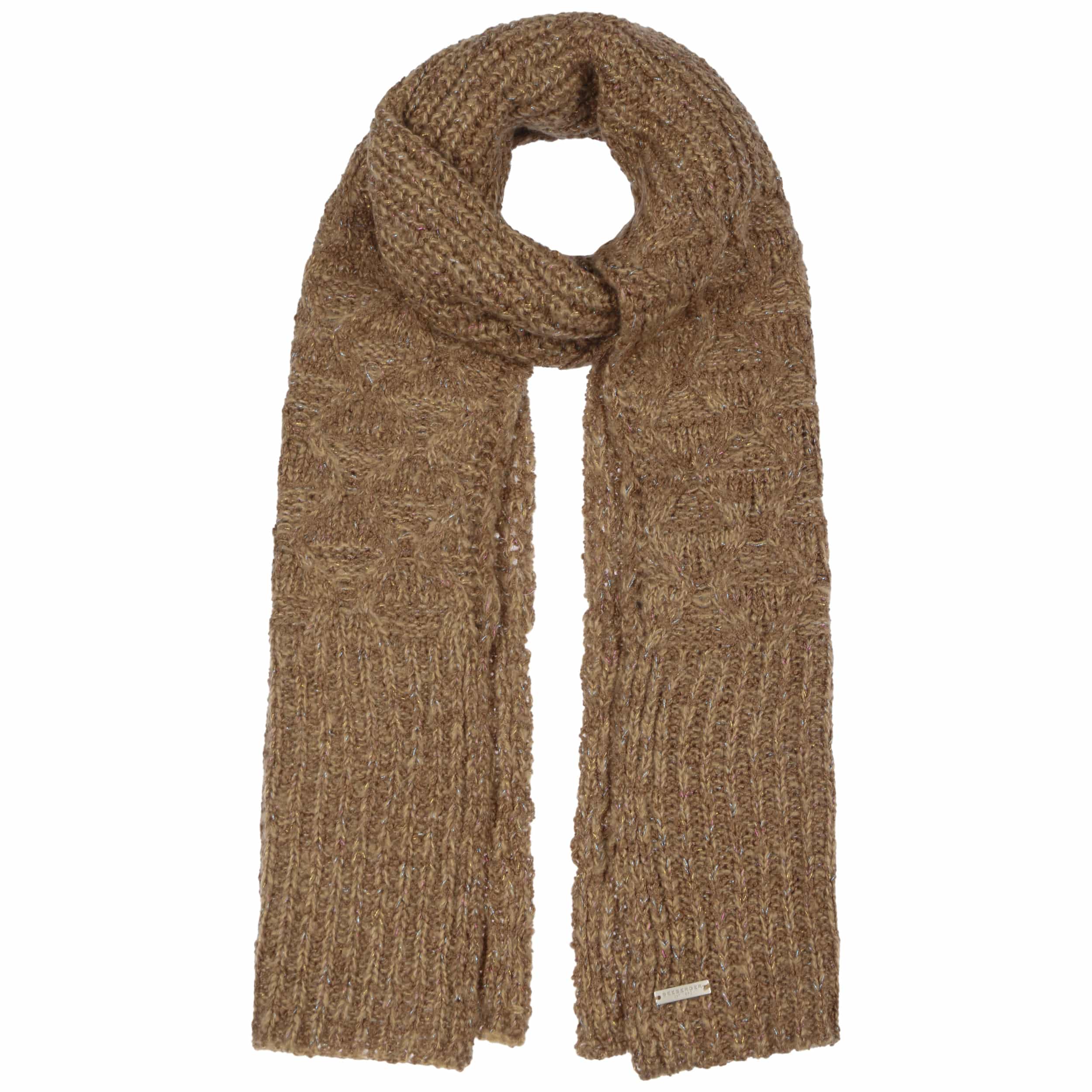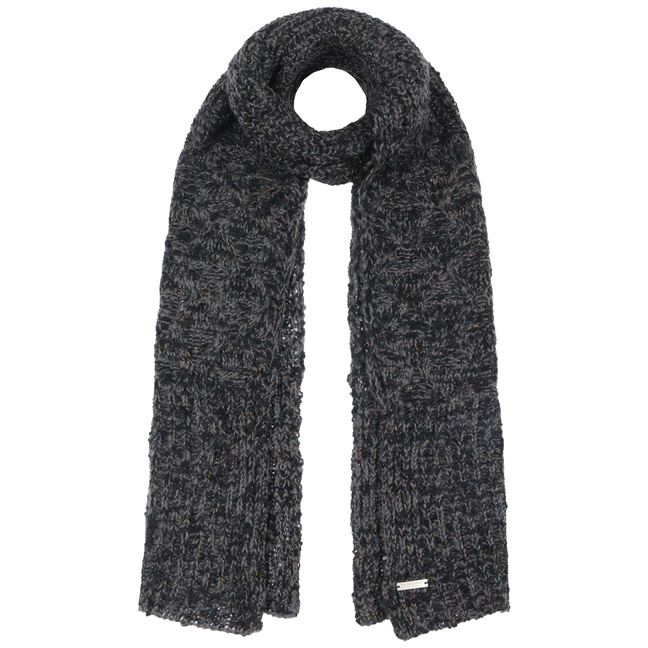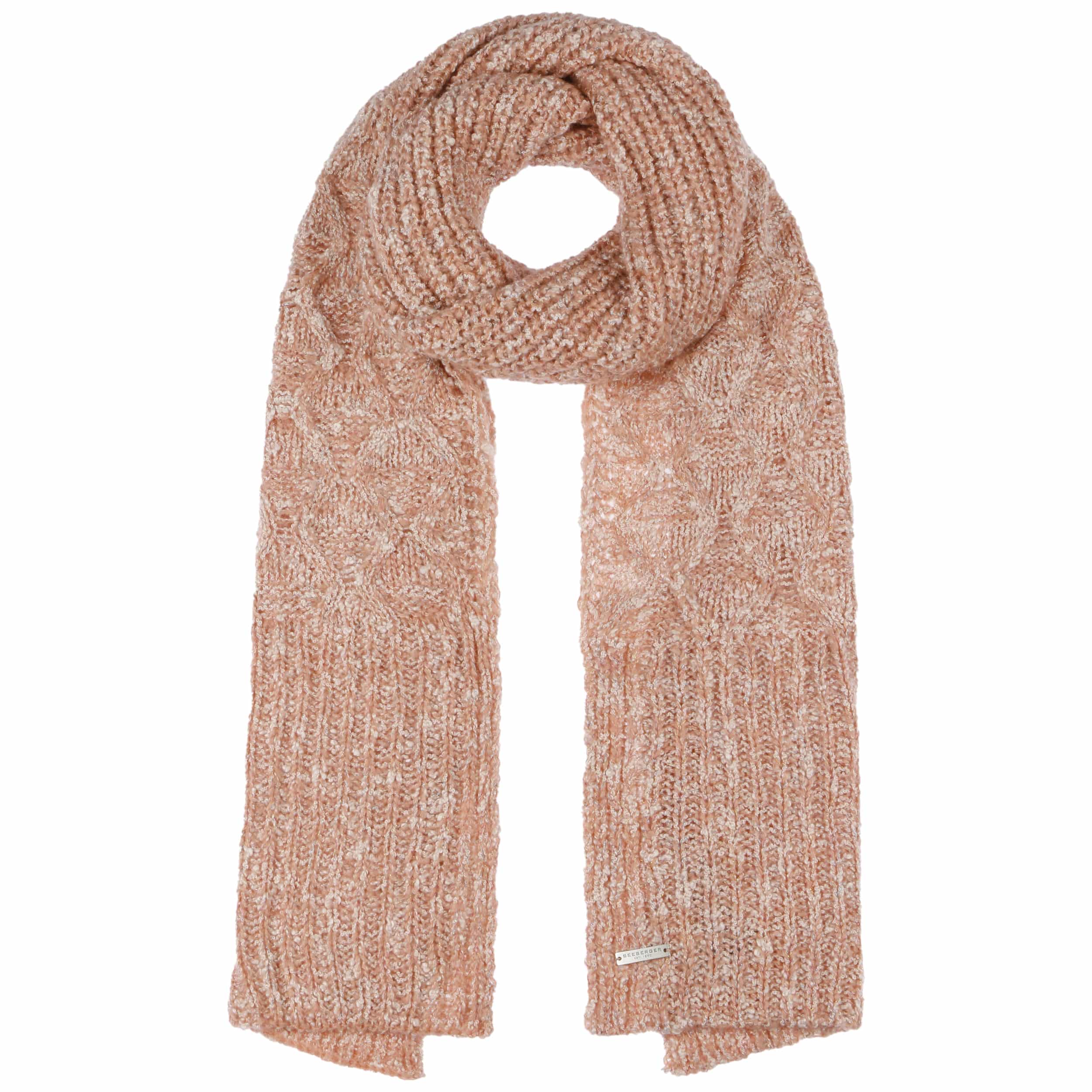 Cosy knit with textured patterns are shaped into this women’s scarf from Seeberger. The plain-coloured appearance is permeated by countless glittering dots that glisten like tiny ice crystals in the winter sun, effortlessly making the knitted scarf an eye-catching accessory. From autumn into the new year, it cosily snuggles against your neck, giving protection from the biting wind.