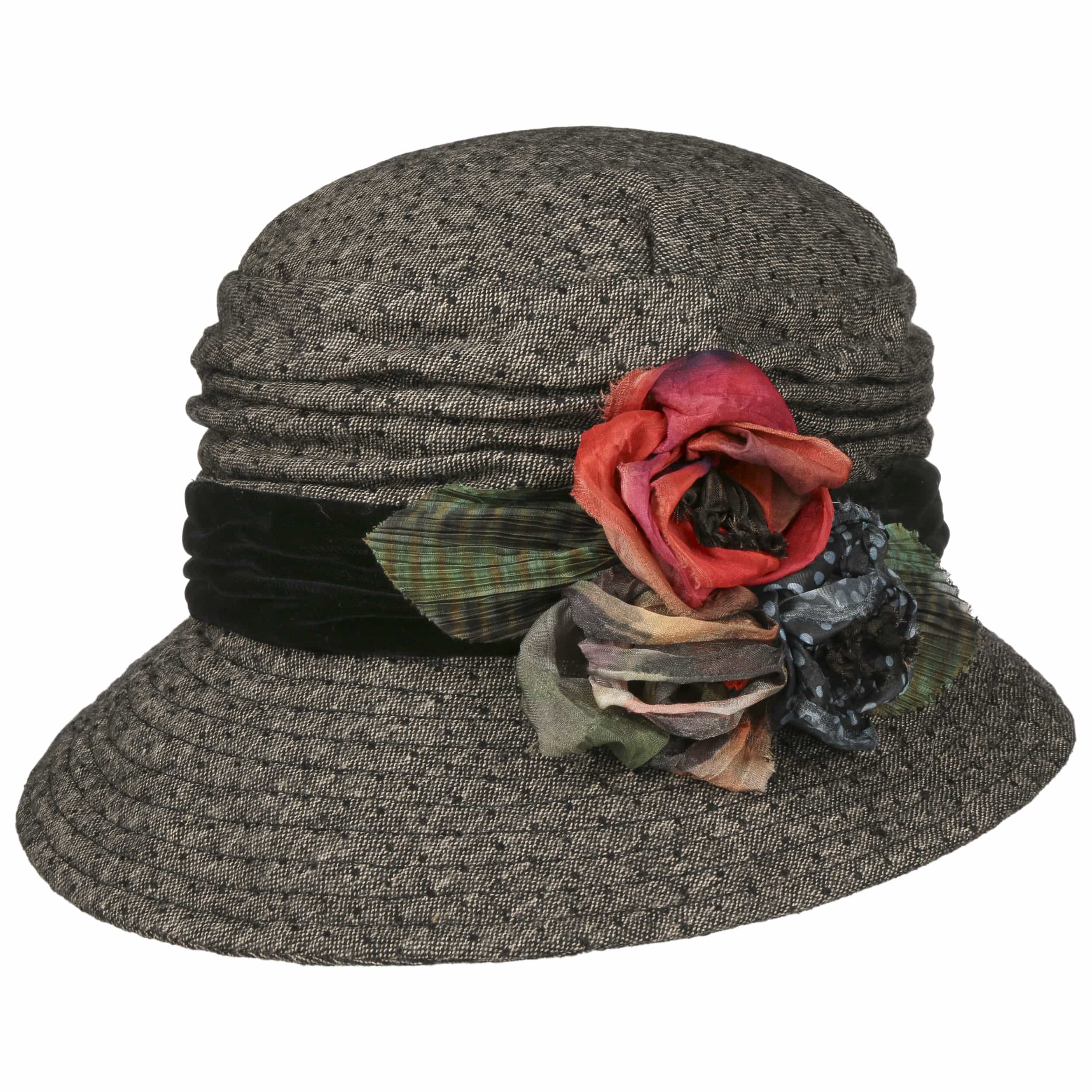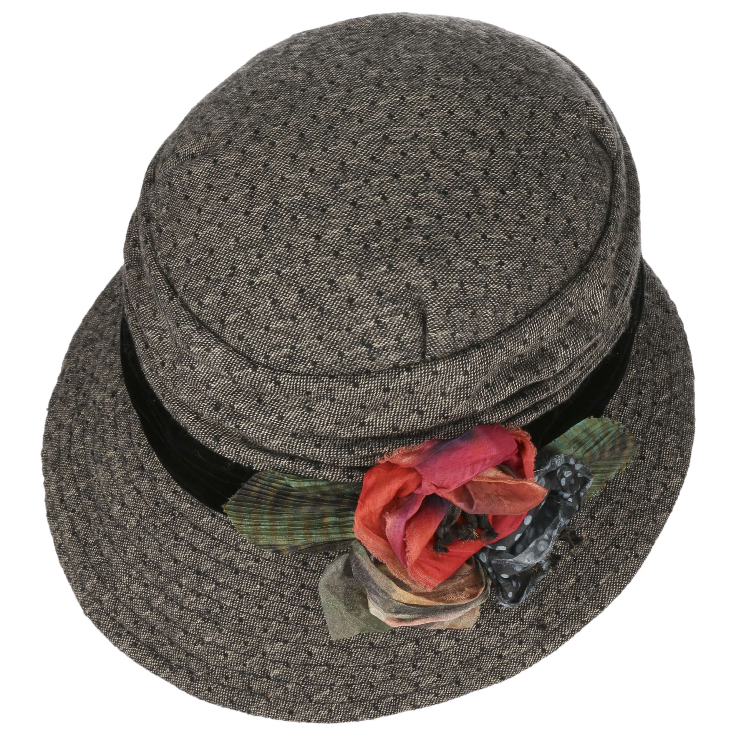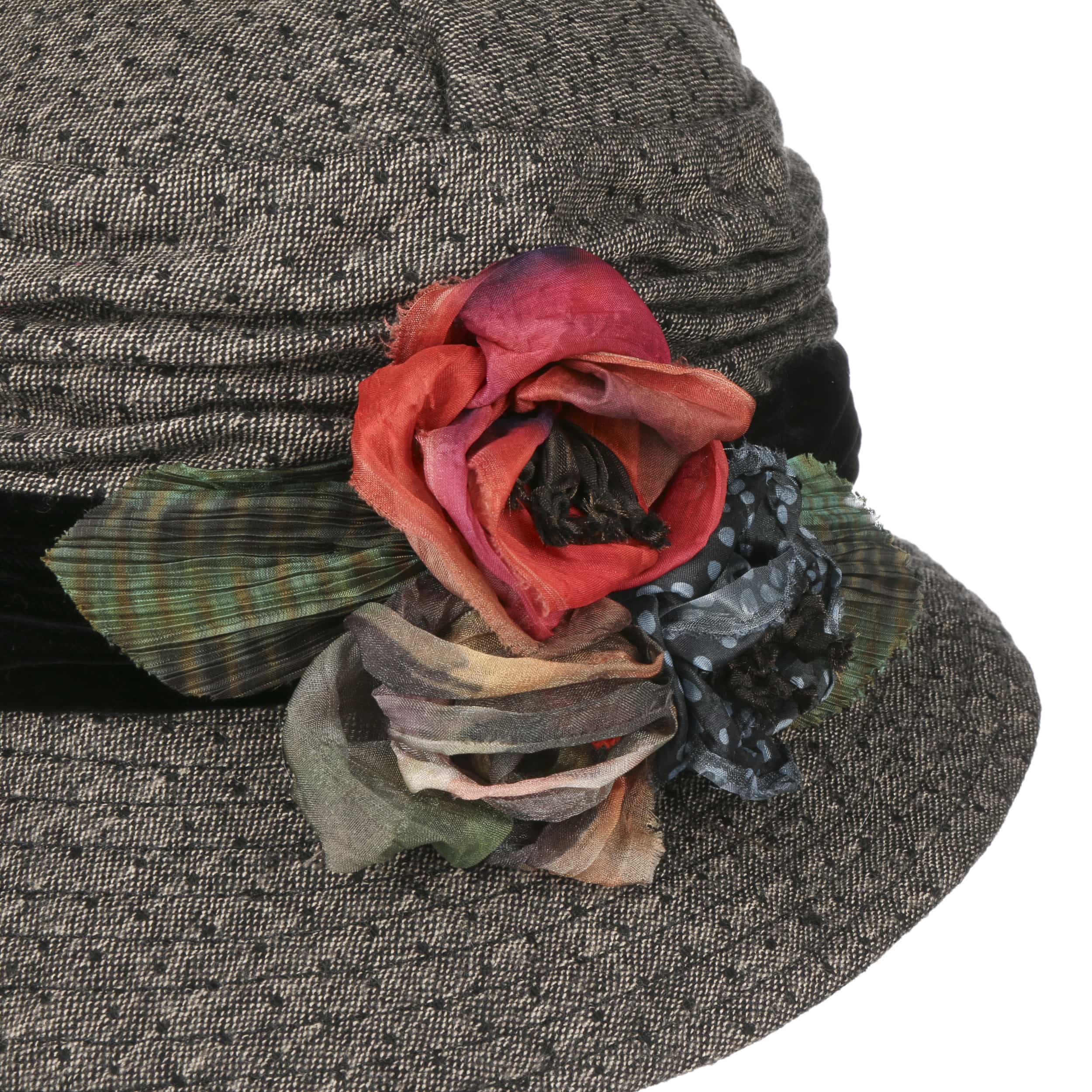 The fabric hat from GREVI, made in Italy, features a beautifully mottled pattern on a solid-coloured base, with a gracefully sloping brim. The addition of wool and elastic processing completes its comfort for a cosy wearing experience. Visually, the solid-coloured trim enhances the tasteful appearance, while the side floral decoration with contrasting patterned ribbons adds a touch of floral allure to the accessory.