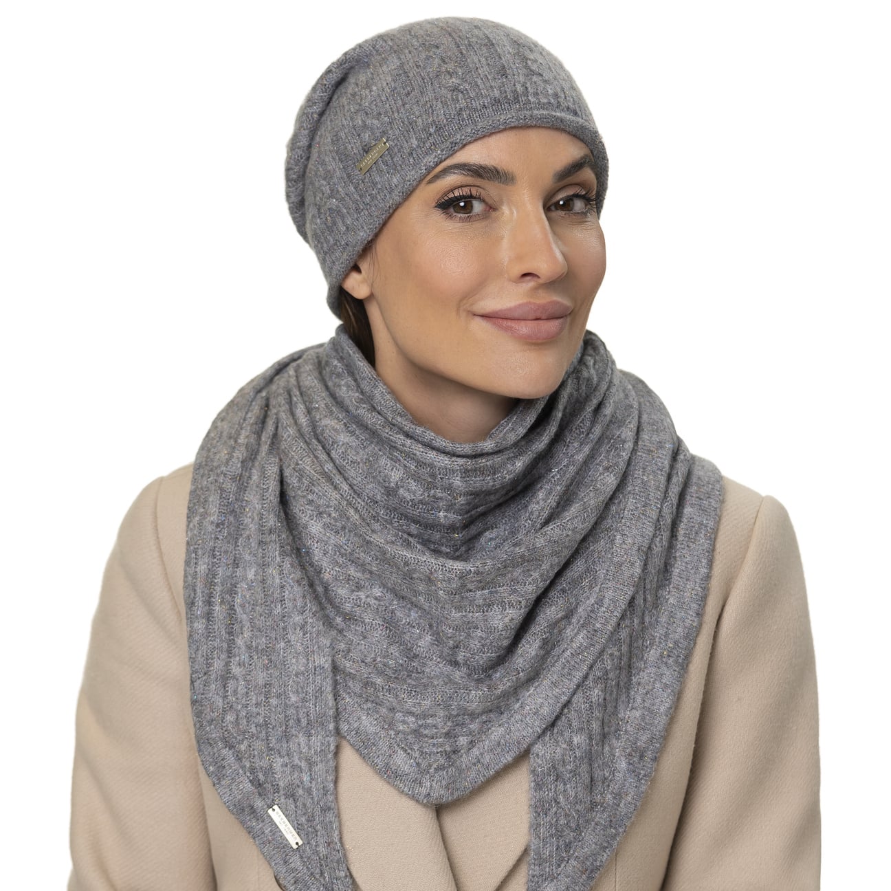 The family-owned entreprise from Allgaeu established in 1890 is known for stylish and timeless women's headwear. Using sophisticated fabrics pleasant to wear, Seeberger stands for very feminine, eye-catching women's hats: winter caps, cloth hats as well as different types of baker boy hats, broadbrimmed hats and berets.- Mevoja Triangular Scarf by Seeberger - grey 1