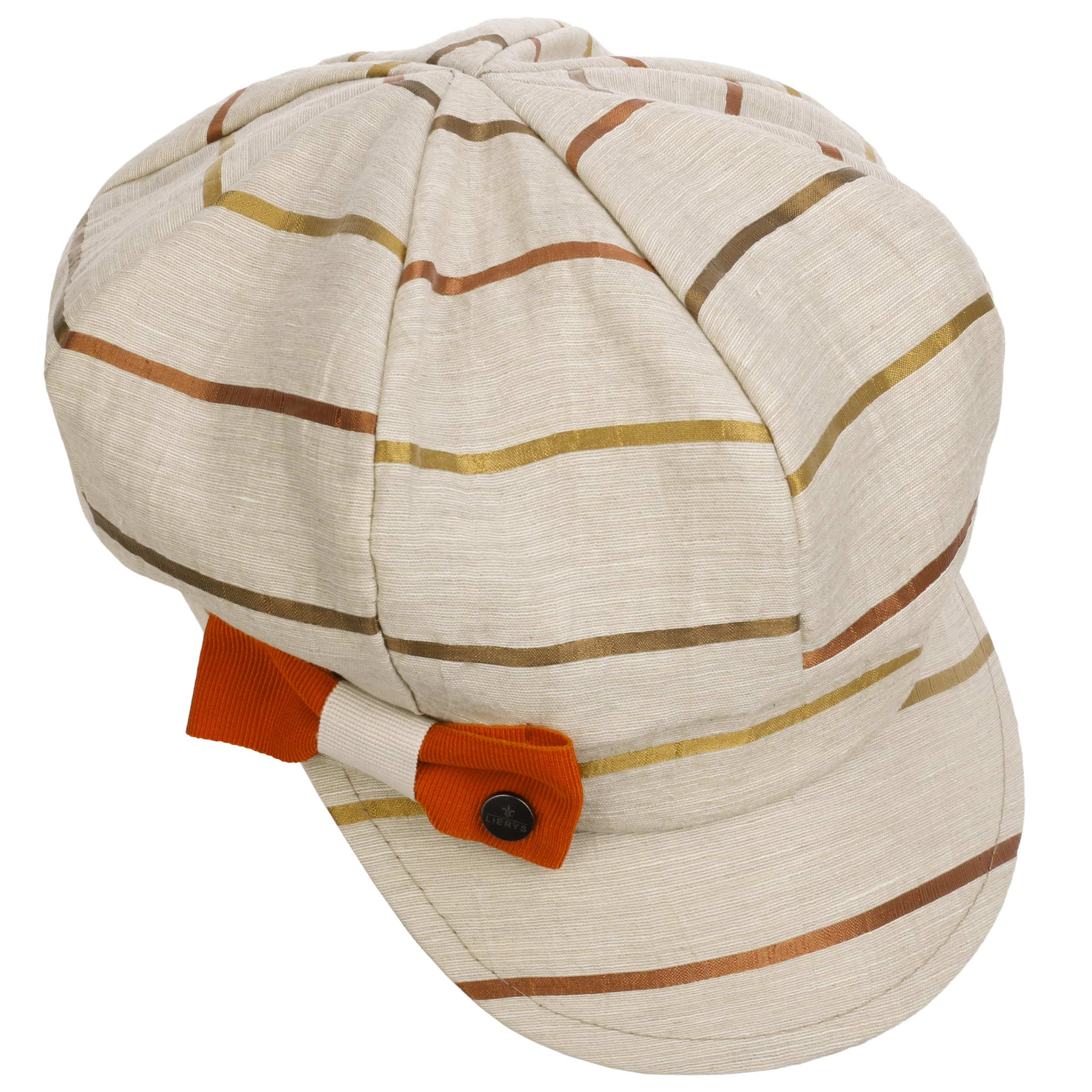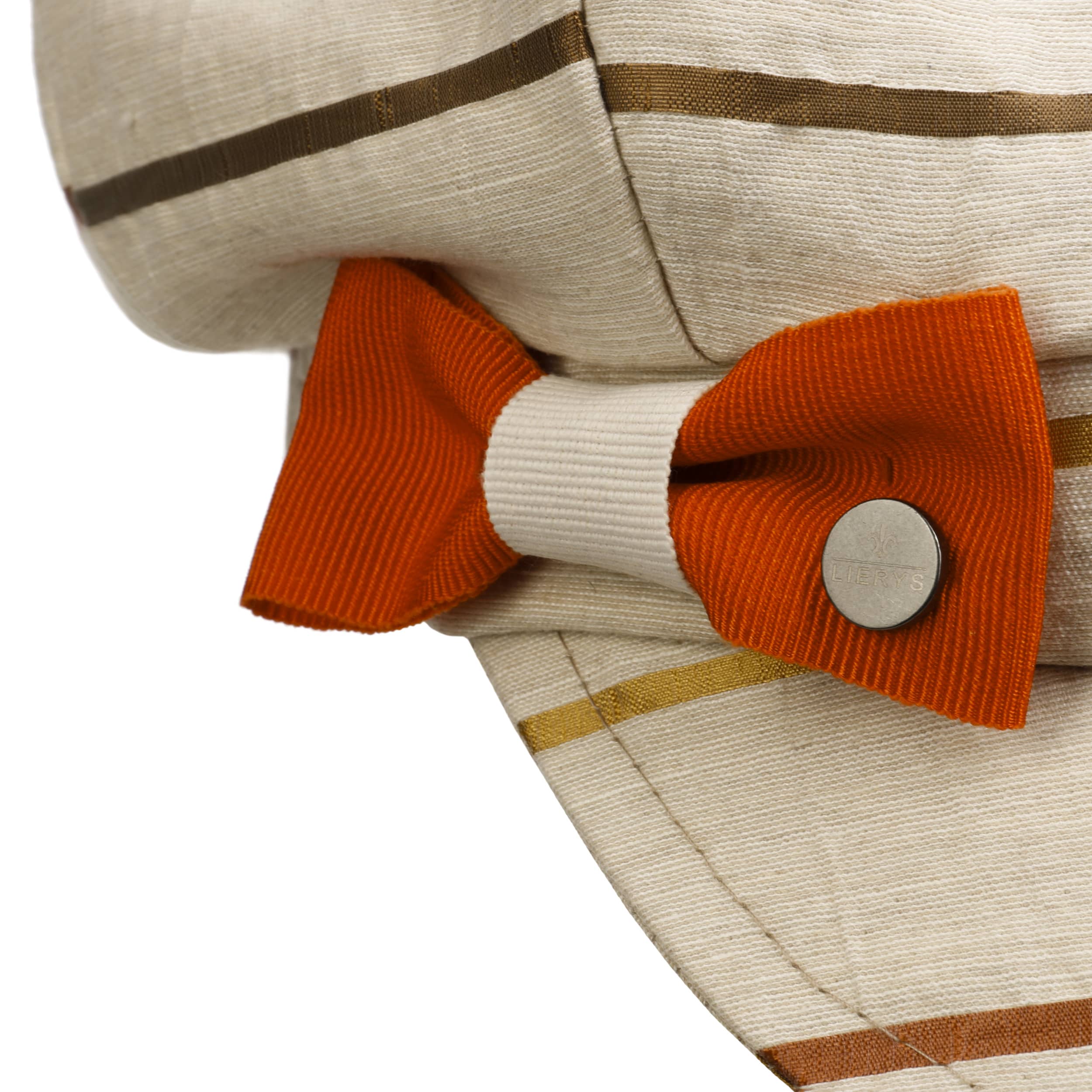 Under the voluminous crown of the baker boy cap from Lierys, there is just as much room for a luxuriant head of hair as for a decorative updo. Around two-thirds linen content makes the cap particularly airy and gives it a high-quality look. The subtle stripes in tasteful tones lighten up the look of the cap. A decorative bow is attached to the side as an eye-catcher.