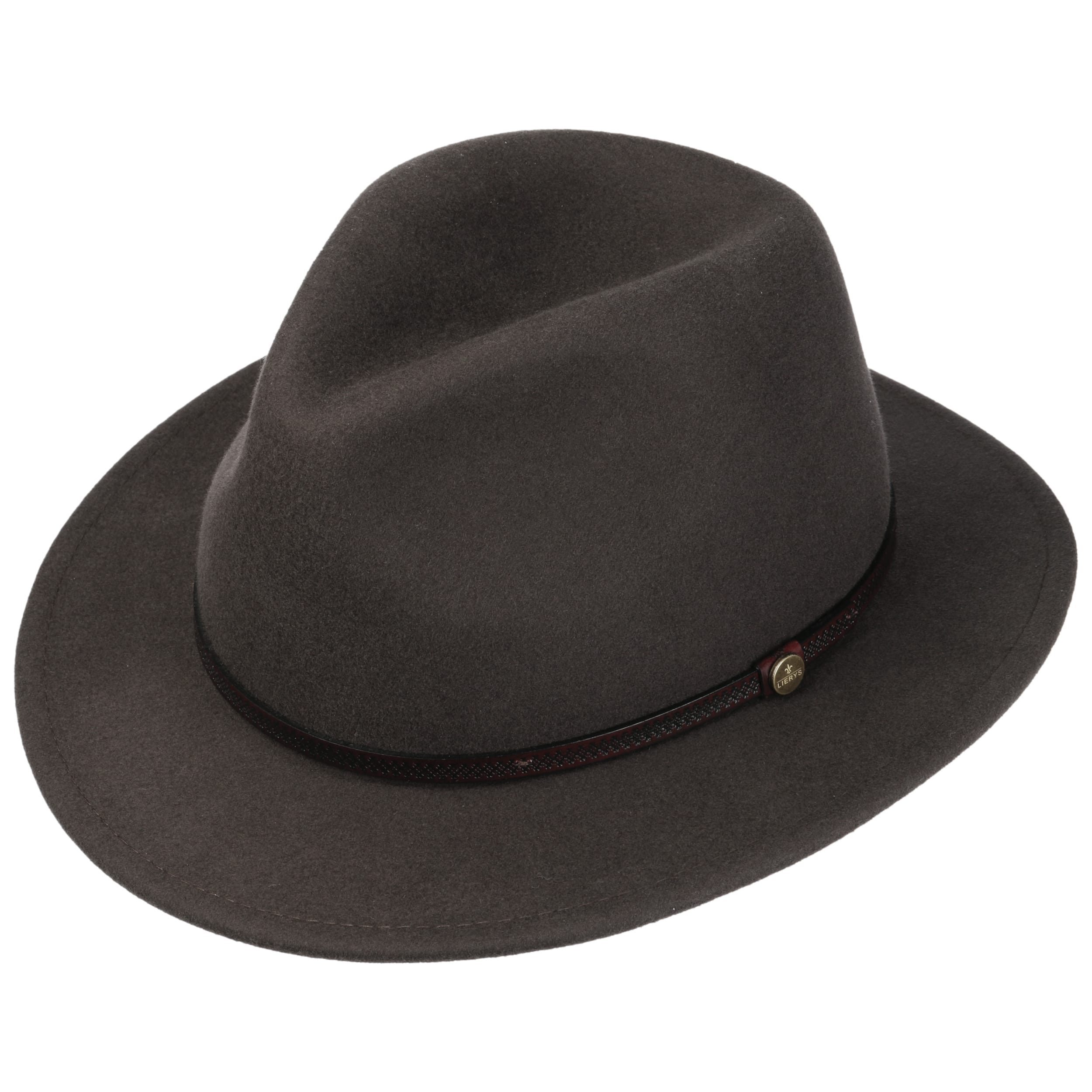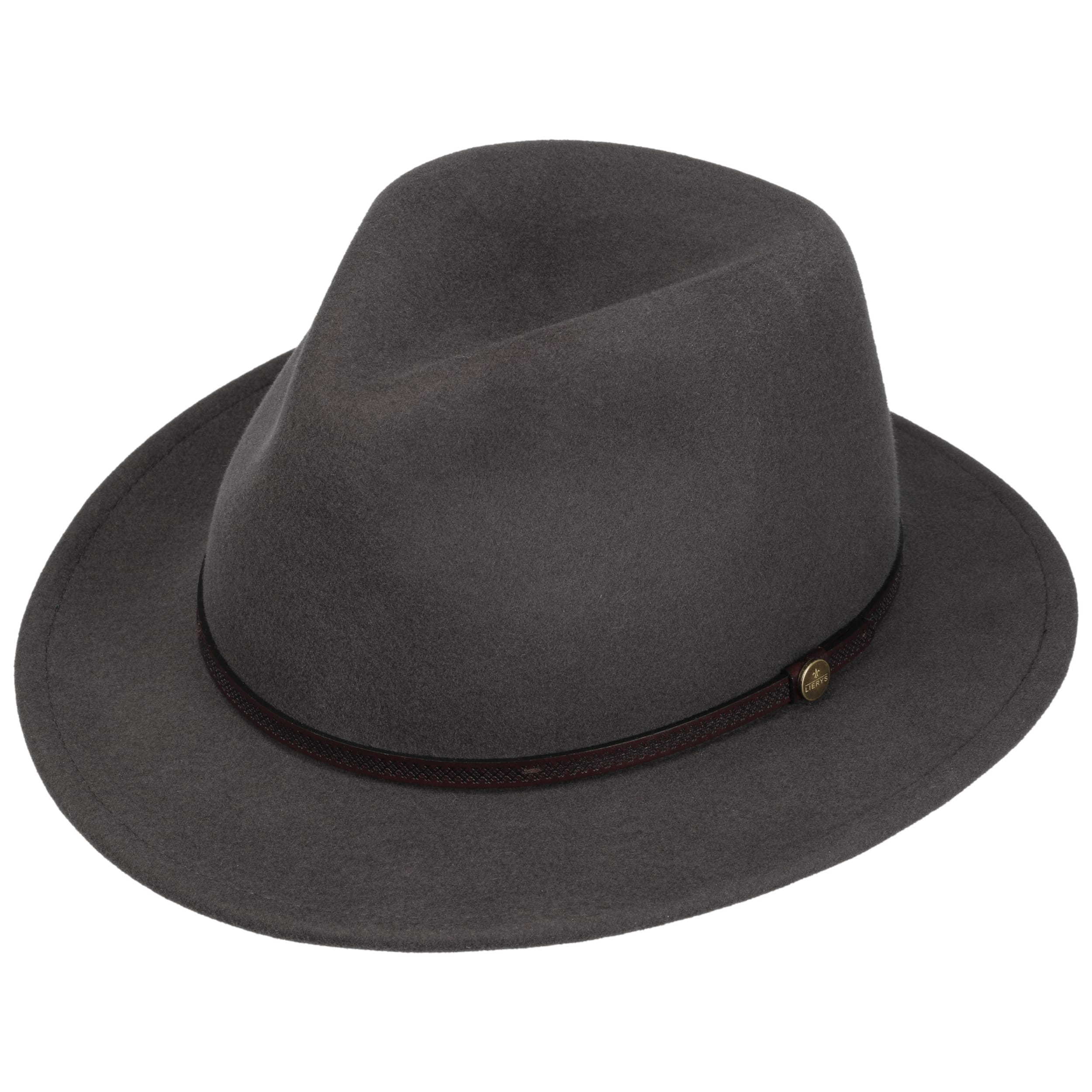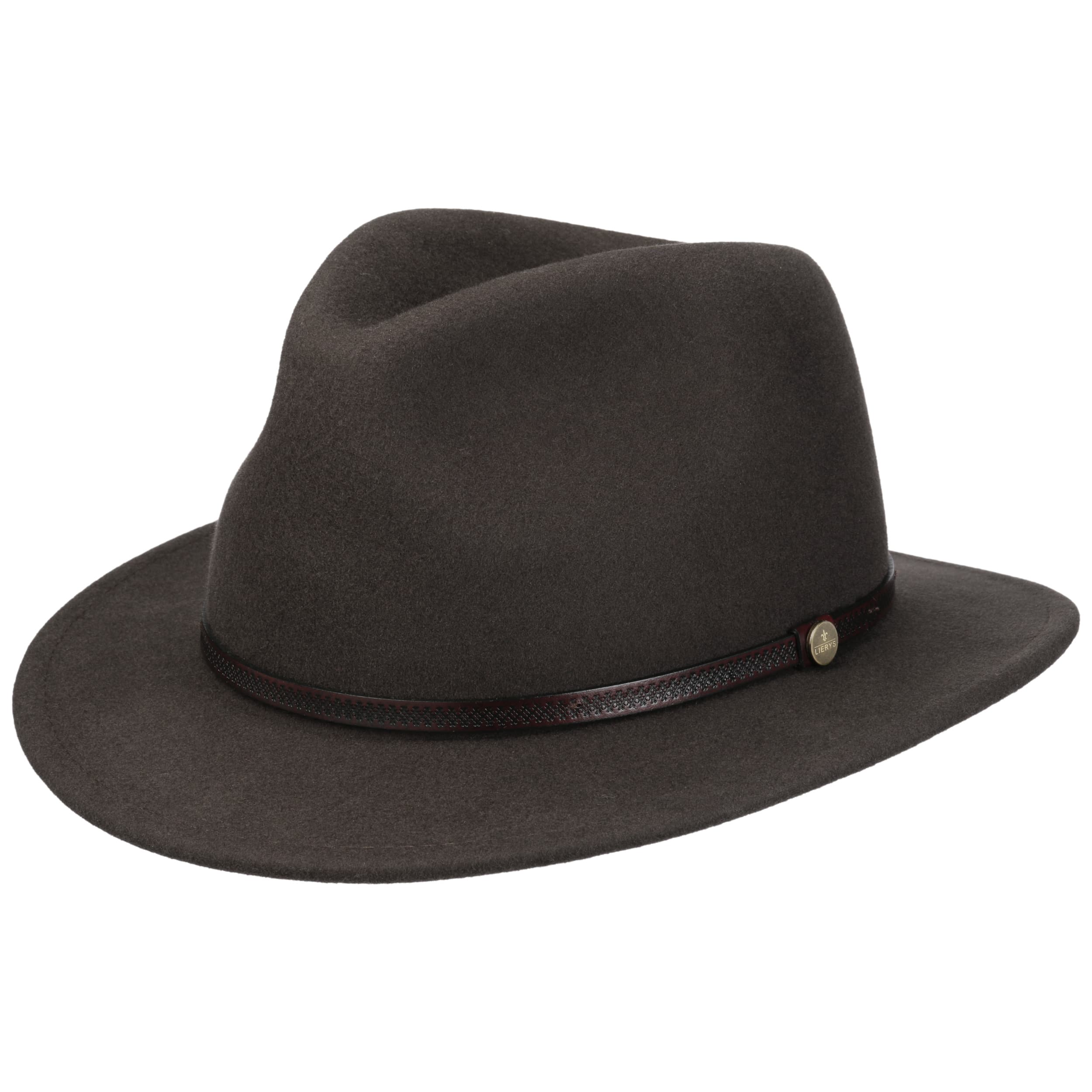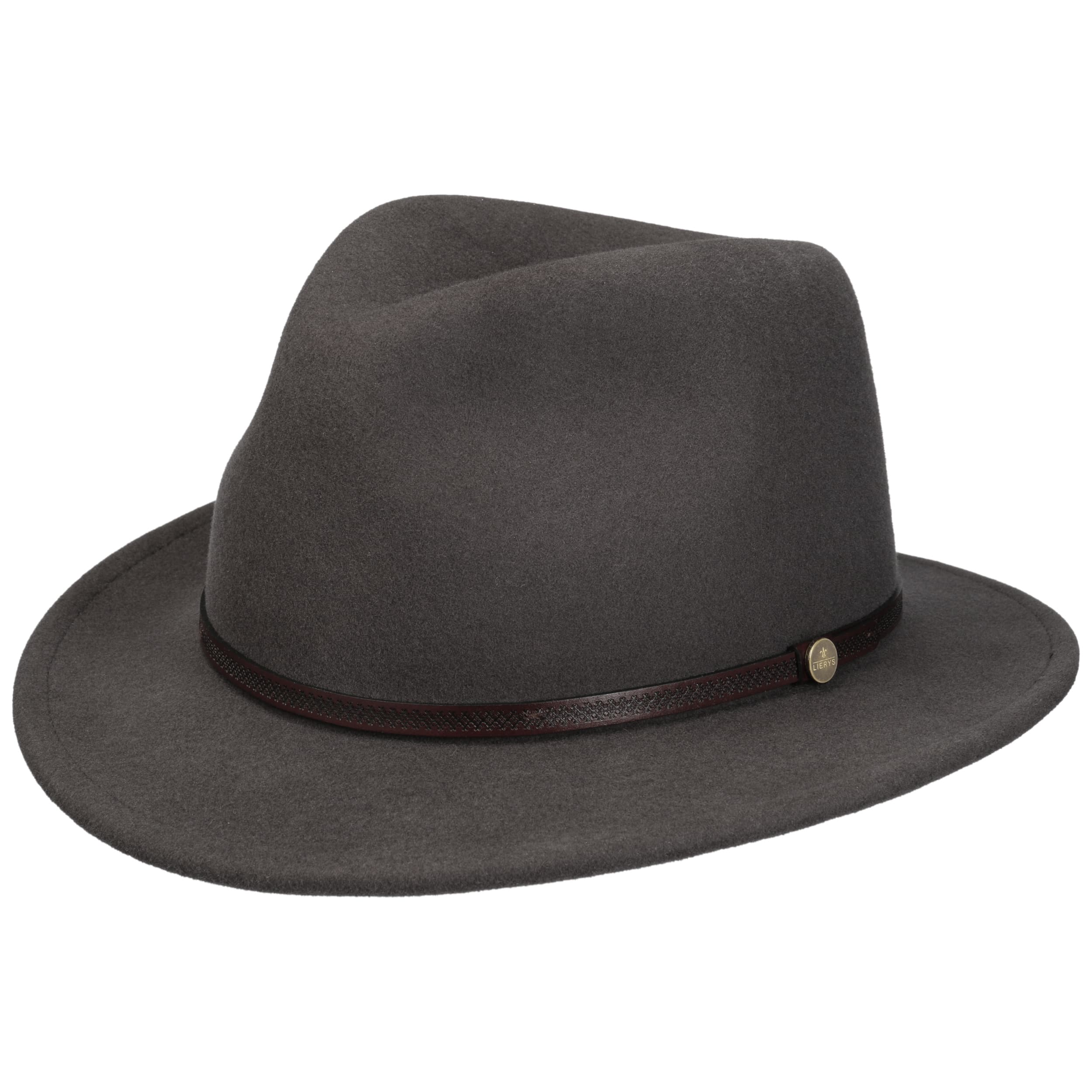 For a successful appearance and wearing comfort, the traveller hat from the Lierys brand has been equipped with wool, which gives it a supple surface when processed into felt. With its plain-coloured design, straight brim and dented crown, this felt hat has a sophisticated look with a rustic touch: The embossed leather trim with brand pin adds this interesting accent.