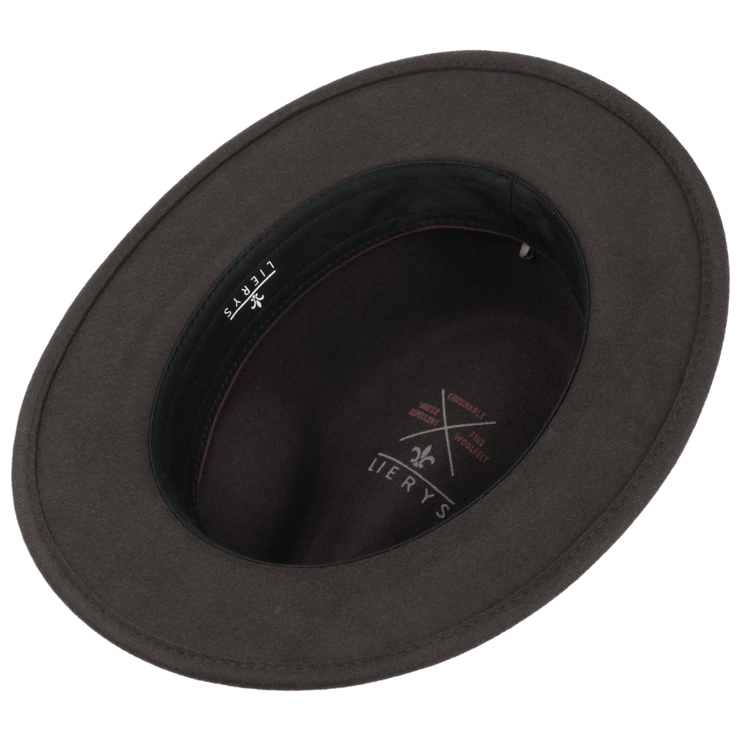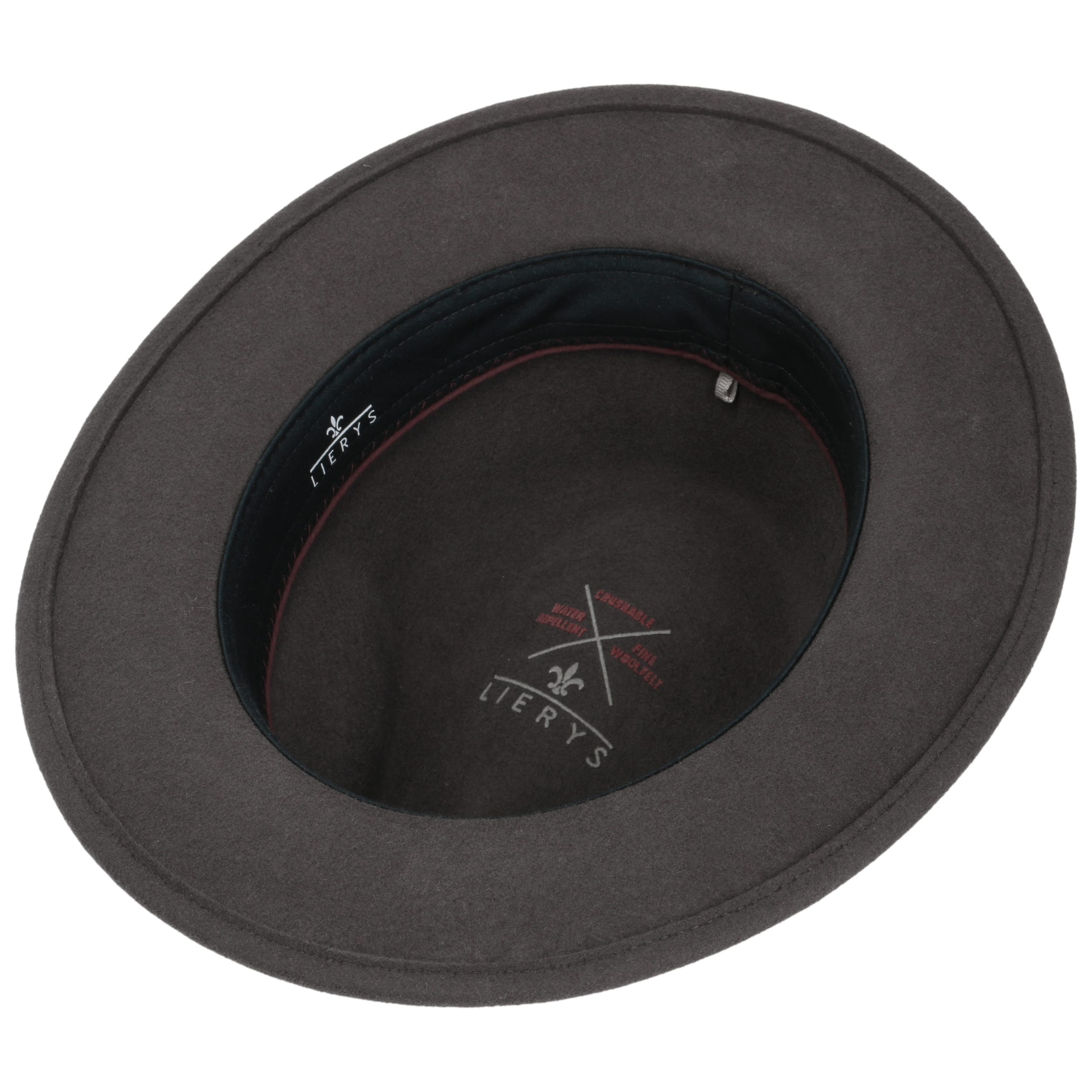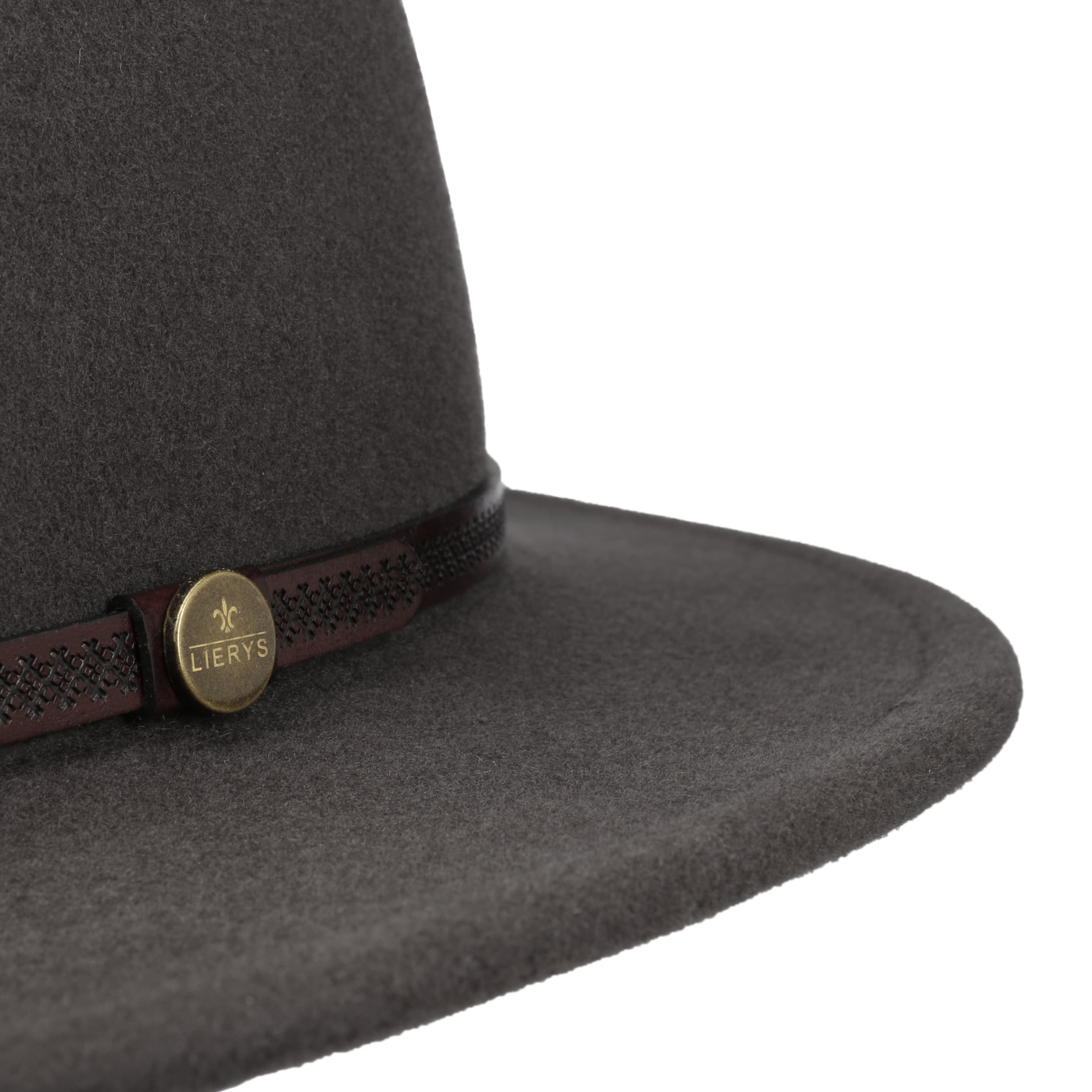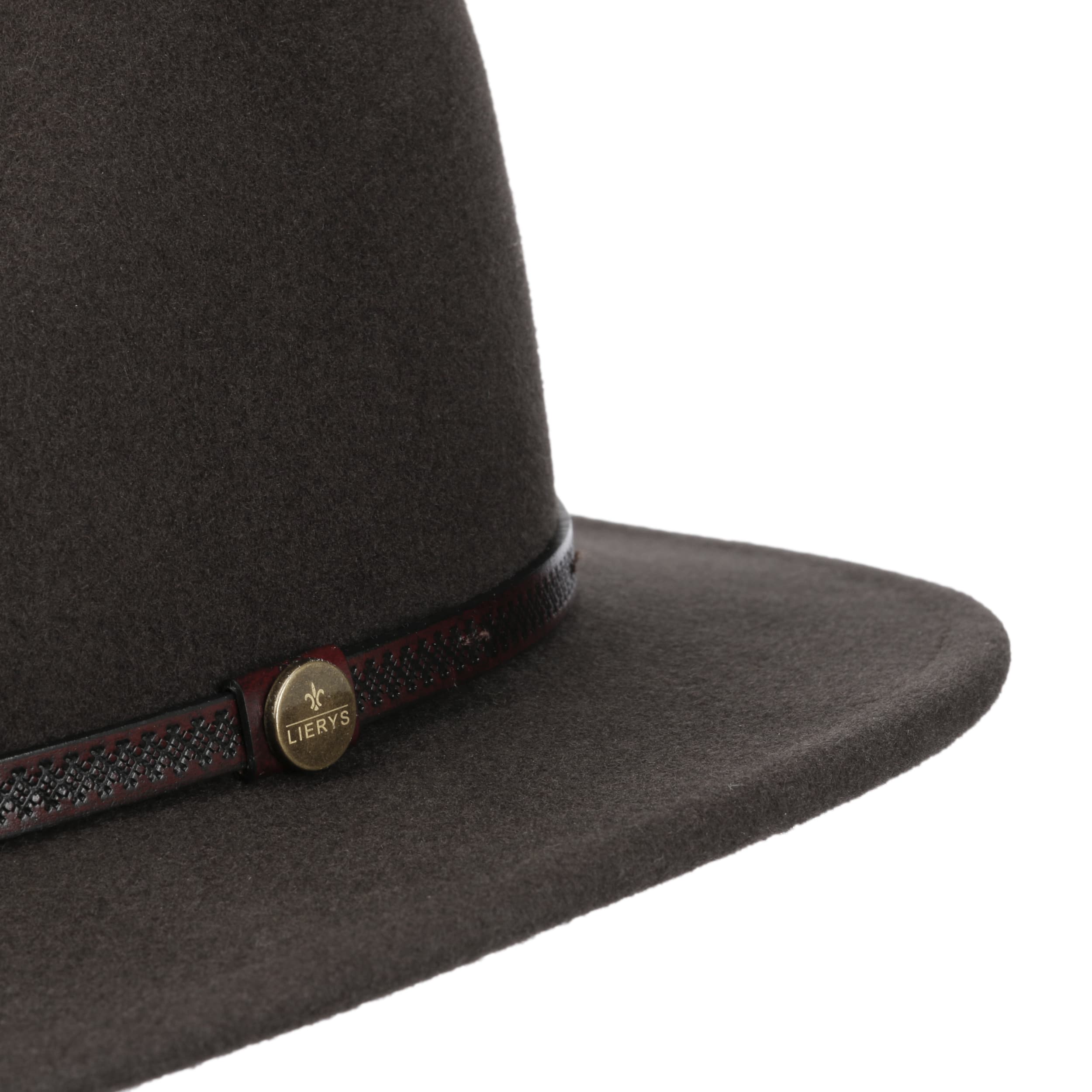 For a successful appearance and wearing comfort, the traveller hat from the Lierys brand has been equipped with wool, which gives it a supple surface when processed into felt. With its plain-coloured design, straight brim and dented crown, this felt hat has a sophisticated look with a rustic touch: The embossed leather trim with brand pin adds this interesting accent.