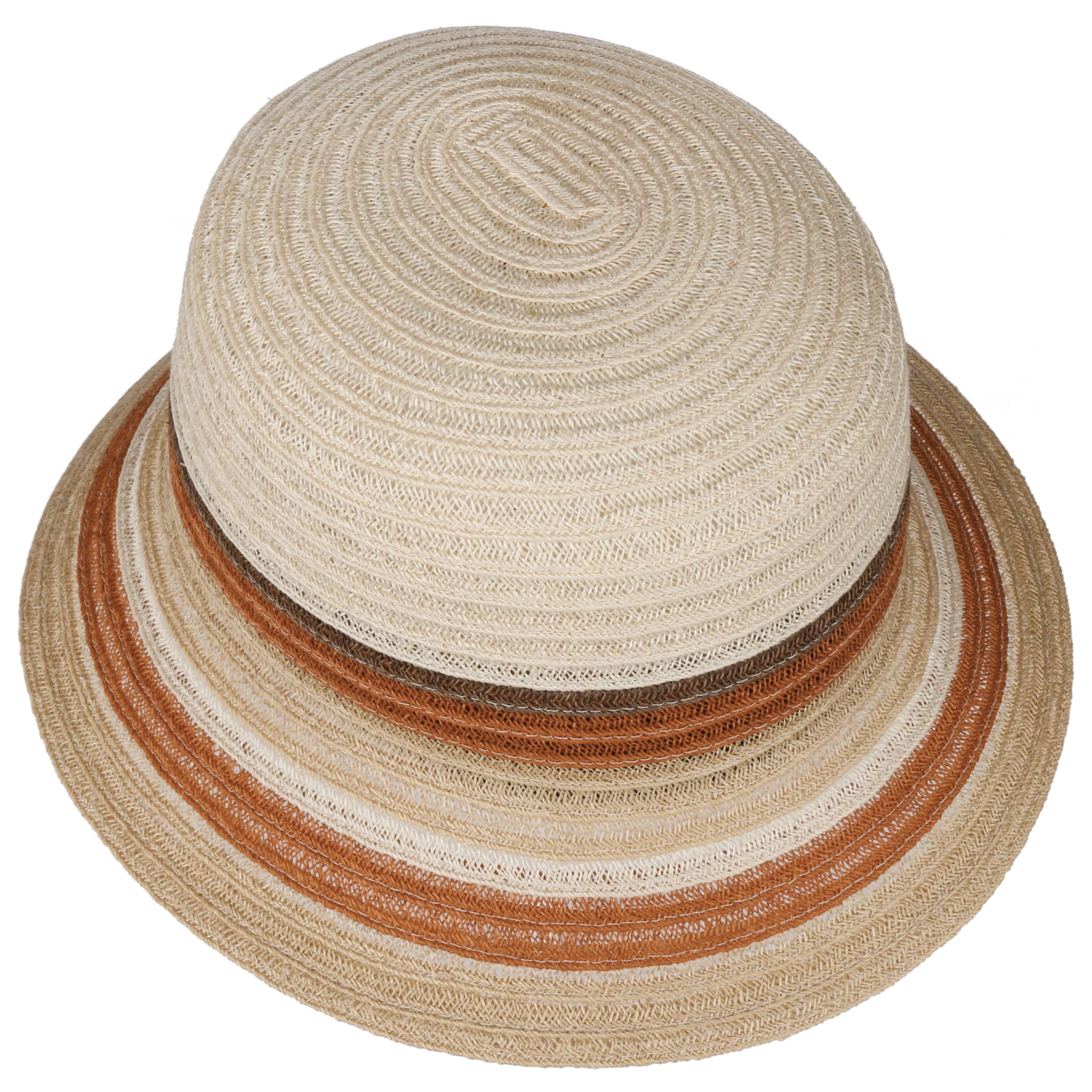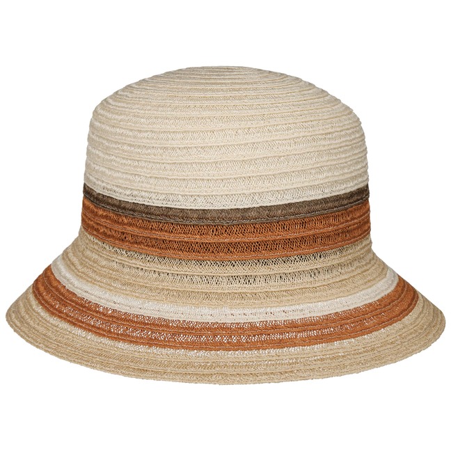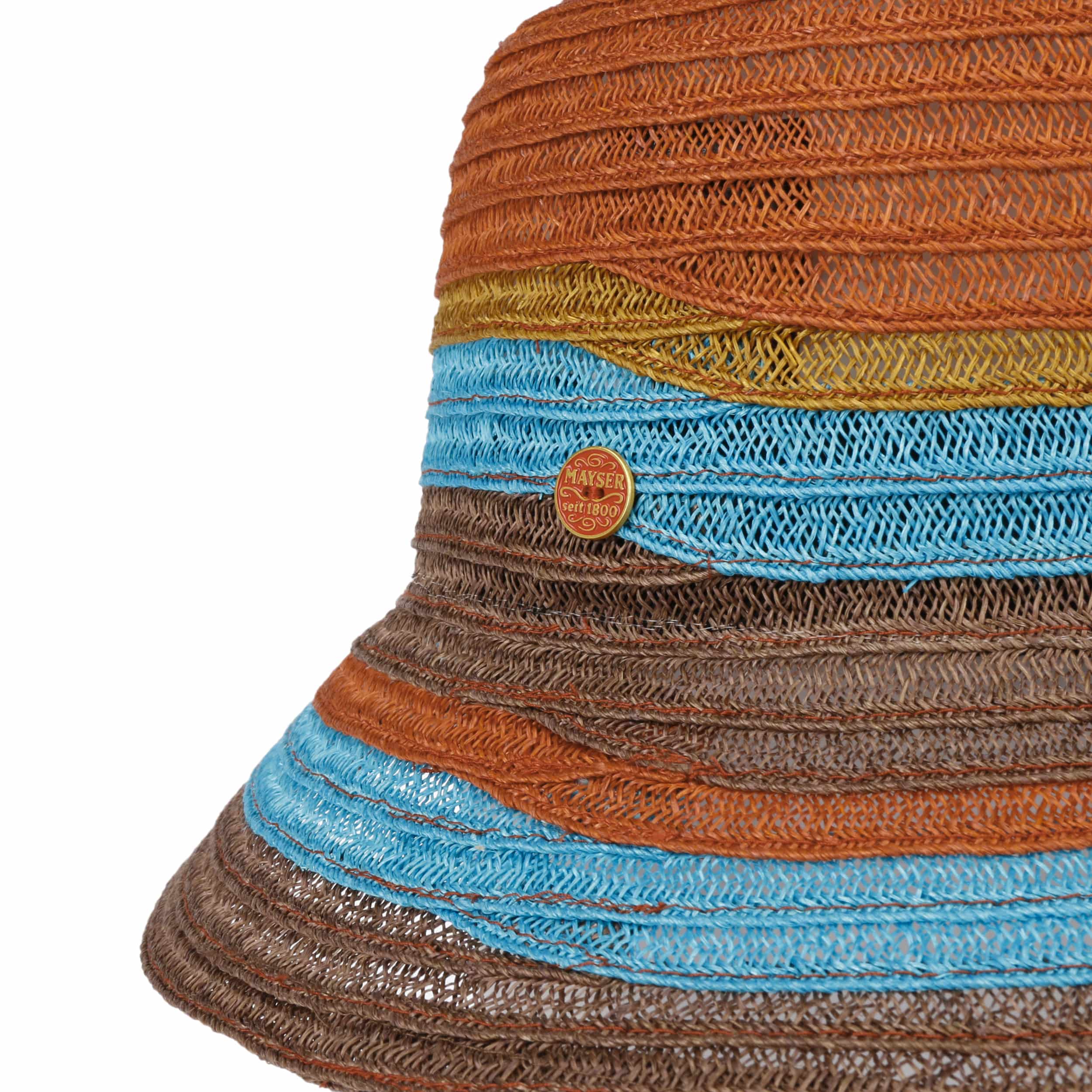 The multicoloured cloche by Mayser is made of a braid that consists mostly of hemp and complementary cotton. It has a beautiful striped pattern in warm, earthy tones and a bright contrasting stripe. The hat with its 7 cm wide brim is crushable and can be taken on holiday in your luggage.