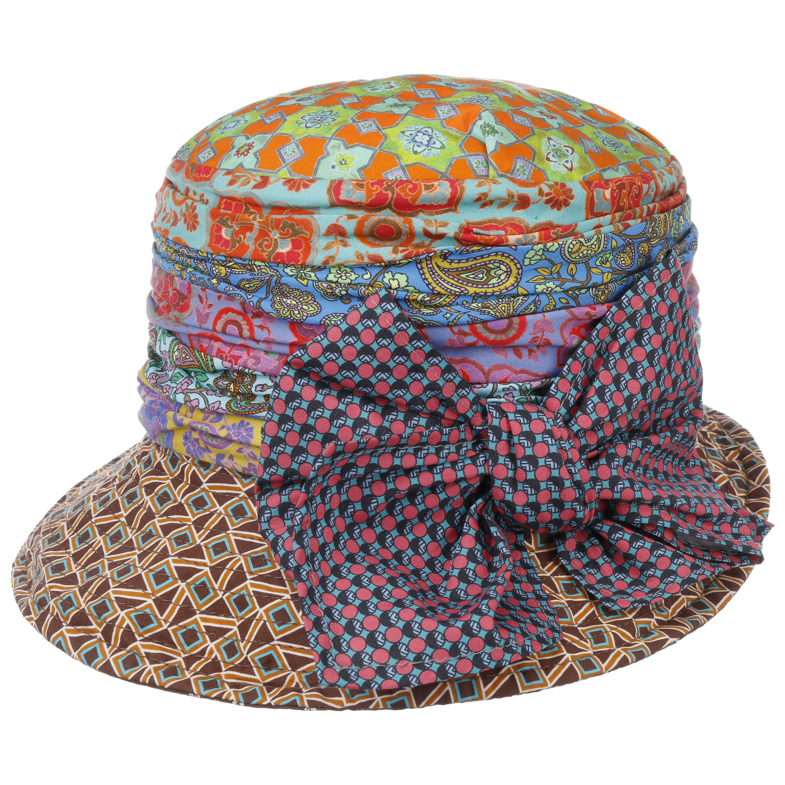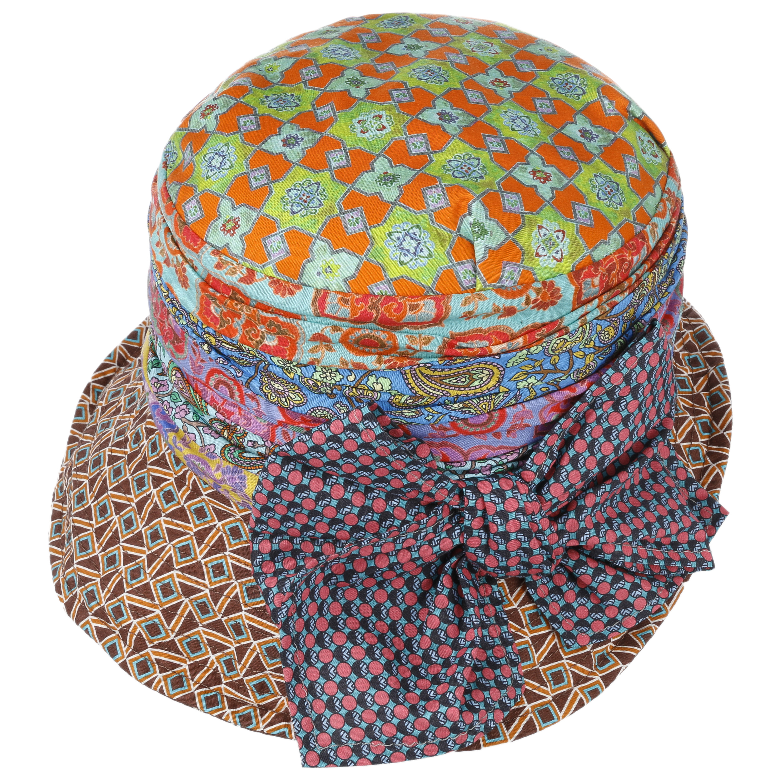 Anyone can be good and boring. Combining such glamorous bright colours and original elements, on the other hand, is something only the Italian hatmakers at GREVI manage to do. Even the headboard combines a funky paisley pattern with floral design and geometrically arranged ornaments. The asymmetrical brim is also decorated with an opulent bow in yet another design. Honestly: You can look at this hat for hours.