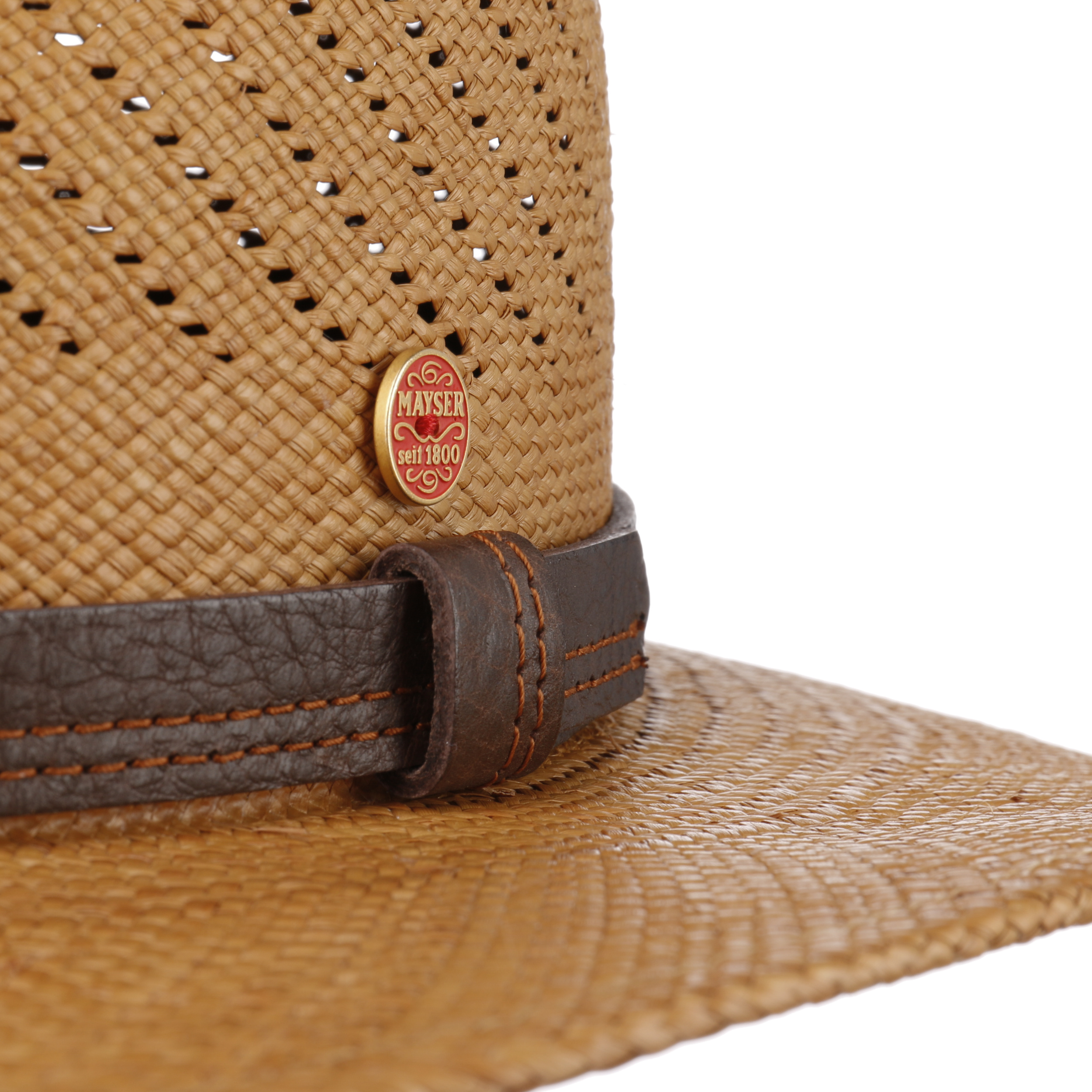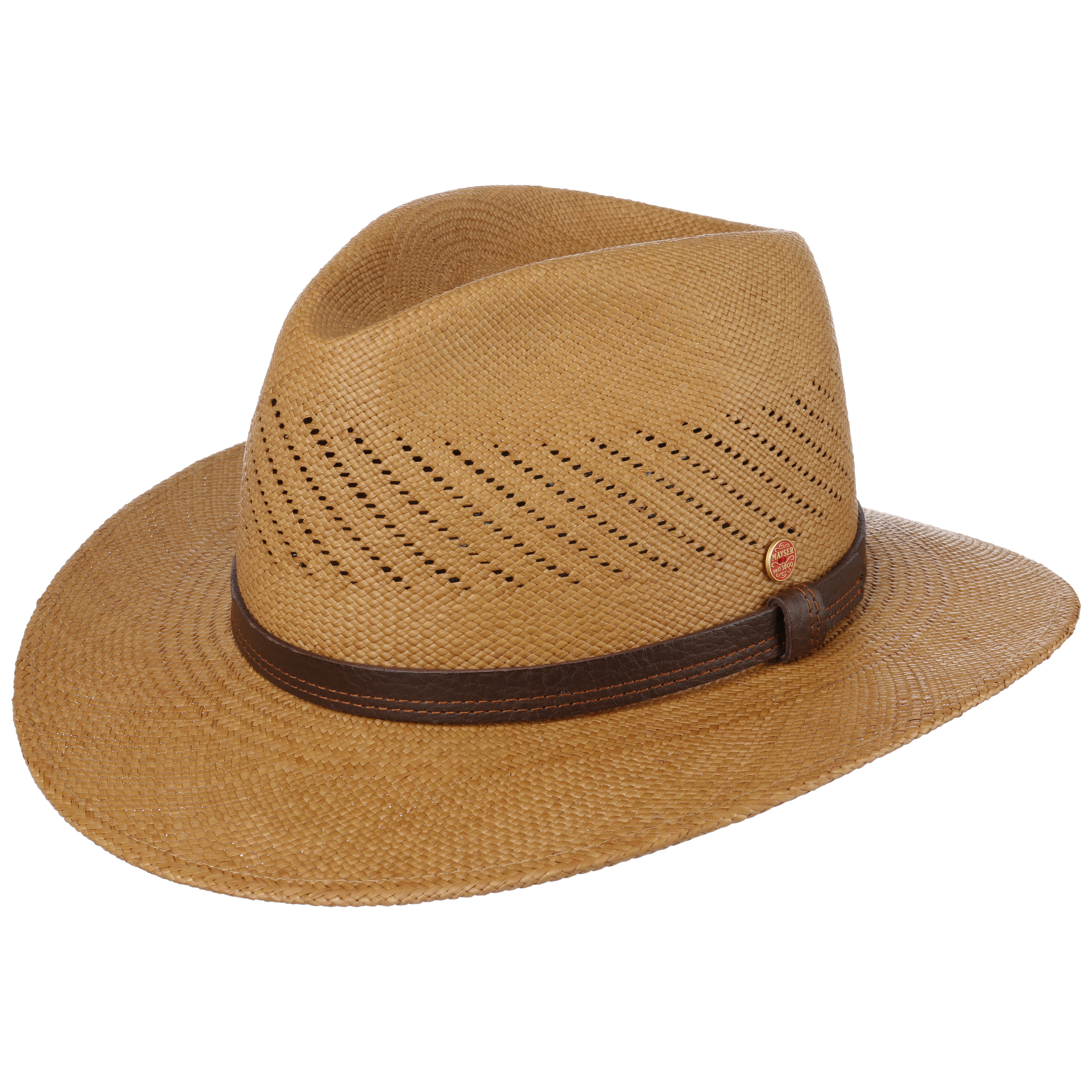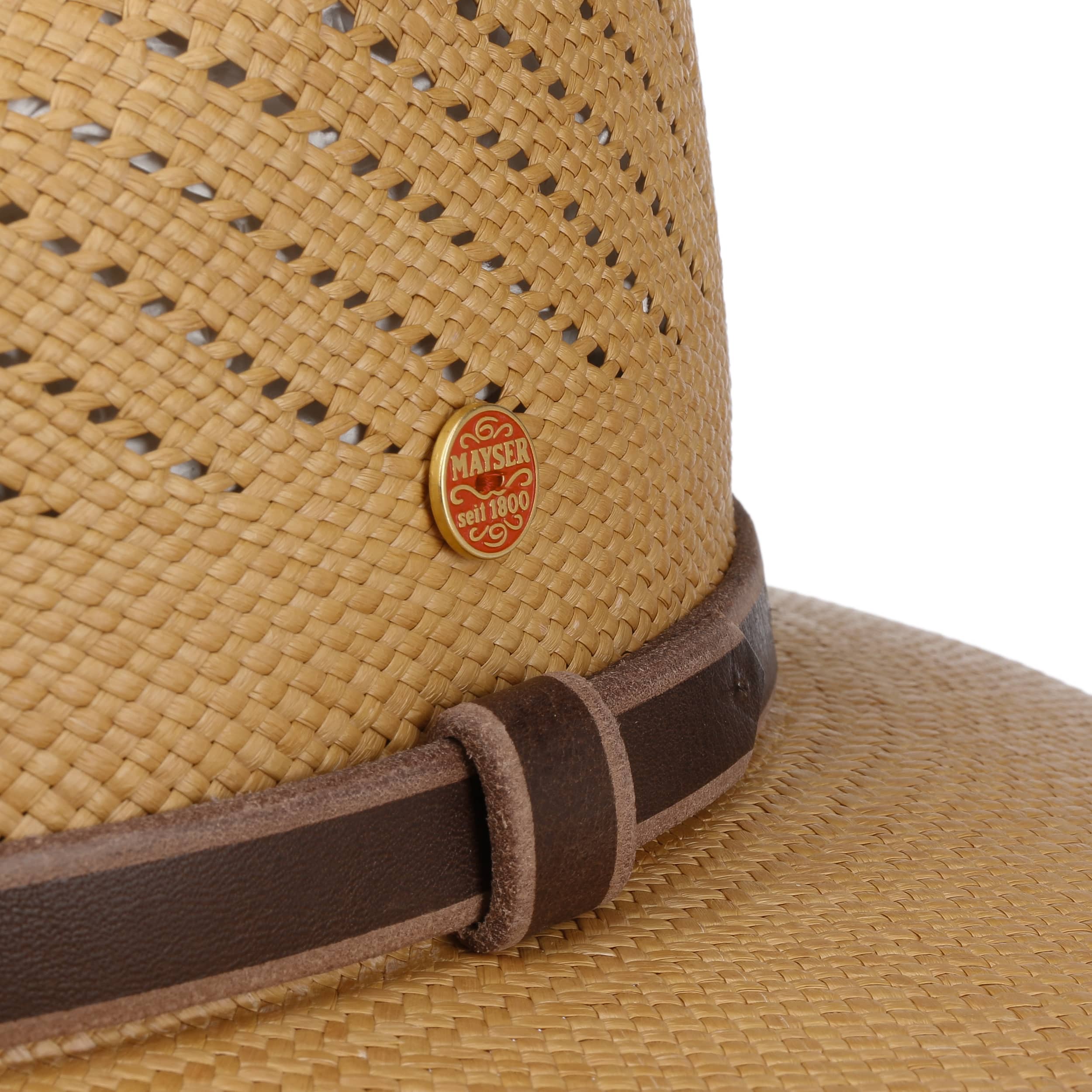 With its sunny brown tones and diagonal hole pattern, this Panama straw hat from Mayser accompanies its wearer through the warmest of summer days. The elegant palm fibres give this sporty hat with suede trim an exceptional outdoorsy feeling.